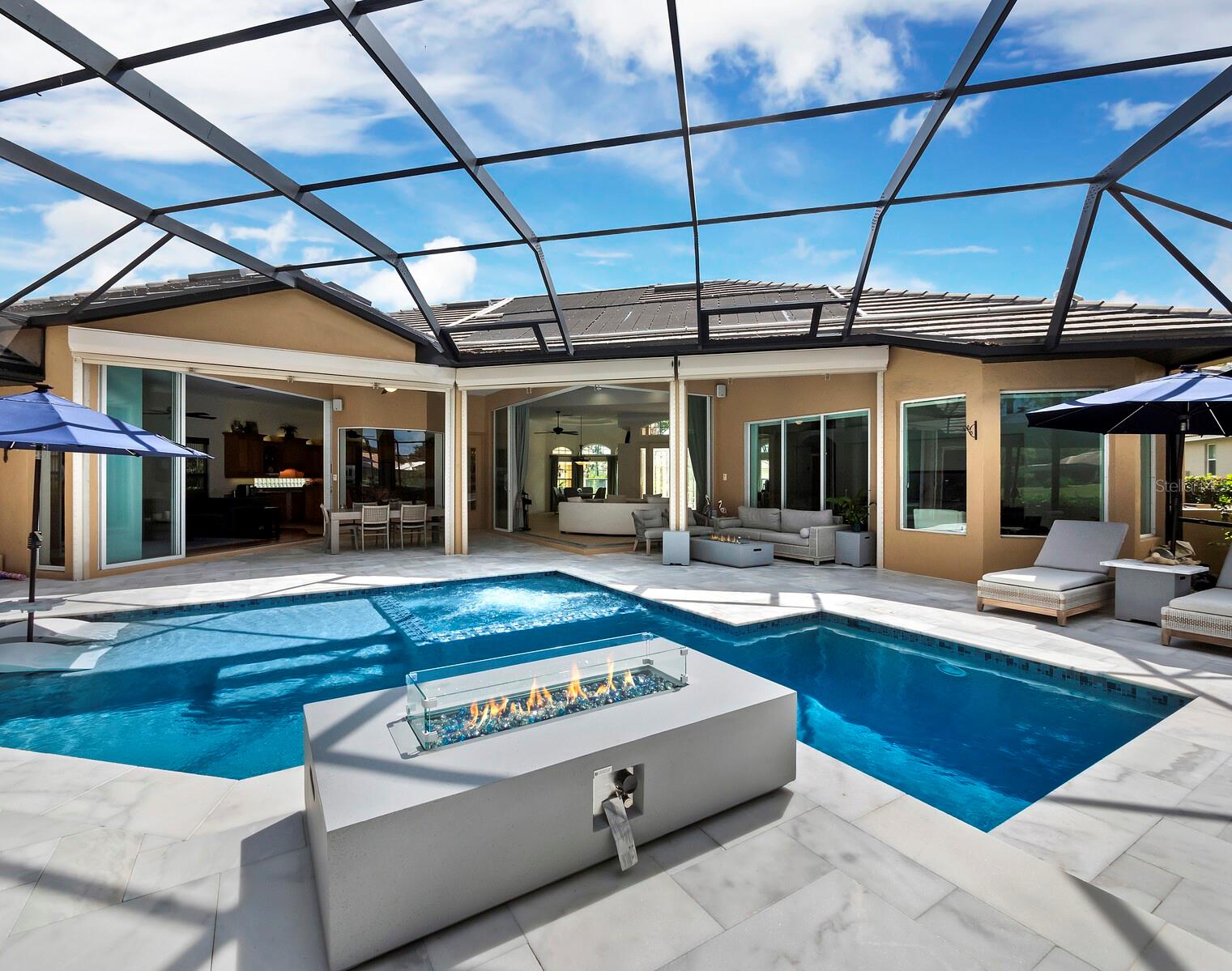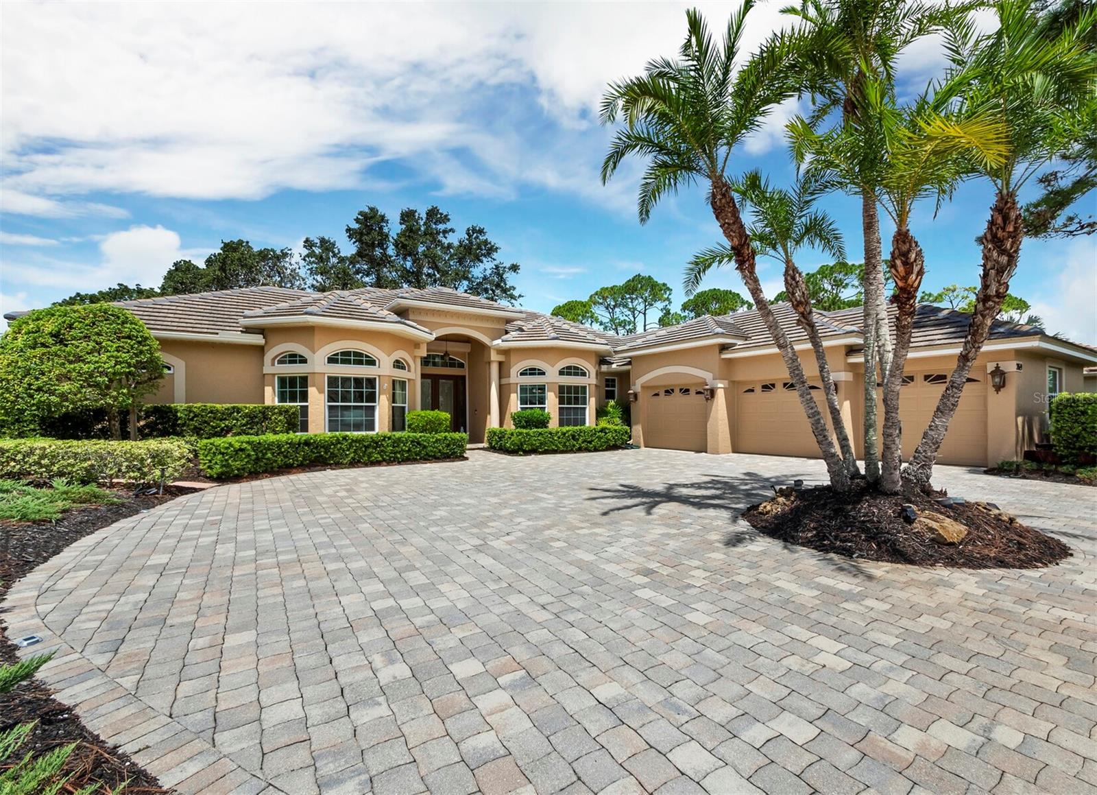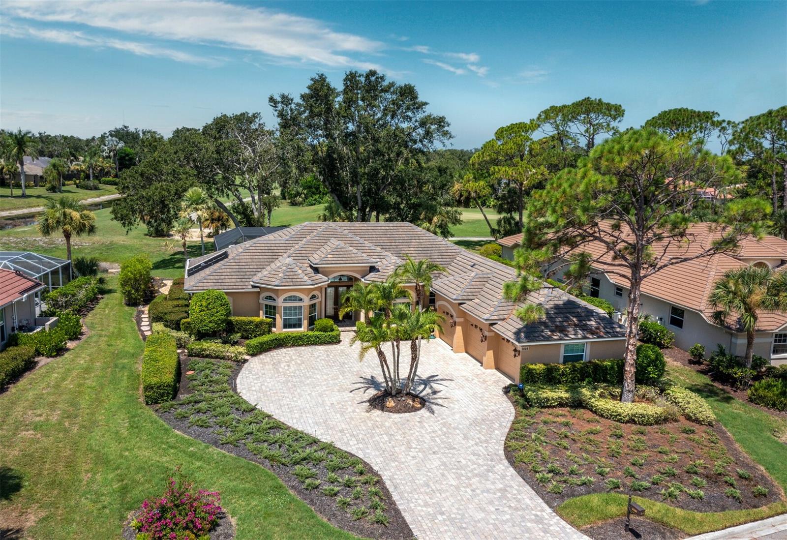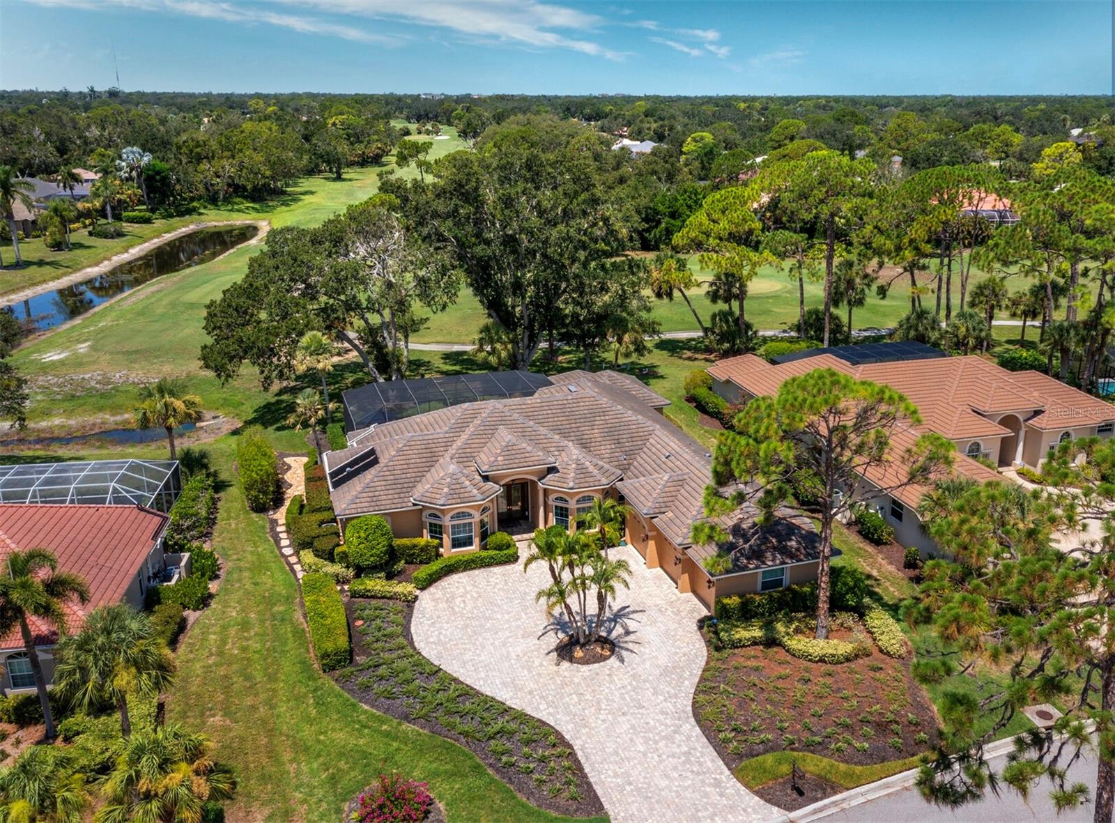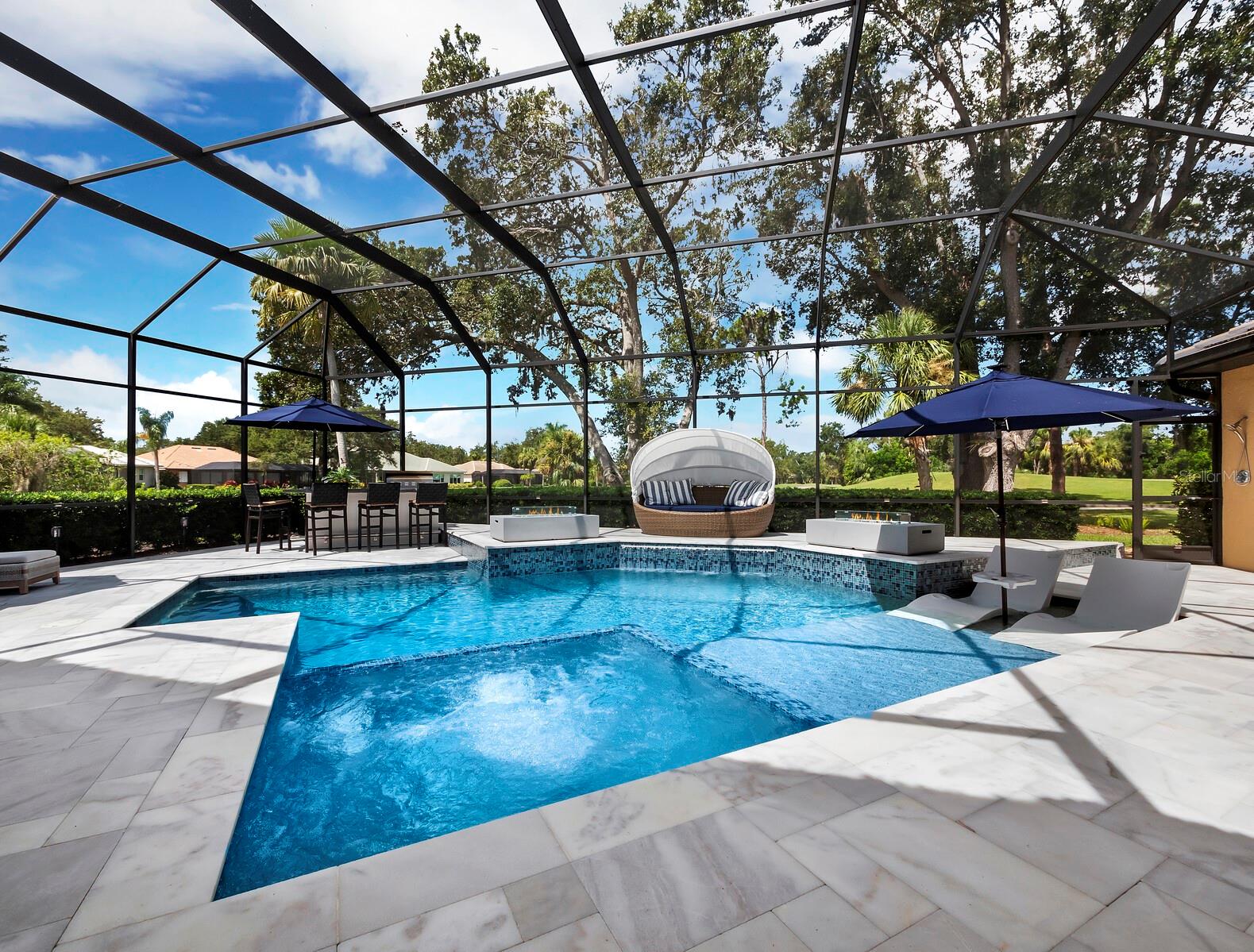 Presenting the ultimate estate home, you've been longing for. Prepare to be captivated as you step onto the extensive paver circular driveway of this opulent residence. Nestled on over 1/3 acre, this meticulously designed dwelling offers panoramic views of the lush golf course. The attention to detail, both indoors and out, is apparent from every angle. Discover an expansive floor plan that enhances the spaciousness of each room, notably the living area with its lofty double-tray ceilings and sprawling 9 ft. corner sliding doors connecting indoor and outdoor living spaces, creating an inviting flow. Hosting guests is effortless in the adjacent dining room, while the intelligently planned kitchen serves as the heart of the home. Enjoy extensive granite countertops, top-tier cabinetry, a coffee bar, raised dishwasher, stainless steel appliances, and a wet bar. For casual breakfast or lunches, the 'dinette' area is always bathed in natural light from the aquarium windows. The bonus room, ideal for a study or office use, can effortlessly transform into a fourth bedroom with the addition of a closet as it boasts its own private full bath. The kitchen and dinette area open into the family room, sliding doors and rich wood floors. Prepare to be entranced by the breathtaking vista of the pool and spa, set against the backdrop of the extensive lanai. The evenings come alive as sliding doors are drawn open, complemented by tastefully tuned LED lighting, and the gentle melody of water cascading into the artistically illuminated pool. The primary bedroom suite featuring soaring ceilings, a generously sized walk-in closet. The master bathroom is a sanctuary, boasting a soaking tub, spacious dual-entry Roman shower. Two additional bedrooms with private baths provide comfort for family or guests, while the pool bath extends convenience to the outdoor living spaces. Saving the most impressive for the finale, the lanai unveils a professionally designed solar & electric heated pool, complete with all new Pentair automation saltwater system and an oversized spa adorned with waterfalls. This outdoor haven is a masterpiece, blending materials, colors, and detailing flawlessly. The multi-color LED light options for the pool and spa, the built-in Paradise Grills bar top, and the integrated refrigerator awaits for many family and friends to enjoy, or to server as your own private oasis. Recent enhancements cater to a carefree and luxurious lifestyle, including a new roof in 2018, a cutting-edge mini-split HVAC system with dehumidification along with new overhead insulation in the garage, and smart home features such as voice/app-controlled switches, dimmers, thermostats, and alarms. A new hot water heater, solar pool heating, carefully curated landscaping enhances the verdant lawn. Safety measures are elevated with storm shutters and impact windows, providing peace of mind. This exquisite home is the epitome of perfection, offering a lifestyle of utmost comfort and leisure. Ideally situated within the coveted Calusa Lakes golf community that adorns beautiful mature oak and pines trees that make this community very special. Midway between Sarasota and Venice, you'll relish a mere 10-minute drive to renowned beaches and the charming Island of Venice. The proximity to the brand-new Sarasota Memorial Hospital and easy access to I-75 further elevate the convenience as well the legacy trail. Embrace an exceptional lifestyle where luxury and relaxation converge.