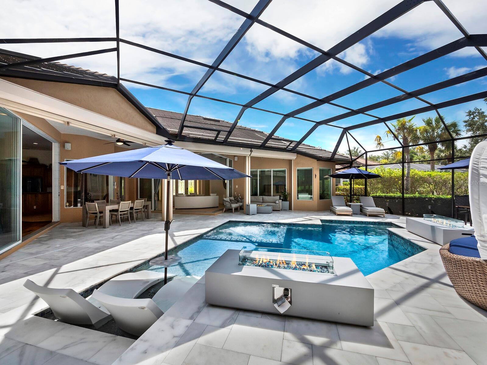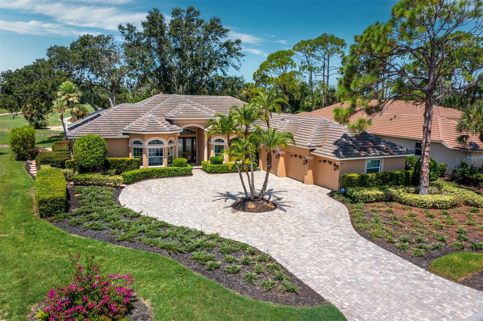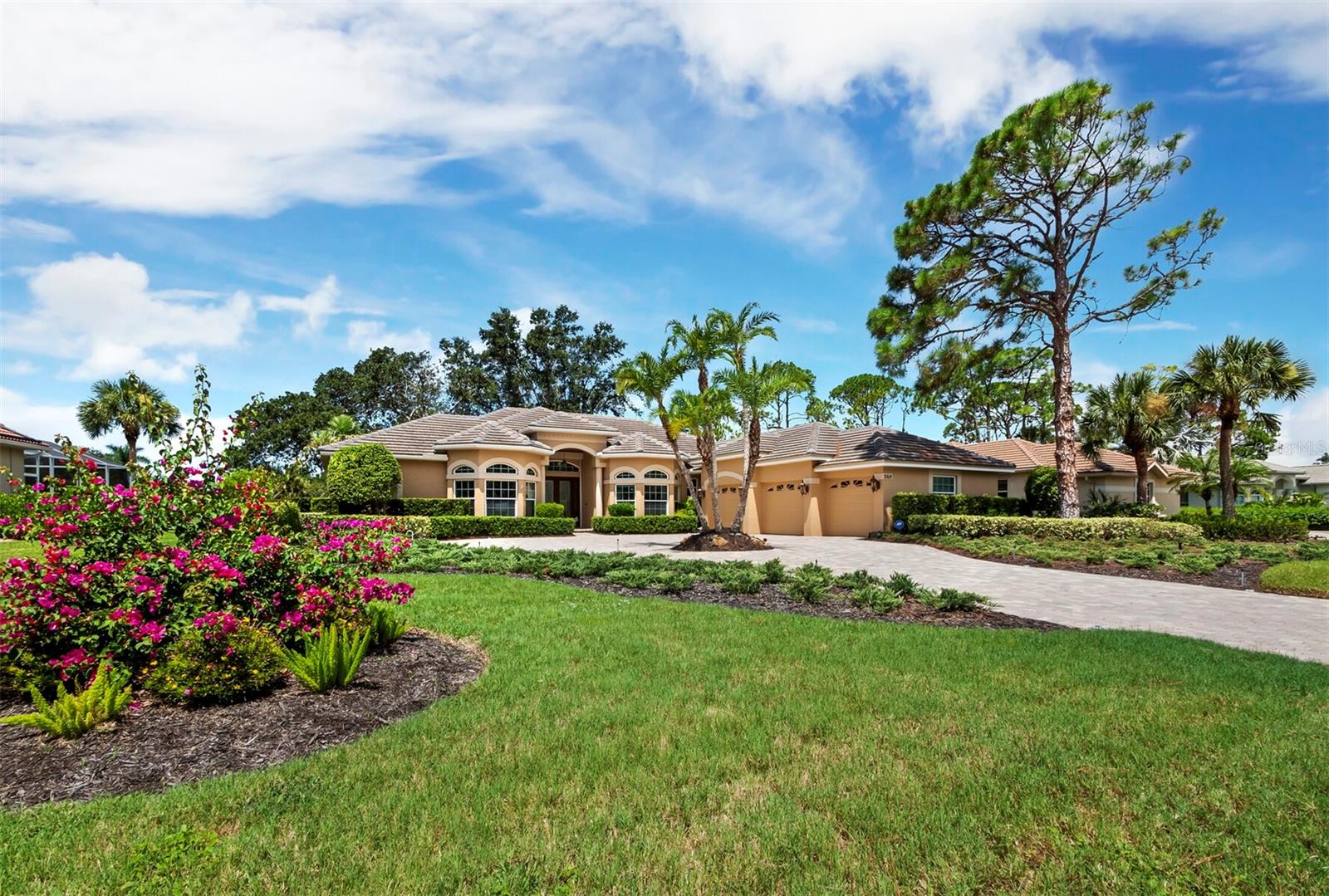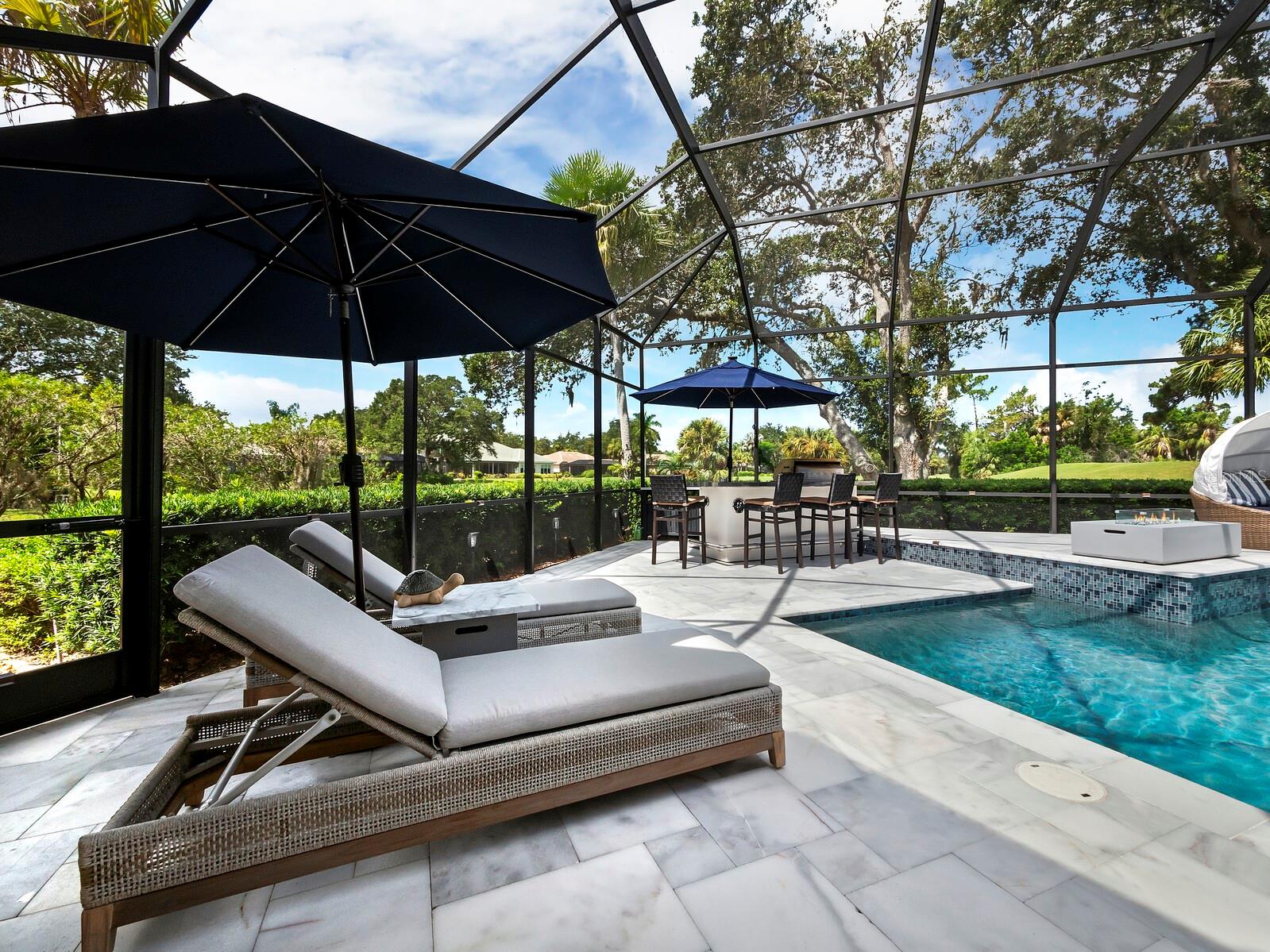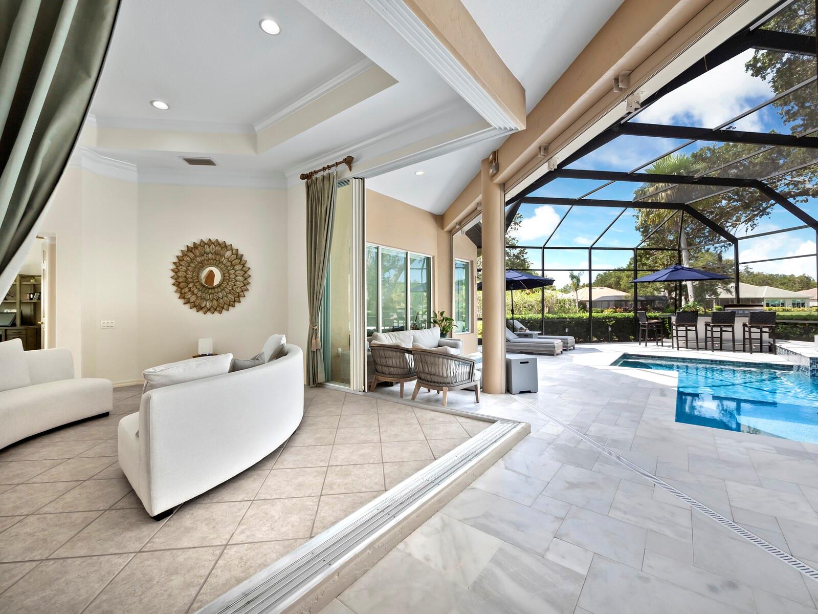 Presenting the ultimate estate home, you've been longing for. Prepare to be captivated as you step onto the extensive paver circular driveway of this opulent residence. Nestled on over 1/3 acre, this meticulously designed dwelling offers panoramic views of the lush golf course. The attention to detail, both indoors and out, is apparent from every angle. Discover an expansive floor plan that enhances the spaciousness of each room, notably the living area with its lofty double-tray ceilings and sprawling 9 ft. corner sliding doors connecting indoor and outdoor living spaces, creating an inviting flow. Hosting guests is effortless in the adjacent dining room, while the intelligently planned kitchen serves as the heart of the home. Enjoy extensive granite countertops, top-tier cabinetry, a coffee bar, raised dishwasher, stainless steel appliances, and a wet bar. For casual breakfast or lunches, the 'dinette' area is always bathed in natural light from the aquarium windows. The bonus room, ideal for a study or office use, can effortlessly transform into a fourth bedroom with the addition of a closet as it boasts its own private full bath. The kitchen and dinette area open into the family room, sliding doors and rich wood floors. Prepare to be entranced by the breathtaking vista of the pool and spa, set against the backdrop of the extensive lanai. The evenings come alive as sliding doors are drawn open, complemented by tastefully tuned LED lighting, and the gentle melody of water cascading into the artistically illuminated pool. The primary bedroom suite featuring soaring ceilings, a generously sized walk-in closet. The master bathroom is a sanctuary, boasting a soaking tub, spacious dual-entry Roman shower. Two additional bedrooms with private baths provide comfort for family or guests, while the pool bath extends convenience to the outdoor living spaces. Saving the most impressive for the finale, the lanai unveils a professionally designed solar & electric heated pool, complete with all new Pentair automation saltwater system and an oversized spa adorned with waterfalls. This outdoor haven is a masterpiece, blending materials, colors, and detailing flawlessly. The multi-color LED light options for the pool and spa, the built-in Paradise Grills bar top, and the integrated refrigerator awaits for many family and friends to enjoy, or to server as your own private oasis. Recent enhancements cater to a carefree and luxurious lifestyle, including a new roof in 2018, a cutting-edge mini-split HVAC system with dehumidification along with new overhead insulation in the garage, and smart home features such as voice/app-controlled switches, dimmers, thermostats, and alarms. A new hot water heater, solar pool heating, carefully curated landscaping enhances the verdant lawn. Safety measures are elevated with storm shutters and impact windows, providing peace of mind. This exquisite home is the epitome of perfection, offering a lifestyle of utmost comfort and leisure. Ideally situated within the coveted Calusa Lakes golf community that adorns beautiful mature oak and pines trees that make this community very special. Midway between Sarasota and Venice, you'll relish a mere 10-minute drive to renowned beaches and the charming Island of Venice. The proximity to the brand-new Sarasota Memorial Hospital and easy access to I-75 further elevate the convenience as well the legacy trail. Embrace an exceptional lifestyle where luxury and relaxation converge.