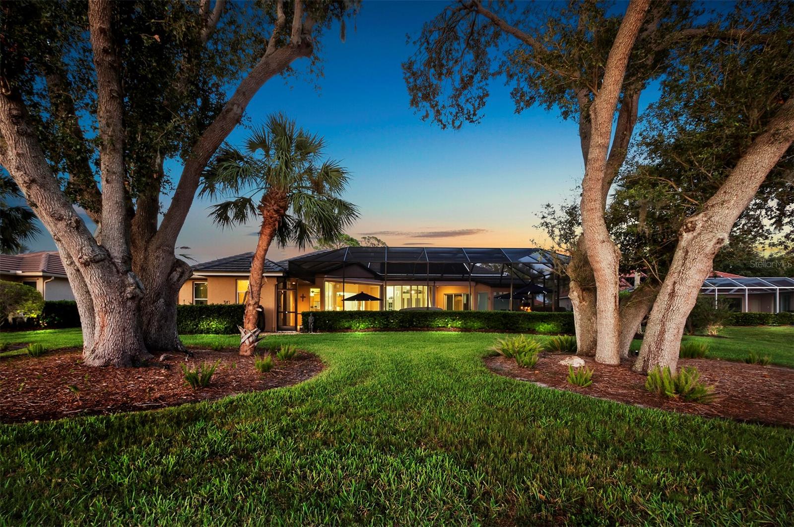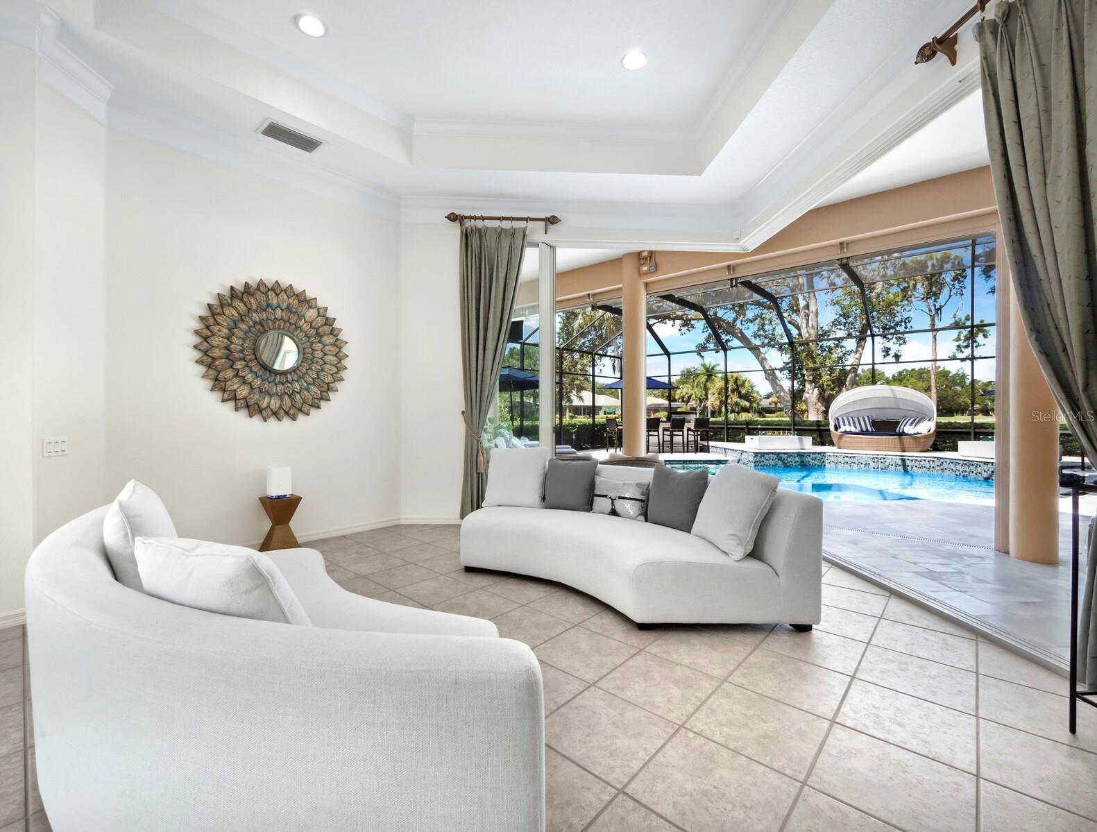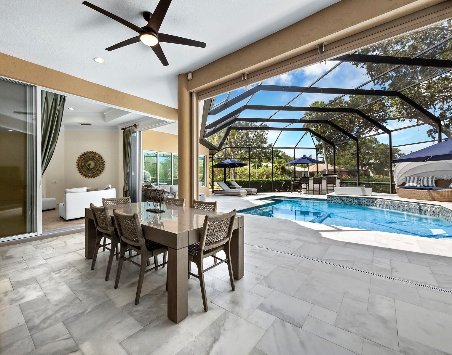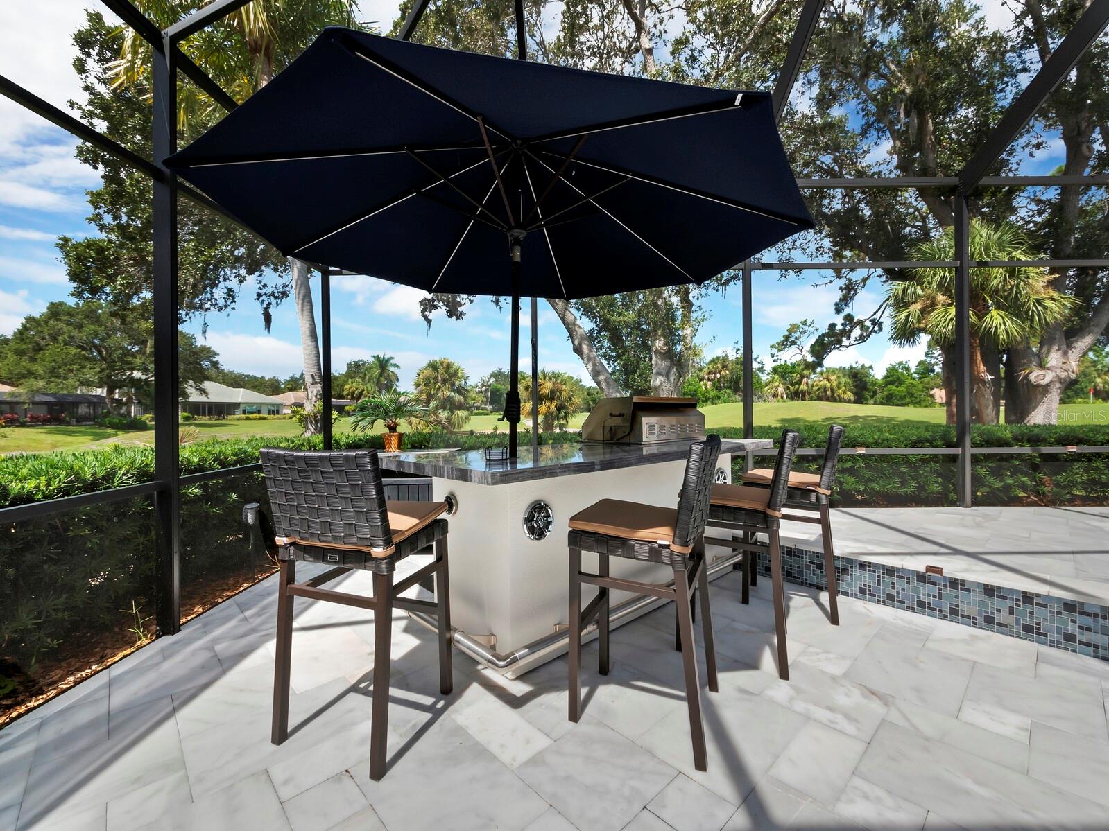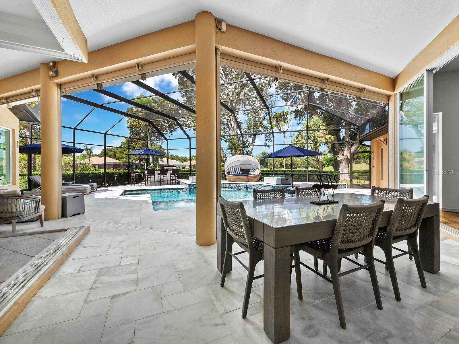Presenting the ultimate estate home, you've been longing for. Prepare to be captivated as you step onto the extensive paver circular driveway of this opulent residence. Nestled on over 1/3 acre, this meticulously designed dwelling offers panoramic views of the lush golf course. The attention to detail, both indoors and out, is apparent from every angle. Discover an expansive floor plan that enhances the spaciousness of each room, notably the living area with its lofty double-tray ceilings and sprawling 9 ft. corner sliding doors connecting indoor and outdoor living spaces, creating an inviting flow. Hosting guests is effortless in the adjacent dining room, while the intelligently planned kitchen serves as the heart of the home. Enjoy extensive granite countertops, top-tier cabinetry, a coffee bar, raised dishwasher, stainless steel appliances, and a wet bar. For casual breakfast or lunches, the 'dinette' area is always bathed in natural light from the aquarium windows. The bonus room, ideal for a study or office use, can effortlessly transform into a fourth bedroom with the addition of a closet as it boasts its own private full bath. The kitchen and dinette area open into the family room, sliding doors and rich wood floors. Prepare to be entranced by the breathtaking vista of the pool and spa, set against the backdrop of the extensive lanai. The evenings come alive as sliding doors are drawn open, complemented by tastefully tuned LED lighting, and the gentle melody of water cascading into the artistically illuminated pool. The primary bedroom suite featuring soaring ceilings, a generously sized walk-in closet. The master bathroom is a sanctuary, boasting a soaking tub, spacious dual-entry Roman shower. Two additional bedrooms with private baths provide comfort for family or guests, while the pool bath extends convenience to the outdoor living spaces. Saving the most impressive for the finale, the lanai unveils a professionally designed solar & electric heated pool, complete with all new Pentair automation saltwater system and an oversized spa adorned with waterfalls. This outdoor haven is a masterpiece, blending materials, colors, and detailing flawlessly. The multi-color LED light options for the pool and spa, the built-in Paradise Grills bar top, and the integrated refrigerator awaits for many family and friends to enjoy, or to server as your own private oasis. Recent enhancements cater to a carefree and luxurious lifestyle, including a new roof in 2018, a cutting-edge mini-split HVAC system with dehumidification along with new overhead insulation in the garage, and smart home features such as voice/app-controlled switches, dimmers, thermostats, and alarms. A new hot water heater, solar pool heating, carefully curated landscaping enhances the verdant lawn. Safety measures are elevated with storm shutters and impact windows, providing peace of mind. This exquisite home is the epitome of perfection, offering a lifestyle of utmost comfort and leisure. Ideally situated within the coveted Calusa Lakes golf community that adorns beautiful mature oak and pines trees that make this community very special. Midway between Sarasota and Venice, you'll relish a mere 10-minute drive to renowned beaches and the charming Island of Venice. The proximity to the brand-new Sarasota Memorial Hospital and easy access to I-75 further elevate the convenience as well the legacy trail. Embrace an exceptional lifestyle where luxury and relaxation converge.