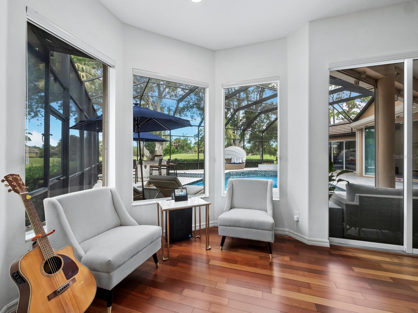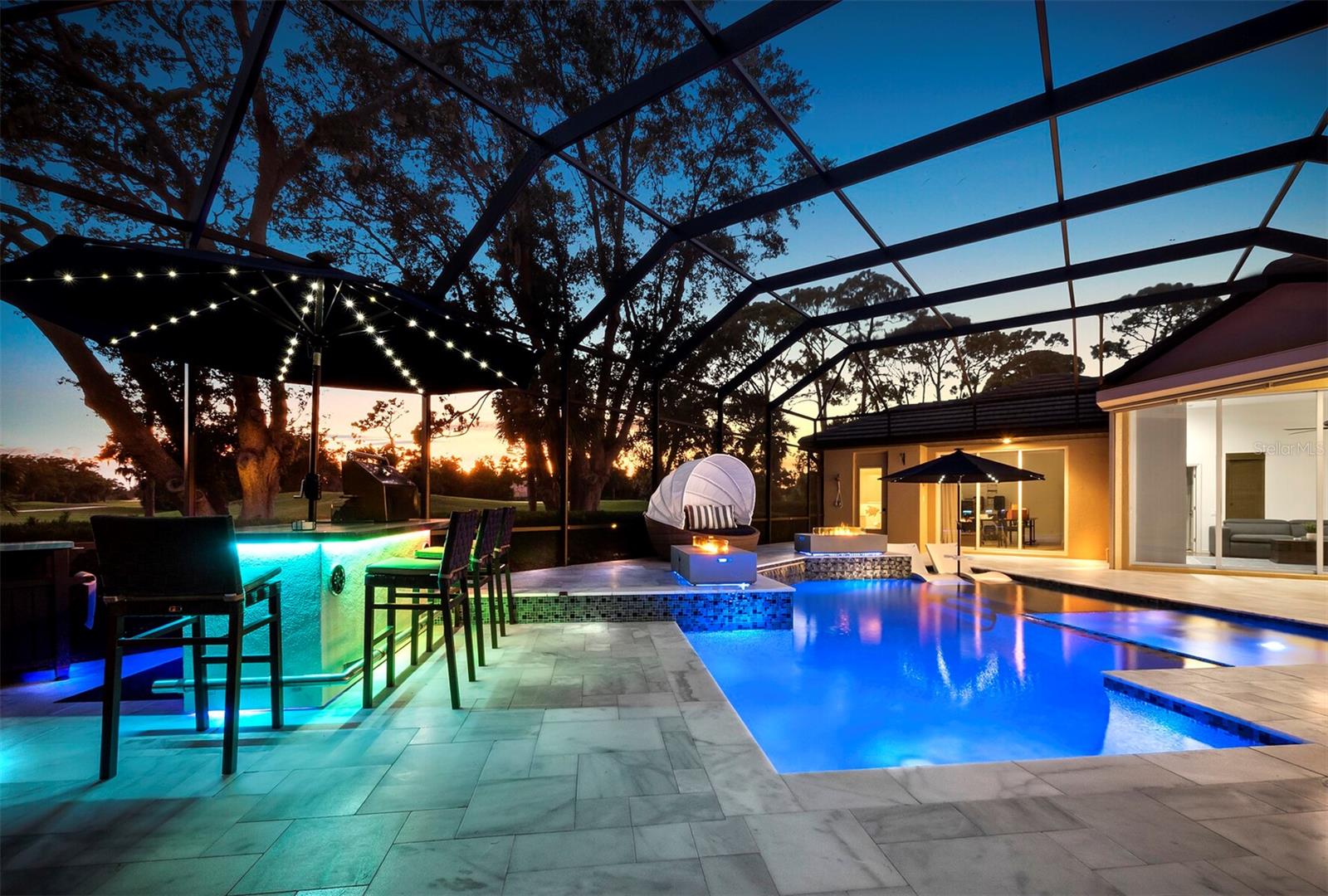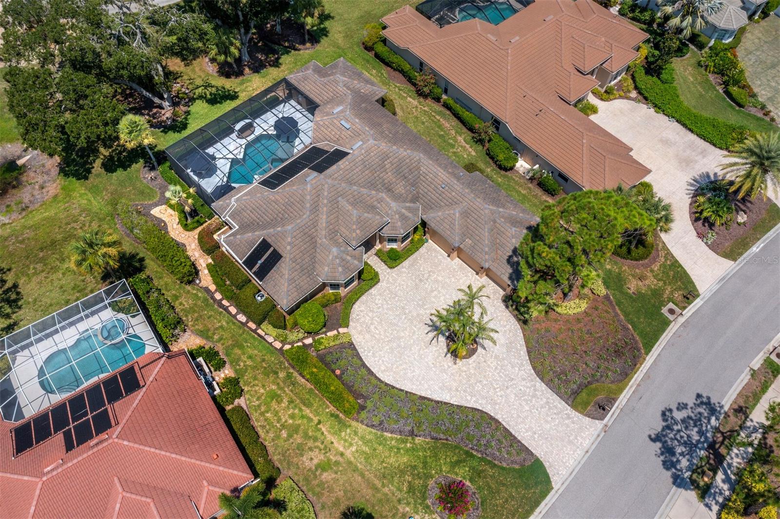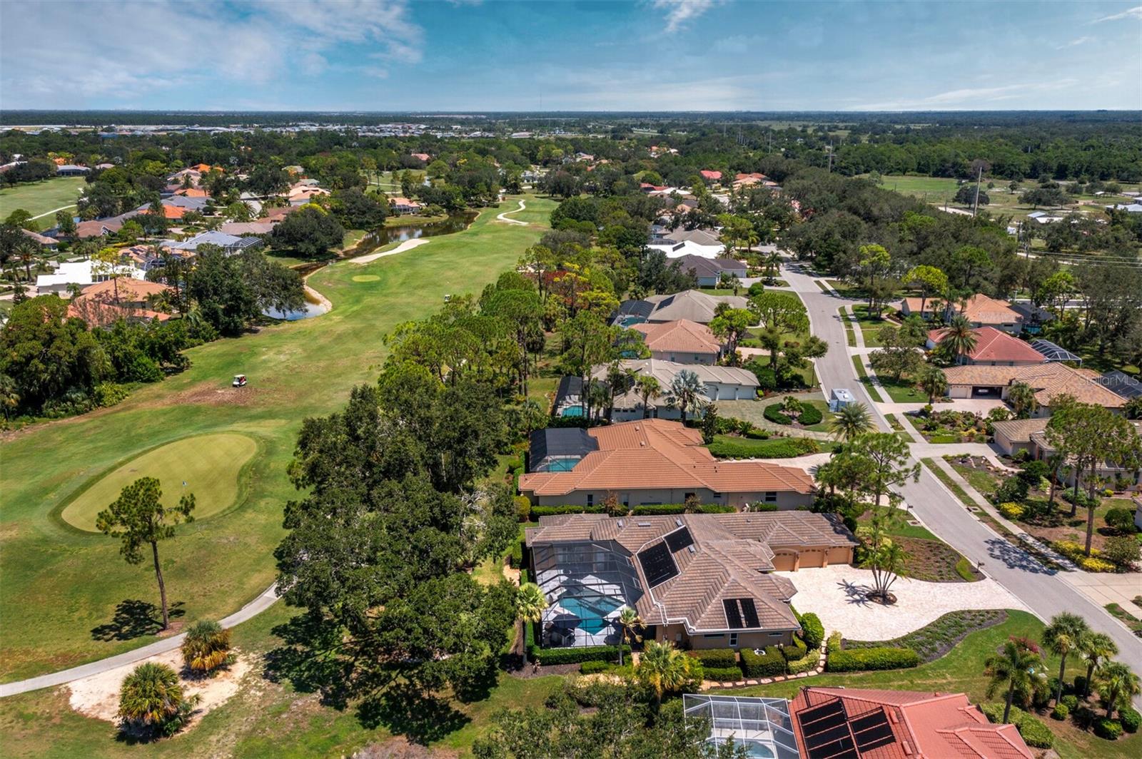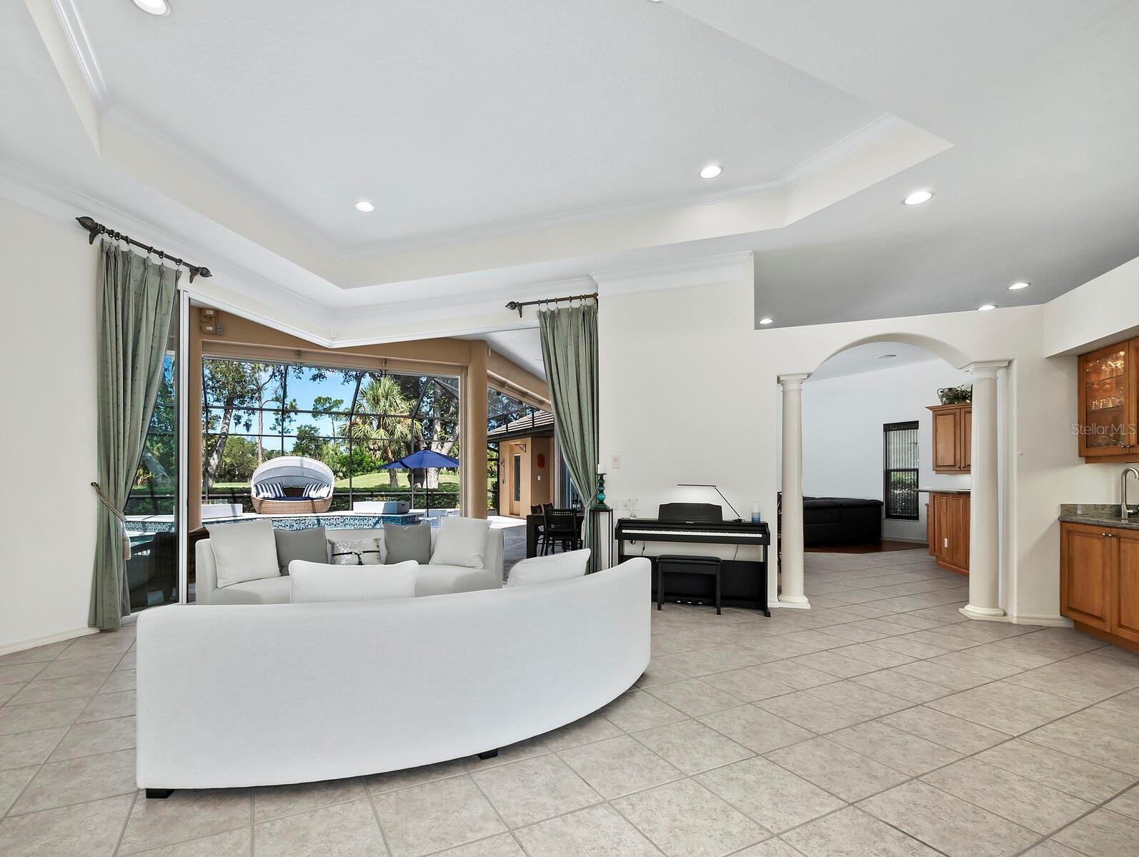 Presenting the ultimate estate home, you've been longing for. Prepare to be captivated as you step onto the extensive paver circular driveway of this opulent residence. Nestled on over 1/3 acre, this meticulously designed dwelling offers panoramic views of the lush golf course. The attention to detail, both indoors and out, is apparent from every angle. Discover an expansive floor plan that enhances the spaciousness of each room, notably the living area with its lofty double-tray ceilings and sprawling 9 ft. corner sliding doors connecting indoor and outdoor living spaces, creating an inviting flow. Hosting guests is effortless in the adjacent dining room, while the intelligently planned kitchen serves as the heart of the home. Enjoy extensive granite countertops, top-tier cabinetry, a coffee bar, raised dishwasher, stainless steel appliances, and a wet bar. For casual breakfast or lunches, the 'dinette' area is always bathed in natural light from the aquarium windows. The bonus room, ideal for a study or office use, can effortlessly transform into a fourth bedroom with the addition of a closet as it boasts its own private full bath. The kitchen and dinette area open into the family room, sliding doors and rich wood floors. Prepare to be entranced by the breathtaking vista of the pool and spa, set against the backdrop of the extensive lanai. The evenings come alive as sliding doors are drawn open, complemented by tastefully tuned LED lighting, and the gentle melody of water cascading into the artistically illuminated pool. The primary bedroom suite featuring soaring ceilings, a generously sized walk-in closet. The master bathroom is a sanctuary, boasting a soaking tub, spacious dual-entry Roman shower. Two additional bedrooms with private baths provide comfort for family or guests, while the pool bath extends convenience to the outdoor living spaces. Saving the most impressive for the finale, the lanai unveils a professionally designed solar & electric heated pool, complete with all new Pentair automation saltwater system and an oversized spa adorned with waterfalls. This outdoor haven is a masterpiece, blending materials, colors, and detailing flawlessly. The multi-color LED light options for the pool and spa, the built-in Paradise Grills bar top, and the integrated refrigerator awaits for many family and friends to enjoy, or to server as your own private oasis. Recent enhancements cater to a carefree and luxurious lifestyle, including a new roof in 2018, a cutting-edge mini-split HVAC system with dehumidification along with new overhead insulation in the garage, and smart home features such as voice/app-controlled switches, dimmers, thermostats, and alarms. A new hot water heater, solar pool heating, carefully curated landscaping enhances the verdant lawn. Safety measures are elevated with storm shutters and impact windows, providing peace of mind. This exquisite home is the epitome of perfection, offering a lifestyle of utmost comfort and leisure. Ideally situated within the coveted Calusa Lakes golf community that adorns beautiful mature oak and pines trees that make this community very special. Midway between Sarasota and Venice, you'll relish a mere 10-minute drive to renowned beaches and the charming Island of Venice. The proximity to the brand-new Sarasota Memorial Hospital and easy access to I-75 further elevate the convenience as well the legacy trail. Embrace an exceptional lifestyle where luxury and relaxation converge.