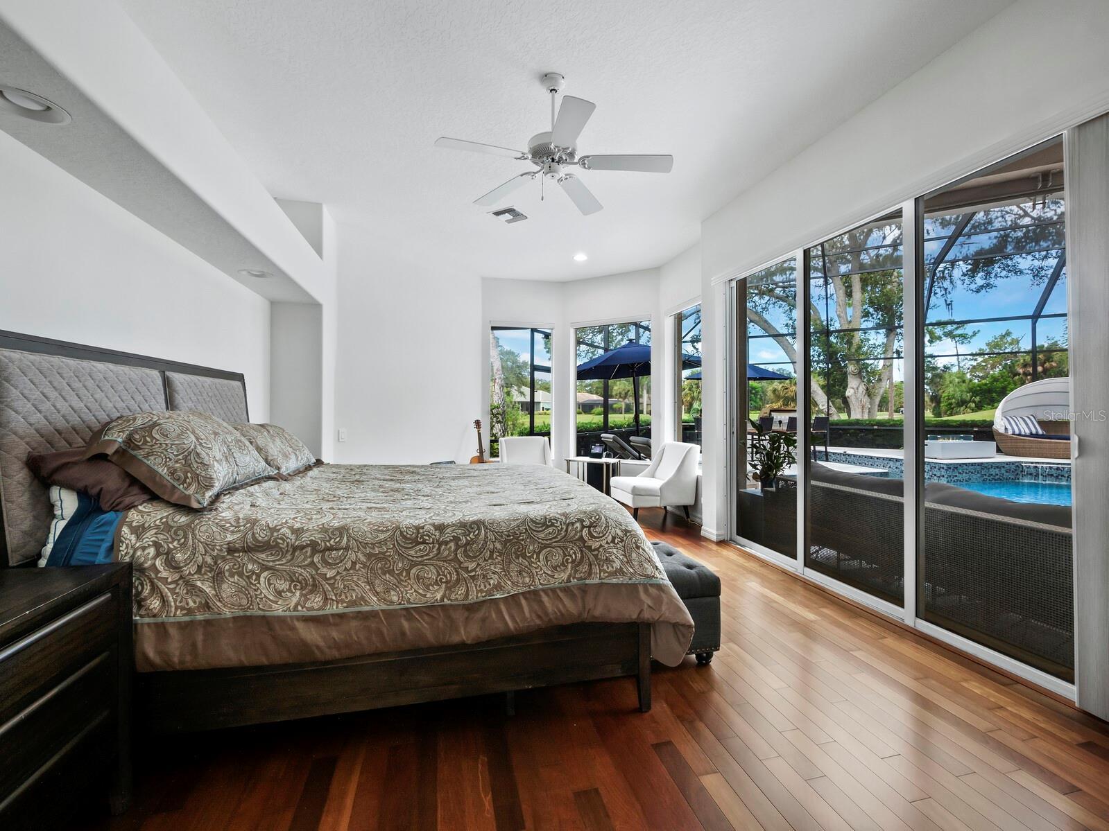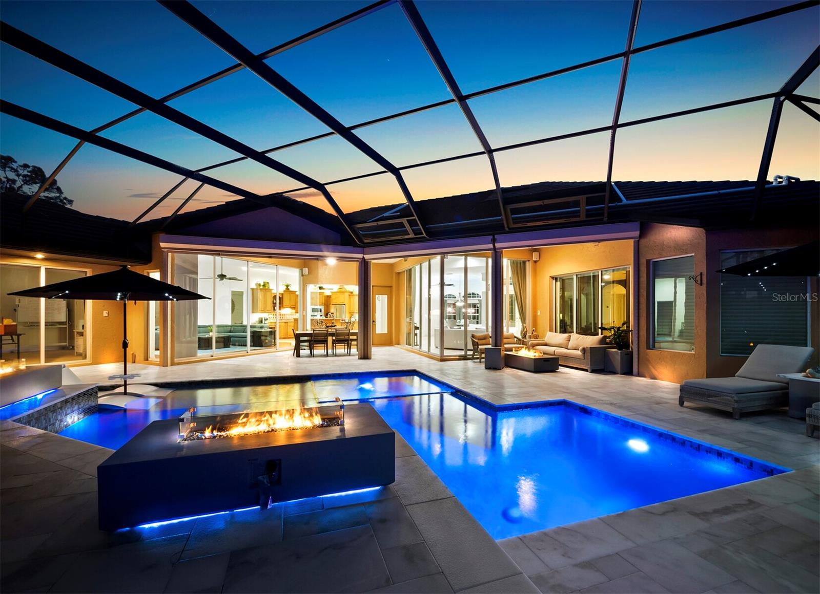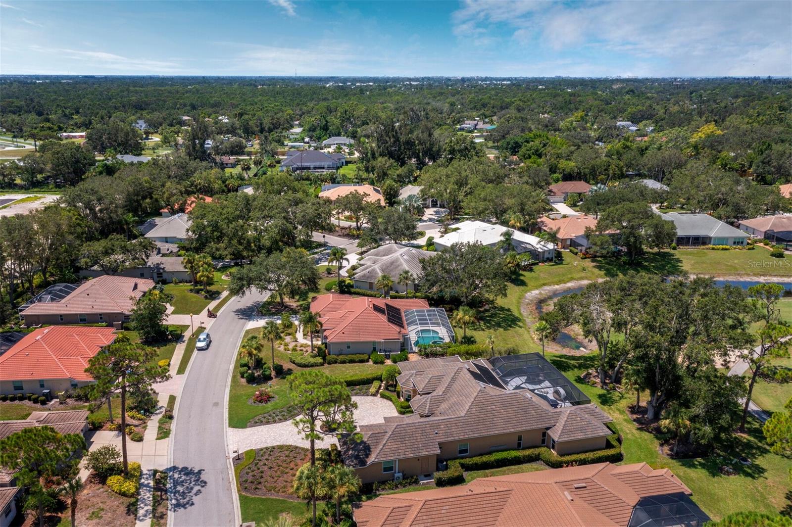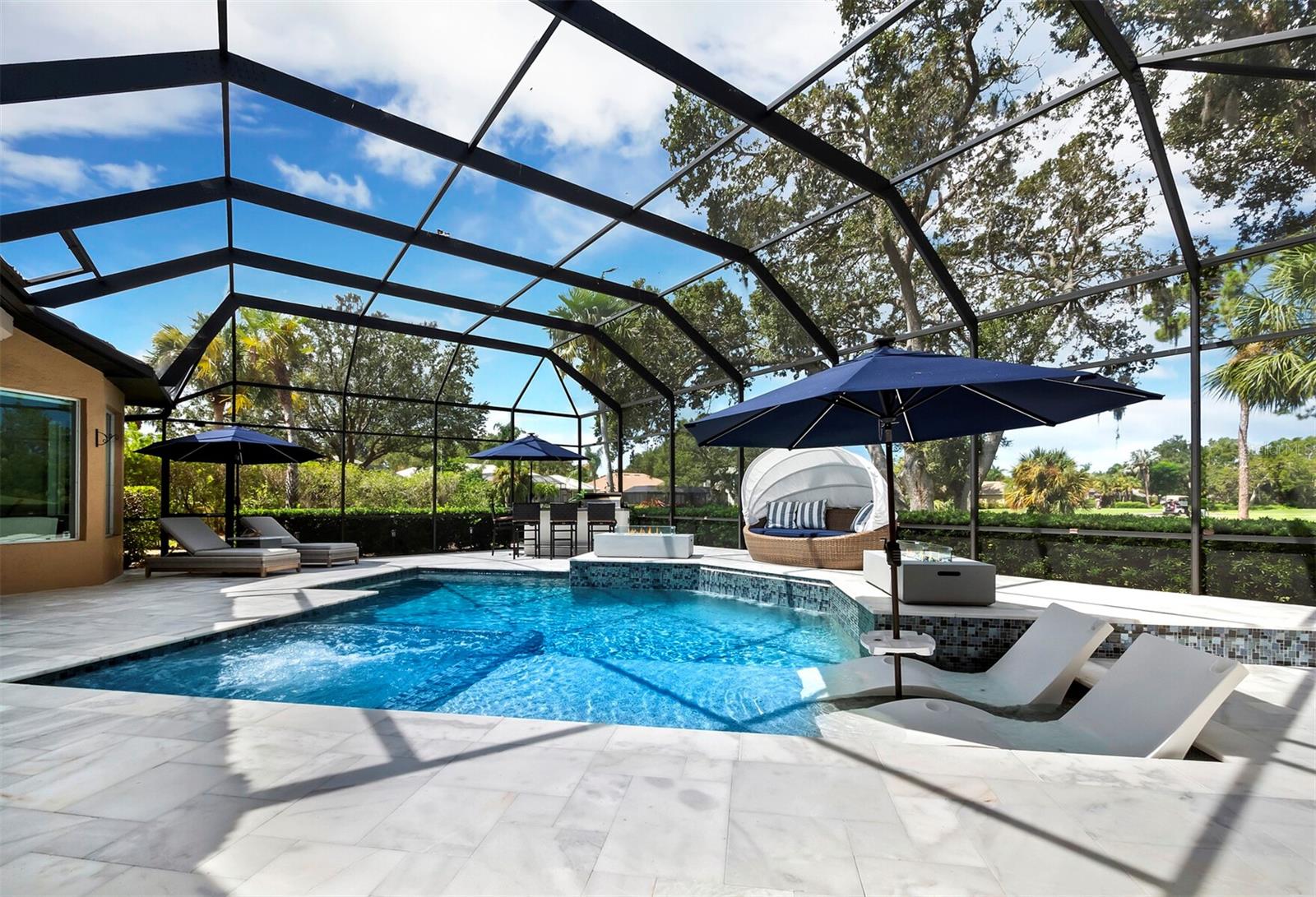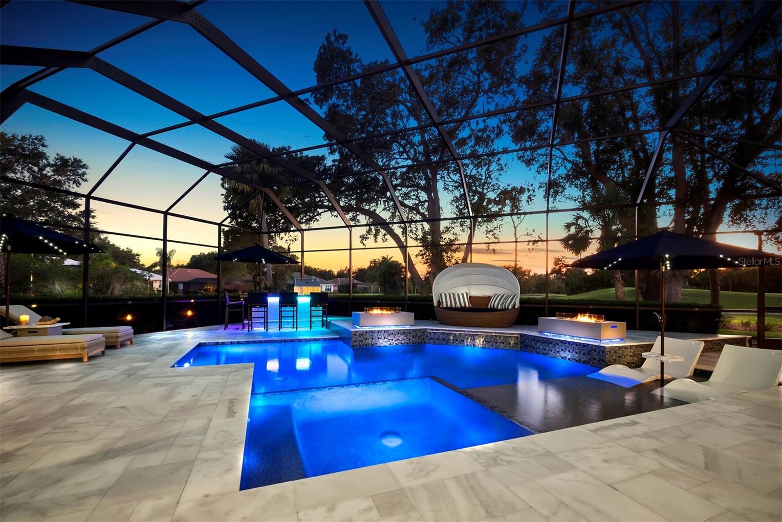 Presenting the ultimate estate home, you've been longing for. Prepare to be captivated as you step onto the extensive paver circular driveway of this opulent residence. Nestled on over 1/3 acre, this meticulously designed dwelling offers panoramic views of the lush golf course. The attention to detail, both indoors and out, is apparent from every angle. Discover an expansive floor plan that enhances the spaciousness of each room, notably the living area with its lofty double-tray ceilings and sprawling 9 ft. corner sliding doors connecting indoor and outdoor living spaces, creating an inviting flow. Hosting guests is effortless in the adjacent dining room, while the intelligently planned kitchen serves as the heart of the home. Enjoy extensive granite countertops, top-tier cabinetry, a coffee bar, raised dishwasher, stainless steel appliances, and a wet bar. For casual breakfast or lunches, the 'dinette' area is always bathed in natural light from the aquarium windows. The bonus room, ideal for a study or office use, can effortlessly transform into a fourth bedroom with the addition of a closet as it boasts its own private full bath. The kitchen and dinette area open into the family room, sliding doors and rich wood floors. Prepare to be entranced by the breathtaking vista of the pool and spa, set against the backdrop of the extensive lanai. The evenings come alive as sliding doors are drawn open, complemented by tastefully tuned LED lighting, and the gentle melody of water cascading into the artistically illuminated pool. The primary bedroom suite featuring soaring ceilings, a generously sized walk-in closet. The master bathroom is a sanctuary, boasting a soaking tub, spacious dual-entry Roman shower. Two additional bedrooms with private baths provide comfort for family or guests, while the pool bath extends convenience to the outdoor living spaces. Saving the most impressive for the finale, the lanai unveils a professionally designed solar & electric heated pool, complete with all new Pentair automation saltwater system and an oversized spa adorned with waterfalls. This outdoor haven is a masterpiece, blending materials, colors, and detailing flawlessly. The multi-color LED light options for the pool and spa, the built-in Paradise Grills bar top, and the integrated refrigerator awaits for many family and friends to enjoy, or to server as your own private oasis. Recent enhancements cater to a carefree and luxurious lifestyle, including a new roof in 2018, a cutting-edge mini-split HVAC system with dehumidification along with new overhead insulation in the garage, and smart home features such as voice/app-controlled switches, dimmers, thermostats, and alarms. A new hot water heater, solar pool heating, carefully curated landscaping enhances the verdant lawn. Safety measures are elevated with storm shutters and impact windows, providing peace of mind. This exquisite home is the epitome of perfection, offering a lifestyle of utmost comfort and leisure. Ideally situated within the coveted Calusa Lakes golf community that adorns beautiful mature oak and pines trees that make this community very special. Midway between Sarasota and Venice, you'll relish a mere 10-minute drive to renowned beaches and the charming Island of Venice. The proximity to the brand-new Sarasota Memorial Hospital and easy access to I-75 further elevate the convenience as well the legacy trail. Embrace an exceptional lifestyle where luxury and relaxation converge.