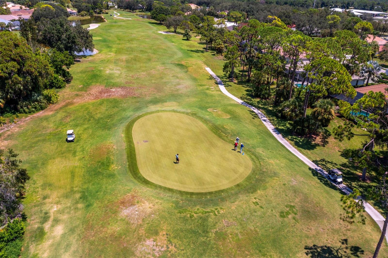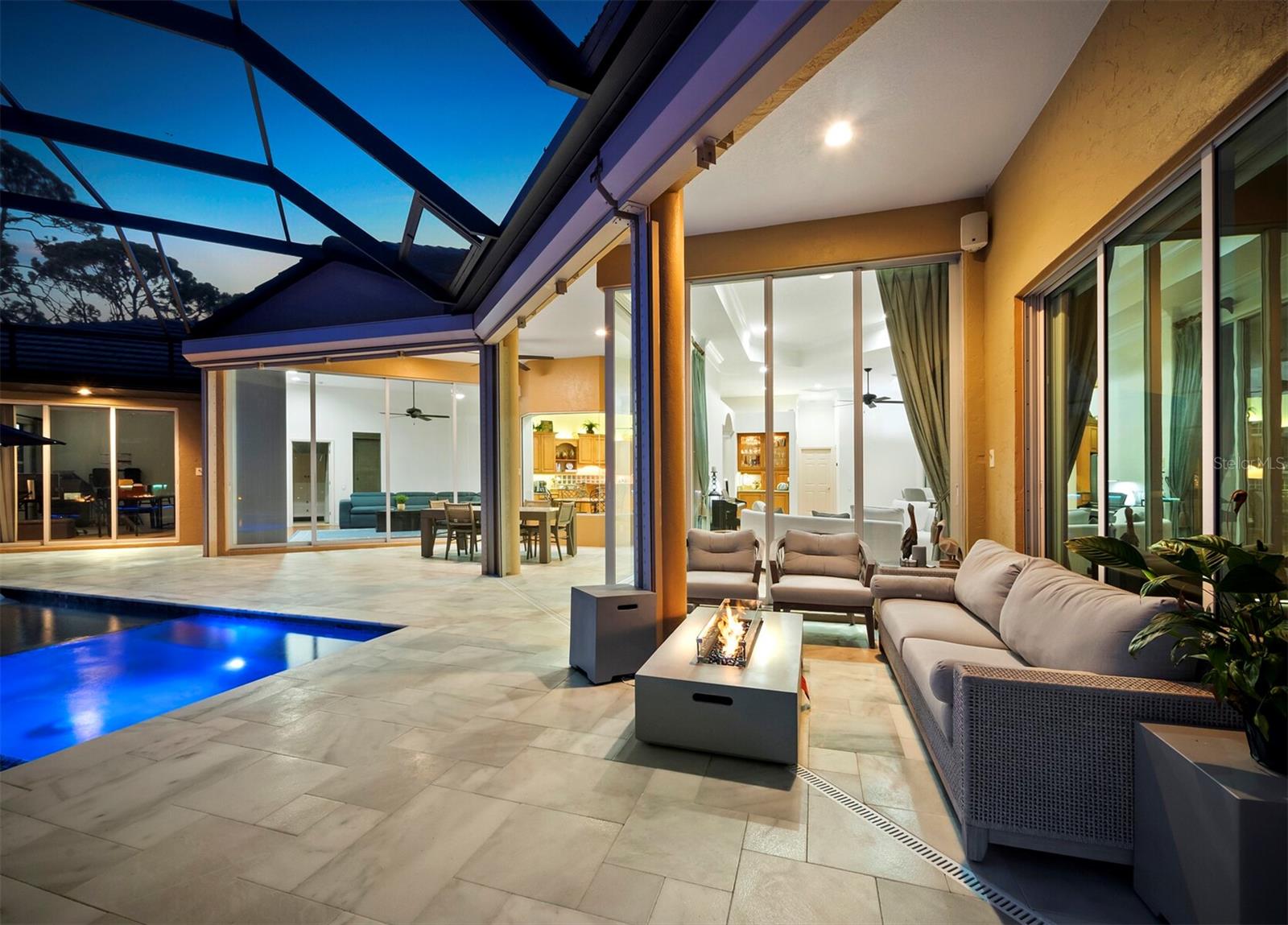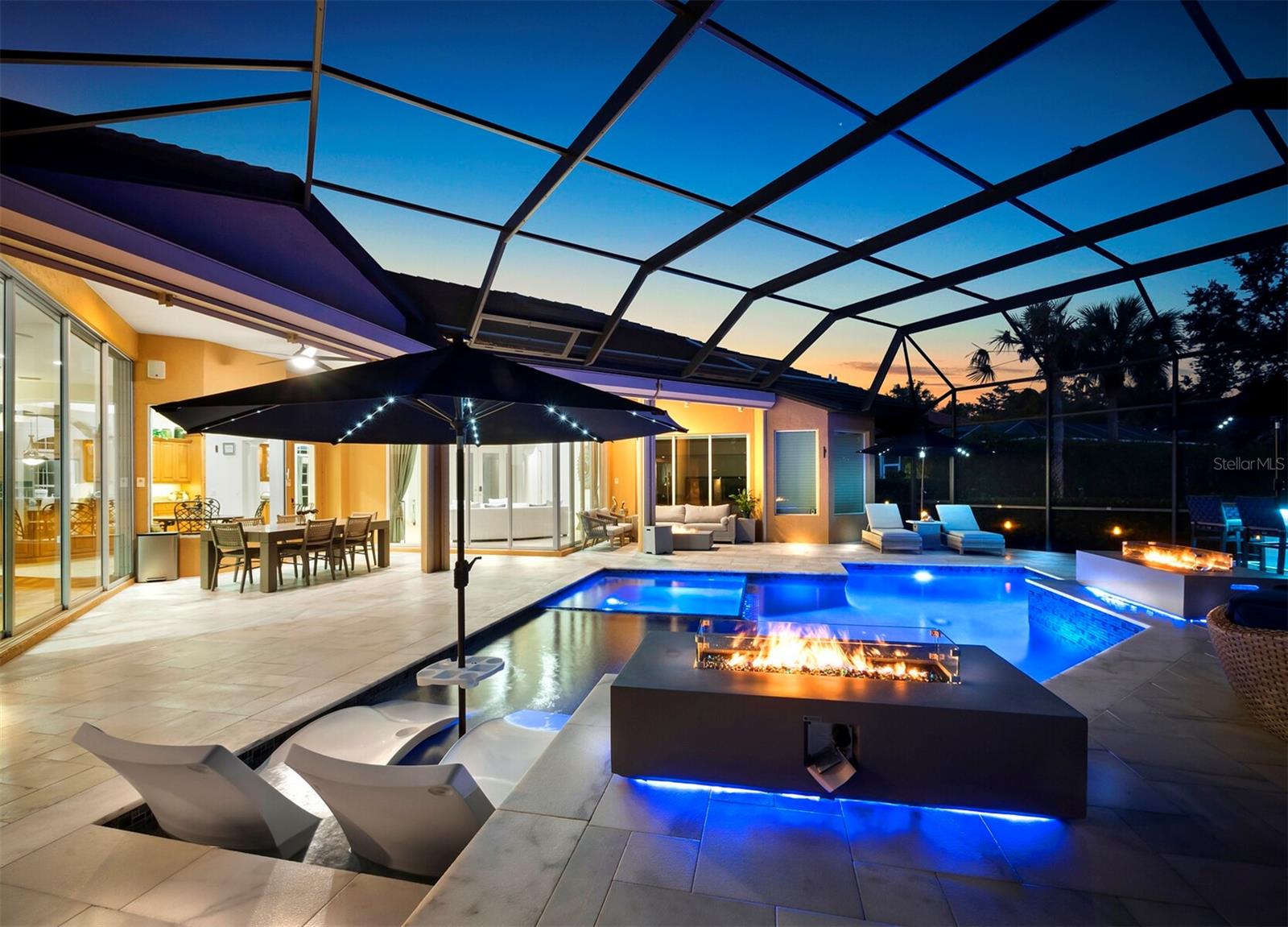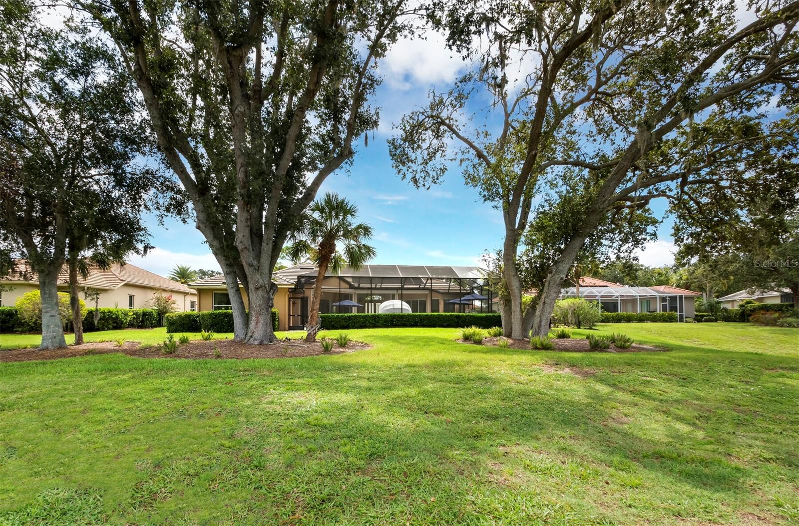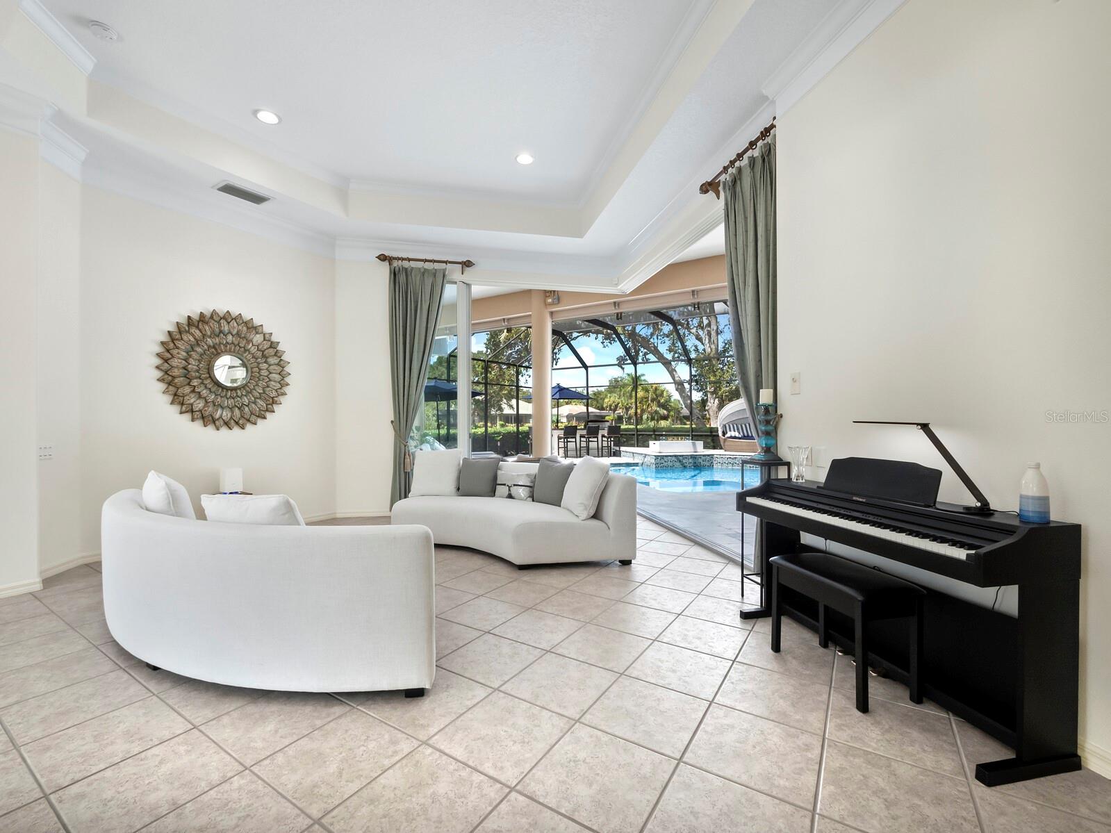 Presenting the ultimate estate home, you've been longing for. Prepare to be captivated as you step onto the extensive paver circular driveway of this opulent residence. Nestled on over 1/3 acre, this meticulously designed dwelling offers panoramic views of the lush golf course. The attention to detail, both indoors and out, is apparent from every angle. Discover an expansive floor plan that enhances the spaciousness of each room, notably the living area with its lofty double-tray ceilings and sprawling 9 ft. corner sliding doors connecting indoor and outdoor living spaces, creating an inviting flow. Hosting guests is effortless in the adjacent dining room, while the intelligently planned kitchen serves as the heart of the home. Enjoy extensive granite countertops, top-tier cabinetry, a coffee bar, raised dishwasher, stainless steel appliances, and a wet bar. For casual breakfast or lunches, the 'dinette' area is always bathed in natural light from the aquarium windows. The bonus room, ideal for a study or office use, can effortlessly transform into a fourth bedroom with the addition of a closet as it boasts its own private full bath. The kitchen and dinette area open into the family room, sliding doors and rich wood floors. Prepare to be entranced by the breathtaking vista of the pool and spa, set against the backdrop of the extensive lanai. The evenings come alive as sliding doors are drawn open, complemented by tastefully tuned LED lighting, and the gentle melody of water cascading into the artistically illuminated pool. The primary bedroom suite featuring soaring ceilings, a generously sized walk-in closet. The master bathroom is a sanctuary, boasting a soaking tub, spacious dual-entry Roman shower. Two additional bedrooms with private baths provide comfort for family or guests, while the pool bath extends convenience to the outdoor living spaces. Saving the most impressive for the finale, the lanai unveils a professionally designed solar & electric heated pool, complete with all new Pentair automation saltwater system and an oversized spa adorned with waterfalls. This outdoor haven is a masterpiece, blending materials, colors, and detailing flawlessly. The multi-color LED light options for the pool and spa, the built-in Paradise Grills bar top, and the integrated refrigerator awaits for many family and friends to enjoy, or to server as your own private oasis. Recent enhancements cater to a carefree and luxurious lifestyle, including a new roof in 2018, a cutting-edge mini-split HVAC system with dehumidification along with new overhead insulation in the garage, and smart home features such as voice/app-controlled switches, dimmers, thermostats, and alarms. A new hot water heater, solar pool heating, carefully curated landscaping enhances the verdant lawn. Safety measures are elevated with storm shutters and impact windows, providing peace of mind. This exquisite home is the epitome of perfection, offering a lifestyle of utmost comfort and leisure. Ideally situated within the coveted Calusa Lakes golf community that adorns beautiful mature oak and pines trees that make this community very special. Midway between Sarasota and Venice, you'll relish a mere 10-minute drive to renowned beaches and the charming Island of Venice. The proximity to the brand-new Sarasota Memorial Hospital and easy access to I-75 further elevate the convenience as well the legacy trail. Embrace an exceptional lifestyle where luxury and relaxation converge.