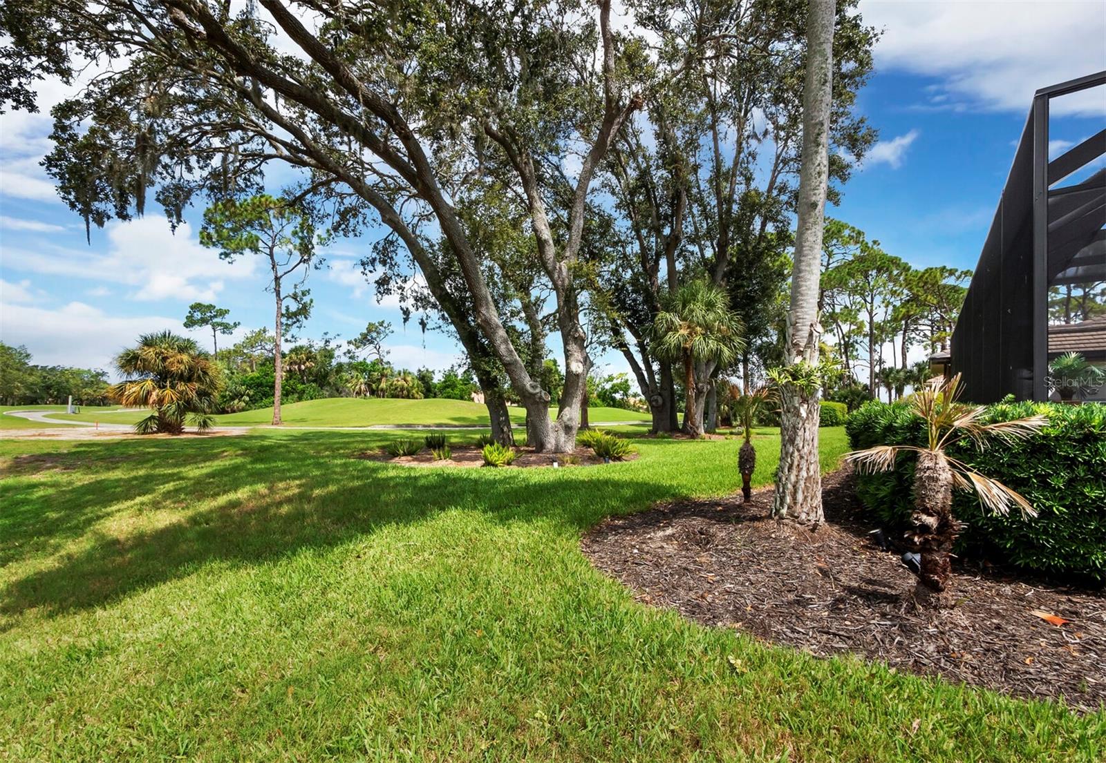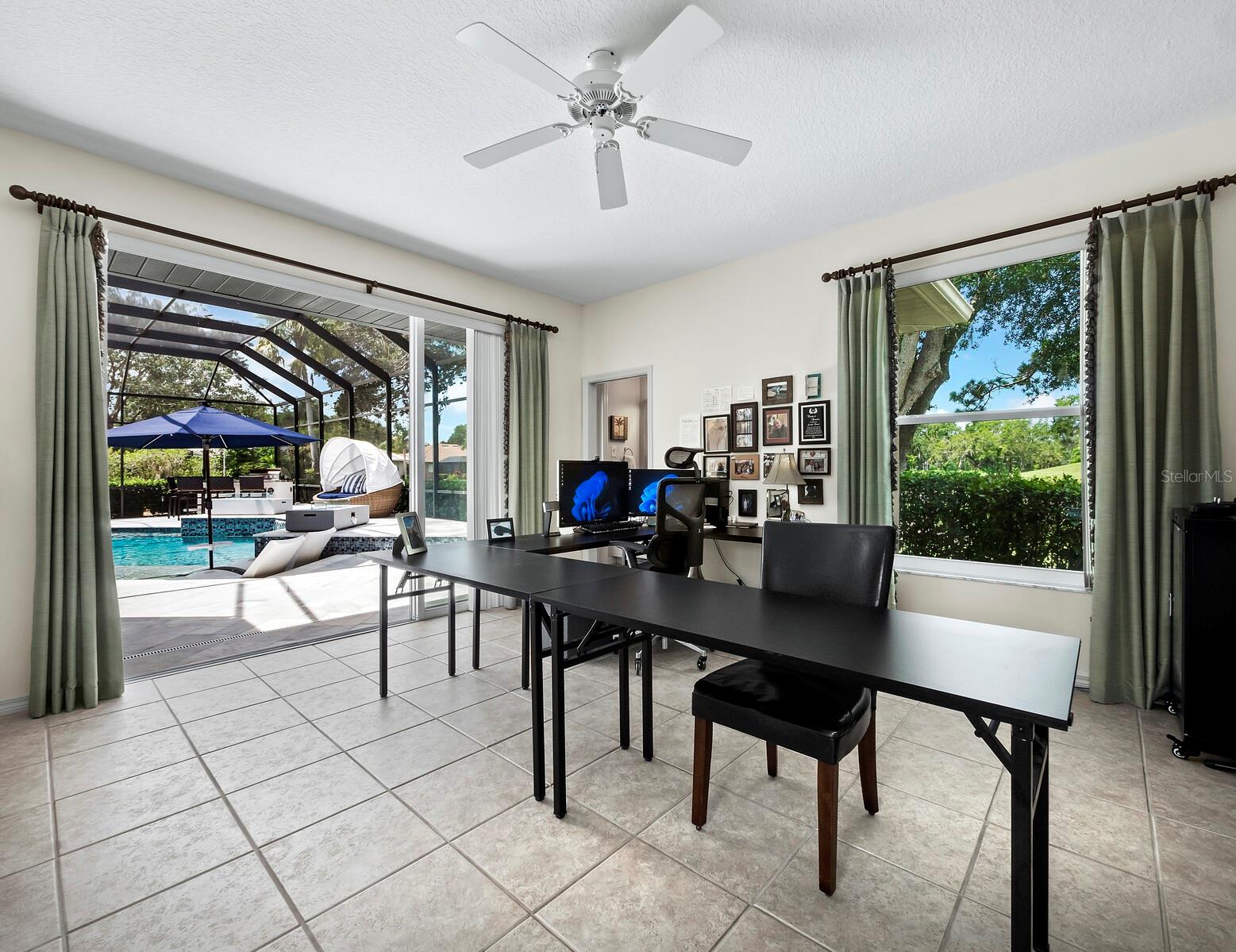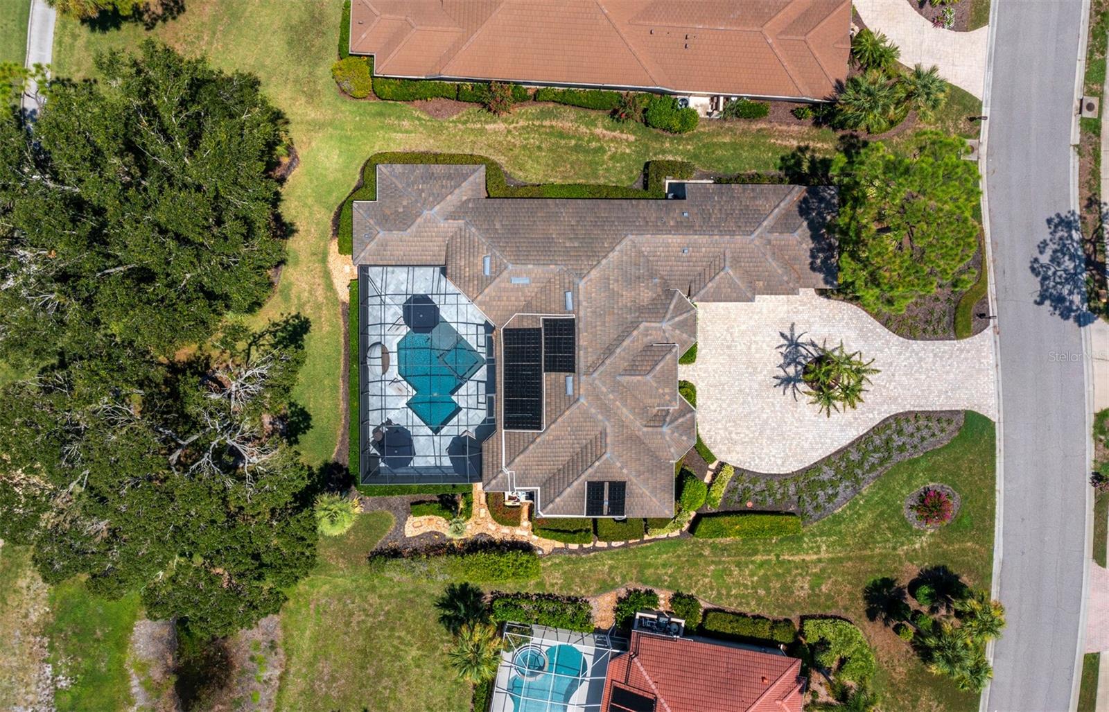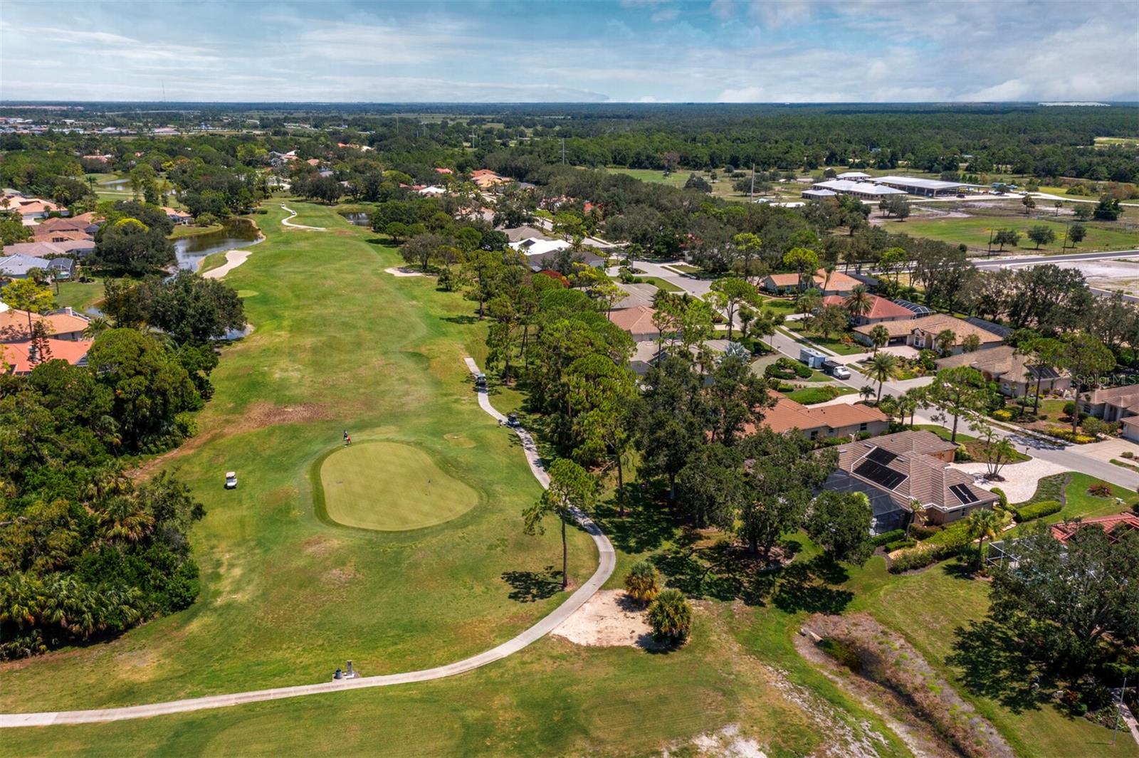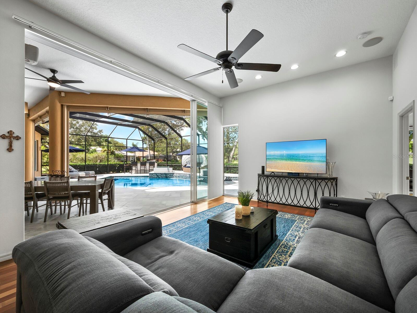 Presenting the ultimate estate home, you've been longing for. Prepare to be captivated as you step onto the extensive paver circular driveway of this opulent residence. Nestled on over 1/3 acre, this meticulously designed dwelling offers panoramic views of the lush golf course. The attention to detail, both indoors and out, is apparent from every angle. Discover an expansive floor plan that enhances the spaciousness of each room, notably the living area with its lofty double-tray ceilings and sprawling 9 ft. corner sliding doors connecting indoor and outdoor living spaces, creating an inviting flow. Hosting guests is effortless in the adjacent dining room, while the intelligently planned kitchen serves as the heart of the home. Enjoy extensive granite countertops, top-tier cabinetry, a coffee bar, raised dishwasher, stainless steel appliances, and a wet bar. For casual breakfast or lunches, the 'dinette' area is always bathed in natural light from the aquarium windows. The bonus room, ideal for a study or office use, can effortlessly transform into a fourth bedroom with the addition of a closet as it boasts its own private full bath. The kitchen and dinette area open into the family room, sliding doors and rich wood floors. Prepare to be entranced by the breathtaking vista of the pool and spa, set against the backdrop of the extensive lanai. The evenings come alive as sliding doors are drawn open, complemented by tastefully tuned LED lighting, and the gentle melody of water cascading into the artistically illuminated pool. The primary bedroom suite featuring soaring ceilings, a generously sized walk-in closet. The master bathroom is a sanctuary, boasting a soaking tub, spacious dual-entry Roman shower. Two additional bedrooms with private baths provide comfort for family or guests, while the pool bath extends convenience to the outdoor living spaces. Saving the most impressive for the finale, the lanai unveils a professionally designed solar & electric heated pool, complete with all new Pentair automation saltwater system and an oversized spa adorned with waterfalls. This outdoor haven is a masterpiece, blending materials, colors, and detailing flawlessly. The multi-color LED light options for the pool and spa, the built-in Paradise Grills bar top, and the integrated refrigerator awaits for many family and friends to enjoy, or to server as your own private oasis. Recent enhancements cater to a carefree and luxurious lifestyle, including a new roof in 2018, a cutting-edge mini-split HVAC system with dehumidification along with new overhead insulation in the garage, and smart home features such as voice/app-controlled switches, dimmers, thermostats, and alarms. A new hot water heater, solar pool heating, carefully curated landscaping enhances the verdant lawn. Safety measures are elevated with storm shutters and impact windows, providing peace of mind. This exquisite home is the epitome of perfection, offering a lifestyle of utmost comfort and leisure. Ideally situated within the coveted Calusa Lakes golf community that adorns beautiful mature oak and pines trees that make this community very special. Midway between Sarasota and Venice, you'll relish a mere 10-minute drive to renowned beaches and the charming Island of Venice. The proximity to the brand-new Sarasota Memorial Hospital and easy access to I-75 further elevate the convenience as well the legacy trail. Embrace an exceptional lifestyle where luxury and relaxation converge.