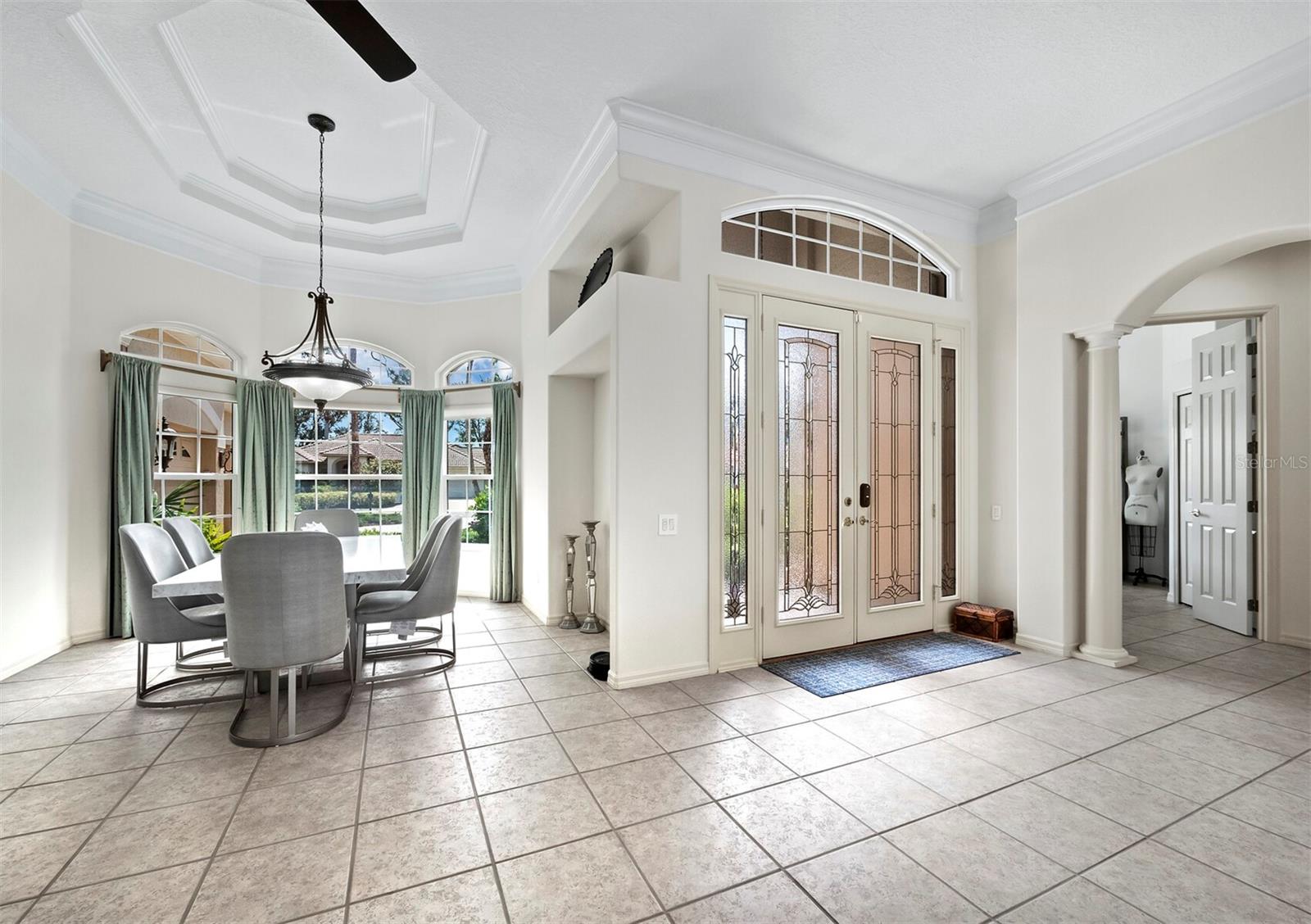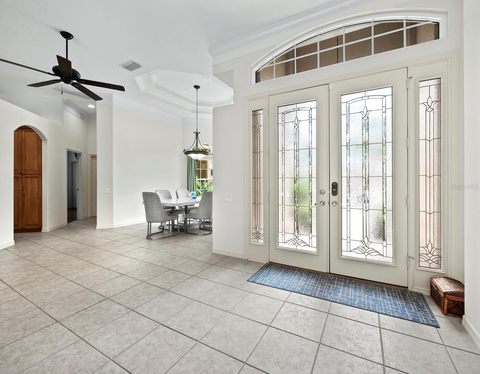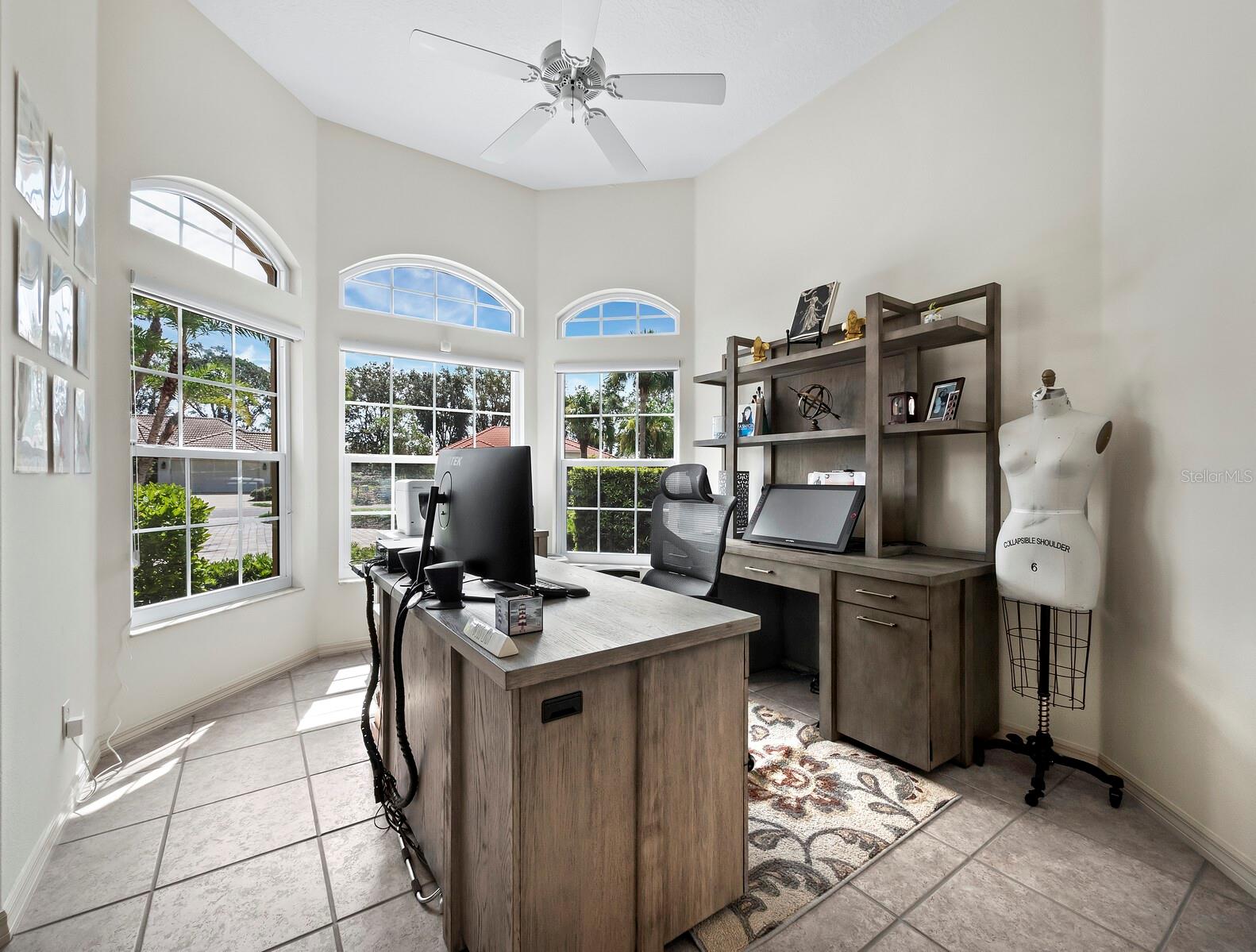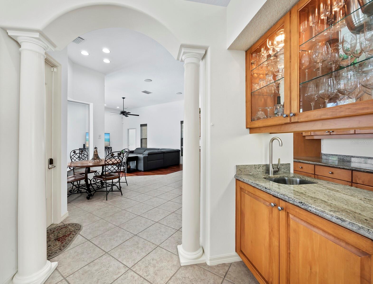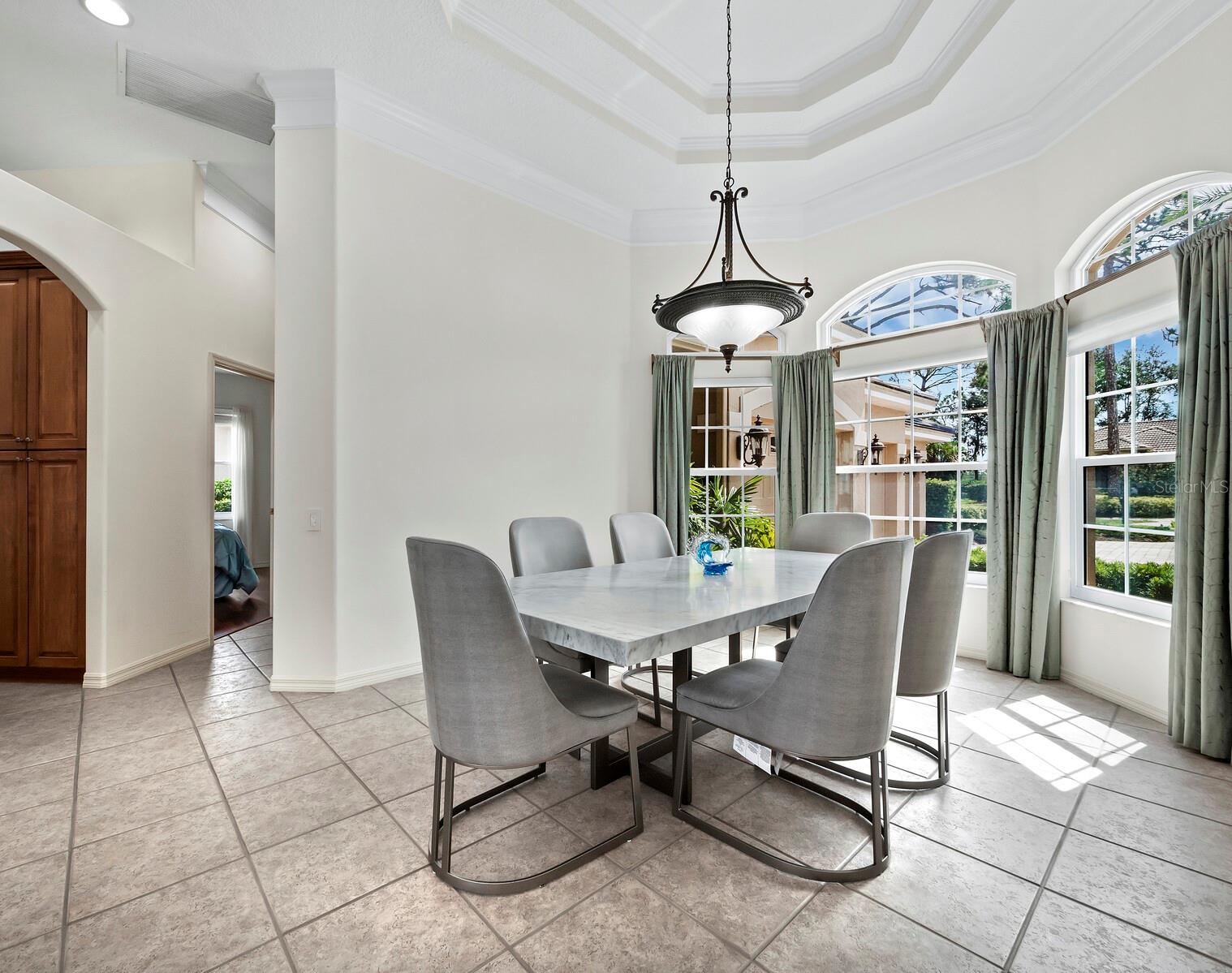 Presenting the ultimate estate home, you've been longing for. Prepare to be captivated as you step onto the extensive paver circular driveway of this opulent residence. Nestled on over 1/3 acre, this meticulously designed dwelling offers panoramic views of the lush golf course. The attention to detail, both indoors and out, is apparent from every angle. Discover an expansive floor plan that enhances the spaciousness of each room, notably the living area with its lofty double-tray ceilings and sprawling 9 ft. corner sliding doors connecting indoor and outdoor living spaces, creating an inviting flow. Hosting guests is effortless in the adjacent dining room, while the intelligently planned kitchen serves as the heart of the home. Enjoy extensive granite countertops, top-tier cabinetry, a coffee bar, raised dishwasher, stainless steel appliances, and a wet bar. For casual breakfast or lunches, the 'dinette' area is always bathed in natural light from the aquarium windows. The bonus room, ideal for a study or office use, can effortlessly transform into a fourth bedroom with the addition of a closet as it boasts its own private full bath. The kitchen and dinette area open into the family room, sliding doors and rich wood floors. Prepare to be entranced by the breathtaking vista of the pool and spa, set against the backdrop of the extensive lanai. The evenings come alive as sliding doors are drawn open, complemented by tastefully tuned LED lighting, and the gentle melody of water cascading into the artistically illuminated pool. The primary bedroom suite featuring soaring ceilings, a generously sized walk-in closet. The master bathroom is a sanctuary, boasting a soaking tub, spacious dual-entry Roman shower. Two additional bedrooms with private baths provide comfort for family or guests, while the pool bath extends convenience to the outdoor living spaces. Saving the most impressive for the finale, the lanai unveils a professionally designed solar & electric heated pool, complete with all new Pentair automation saltwater system and an oversized spa adorned with waterfalls. This outdoor haven is a masterpiece, blending materials, colors, and detailing flawlessly. The multi-color LED light options for the pool and spa, the built-in Paradise Grills bar top, and the integrated refrigerator awaits for many family and friends to enjoy, or to server as your own private oasis. Recent enhancements cater to a carefree and luxurious lifestyle, including a new roof in 2018, a cutting-edge mini-split HVAC system with dehumidification along with new overhead insulation in the garage, and smart home features such as voice/app-controlled switches, dimmers, thermostats, and alarms. A new hot water heater, solar pool heating, carefully curated landscaping enhances the verdant lawn. Safety measures are elevated with storm shutters and impact windows, providing peace of mind. This exquisite home is the epitome of perfection, offering a lifestyle of utmost comfort and leisure. Ideally situated within the coveted Calusa Lakes golf community that adorns beautiful mature oak and pines trees that make this community very special. Midway between Sarasota and Venice, you'll relish a mere 10-minute drive to renowned beaches and the charming Island of Venice. The proximity to the brand-new Sarasota Memorial Hospital and easy access to I-75 further elevate the convenience as well the legacy trail. Embrace an exceptional lifestyle where luxury and relaxation converge.