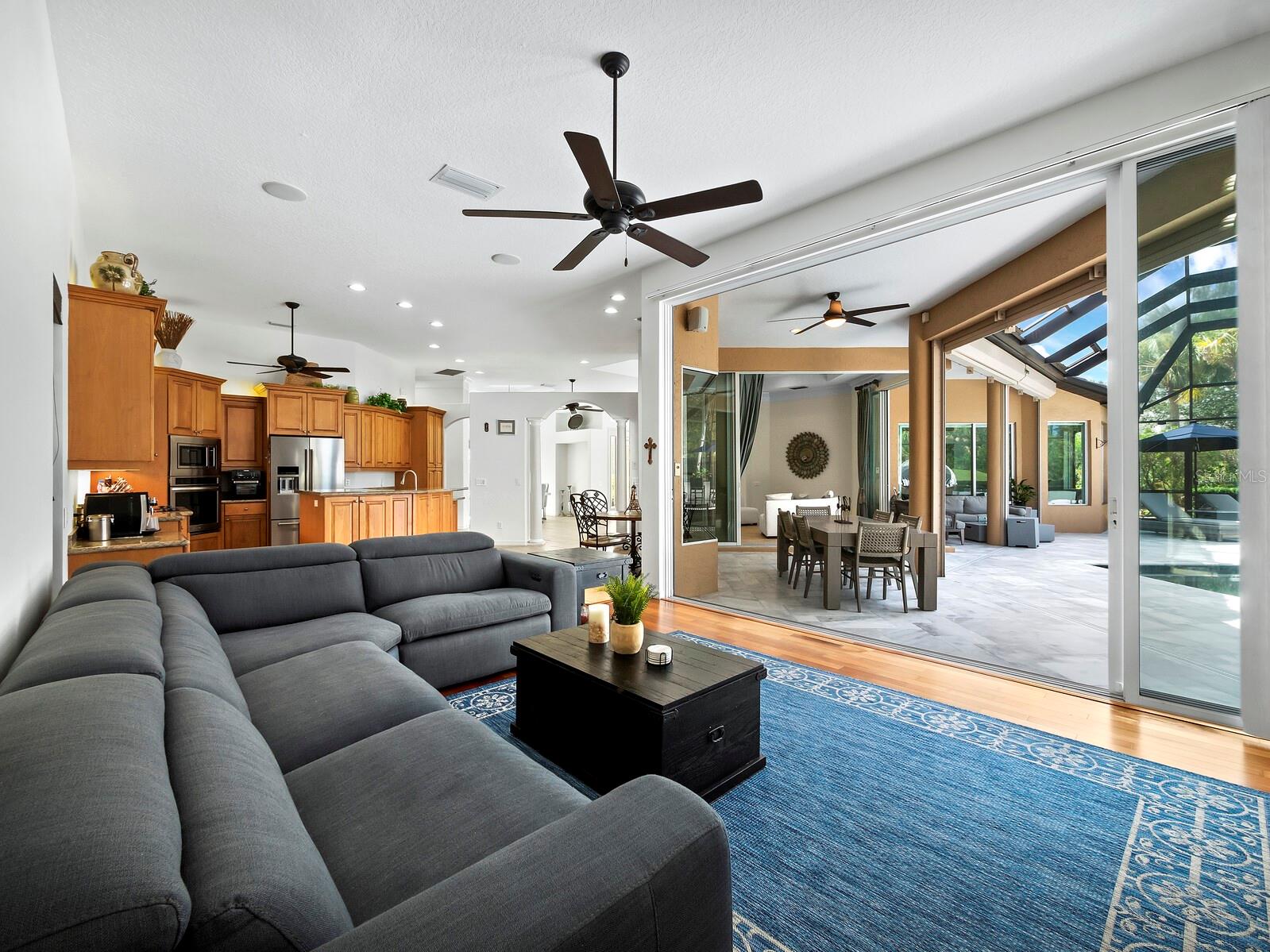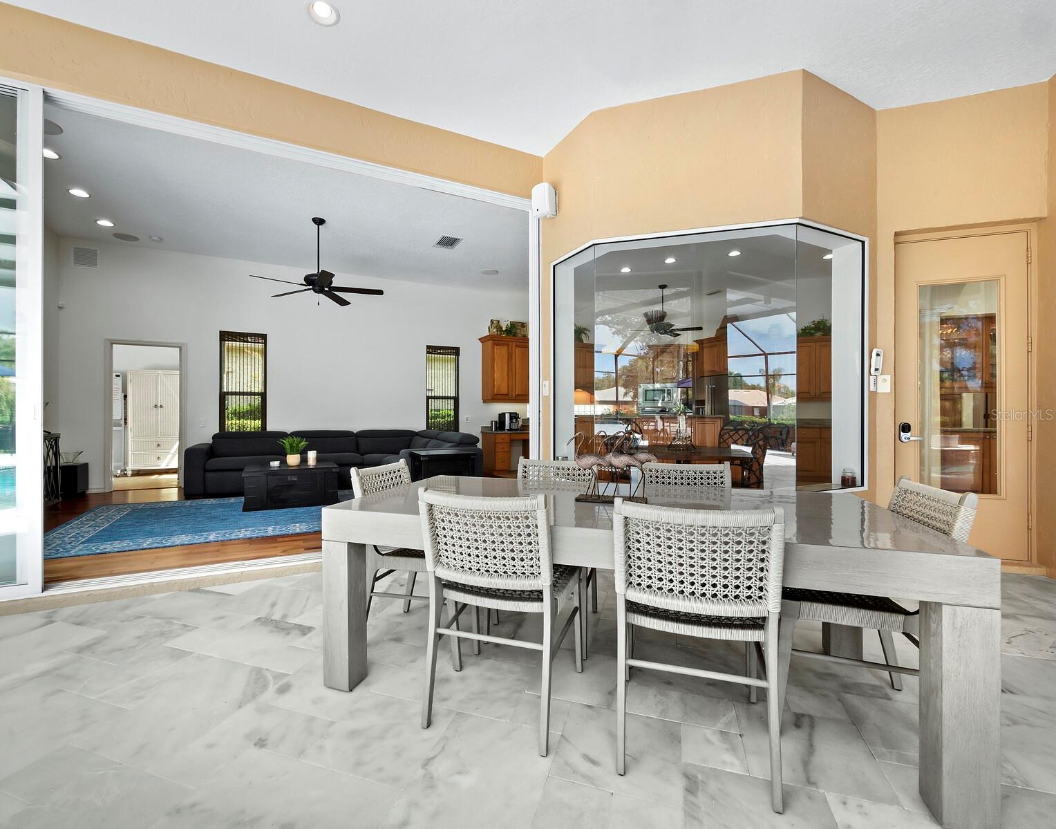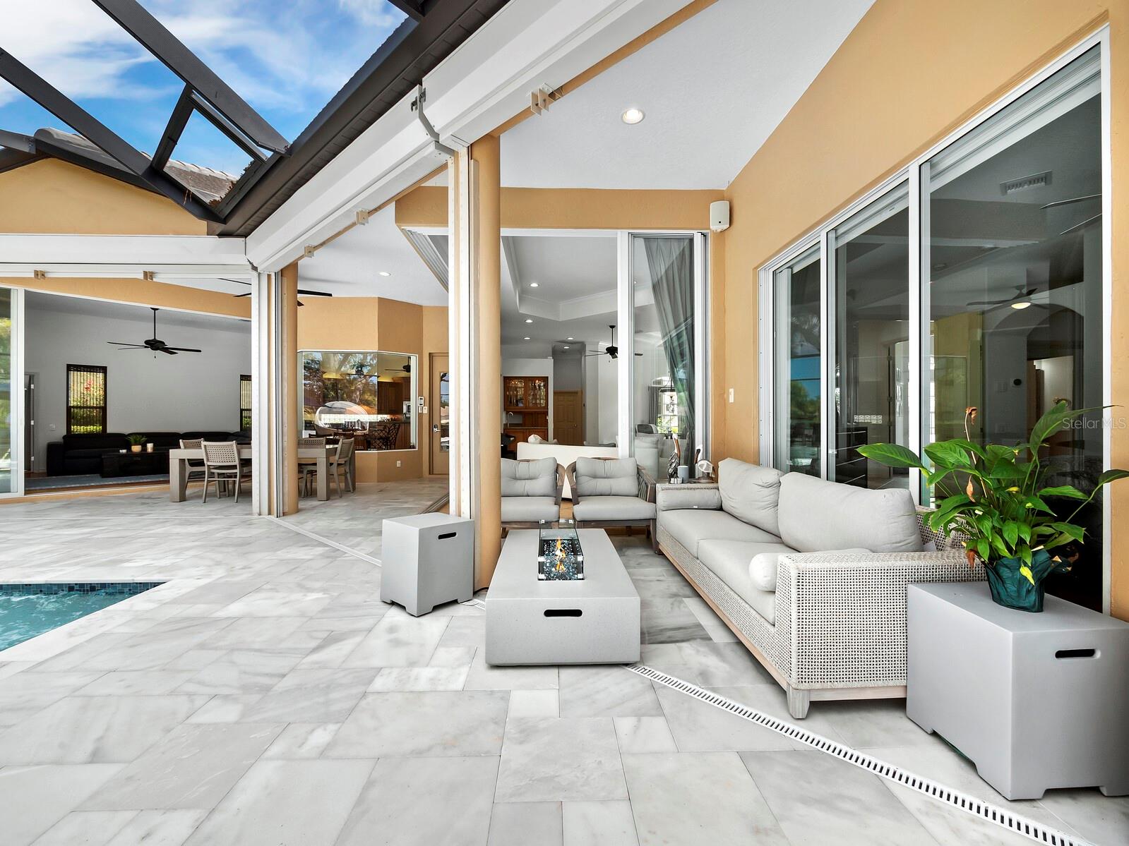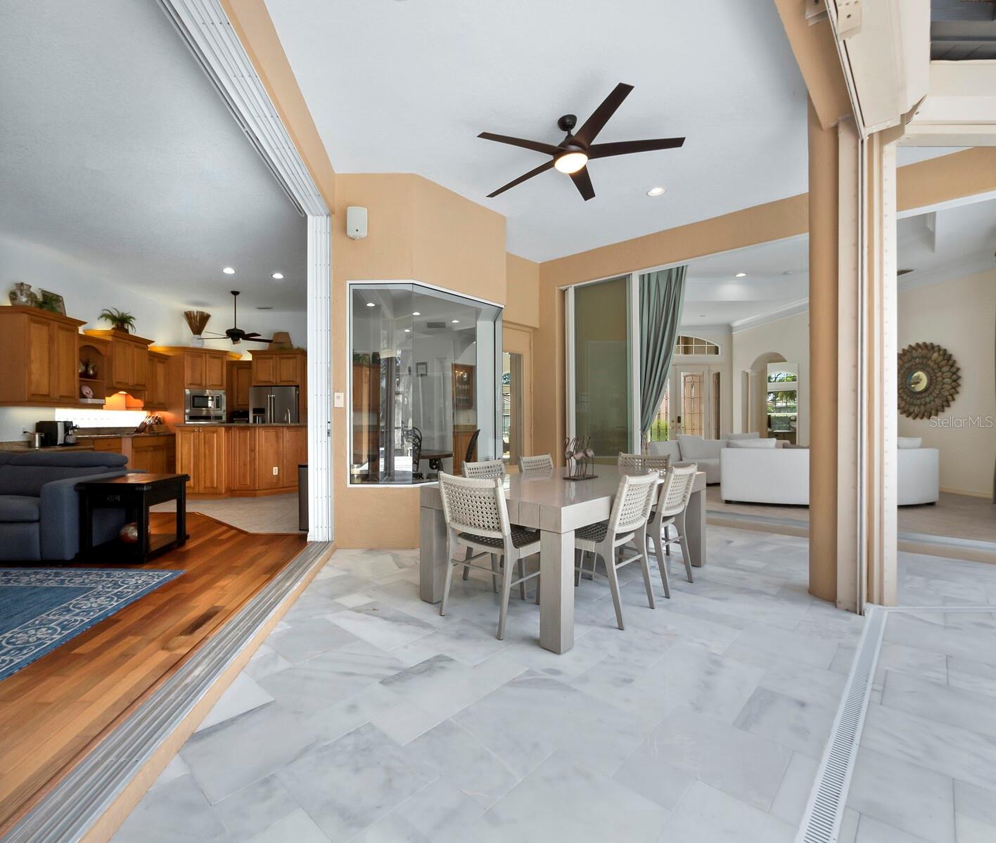 - Exterior: Hurricane Shutters, Irrigation System, Lighting, Outdoor Kitchen, Rain Gutters, Sliding Doors