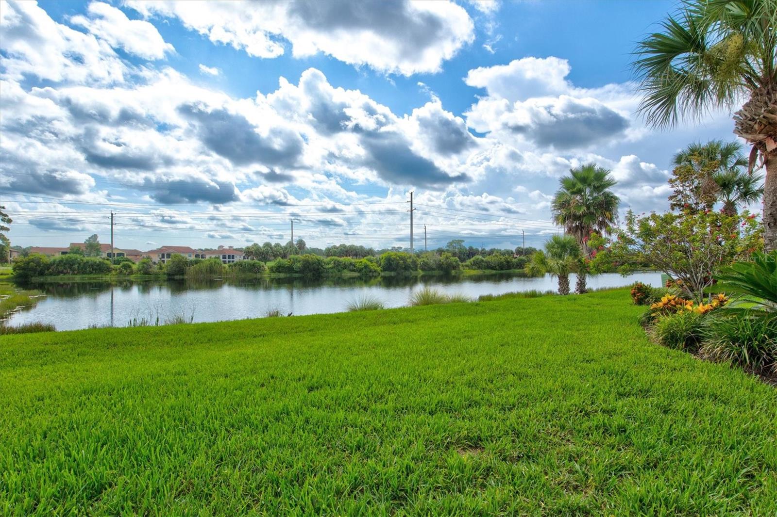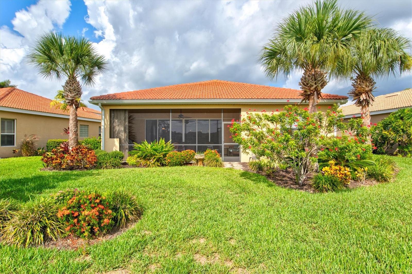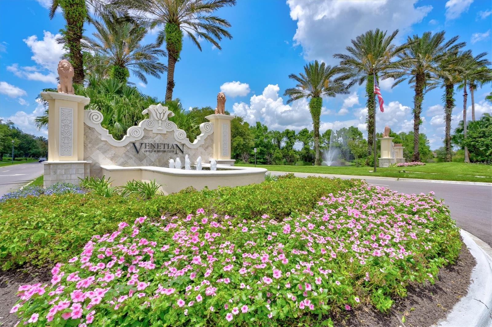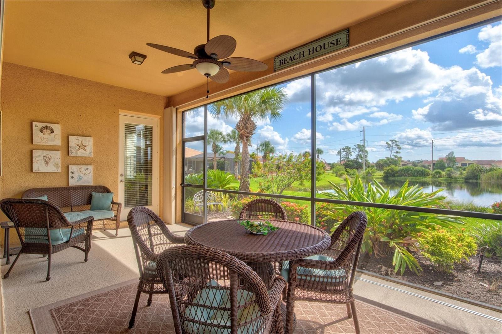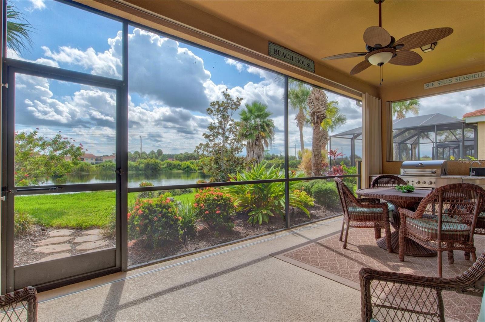 Freshly painted interior main living areas. Enjoy maintenance-free living in this resort style community with 24 hr security and roaming security, social membership is included in Hoa. This bright, elegant open concept home with 12 ft ceilings, outdoor automatic lighting, and a two-car garage, has been beautifully maintained. It is boasting 2 bedrooms, 2 baths and a versatile den which can be transformed to meet your own unique needs and can be used as a home office, a library, or even as an extra guest room. The kitchen features gas range for cooking, solid neutral countertops. There is plenty of counter space, a breakfast bar and a caf-style dining area. The open concept of this home connects the kitchen, living area and dining room. The extra-large primary bedroom offers a private ensuite bathroom, walk-in closet, tray ceilings, water views, and a private exit out to the lanai. The ensuite bathroom has a soaking tub, walk-in shower, and dual vanity sinks. In the evening, open the 18 ft wide tinted patio sliding doors that completely pocket so you can enjoy a seamless indoor/outdoor living with a full outdoor kitchen equipped with a natural gas BBQ, a gas grill cook top, fridge, sink and granite countertops. Some of the noted features and benefits of this home are: porcelain wood-look tile throughout, tray ceilings in the main living area and owner's suite, crown molding, hurricane impact windows, new in 2022 accordian-style hurricane shutters, AC replaced in 2019, a wifi garage door opener, and newer appliances and lighting. The HOA fees include lawn maintenance, 24 hr guard gated entry, cable TV and high-speed fiber internet. This is more than just a home, it's a lifestyle. Located in beautiful North Venice just minutes from gulf beaches, dining and shopping. Savor exquisite dining and events at the River Club overlooking a serene 70-acre nature park along the Myakka River. Also included is the gym, aerobics/yoga studio, or take a dip in the luxury resort-style pool, swim in the separate lap pool, and then have a drink or lunch at the Tiki Hut cabana bar. Tennis enthusiasts will be enthralled by the six court Har-Tru tennis courts, and pro organized tennis program. Pickleball players will love the newly built pickleball courts. This community is within an easy short drive to the new state-of-the-art Sarasota Memorial Hospital. Schedule a tour today.