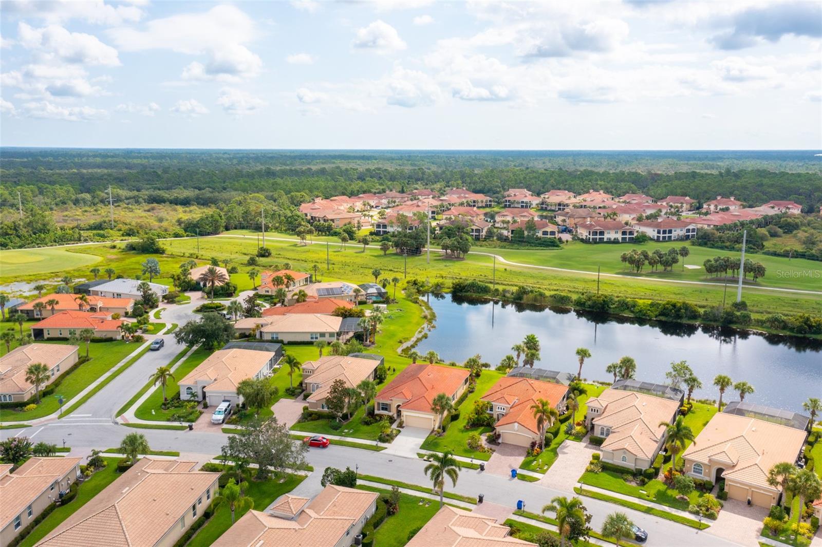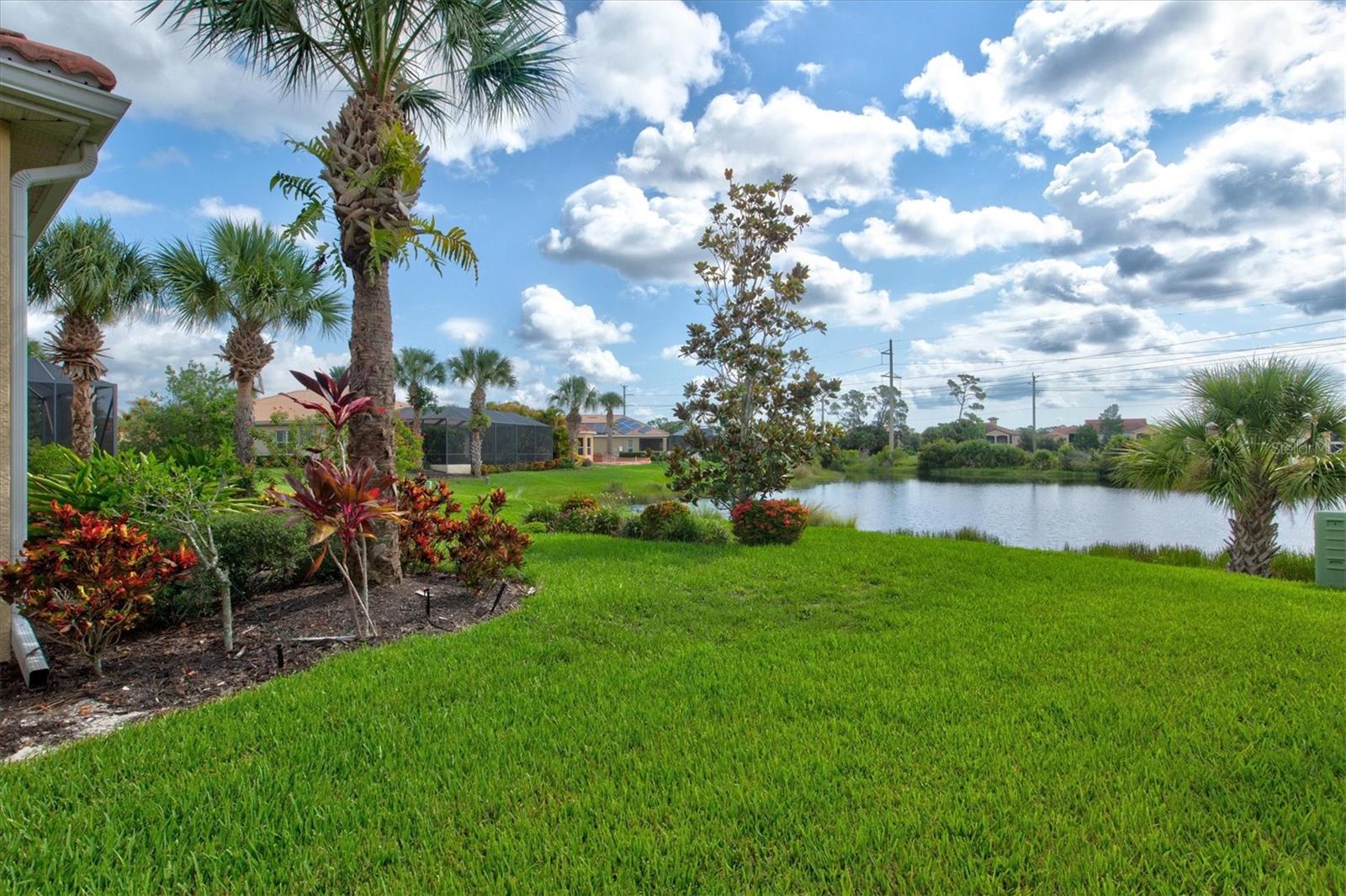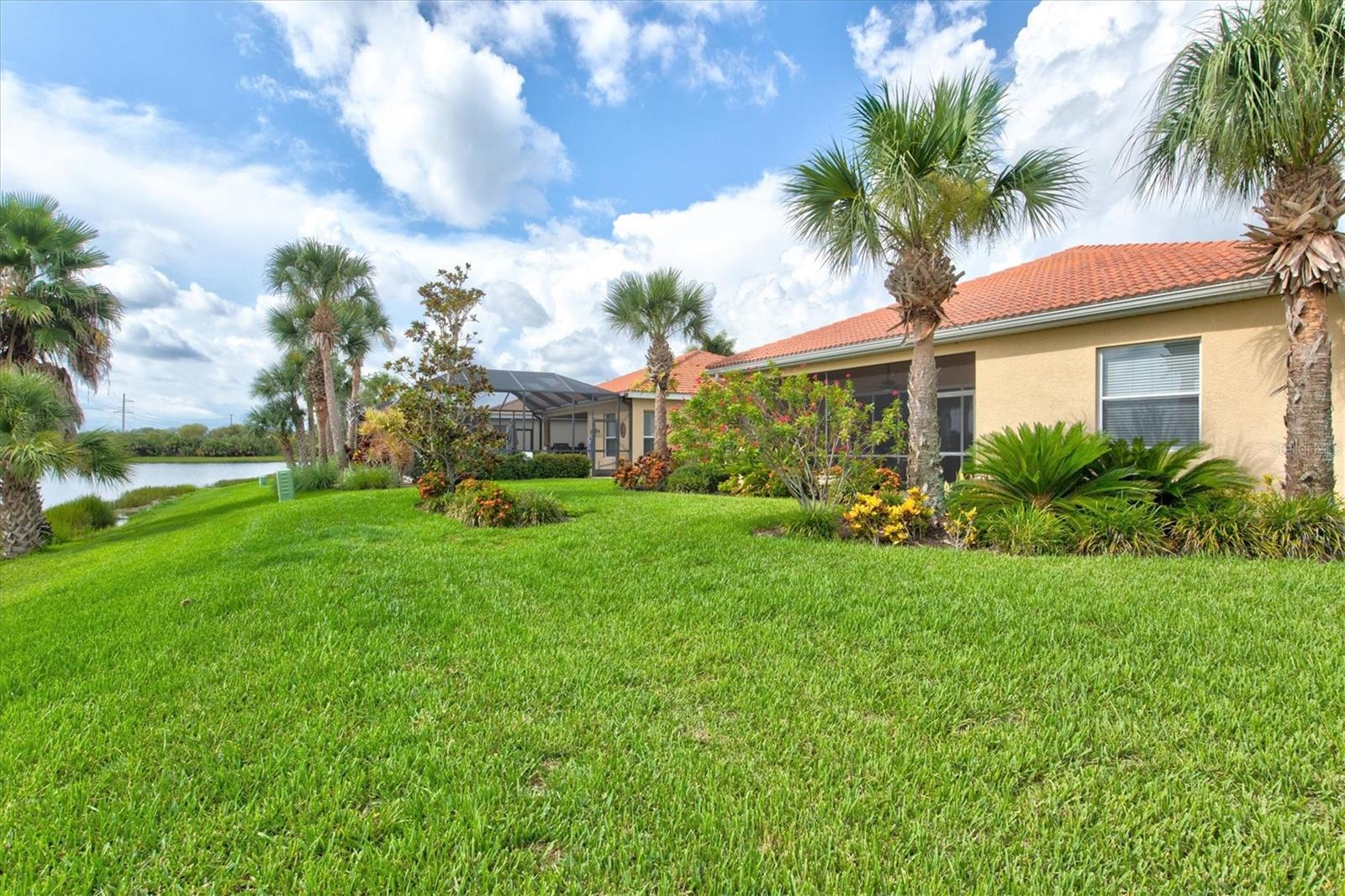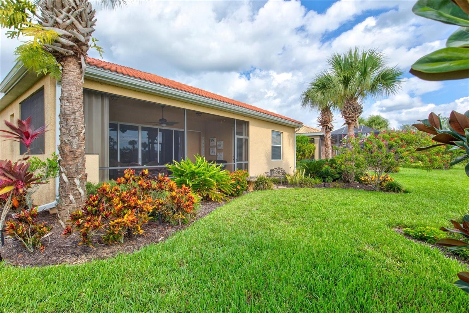 Freshly painted interior main living areas. Enjoy maintenance-free living in this resort style community with 24 hr security and roaming security, social membership is included in Hoa. This bright, elegant open concept home with 12 ft ceilings, outdoor automatic lighting, and a two-car garage, has been beautifully maintained. It is boasting 2 bedrooms, 2 baths and a versatile den which can be transformed to meet your own unique needs and can be used as a home office, a library, or even as an extra guest room. The kitchen features gas range for cooking, solid neutral countertops. There is plenty of counter space, a breakfast bar and a caf-style dining area. The open concept of this home connects the kitchen, living area and dining room. The extra-large primary bedroom offers a private ensuite bathroom, walk-in closet, tray ceilings, water views, and a private exit out to the lanai. The ensuite bathroom has a soaking tub, walk-in shower, and dual vanity sinks. In the evening, open the 18 ft wide tinted patio sliding doors that completely pocket so you can enjoy a seamless indoor/outdoor living with a full outdoor kitchen equipped with a natural gas BBQ, a gas grill cook top, fridge, sink and granite countertops. Some of the noted features and benefits of this home are: porcelain wood-look tile throughout, tray ceilings in the main living area and owner's suite, crown molding, hurricane impact windows, new in 2022 accordian-style hurricane shutters, AC replaced in 2019, a wifi garage door opener, and newer appliances and lighting. The HOA fees include lawn maintenance, 24 hr guard gated entry, cable TV and high-speed fiber internet. This is more than just a home, it's a lifestyle. Located in beautiful North Venice just minutes from gulf beaches, dining and shopping. Savor exquisite dining and events at the River Club overlooking a serene 70-acre nature park along the Myakka River. Also included is the gym, aerobics/yoga studio, or take a dip in the luxury resort-style pool, swim in the separate lap pool, and then have a drink or lunch at the Tiki Hut cabana bar. Tennis enthusiasts will be enthralled by the six court Har-Tru tennis courts, and pro organized tennis program. Pickleball players will love the newly built pickleball courts. This community is within an easy short drive to the new state-of-the-art Sarasota Memorial Hospital. Schedule a tour today.