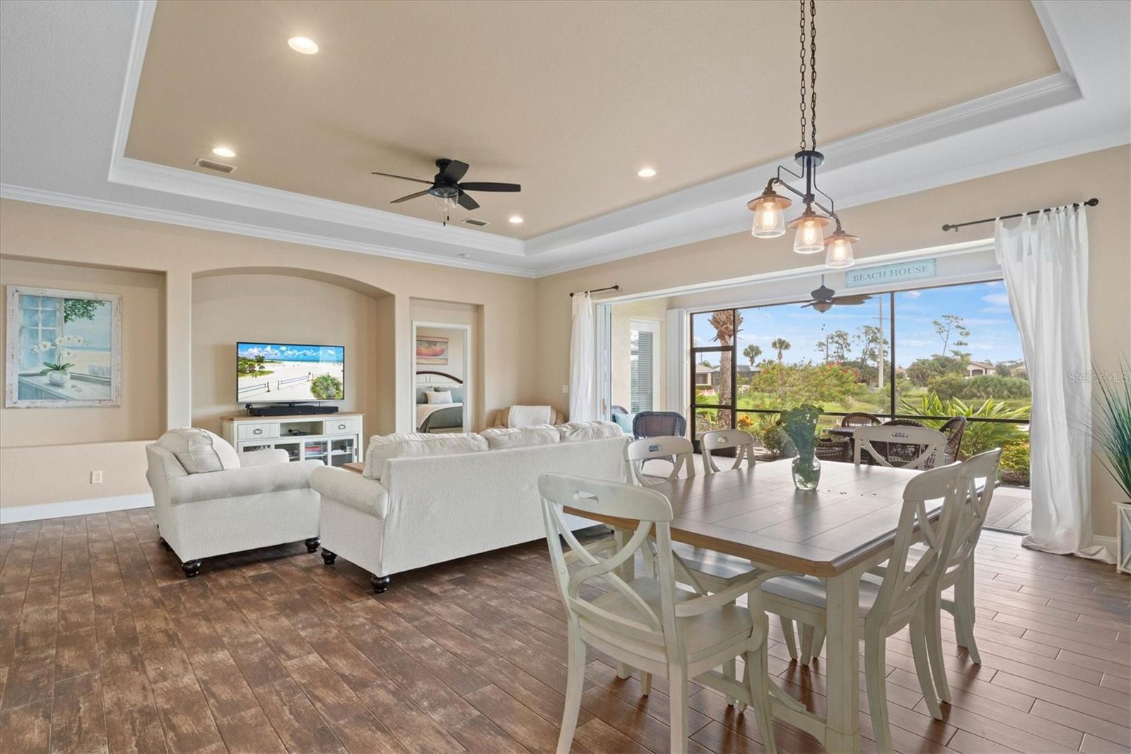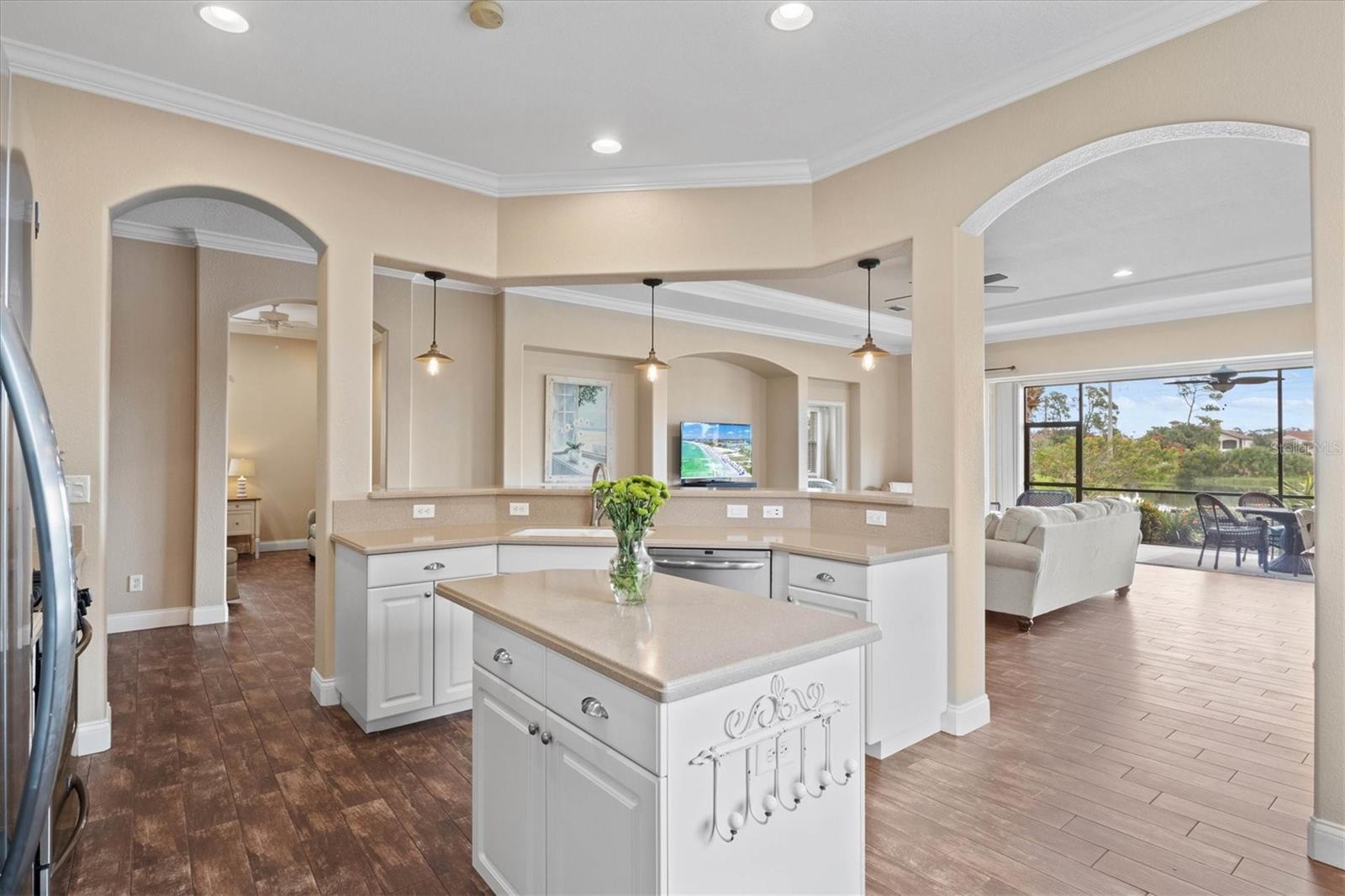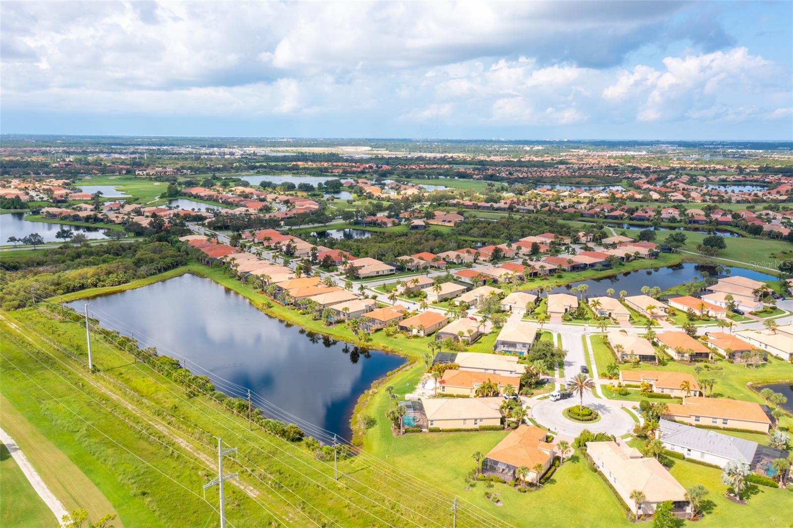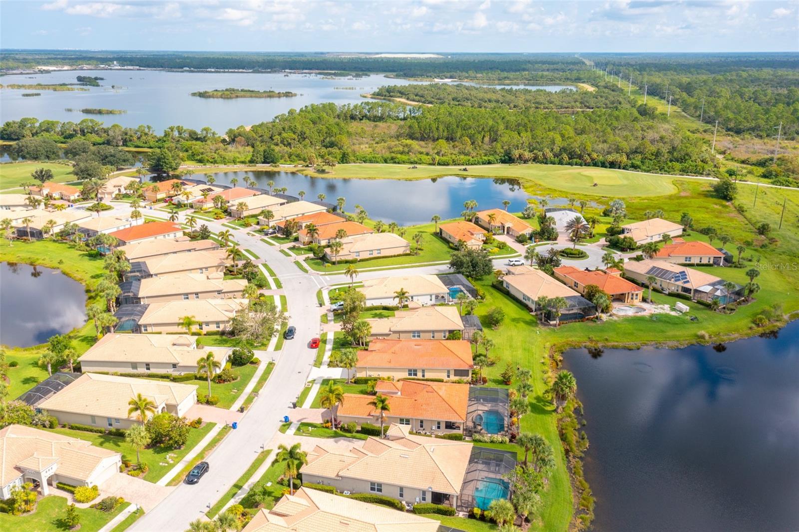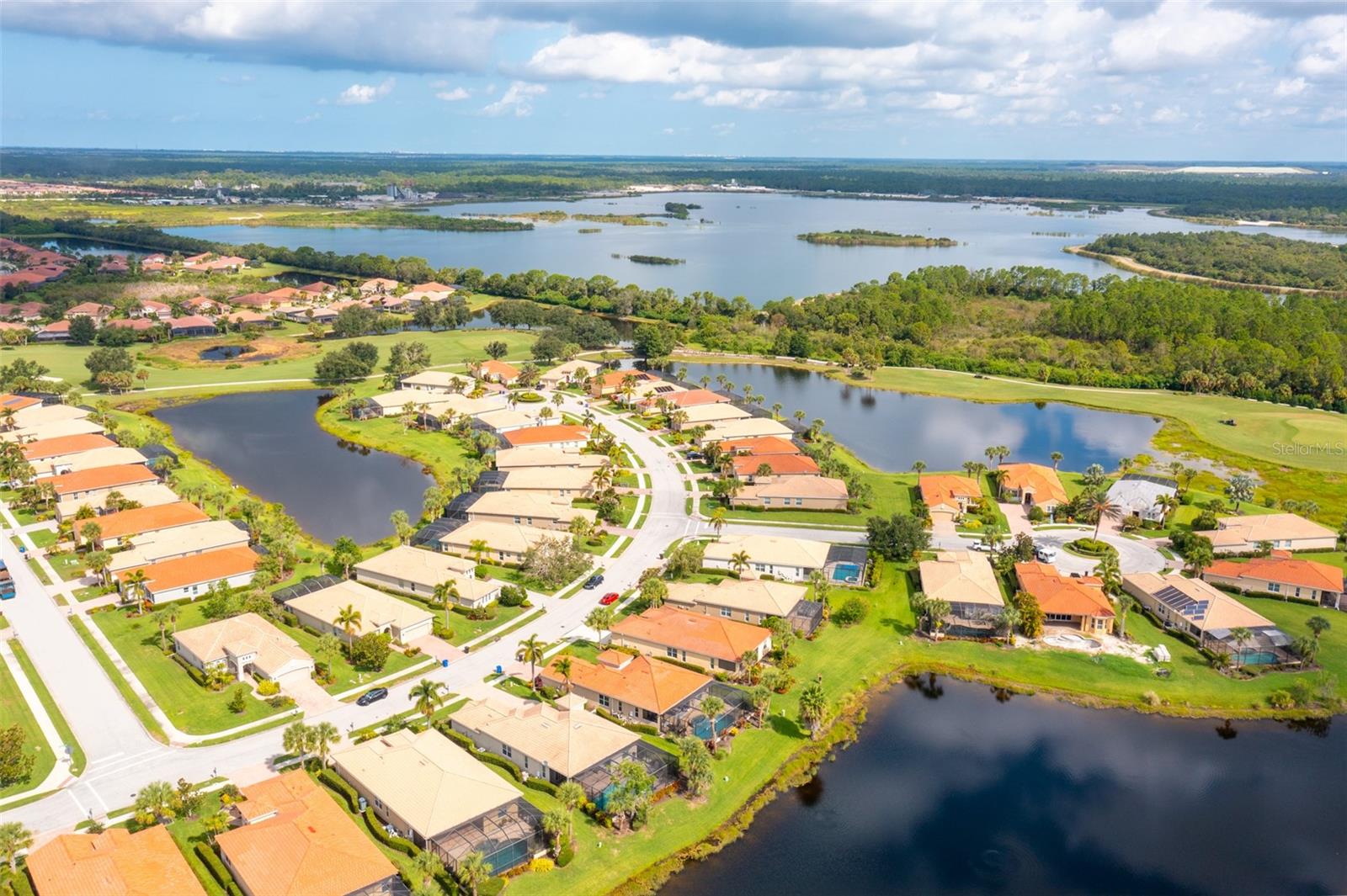 Freshly painted interior main living areas. Enjoy maintenance-free living in this resort style community with 24 hr security and roaming security, social membership is included in Hoa. This bright, elegant open concept home with 12 ft ceilings, outdoor automatic lighting, and a two-car garage, has been beautifully maintained. It is boasting 2 bedrooms, 2 baths and a versatile den which can be transformed to meet your own unique needs and can be used as a home office, a library, or even as an extra guest room. The kitchen features gas range for cooking, solid neutral countertops. There is plenty of counter space, a breakfast bar and a caf-style dining area. The open concept of this home connects the kitchen, living area and dining room. The extra-large primary bedroom offers a private ensuite bathroom, walk-in closet, tray ceilings, water views, and a private exit out to the lanai. The ensuite bathroom has a soaking tub, walk-in shower, and dual vanity sinks. In the evening, open the 18 ft wide tinted patio sliding doors that completely pocket so you can enjoy a seamless indoor/outdoor living with a full outdoor kitchen equipped with a natural gas BBQ, a gas grill cook top, fridge, sink and granite countertops. Some of the noted features and benefits of this home are: porcelain wood-look tile throughout, tray ceilings in the main living area and owner's suite, crown molding, hurricane impact windows, new in 2022 accordian-style hurricane shutters, AC replaced in 2019, a wifi garage door opener, and newer appliances and lighting. The HOA fees include lawn maintenance, 24 hr guard gated entry, cable TV and high-speed fiber internet. This is more than just a home, it's a lifestyle. Located in beautiful North Venice just minutes from gulf beaches, dining and shopping. Savor exquisite dining and events at the River Club overlooking a serene 70-acre nature park along the Myakka River. Also included is the gym, aerobics/yoga studio, or take a dip in the luxury resort-style pool, swim in the separate lap pool, and then have a drink or lunch at the Tiki Hut cabana bar. Tennis enthusiasts will be enthralled by the six court Har-Tru tennis courts, and pro organized tennis program. Pickleball players will love the newly built pickleball courts. This community is within an easy short drive to the new state-of-the-art Sarasota Memorial Hospital. Schedule a tour today.