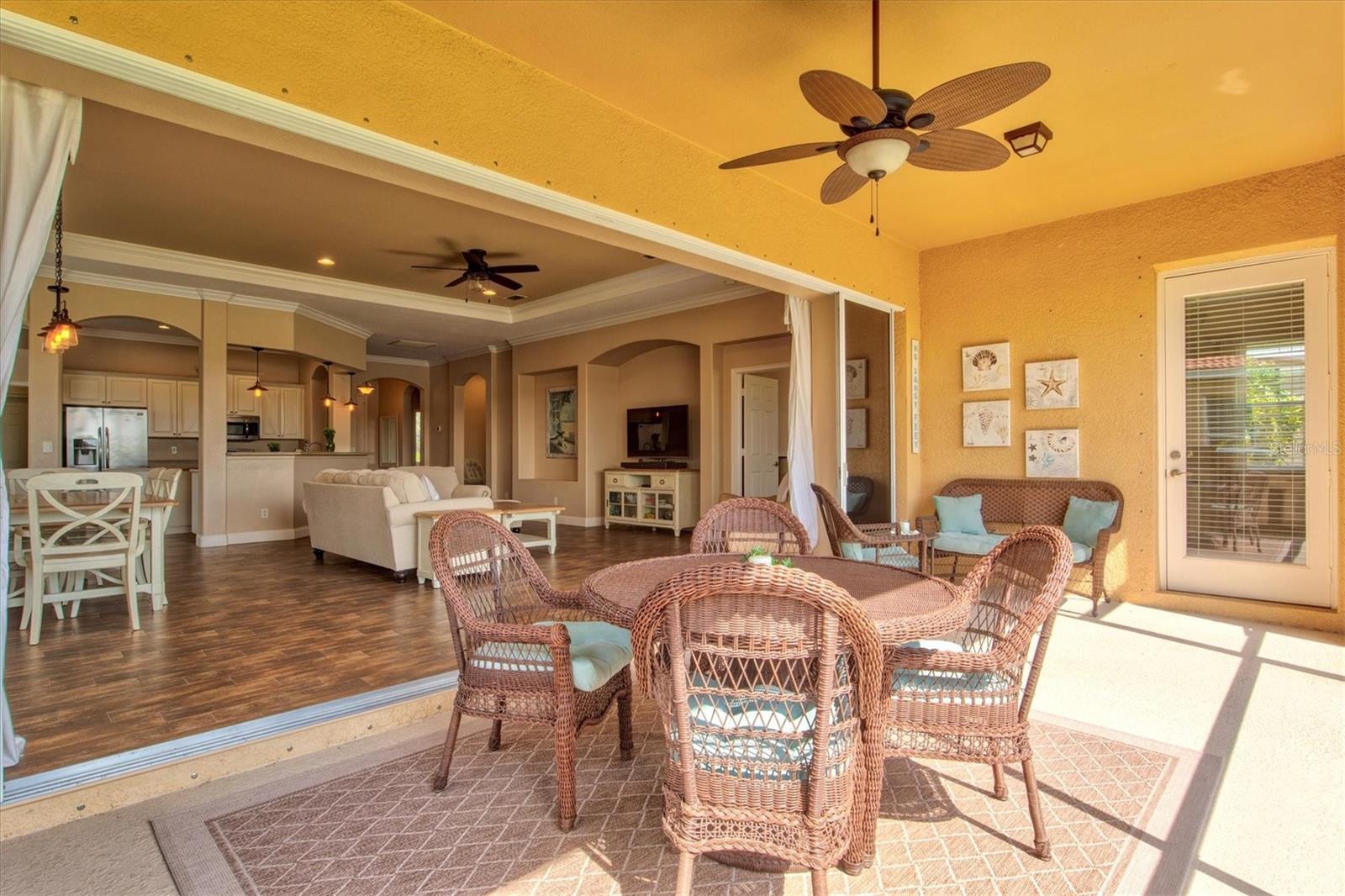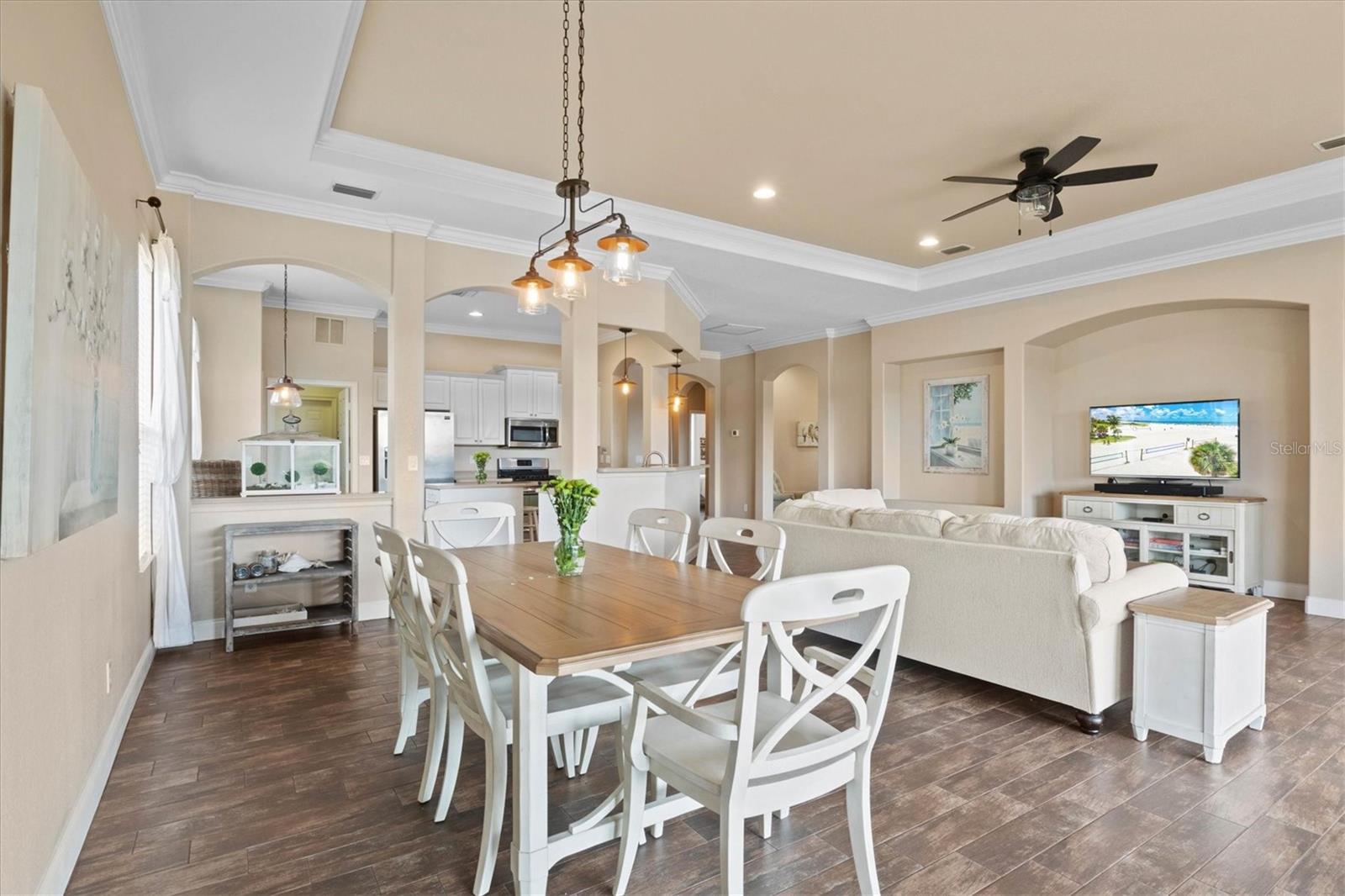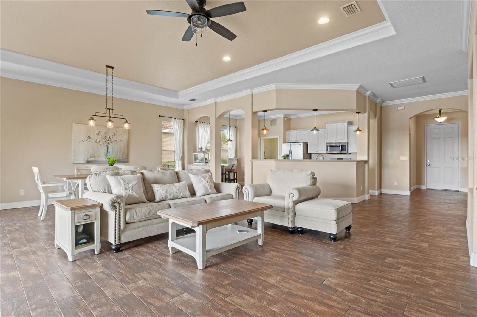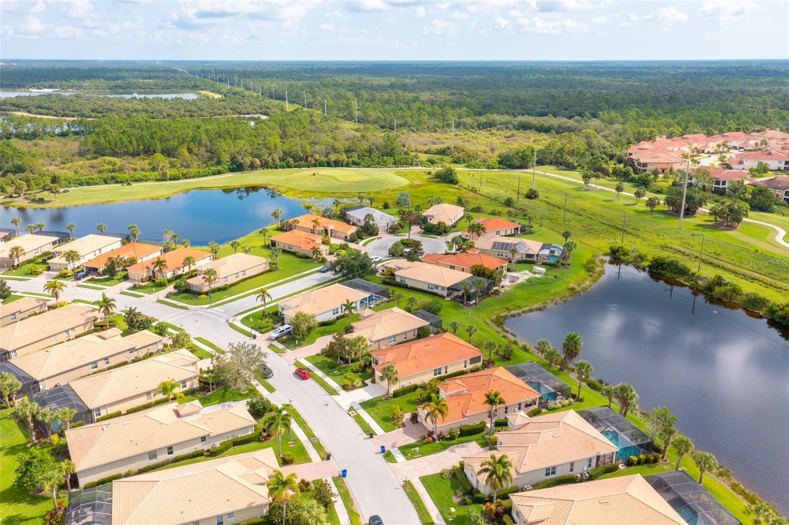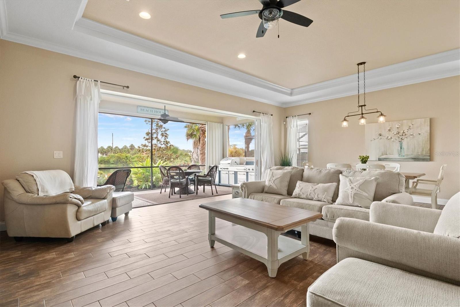 Freshly painted interior main living areas. Enjoy maintenance-free living in this resort style community with 24 hr security and roaming security, social membership is included in Hoa. This bright, elegant open concept home with 12 ft ceilings, outdoor automatic lighting, and a two-car garage, has been beautifully maintained. It is boasting 2 bedrooms, 2 baths and a versatile den which can be transformed to meet your own unique needs and can be used as a home office, a library, or even as an extra guest room. The kitchen features gas range for cooking, solid neutral countertops. There is plenty of counter space, a breakfast bar and a caf-style dining area. The open concept of this home connects the kitchen, living area and dining room. The extra-large primary bedroom offers a private ensuite bathroom, walk-in closet, tray ceilings, water views, and a private exit out to the lanai. The ensuite bathroom has a soaking tub, walk-in shower, and dual vanity sinks. In the evening, open the 18 ft wide tinted patio sliding doors that completely pocket so you can enjoy a seamless indoor/outdoor living with a full outdoor kitchen equipped with a natural gas BBQ, a gas grill cook top, fridge, sink and granite countertops. Some of the noted features and benefits of this home are: porcelain wood-look tile throughout, tray ceilings in the main living area and owner's suite, crown molding, hurricane impact windows, new in 2022 accordian-style hurricane shutters, AC replaced in 2019, a wifi garage door opener, and newer appliances and lighting. The HOA fees include lawn maintenance, 24 hr guard gated entry, cable TV and high-speed fiber internet. This is more than just a home, it's a lifestyle. Located in beautiful North Venice just minutes from gulf beaches, dining and shopping. Savor exquisite dining and events at the River Club overlooking a serene 70-acre nature park along the Myakka River. Also included is the gym, aerobics/yoga studio, or take a dip in the luxury resort-style pool, swim in the separate lap pool, and then have a drink or lunch at the Tiki Hut cabana bar. Tennis enthusiasts will be enthralled by the six court Har-Tru tennis courts, and pro organized tennis program. Pickleball players will love the newly built pickleball courts. This community is within an easy short drive to the new state-of-the-art Sarasota Memorial Hospital. Schedule a tour today.