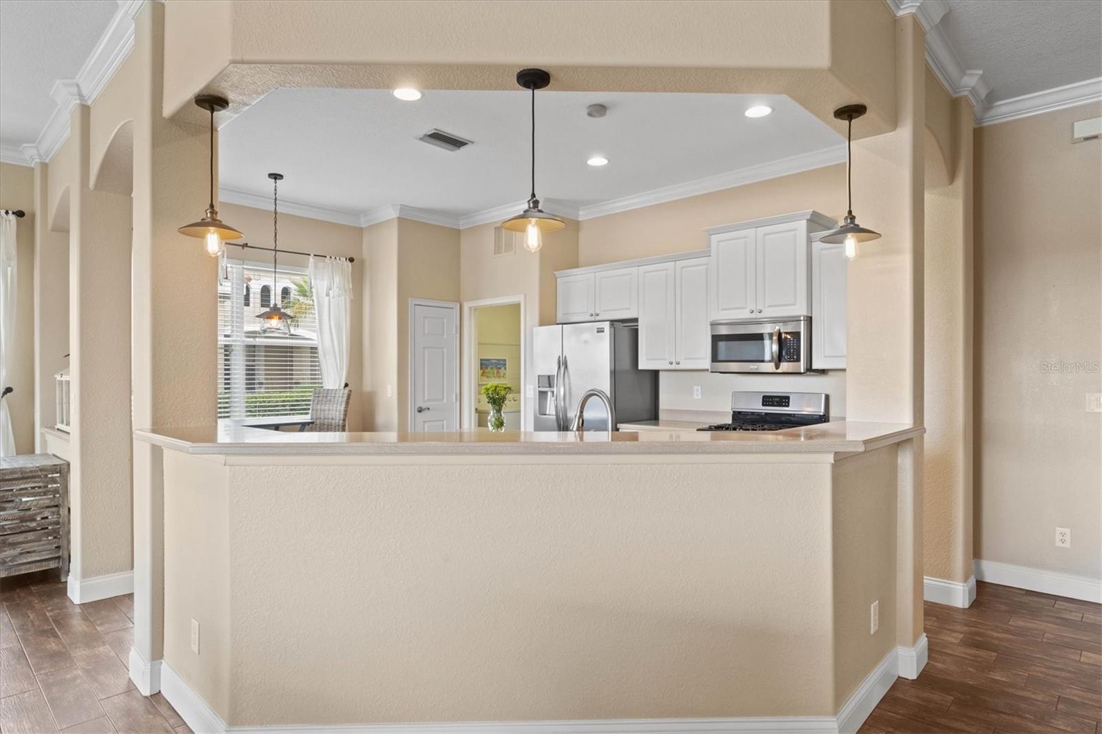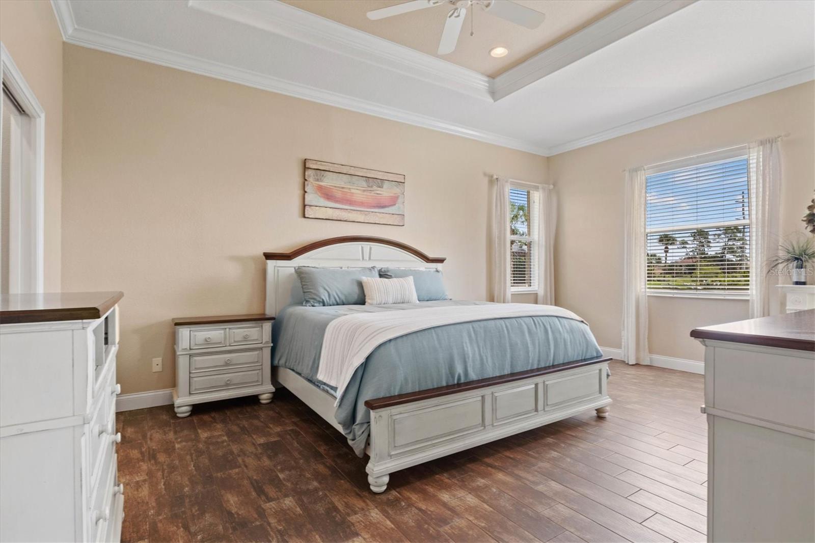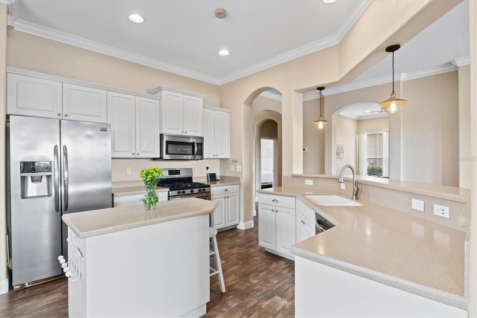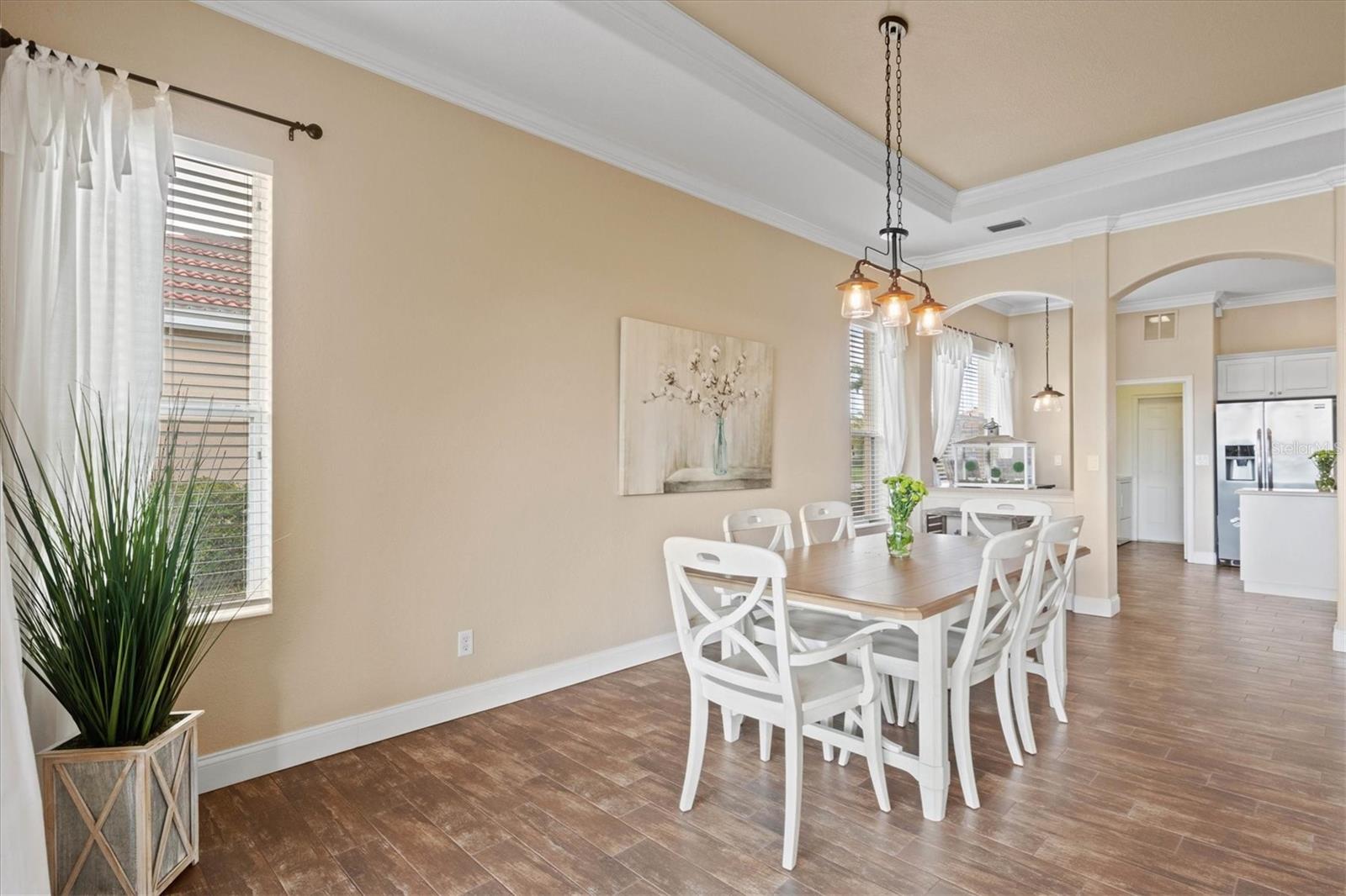 Freshly painted interior main living areas. Enjoy maintenance-free living in this resort style community with 24 hr security and roaming security, social membership is included in Hoa. This bright, elegant open concept home with 12 ft ceilings, outdoor automatic lighting, and a two-car garage, has been beautifully maintained. It is boasting 2 bedrooms, 2 baths and a versatile den which can be transformed to meet your own unique needs and can be used as a home office, a library, or even as an extra guest room. The kitchen features gas range for cooking, solid neutral countertops. There is plenty of counter space, a breakfast bar and a caf-style dining area. The open concept of this home connects the kitchen, living area and dining room. The extra-large primary bedroom offers a private ensuite bathroom, walk-in closet, tray ceilings, water views, and a private exit out to the lanai. The ensuite bathroom has a soaking tub, walk-in shower, and dual vanity sinks. In the evening, open the 18 ft wide tinted patio sliding doors that completely pocket so you can enjoy a seamless indoor/outdoor living with a full outdoor kitchen equipped with a natural gas BBQ, a gas grill cook top, fridge, sink and granite countertops. Some of the noted features and benefits of this home are: porcelain wood-look tile throughout, tray ceilings in the main living area and owner's suite, crown molding, hurricane impact windows, new in 2022 accordian-style hurricane shutters, AC replaced in 2019, a wifi garage door opener, and newer appliances and lighting. The HOA fees include lawn maintenance, 24 hr guard gated entry, cable TV and high-speed fiber internet. This is more than just a home, it's a lifestyle. Located in beautiful North Venice just minutes from gulf beaches, dining and shopping. Savor exquisite dining and events at the River Club overlooking a serene 70-acre nature park along the Myakka River. Also included is the gym, aerobics/yoga studio, or take a dip in the luxury resort-style pool, swim in the separate lap pool, and then have a drink or lunch at the Tiki Hut cabana bar. Tennis enthusiasts will be enthralled by the six court Har-Tru tennis courts, and pro organized tennis program. Pickleball players will love the newly built pickleball courts. This community is within an easy short drive to the new state-of-the-art Sarasota Memorial Hospital. Schedule a tour today.