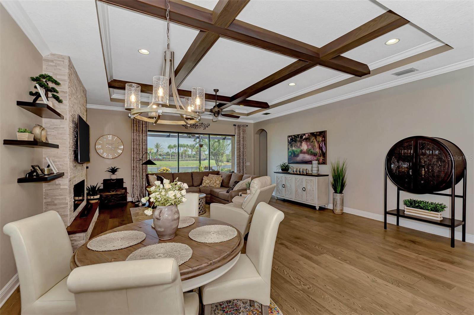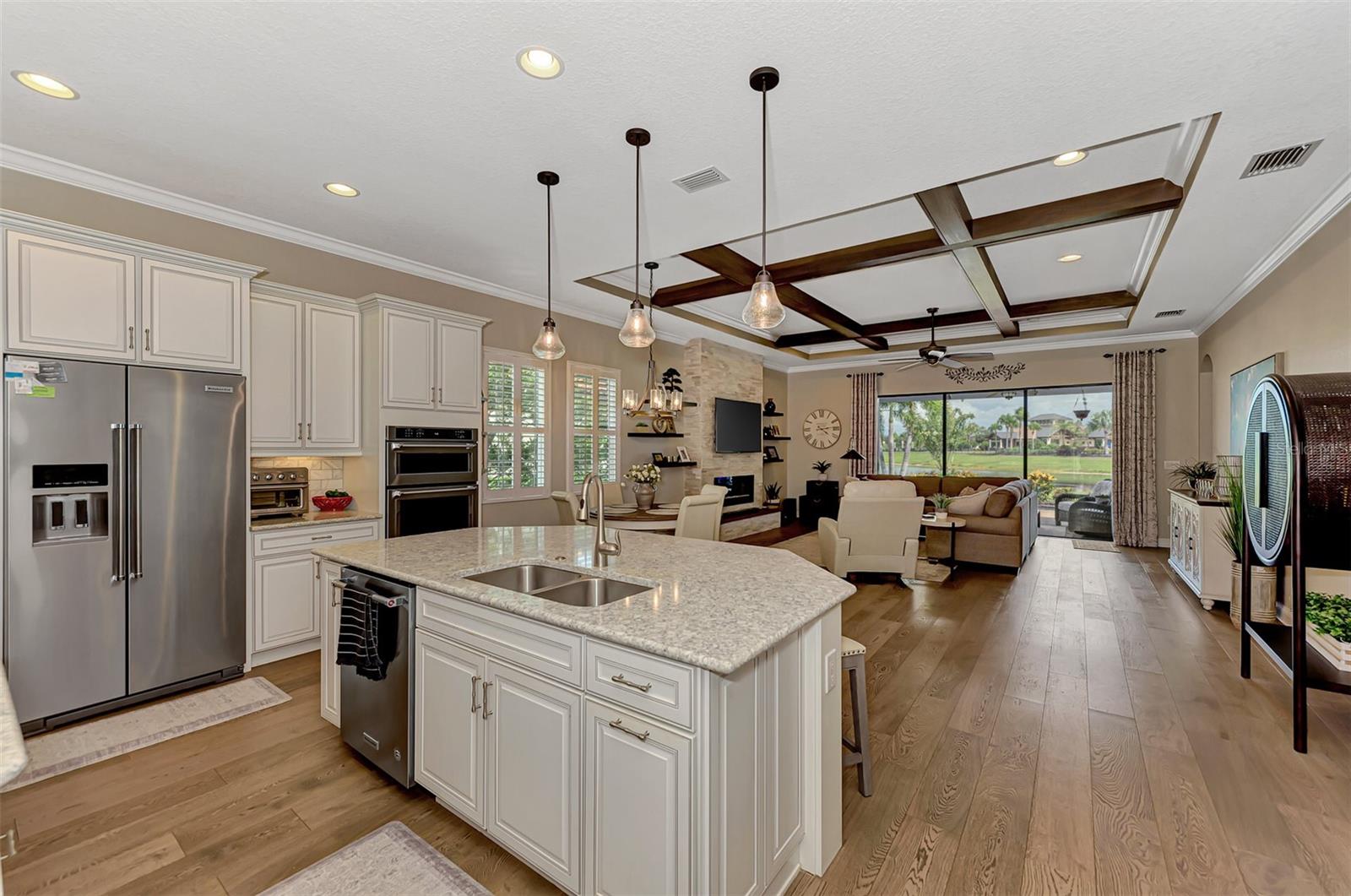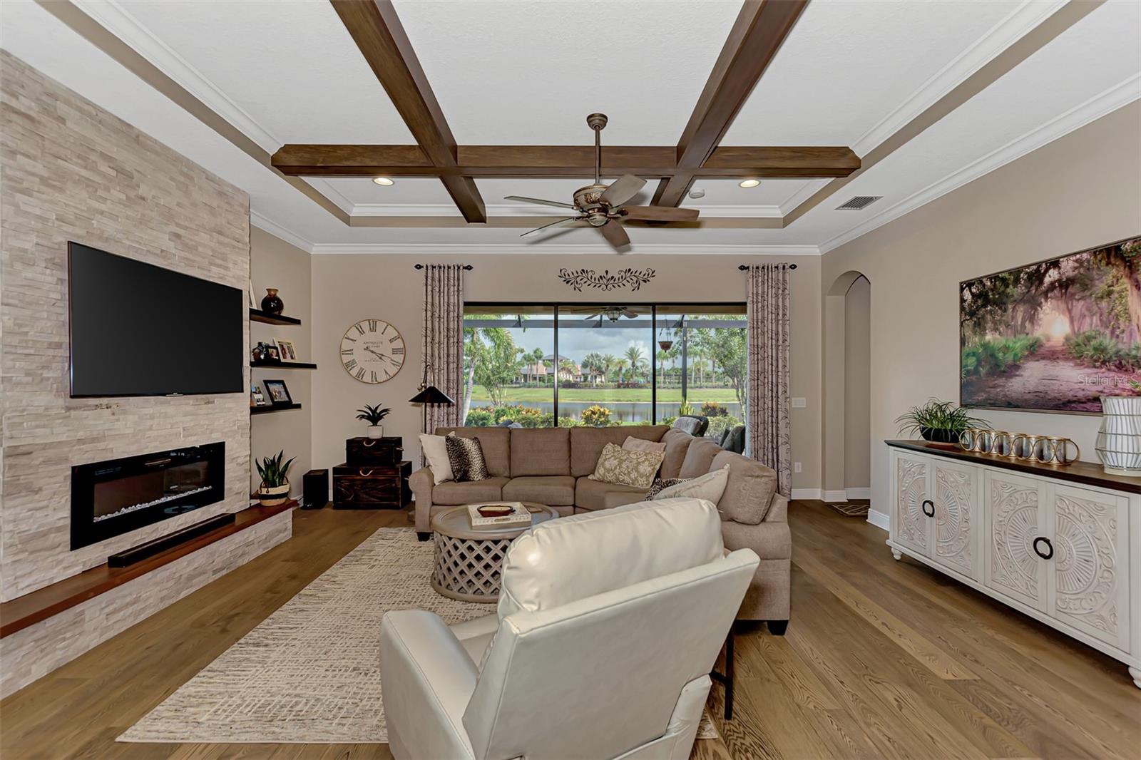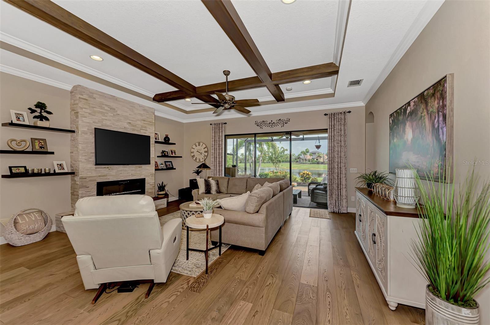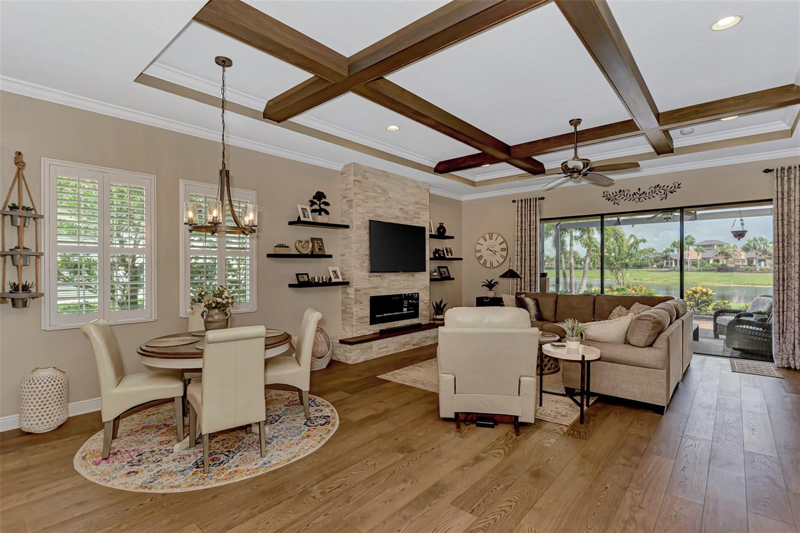 This beautiful WCI, Grand Cayman 2 bedrooms, plus office, 2 1/2 baths home is located in the highly sought after gated community of Country Club East, Lakewood Ranch and shows like a model. The home sits on a stunning professionally landscaped lake view lot, with an extended lanai and plenty of room to add your own custom private pool and spa. The home has upgraded hardwood flooring in the main living area and office, ceramic tile in laundry room and bathrooms and carpet in the bedrooms. Some of the unique upgrades in this home include a custom fireplace with a matching accent wall in the entry foyer, coffered ceilings with wood beams in the great room and crown molding in the great room and master bedroom adding incredible beauty and value. The gourmet kitchen has top of the line Kitchenaide stainless steel appliances including a gas cooktop, built-in wall oven/microwave, side by side refrigerator, quartz countertops and a beautiful custom backsplash. The community has great amenities including The Lodge restaurant, 3 swimming pools, fitness center, multi-purpose room for parties equipped with a full kitchen, flat screen TV, sitting area and a pool table. There are also walking trails, a dog park and 3 golf courses, (golf membership is optional). It's only a short walk to the Retreat pool, fitness center, multipurpose room and the community is maintenance assisted for your convenience. Located minutes away from fine dining, casual dining, fast food restaurants, shopping, UTC Mall, The Players Center for Performing Arts, The Oslo Repertory Theatre, The Polo Club, Premier Sports Complex and Nathan Benderson Park which is considered the ultimate recreational destination offering a wide range of activities, including world-class rowing events, kayaking, stand-up paddle boarding, fishing. Sarasota-Bradenton International Airport is conveniently located making air travel to and from Lakewood Ranch enjoyable. Last but not least Siesta Key Beach and Anna Maria Island two of the finest beaches in the USA makes Lakewood Ranch the perfect place to own your dream home.