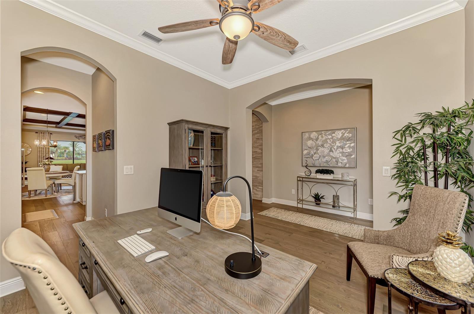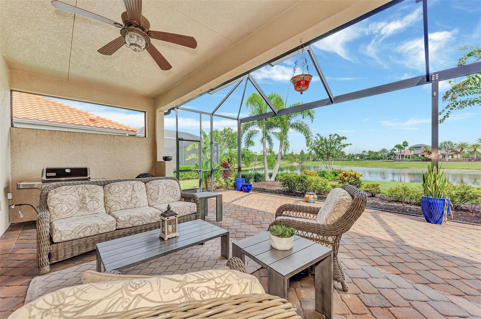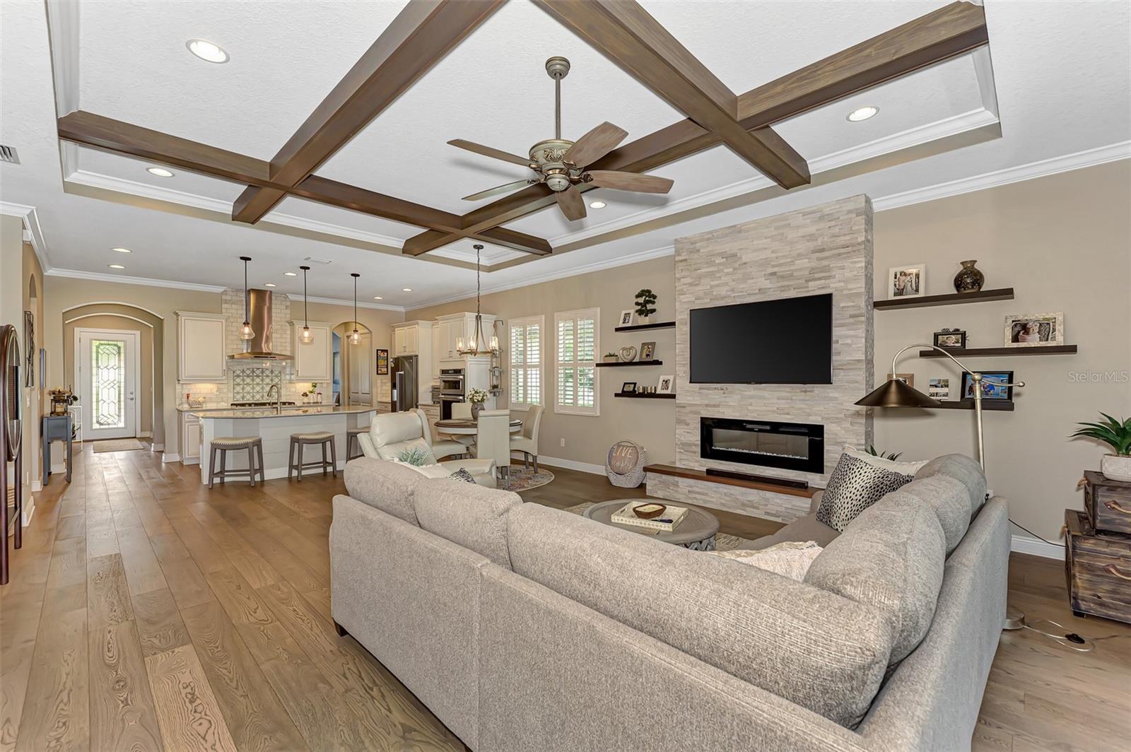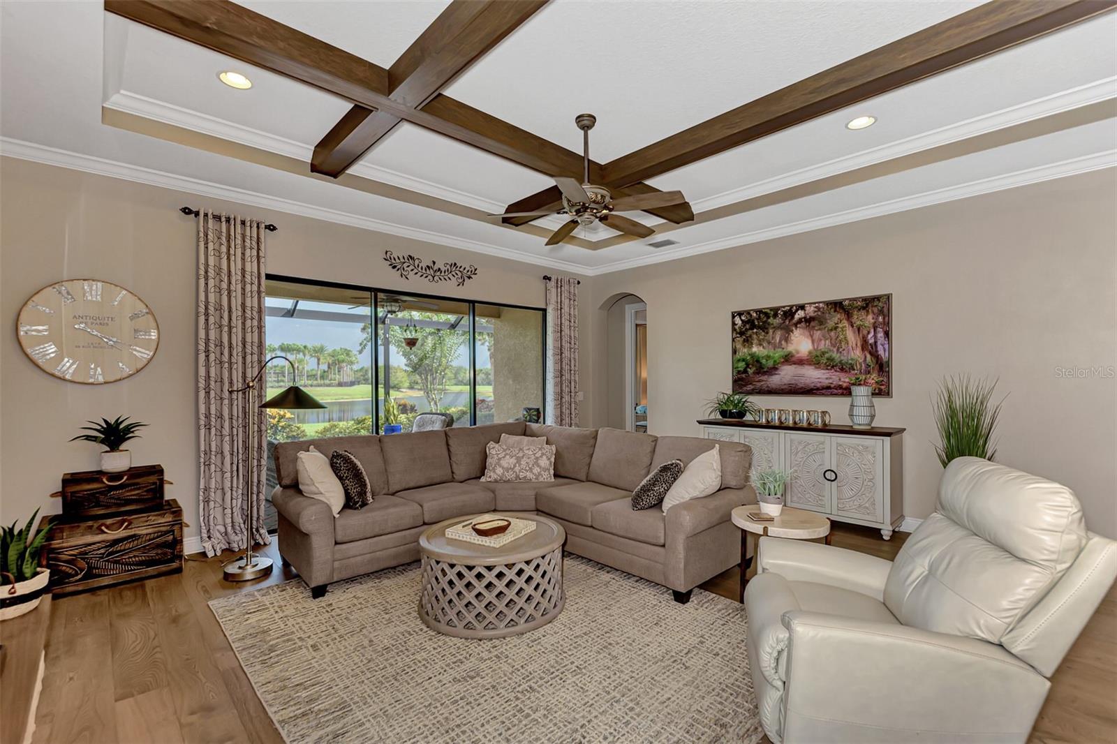 This beautiful WCI, Grand Cayman 2 bedrooms, plus office, 2 1/2 baths home is located in the highly sought after gated community of Country Club East, Lakewood Ranch and shows like a model. The home sits on a stunning professionally landscaped lake view lot, with an extended lanai and plenty of room to add your own custom private pool and spa. The home has upgraded hardwood flooring in the main living area and office, ceramic tile in laundry room and bathrooms and carpet in the bedrooms. Some of the unique upgrades in this home include a custom fireplace with a matching accent wall in the entry foyer, coffered ceilings with wood beams in the great room and crown molding in the great room and master bedroom adding incredible beauty and value. The gourmet kitchen has top of the line Kitchenaide stainless steel appliances including a gas cooktop, built-in wall oven/microwave, side by side refrigerator, quartz countertops and a beautiful custom backsplash. The community has great amenities including The Lodge restaurant, 3 swimming pools, fitness center, multi-purpose room for parties equipped with a full kitchen, flat screen TV, sitting area and a pool table. There are also walking trails, a dog park and 3 golf courses, (golf membership is optional). It's only a short walk to the Retreat pool, fitness center, multipurpose room and the community is maintenance assisted for your convenience. Located minutes away from fine dining, casual dining, fast food restaurants, shopping, UTC Mall, The Players Center for Performing Arts, The Oslo Repertory Theatre, The Polo Club, Premier Sports Complex and Nathan Benderson Park which is considered the ultimate recreational destination offering a wide range of activities, including world-class rowing events, kayaking, stand-up paddle boarding, fishing. Sarasota-Bradenton International Airport is conveniently located making air travel to and from Lakewood Ranch enjoyable. Last but not least Siesta Key Beach and Anna Maria Island two of the finest beaches in the USA makes Lakewood Ranch the perfect place to own your dream home.