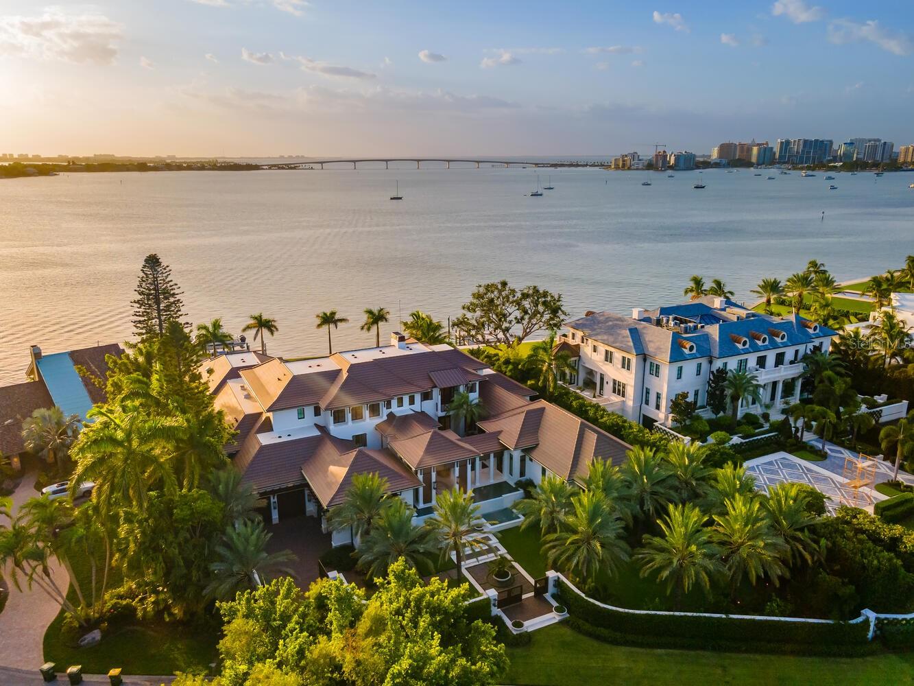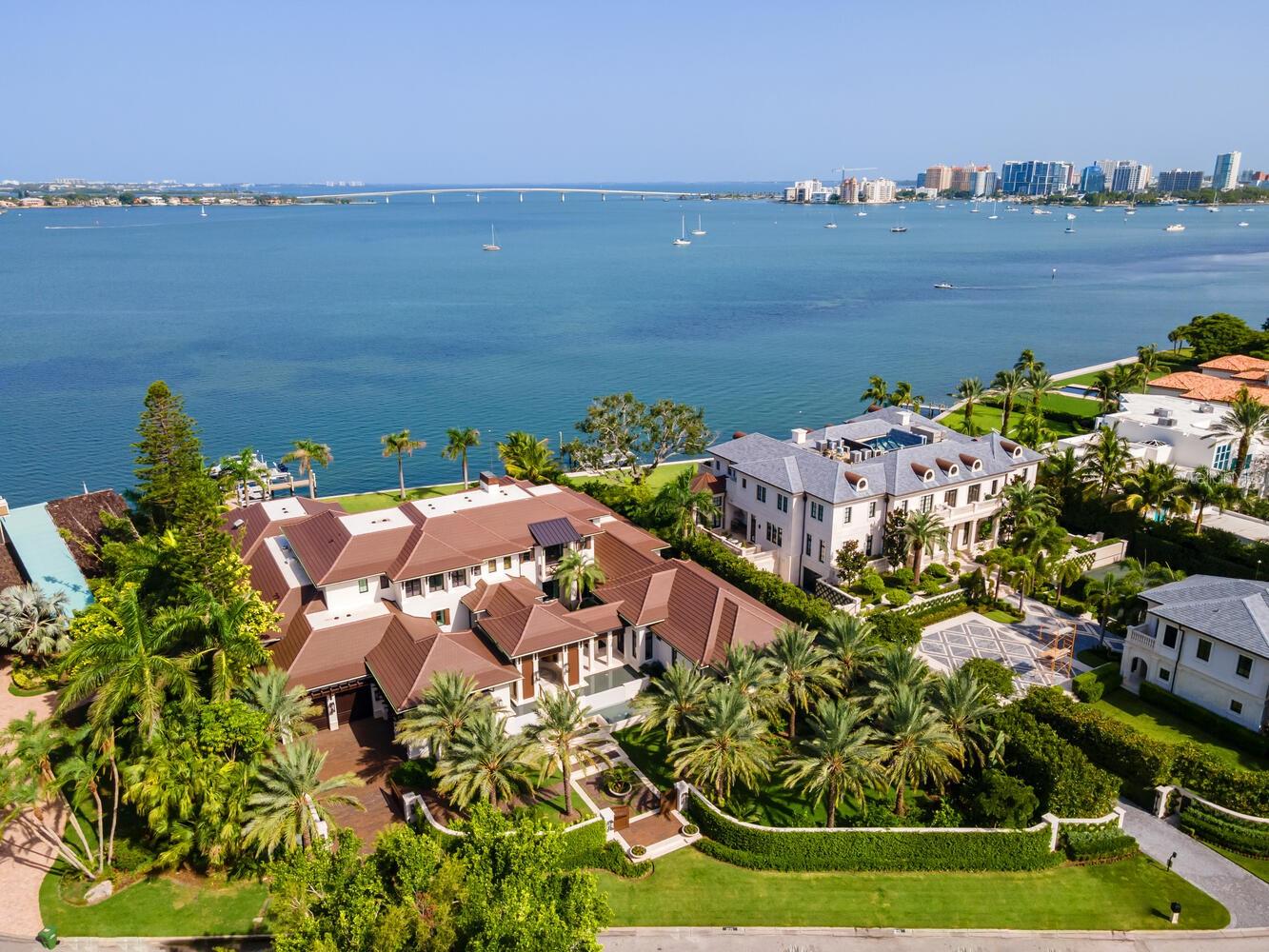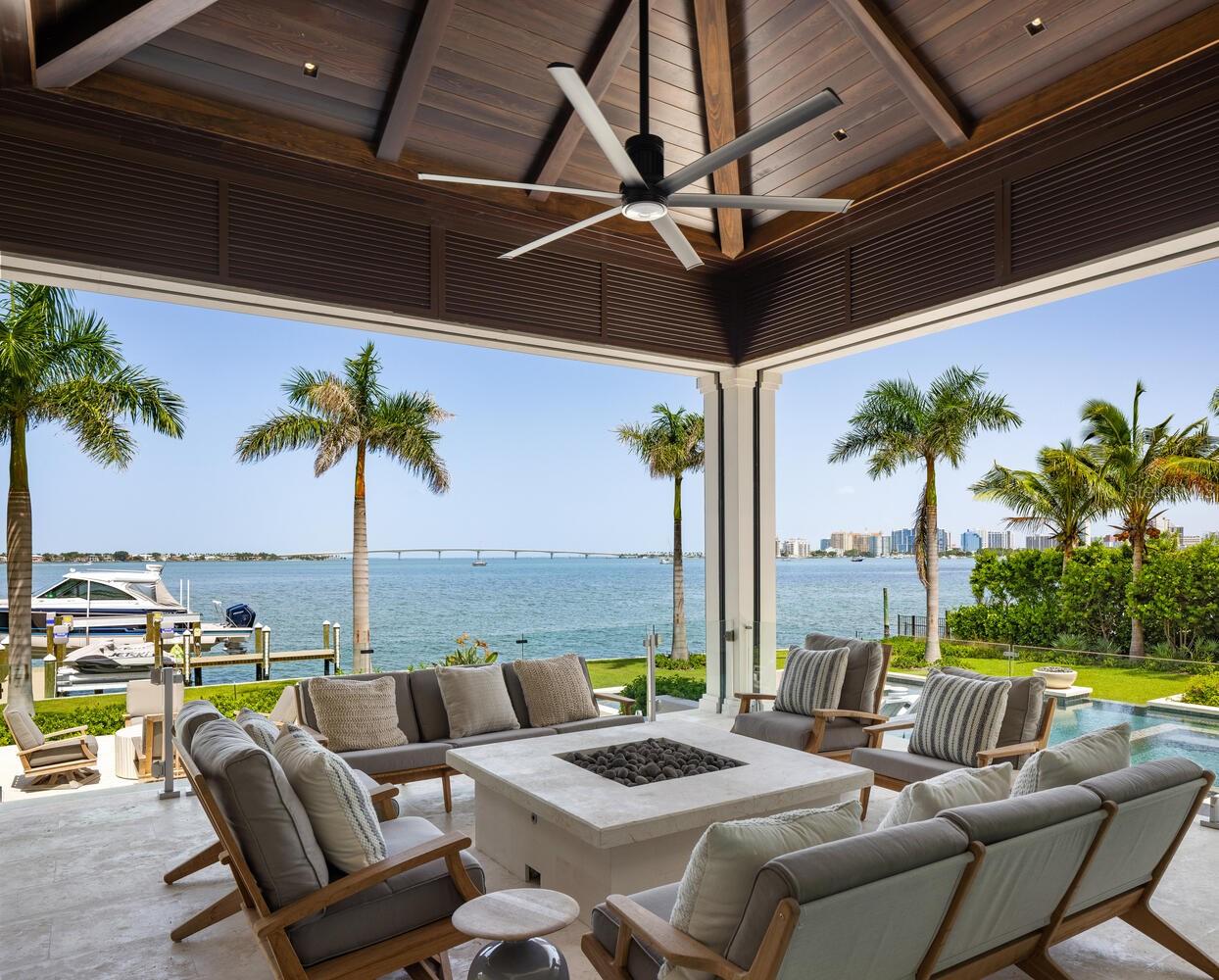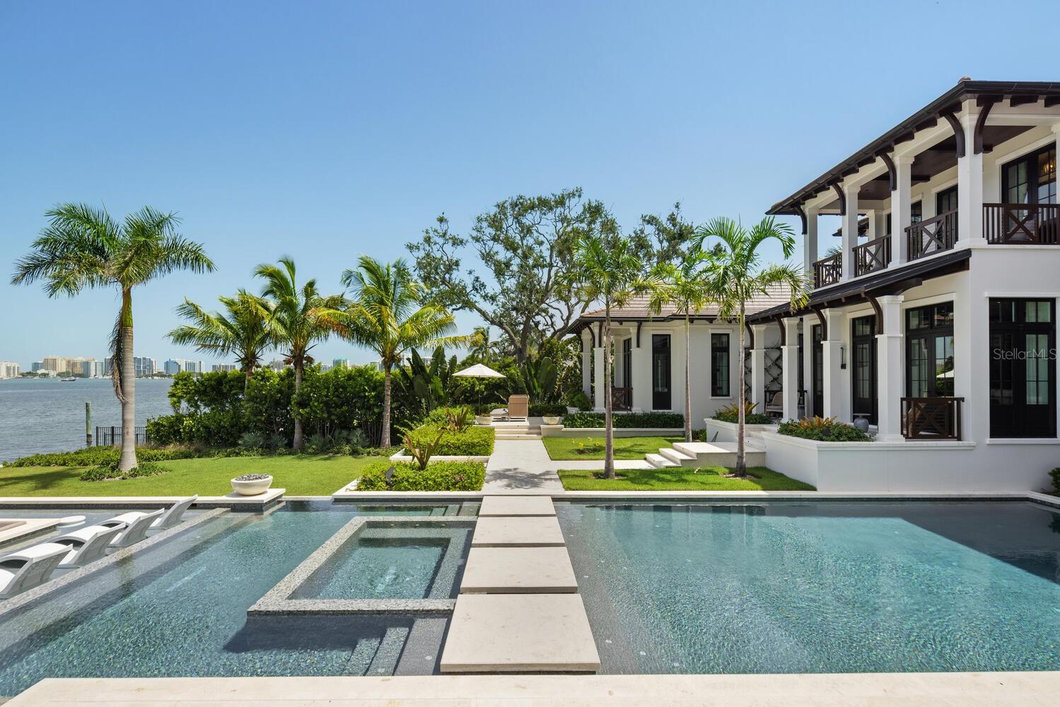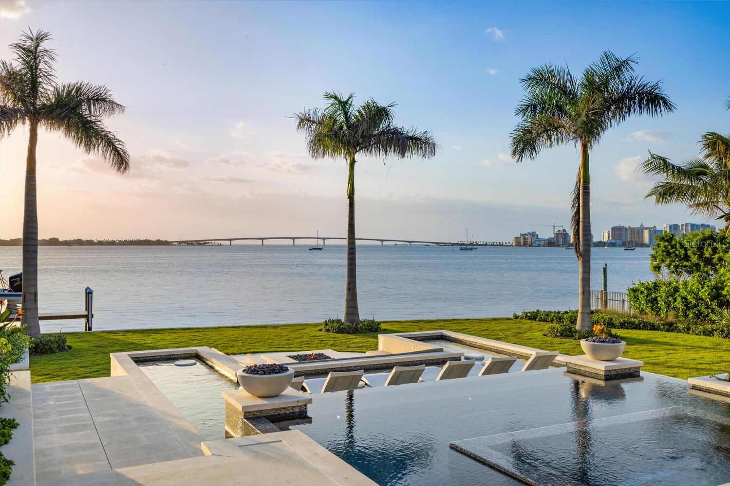 Exceptional in every aspect, this magnificent custom bayfront estate in Sarasota's coveted Harbor Acres Estate Section showcases superb craftsmanship, state-of-the-art technology, breathtaking vistas and fabulous amenities. Situated on nearly one acre with 144 feet of bay frontage, the 11,275-square-foot home boasts sophisticated, comfortable living spaces, primarily on the main floor, and mesmerizing views of Sarasota Bay, the Ringling Bridge and downtown. The modern British West Indies-style residence has 8 en-suite bedrooms and 4 powder bathrooms. Completed in 2022, the home was designed by Stofft Cooney Architects and masterfully built in 2 years by Perrone Construction. The meticulously curated estate is perfect for casual gatherings or large-scale soirees. European White Oak Engineered hardwood flooring flows throughout both levels, where architectural ceilings and enchanting light fixtures abound and multiple terraces offer awe-inspiring views. Wolf Design Group of Atlanta masterfully designed the interior. The kitchen, bar and primary bathroom design by Matthew Quinn of Atlanta-based Design Galleria. The remarkably landscaped grounds were designed by Stephen Hazeltine. The stucco and stone accent home features a raised pile foundation, hurricane impact windows and doors, screened covered porch with motorized bug screens and hurricane shutters, and a whole-house generator. Elba White stone steps ascend to an impressive entry pavilion. Inside, refined living spaces await for the entire family, including a voluminous formal living/dining room with fireplace, quartzite feature wall and floor-to-ceiling windows with captivating water views. The 8,200-SF-plus main level also has a dazzling gourmet kitchen, family room, mudroom, playroom, clubroom, gym, primary suite and expansive guest wing. The kitchen showcases an elegant La Cornue range and hood, Sub-Zero appliances and quartzite countertops, with an adjacent scullery, stylish breakfast nook and family room. An enormous temperature-controlled wine display separates the kitchen and formal dining room. The sizable clubroom is ideal for movie and game nights, with a bar and entertainment areas, plus French doors to a bayfront terrace. Elba White stone tile adorns the extensive outdoor space, which offers a kitchen with a Kalamazoo grill, dining and gathering areas, and an overflow pool with spa, sun shelf and fire bowls with automated lighting. A 27,000-lb. high-speed boat lift and 4,500-lb. dual Jet Ski lift with aluminum-framed platform are convenient for launching your waterway adventures. The primary suite features an opulent bathroom with blue quartzite countertops and flooring, massive closet and dressing room, second walk-in closet, morning bar, study and bayfront terrace. The generous guest wing has three en-suite bedrooms, lounge area, patio and a private outdoor entrance. The nearly 3,100-SF second level has a second primary suite, and three guest suites. A large lounge area with a balcony is perfect for savoring the stunning panoramas. Other notable highlights include a Crestron home automation system, motorized drapery/shades, home theater speaker system in the family room and clubroom, Lutron lighting system, whole house generator and automated mosquito spraying system. This waterfront masterpiece is just south of downtown's dining, shopping and cultural arts, walkable to Southside Village's restaurants and shops, and a short drive to pristine beaches.