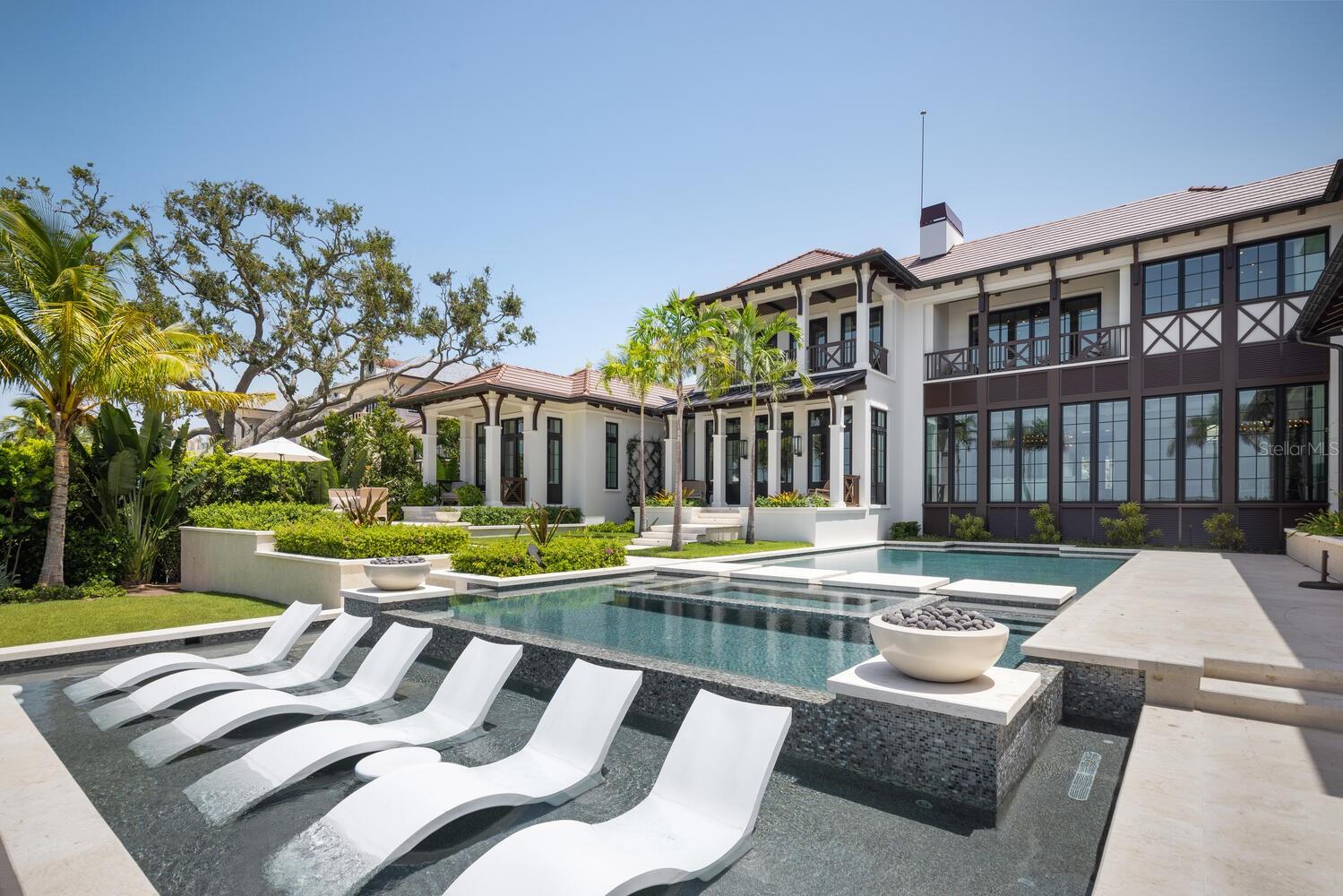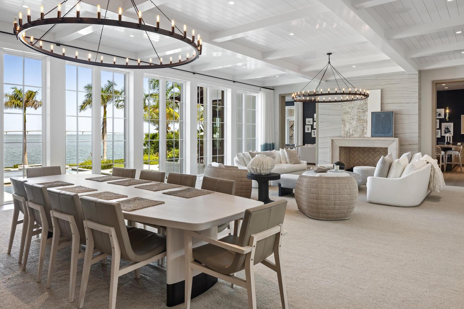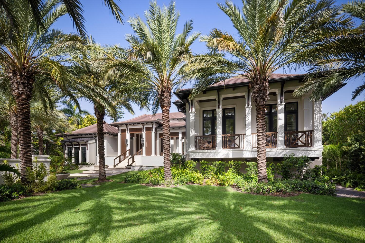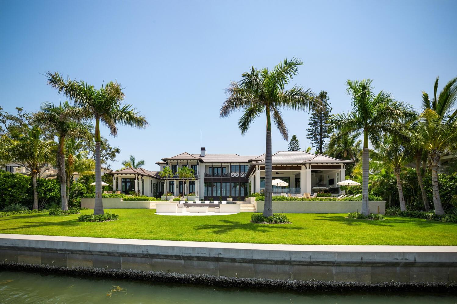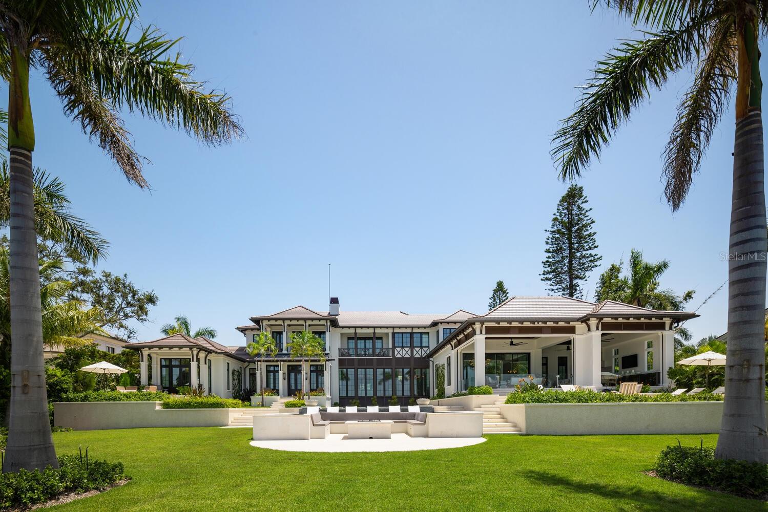 Exceptional in every aspect, this magnificent custom bayfront estate in Sarasota's coveted Harbor Acres Estate Section showcases superb craftsmanship, state-of-the-art technology, breathtaking vistas and fabulous amenities. Situated on nearly one acre with 144 feet of bay frontage, the 11,275-square-foot home boasts sophisticated, comfortable living spaces, primarily on the main floor, and mesmerizing views of Sarasota Bay, the Ringling Bridge and downtown. The modern British West Indies-style residence has 8 en-suite bedrooms and 4 powder bathrooms. Completed in 2022, the home was designed by Stofft Cooney Architects and masterfully built in 2 years by Perrone Construction. The meticulously curated estate is perfect for casual gatherings or large-scale soirees. European White Oak Engineered hardwood flooring flows throughout both levels, where architectural ceilings and enchanting light fixtures abound and multiple terraces offer awe-inspiring views. Wolf Design Group of Atlanta masterfully designed the interior. The kitchen, bar and primary bathroom design by Matthew Quinn of Atlanta-based Design Galleria. The remarkably landscaped grounds were designed by Stephen Hazeltine. The stucco and stone accent home features a raised pile foundation, hurricane impact windows and doors, screened covered porch with motorized bug screens and hurricane shutters, and a whole-house generator. Elba White stone steps ascend to an impressive entry pavilion. Inside, refined living spaces await for the entire family, including a voluminous formal living/dining room with fireplace, quartzite feature wall and floor-to-ceiling windows with captivating water views. The 8,200-SF-plus main level also has a dazzling gourmet kitchen, family room, mudroom, playroom, clubroom, gym, primary suite and expansive guest wing. The kitchen showcases an elegant La Cornue range and hood, Sub-Zero appliances and quartzite countertops, with an adjacent scullery, stylish breakfast nook and family room. An enormous temperature-controlled wine display separates the kitchen and formal dining room. The sizable clubroom is ideal for movie and game nights, with a bar and entertainment areas, plus French doors to a bayfront terrace. Elba White stone tile adorns the extensive outdoor space, which offers a kitchen with a Kalamazoo grill, dining and gathering areas, and an overflow pool with spa, sun shelf and fire bowls with automated lighting. A 27,000-lb. high-speed boat lift and 4,500-lb. dual Jet Ski lift with aluminum-framed platform are convenient for launching your waterway adventures. The primary suite features an opulent bathroom with blue quartzite countertops and flooring, massive closet and dressing room, second walk-in closet, morning bar, study and bayfront terrace. The generous guest wing has three en-suite bedrooms, lounge area, patio and a private outdoor entrance. The nearly 3,100-SF second level has a second primary suite, and three guest suites. A large lounge area with a balcony is perfect for savoring the stunning panoramas. Other notable highlights include a Crestron home automation system, motorized drapery/shades, home theater speaker system in the family room and clubroom, Lutron lighting system, whole house generator and automated mosquito spraying system. This waterfront masterpiece is just south of downtown's dining, shopping and cultural arts, walkable to Southside Village's restaurants and shops, and a short drive to pristine beaches.