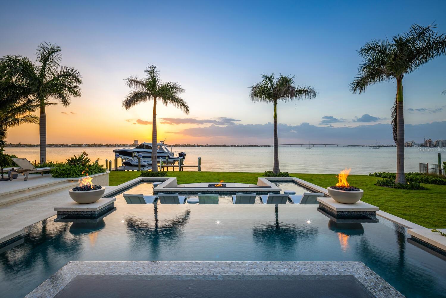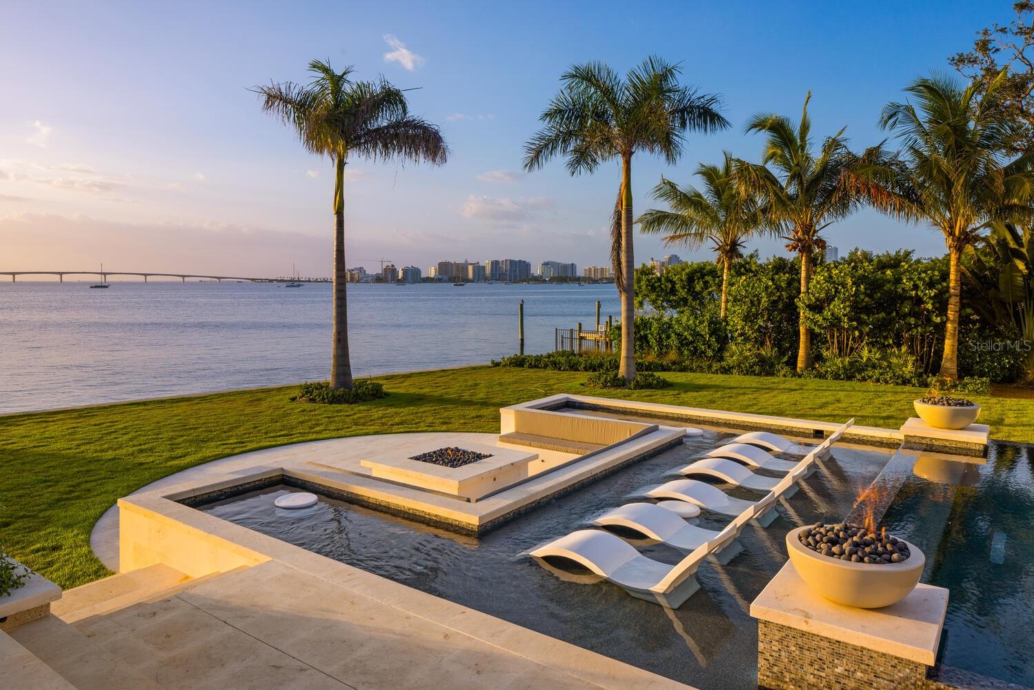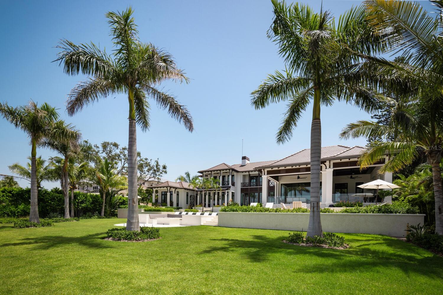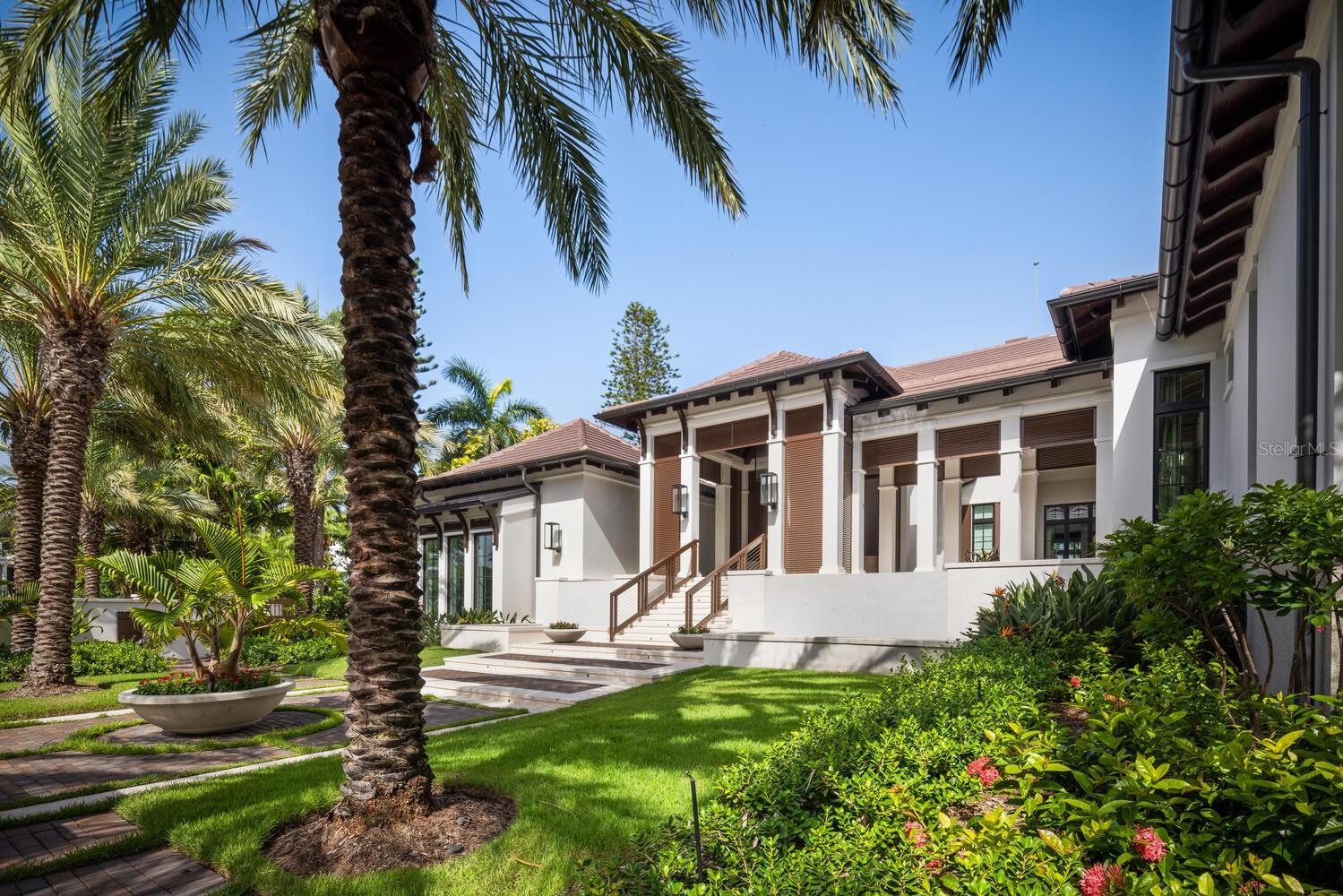 Exceptional in every aspect, this magnificent custom bayfront estate in Sarasota's coveted Harbor Acres Estate Section showcases superb craftsmanship, state-of-the-art technology, breathtaking vistas and fabulous amenities. Situated on nearly one acre with 144 feet of bay frontage, the 11,275-square-foot home boasts sophisticated, comfortable living spaces, primarily on the main floor, and mesmerizing views of Sarasota Bay, the Ringling Bridge and downtown. The modern British West Indies-style residence has 8 en-suite bedrooms and 4 powder bathrooms. Completed in 2022, the home was designed by Stofft Cooney Architects and masterfully built in 2 years by Perrone Construction. The meticulously curated estate is perfect for casual gatherings or large-scale soirees. European White Oak Engineered hardwood flooring flows throughout both levels, where architectural ceilings and enchanting light fixtures abound and multiple terraces offer awe-inspiring views. Wolf Design Group of Atlanta masterfully designed the interior. The kitchen, bar and primary bathroom design by Matthew Quinn of Atlanta-based Design Galleria. The remarkably landscaped grounds were designed by Stephen Hazeltine. The stucco and stone accent home features a raised pile foundation, hurricane impact windows and doors, screened covered porch with motorized bug screens and hurricane shutters, and a whole-house generator. Elba White stone steps ascend to an impressive entry pavilion. Inside, refined living spaces await for the entire family, including a voluminous formal living/dining room with fireplace, quartzite feature wall and floor-to-ceiling windows with captivating water views. The 8,200-SF-plus main level also has a dazzling gourmet kitchen, family room, mudroom, playroom, clubroom, gym, primary suite and expansive guest wing. The kitchen showcases an elegant La Cornue range and hood, Sub-Zero appliances and quartzite countertops, with an adjacent scullery, stylish breakfast nook and family room. An enormous temperature-controlled wine display separates the kitchen and formal dining room. The sizable clubroom is ideal for movie and game nights, with a bar and entertainment areas, plus French doors to a bayfront terrace. Elba White stone tile adorns the extensive outdoor space, which offers a kitchen with a Kalamazoo grill, dining and gathering areas, and an overflow pool with spa, sun shelf and fire bowls with automated lighting. A 27,000-lb. high-speed boat lift and 4,500-lb. dual Jet Ski lift with aluminum-framed platform are convenient for launching your waterway adventures. The primary suite features an opulent bathroom with blue quartzite countertops and flooring, massive closet and dressing room, second walk-in closet, morning bar, study and bayfront terrace. The generous guest wing has three en-suite bedrooms, lounge area, patio and a private outdoor entrance. The nearly 3,100-SF second level has a second primary suite, and three guest suites. A large lounge area with a balcony is perfect for savoring the stunning panoramas. Other notable highlights include a Crestron home automation system, motorized drapery/shades, home theater speaker system in the family room and clubroom, Lutron lighting system, whole house generator and automated mosquito spraying system. This waterfront masterpiece is just south of downtown's dining, shopping and cultural arts, walkable to Southside Village's restaurants and shops, and a short drive to pristine beaches.