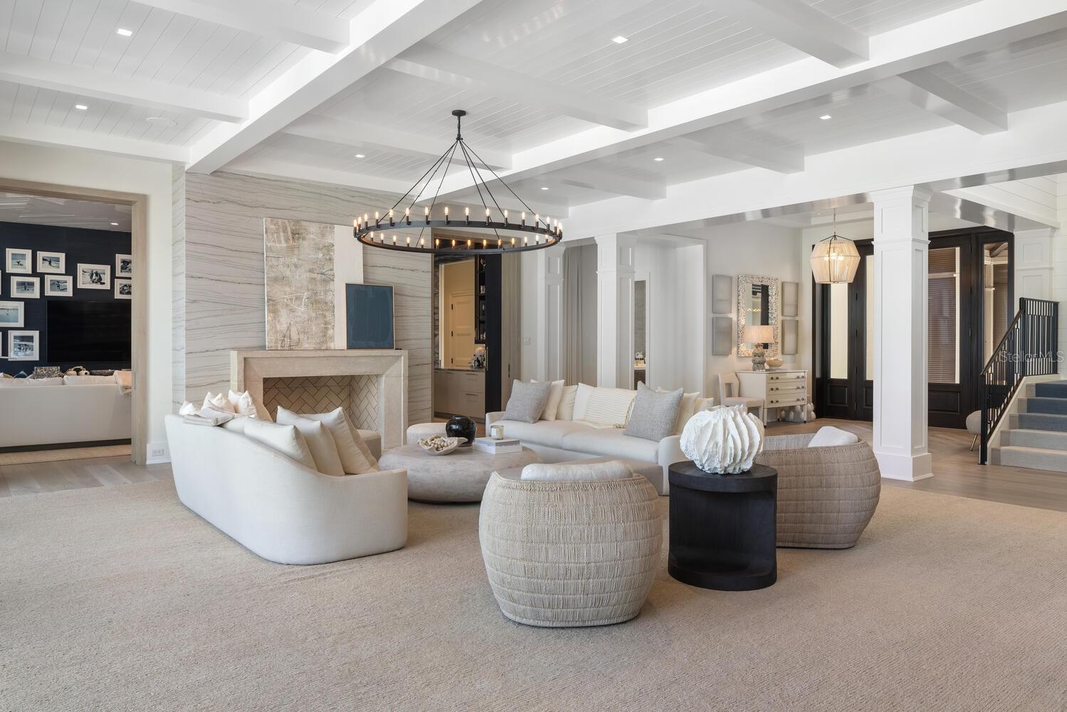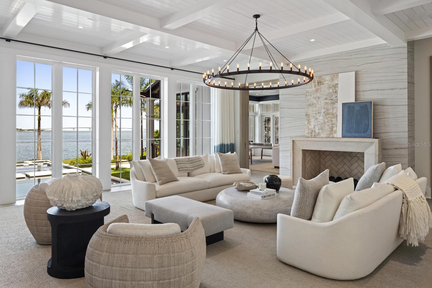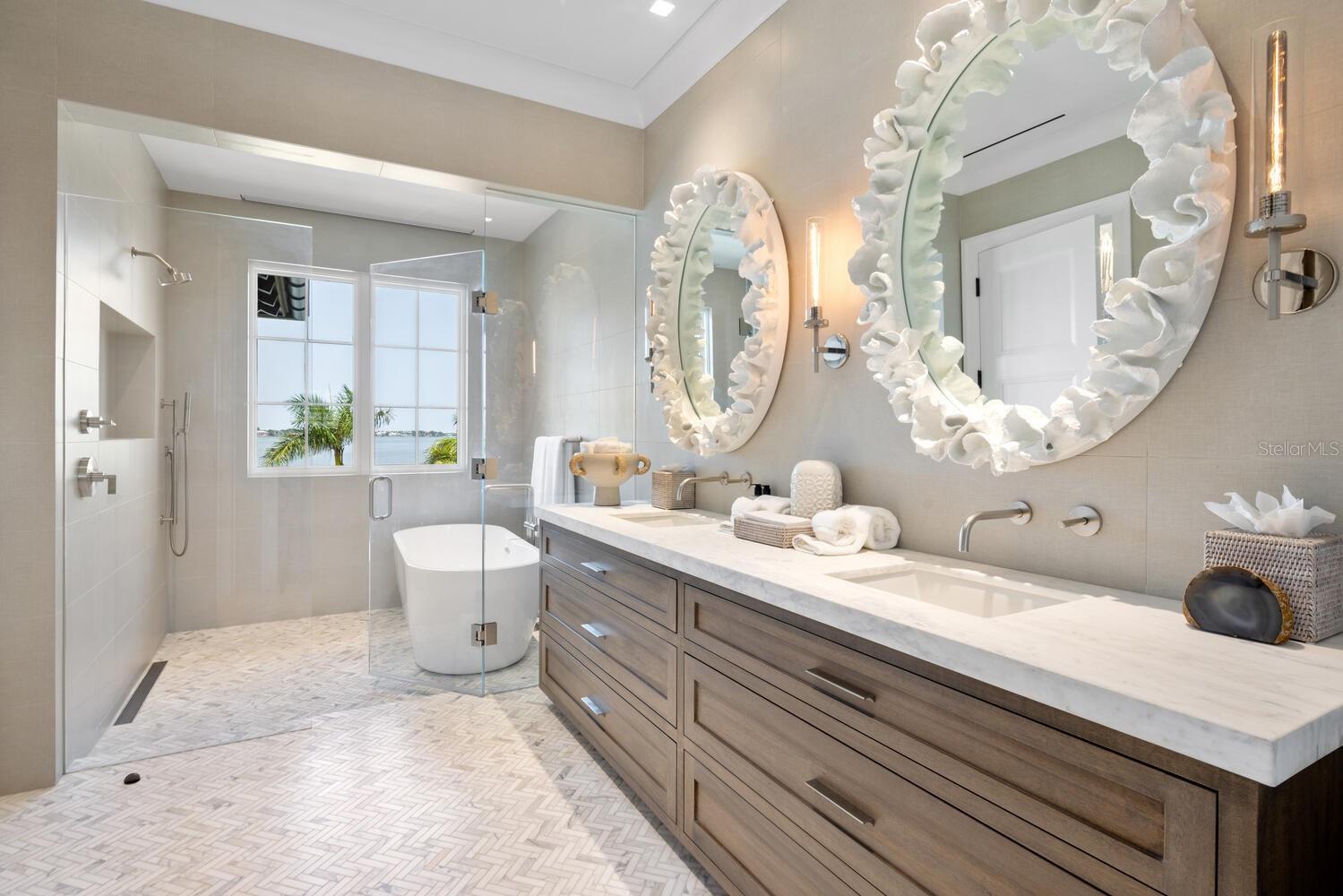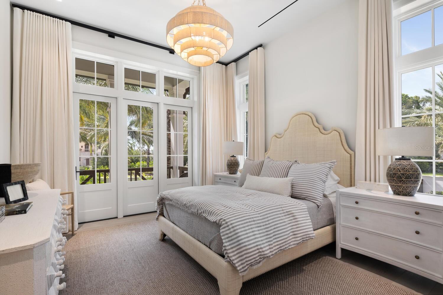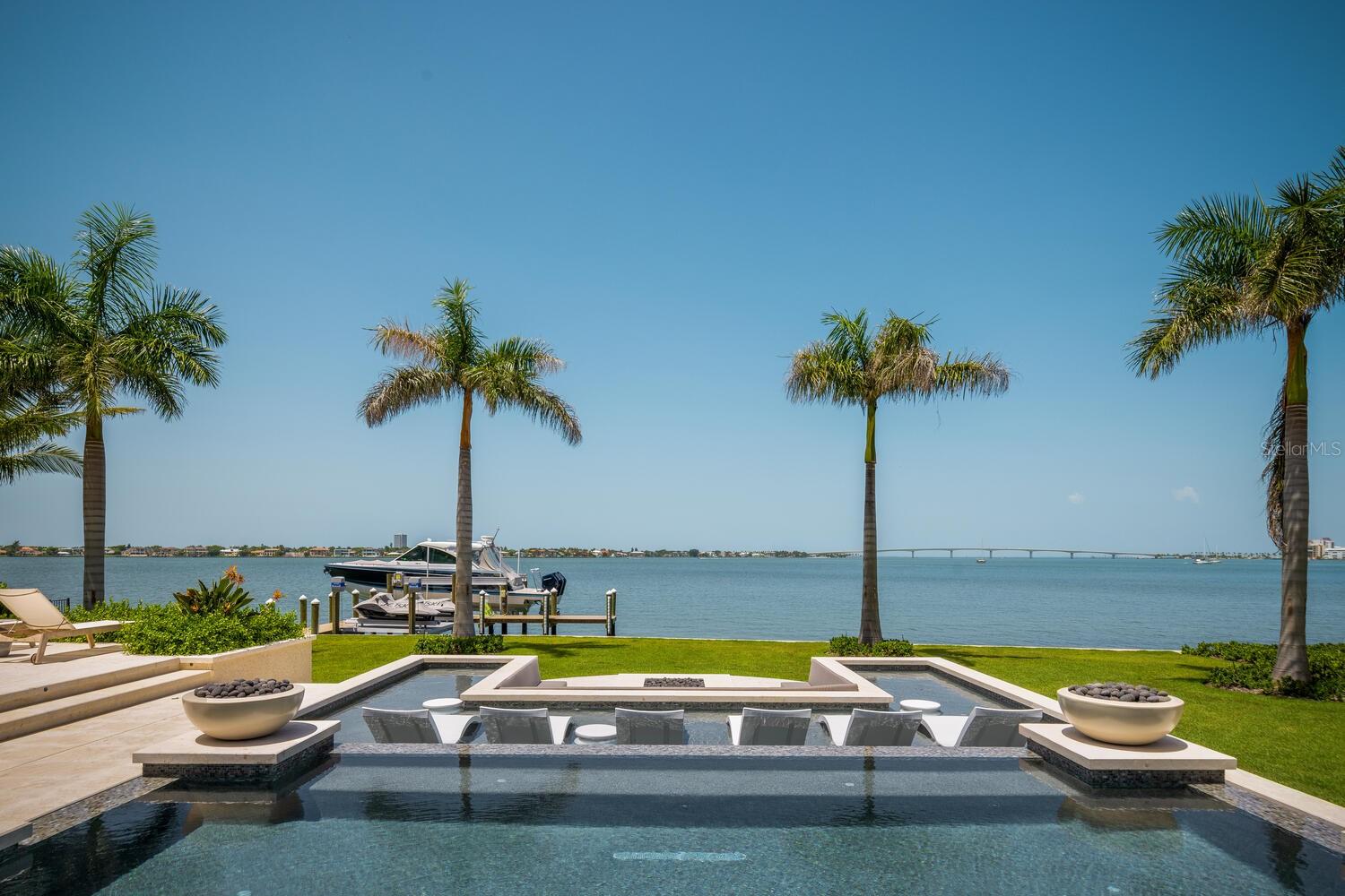Exceptional in every aspect, this magnificent custom bayfront estate in Sarasota's coveted Harbor Acres Estate Section showcases superb craftsmanship, state-of-the-art technology, breathtaking vistas and fabulous amenities. Situated on nearly one acre with 144 feet of bay frontage, the 11,275-square-foot home boasts sophisticated, comfortable living spaces, primarily on the main floor, and mesmerizing views of Sarasota Bay, the Ringling Bridge and downtown. The modern British West Indies-style residence has 8 en-suite bedrooms and 4 powder bathrooms. Completed in 2022, the home was designed by Stofft Cooney Architects and masterfully built in 2 years by Perrone Construction. The meticulously curated estate is perfect for casual gatherings or large-scale soirees. European White Oak Engineered hardwood flooring flows throughout both levels, where architectural ceilings and enchanting light fixtures abound and multiple terraces offer awe-inspiring views. Wolf Design Group of Atlanta masterfully designed the interior. The kitchen, bar and primary bathroom design by Matthew Quinn of Atlanta-based Design Galleria. The remarkably landscaped grounds were designed by Stephen Hazeltine. The stucco and stone accent home features a raised pile foundation, hurricane impact windows and doors, screened covered porch with motorized bug screens and hurricane shutters, and a whole-house generator. Elba White stone steps ascend to an impressive entry pavilion. Inside, refined living spaces await for the entire family, including a voluminous formal living/dining room with fireplace, quartzite feature wall and floor-to-ceiling windows with captivating water views. The 8,200-SF-plus main level also has a dazzling gourmet kitchen, family room, mudroom, playroom, clubroom, gym, primary suite and expansive guest wing. The kitchen showcases an elegant La Cornue range and hood, Sub-Zero appliances and quartzite countertops, with an adjacent scullery, stylish breakfast nook and family room. An enormous temperature-controlled wine display separates the kitchen and formal dining room. The sizable clubroom is ideal for movie and game nights, with a bar and entertainment areas, plus French doors to a bayfront terrace. Elba White stone tile adorns the extensive outdoor space, which offers a kitchen with a Kalamazoo grill, dining and gathering areas, and an overflow pool with spa, sun shelf and fire bowls with automated lighting. A 27,000-lb. high-speed boat lift and 4,500-lb. dual Jet Ski lift with aluminum-framed platform are convenient for launching your waterway adventures. The primary suite features an opulent bathroom with blue quartzite countertops and flooring, massive closet and dressing room, second walk-in closet, morning bar, study and bayfront terrace. The generous guest wing has three en-suite bedrooms, lounge area, patio and a private outdoor entrance. The nearly 3,100-SF second level has a second primary suite, and three guest suites. A large lounge area with a balcony is perfect for savoring the stunning panoramas. Other notable highlights include a Crestron home automation system, motorized drapery/shades, home theater speaker system in the family room and clubroom, Lutron lighting system, whole house generator and automated mosquito spraying system. This waterfront masterpiece is just south of downtown's dining, shopping and cultural arts, walkable to Southside Village's restaurants and shops, and a short drive to pristine beaches.