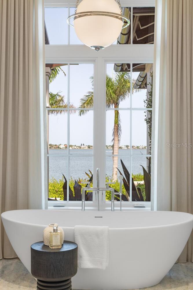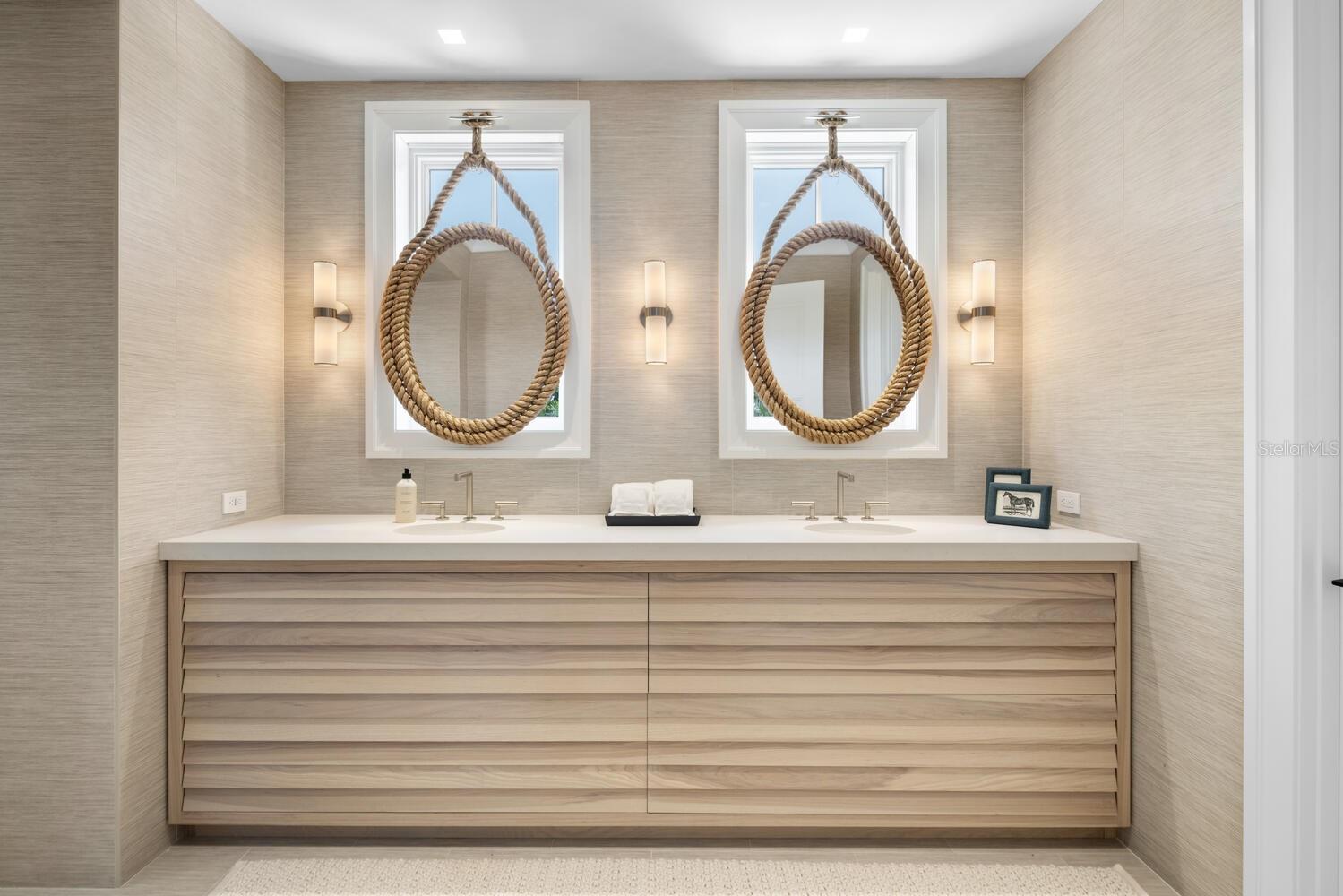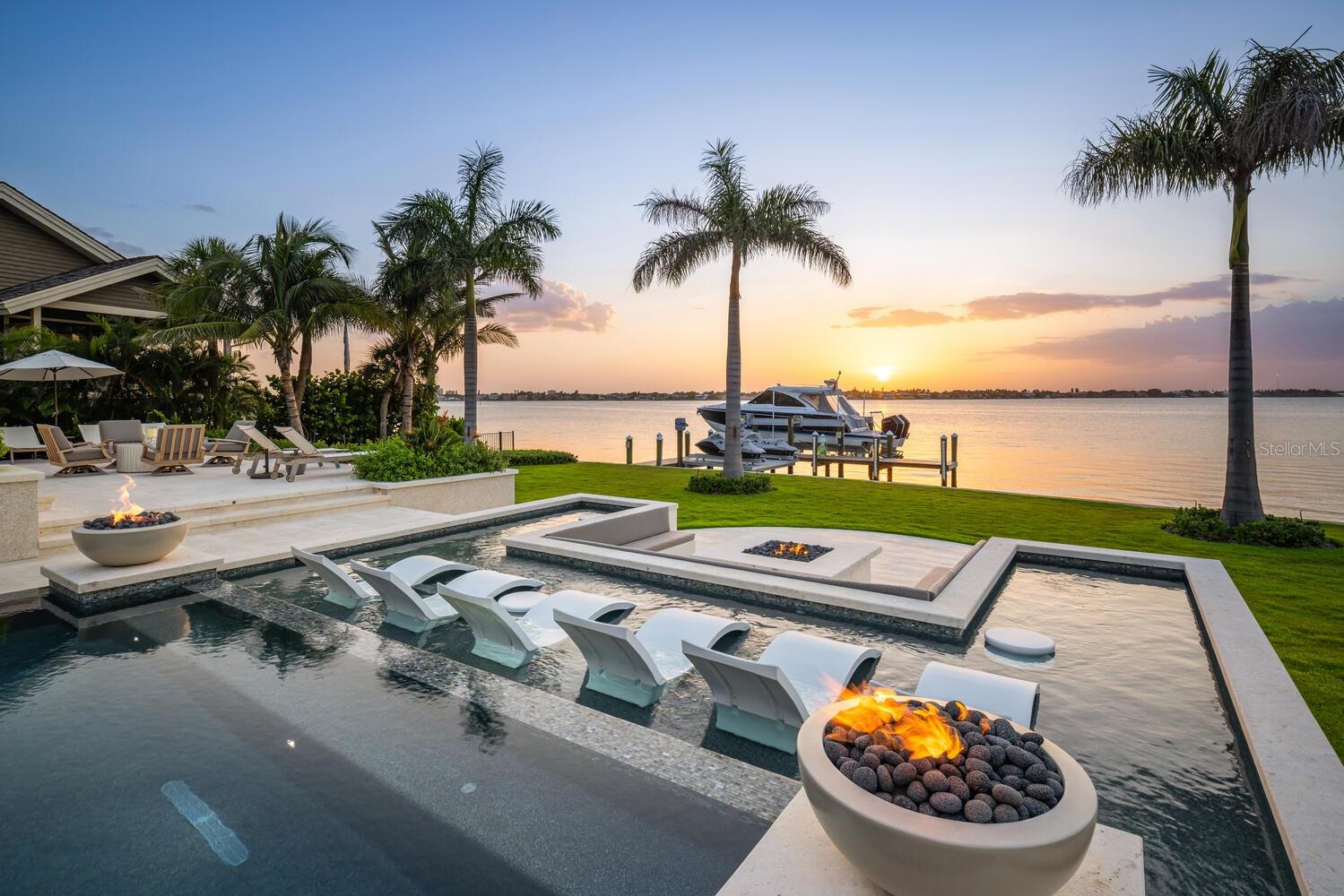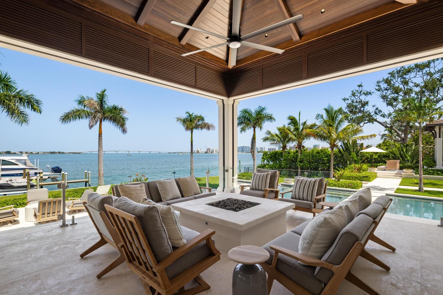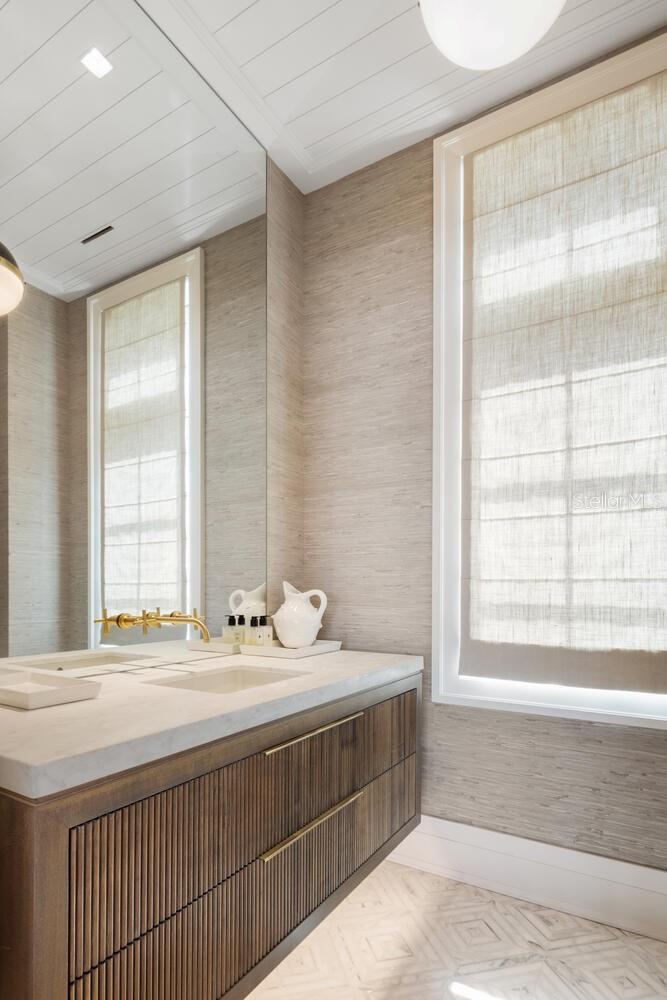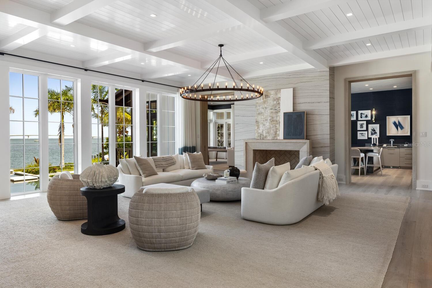 Exceptional in every aspect, this magnificent custom bayfront estate in Sarasota's coveted Harbor Acres Estate Section showcases superb craftsmanship, state-of-the-art technology, breathtaking vistas and fabulous amenities. Situated on nearly one acre with 144 feet of bay frontage, the 11,275-square-foot home boasts sophisticated, comfortable living spaces, primarily on the main floor, and mesmerizing views of Sarasota Bay, the Ringling Bridge and downtown. The modern British West Indies-style residence has 8 en-suite bedrooms and 4 powder bathrooms. Completed in 2022, the home was designed by Stofft Cooney Architects and masterfully built in 2 years by Perrone Construction. The meticulously curated estate is perfect for casual gatherings or large-scale soirees. European White Oak Engineered hardwood flooring flows throughout both levels, where architectural ceilings and enchanting light fixtures abound and multiple terraces offer awe-inspiring views. Wolf Design Group of Atlanta masterfully designed the interior. The kitchen, bar and primary bathroom design by Matthew Quinn of Atlanta-based Design Galleria. The remarkably landscaped grounds were designed by Stephen Hazeltine. The stucco and stone accent home features a raised pile foundation, hurricane impact windows and doors, screened covered porch with motorized bug screens and hurricane shutters, and a whole-house generator. Elba White stone steps ascend to an impressive entry pavilion. Inside, refined living spaces await for the entire family, including a voluminous formal living/dining room with fireplace, quartzite feature wall and floor-to-ceiling windows with captivating water views. The 8,200-SF-plus main level also has a dazzling gourmet kitchen, family room, mudroom, playroom, clubroom, gym, primary suite and expansive guest wing. The kitchen showcases an elegant La Cornue range and hood, Sub-Zero appliances and quartzite countertops, with an adjacent scullery, stylish breakfast nook and family room. An enormous temperature-controlled wine display separates the kitchen and formal dining room. The sizable clubroom is ideal for movie and game nights, with a bar and entertainment areas, plus French doors to a bayfront terrace. Elba White stone tile adorns the extensive outdoor space, which offers a kitchen with a Kalamazoo grill, dining and gathering areas, and an overflow pool with spa, sun shelf and fire bowls with automated lighting. A 27,000-lb. high-speed boat lift and 4,500-lb. dual Jet Ski lift with aluminum-framed platform are convenient for launching your waterway adventures. The primary suite features an opulent bathroom with blue quartzite countertops and flooring, massive closet and dressing room, second walk-in closet, morning bar, study and bayfront terrace. The generous guest wing has three en-suite bedrooms, lounge area, patio and a private outdoor entrance. The nearly 3,100-SF second level has a second primary suite, and three guest suites. A large lounge area with a balcony is perfect for savoring the stunning panoramas. Other notable highlights include a Crestron home automation system, motorized drapery/shades, home theater speaker system in the family room and clubroom, Lutron lighting system, whole house generator and automated mosquito spraying system. This waterfront masterpiece is just south of downtown's dining, shopping and cultural arts, walkable to Southside Village's restaurants and shops, and a short drive to pristine beaches.
