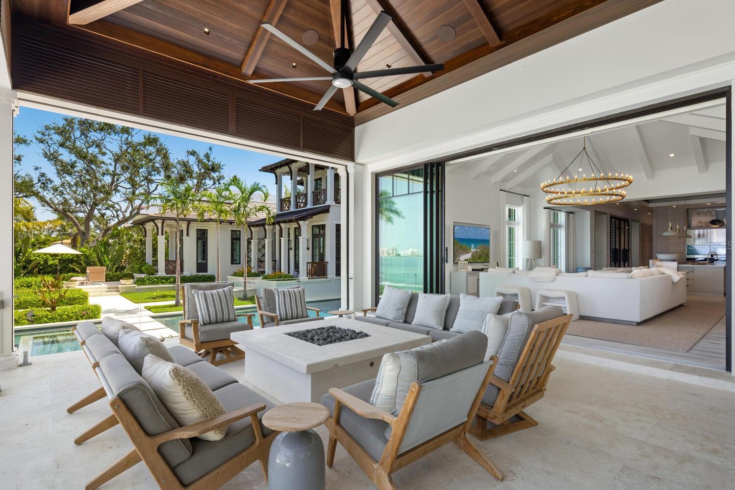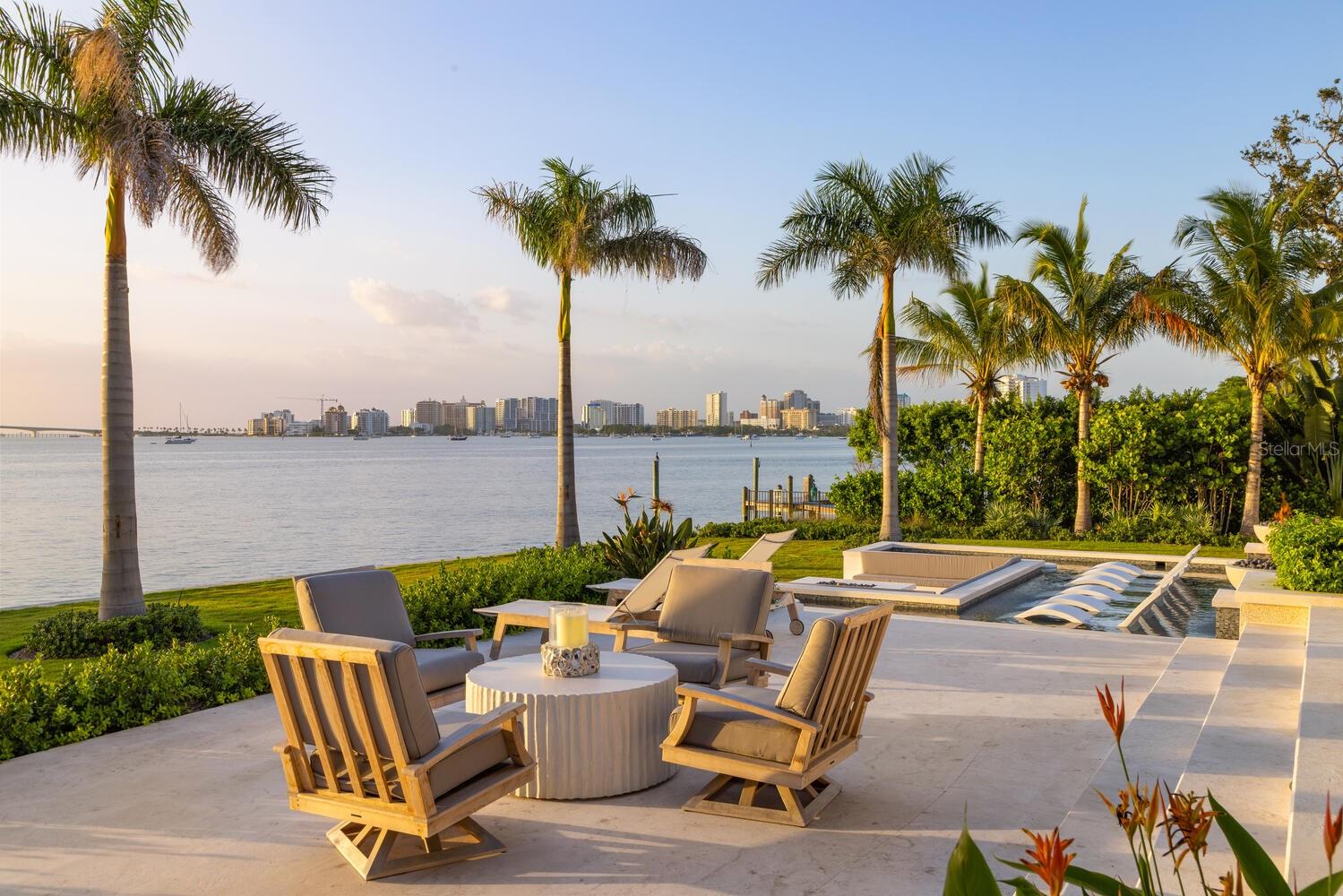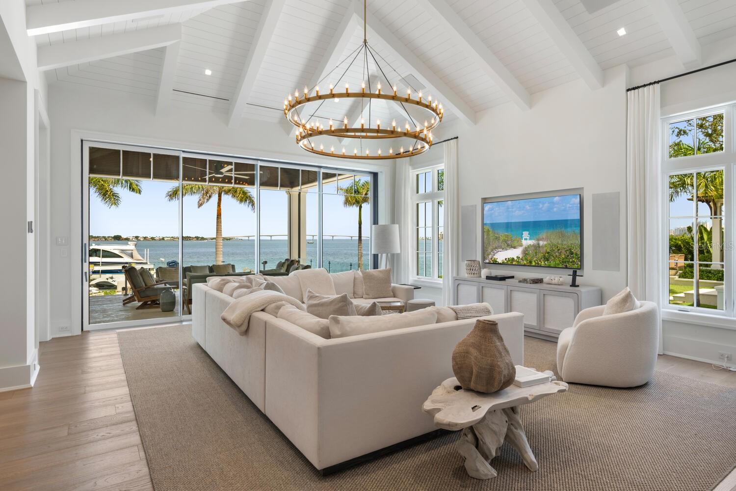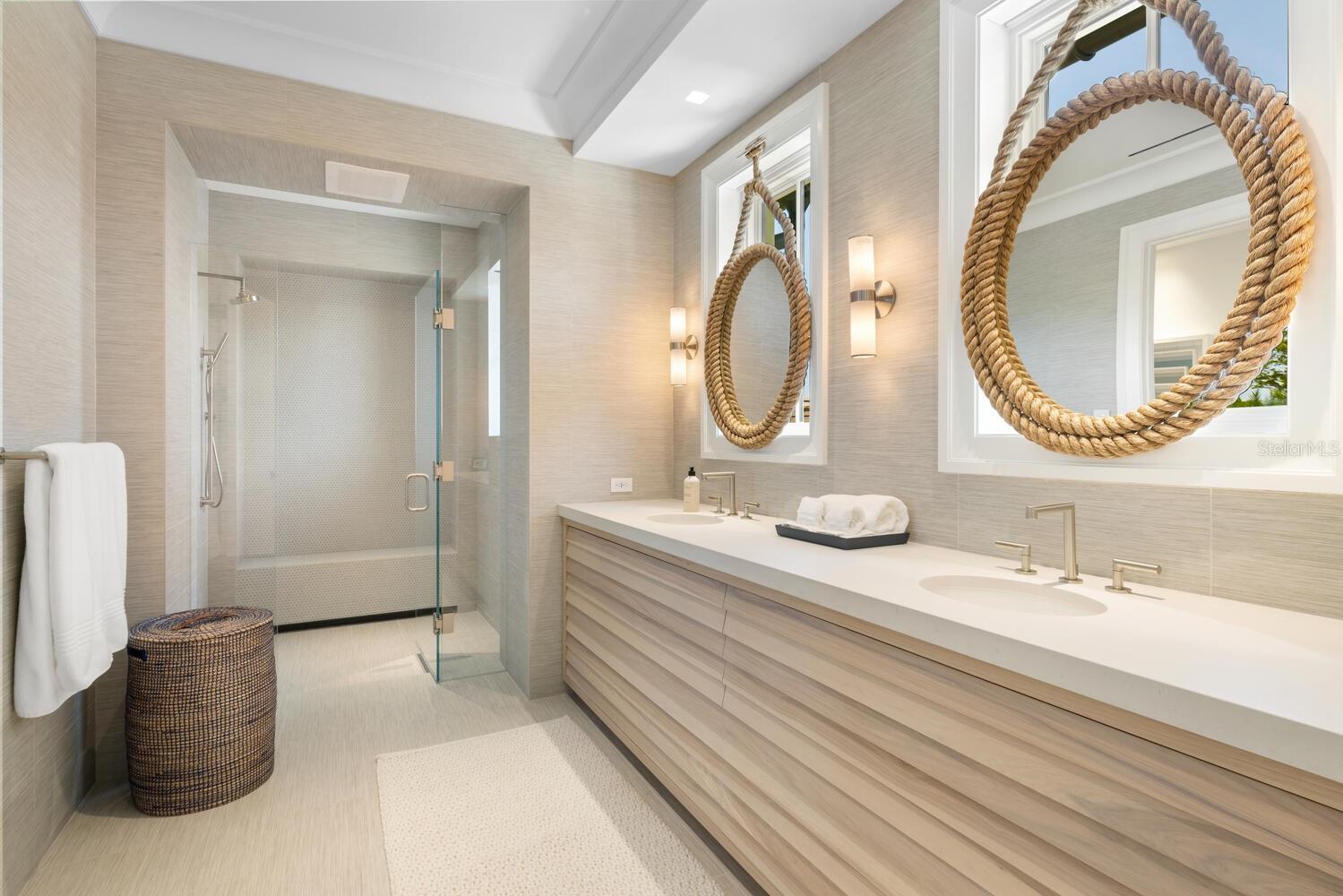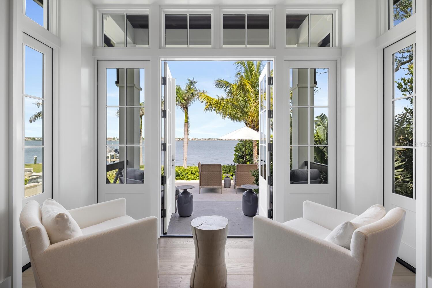 Exceptional in every aspect, this magnificent custom bayfront estate in Sarasota's coveted Harbor Acres Estate Section showcases superb craftsmanship, state-of-the-art technology, breathtaking vistas and fabulous amenities. Situated on nearly one acre with 144 feet of bay frontage, the 11,275-square-foot home boasts sophisticated, comfortable living spaces, primarily on the main floor, and mesmerizing views of Sarasota Bay, the Ringling Bridge and downtown. The modern British West Indies-style residence has 8 en-suite bedrooms and 4 powder bathrooms. Completed in 2022, the home was designed by Stofft Cooney Architects and masterfully built in 2 years by Perrone Construction. The meticulously curated estate is perfect for casual gatherings or large-scale soirees. European White Oak Engineered hardwood flooring flows throughout both levels, where architectural ceilings and enchanting light fixtures abound and multiple terraces offer awe-inspiring views. Wolf Design Group of Atlanta masterfully designed the interior. The kitchen, bar and primary bathroom design by Matthew Quinn of Atlanta-based Design Galleria. The remarkably landscaped grounds were designed by Stephen Hazeltine. The stucco and stone accent home features a raised pile foundation, hurricane impact windows and doors, screened covered porch with motorized bug screens and hurricane shutters, and a whole-house generator. Elba White stone steps ascend to an impressive entry pavilion. Inside, refined living spaces await for the entire family, including a voluminous formal living/dining room with fireplace, quartzite feature wall and floor-to-ceiling windows with captivating water views. The 8,200-SF-plus main level also has a dazzling gourmet kitchen, family room, mudroom, playroom, clubroom, gym, primary suite and expansive guest wing. The kitchen showcases an elegant La Cornue range and hood, Sub-Zero appliances and quartzite countertops, with an adjacent scullery, stylish breakfast nook and family room. An enormous temperature-controlled wine display separates the kitchen and formal dining room. The sizable clubroom is ideal for movie and game nights, with a bar and entertainment areas, plus French doors to a bayfront terrace. Elba White stone tile adorns the extensive outdoor space, which offers a kitchen with a Kalamazoo grill, dining and gathering areas, and an overflow pool with spa, sun shelf and fire bowls with automated lighting. A 27,000-lb. high-speed boat lift and 4,500-lb. dual Jet Ski lift with aluminum-framed platform are convenient for launching your waterway adventures. The primary suite features an opulent bathroom with blue quartzite countertops and flooring, massive closet and dressing room, second walk-in closet, morning bar, study and bayfront terrace. The generous guest wing has three en-suite bedrooms, lounge area, patio and a private outdoor entrance. The nearly 3,100-SF second level has a second primary suite, and three guest suites. A large lounge area with a balcony is perfect for savoring the stunning panoramas. Other notable highlights include a Crestron home automation system, motorized drapery/shades, home theater speaker system in the family room and clubroom, Lutron lighting system, whole house generator and automated mosquito spraying system. This waterfront masterpiece is just south of downtown's dining, shopping and cultural arts, walkable to Southside Village's restaurants and shops, and a short drive to pristine beaches.