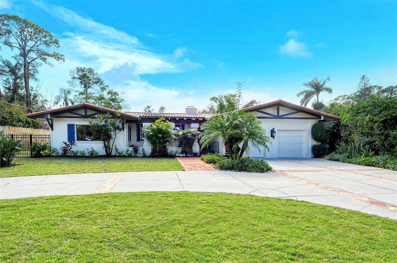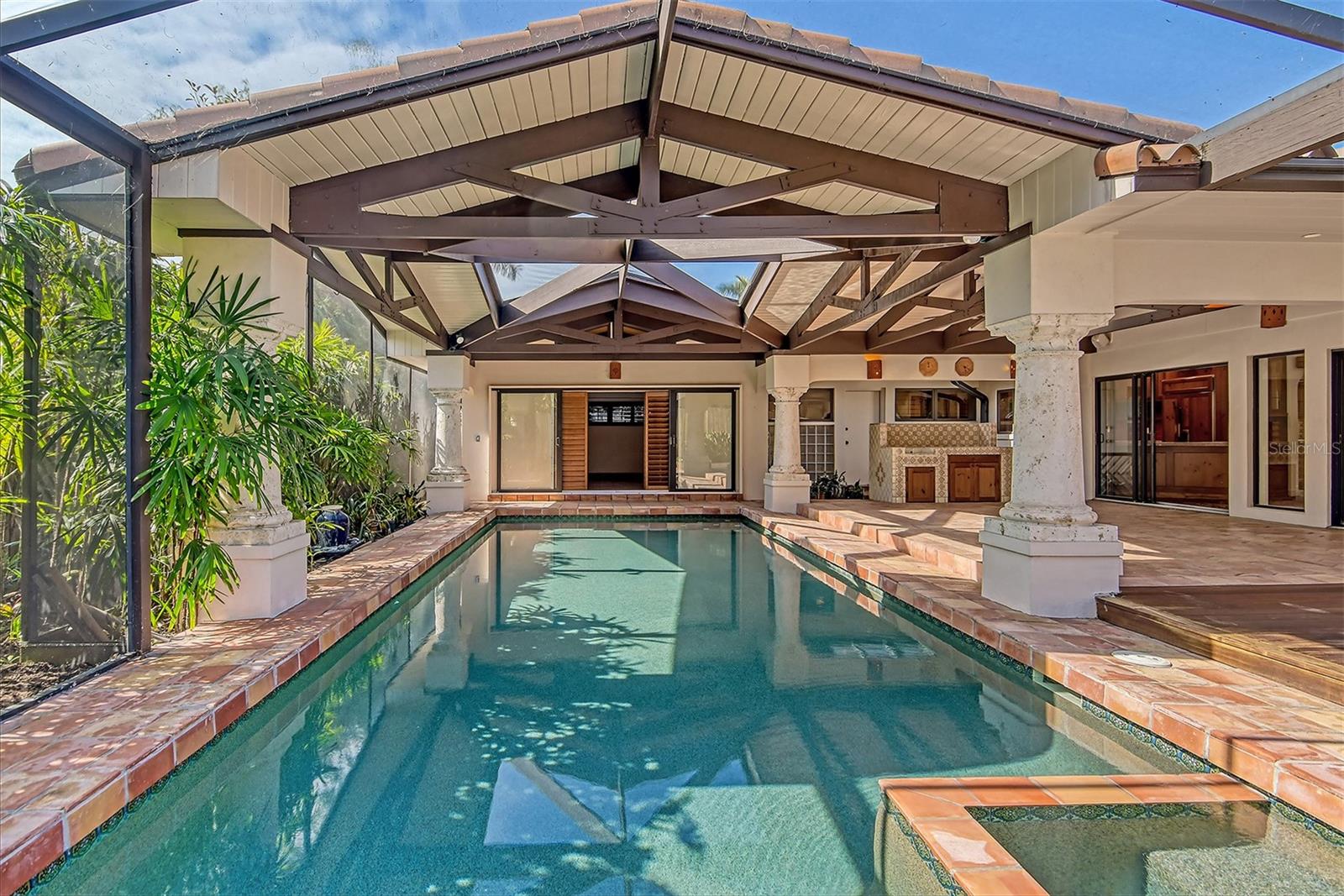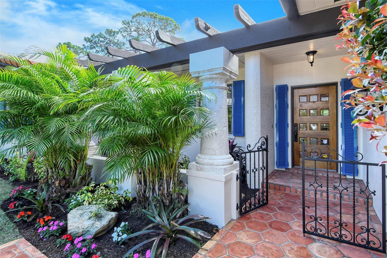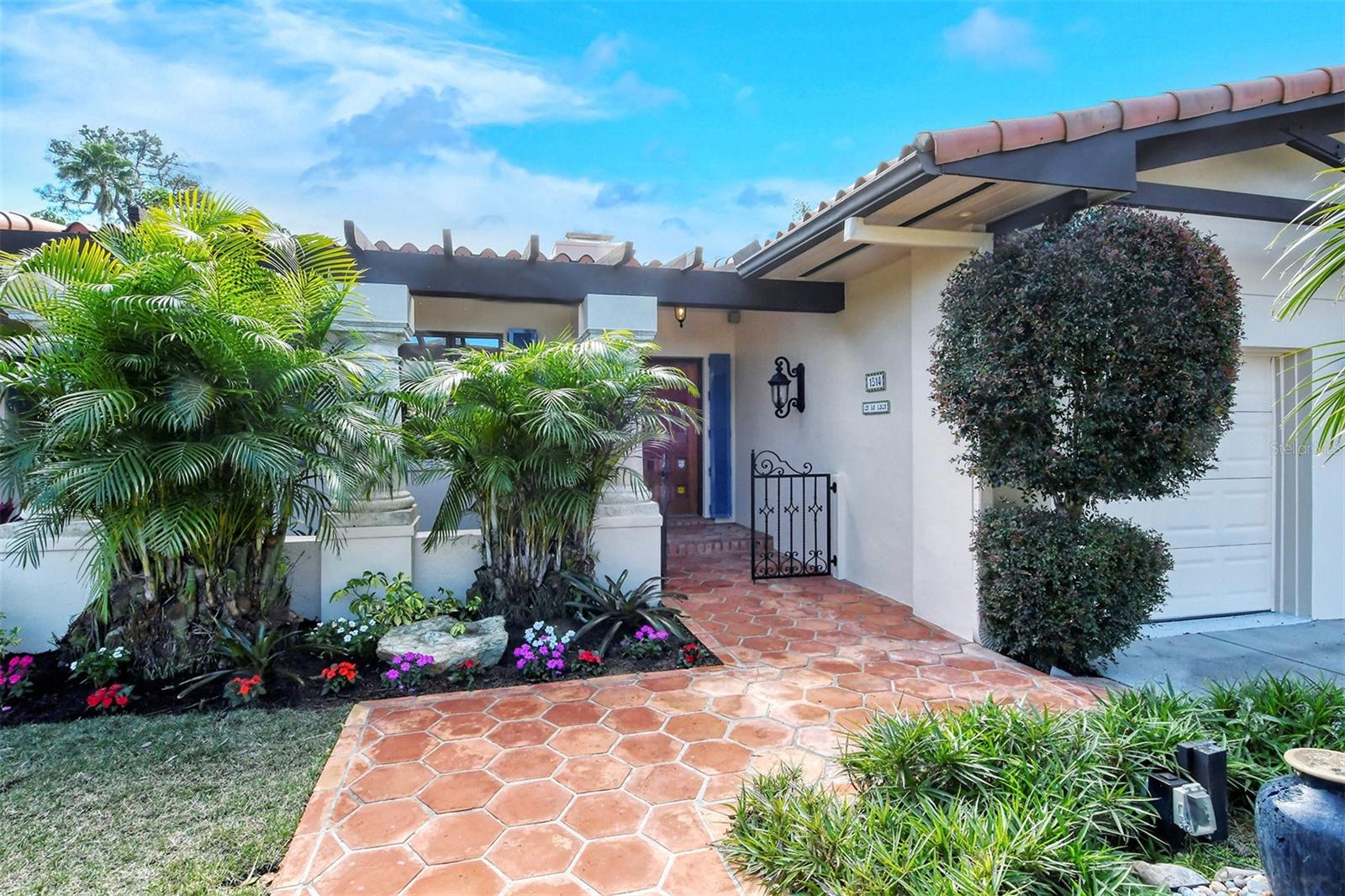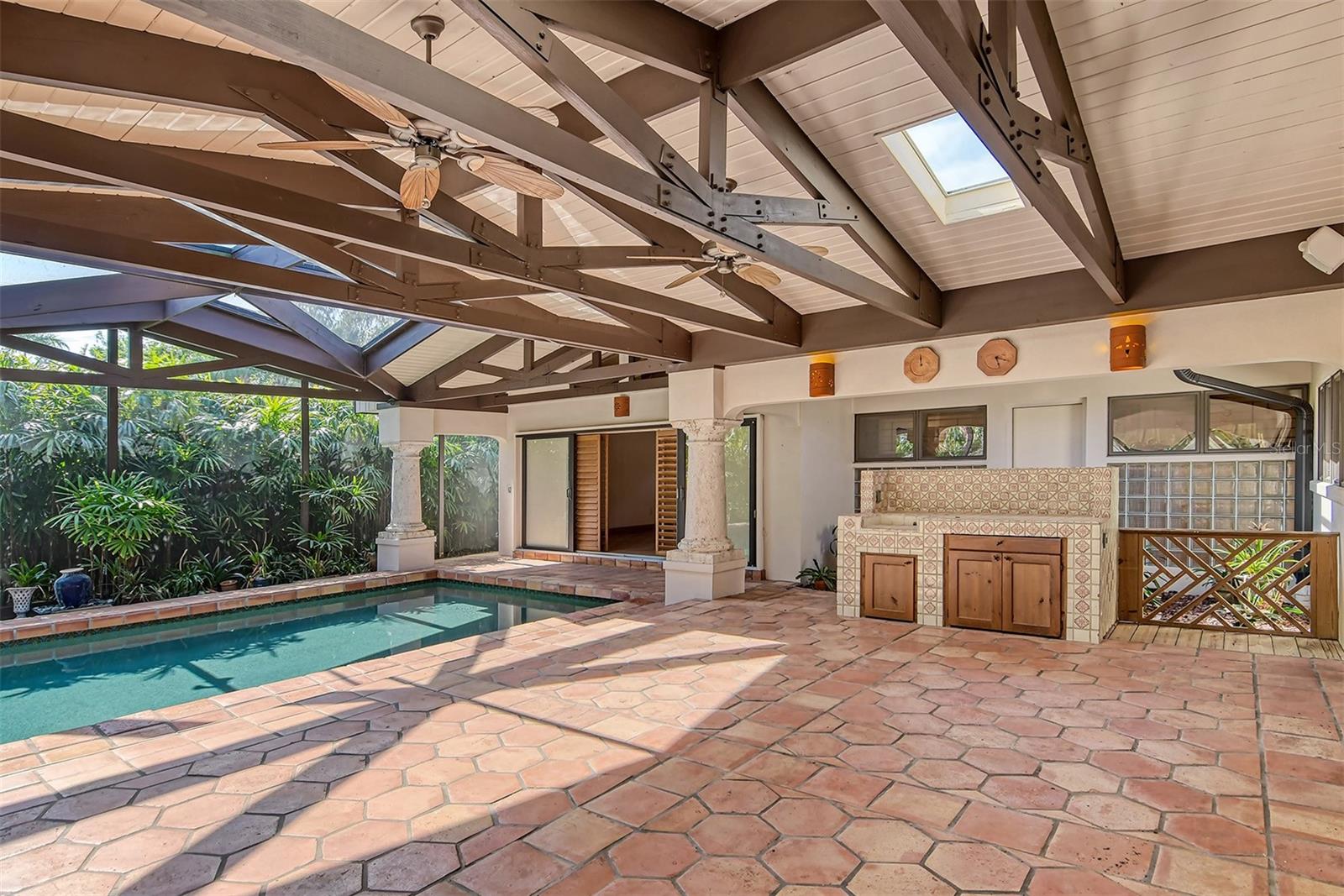 One or more photo(s) has been virtually staged. Nestled on one-third of an acre in the picturesque West of Trail community of Oyster Bay Estates, this captivating one-of-a-kind home combines striking artisan and architectural details with elegant charm and comfort inside and out. The 2,430-SF residence features a clay tile roof, Mexican tile floors, carved stone fireplace mantel and surround, hand-painted tile accents, hand-painted sinks, and hand-made clay sconces and pendants. Natural wood baseboards, cabinetry, ceiling beams and plantation shutters infuse the home with warmth, and Andersen windows protected by decorative stay-in-place shutters provide peace of mind. An enchanting front yard and entry courtyard set the tone for the home's distinctive interior, boasting thoughtfully selected appointments and finishes details throughout. Well-connected main living spaces, including the kitchen, dining, and living areas, and screened lanai are perfect for entertaining. The stunning kitchen includes custom wood cabinetry, fossil marble countertops and high-end appliances, including a Fisher & Paykel dual-fuel range with side-by-side ovens. The kitchen opens to the spacious living and dining areas, where walls of glass transition to an expansive, private outdoor sanctuary surrounded by flourishing tropical landscaping. The lanai features a 40'x14' heated pool, stone columns, generous covered spaces with wood ceilings for dining and entertaining, and an open deck overlooking the tranquil scenery and fenced backyard. A sumptuous private retreat awaits in the lovely owners' suite, featuring a cathedral ceiling with exposed wood beams and trapezoid windows over sliding glass doors to the pool. A charming hallway - with windows and a door to a courtyard garden on one side - flows past two walk-in closets and the master bathroom with dual vanities and a large walk-in shower. Two 16'x11' bedrooms provide comfortable, private quarters for overnight guests. This amazing home is just down the road from the exclusive Field Club, close to shopping and dining, and a few miles to Siesta Beach and downtown Sarasota.