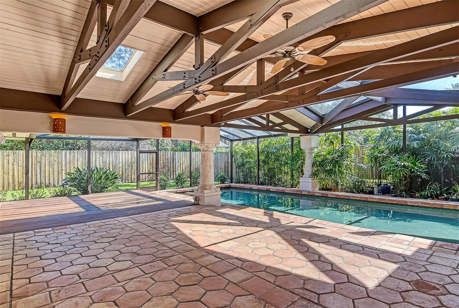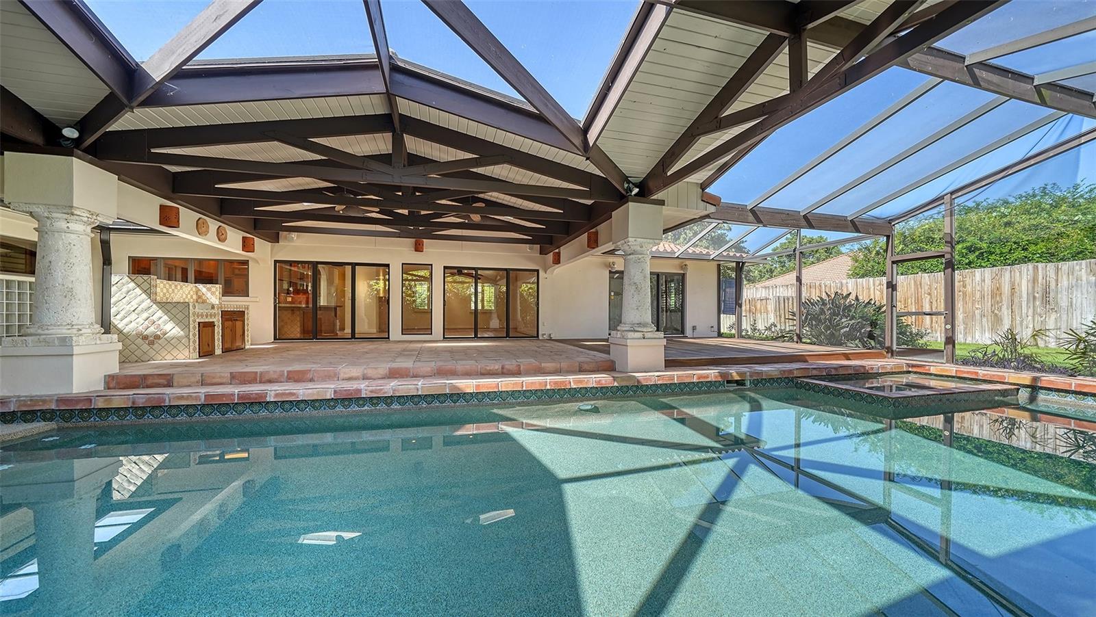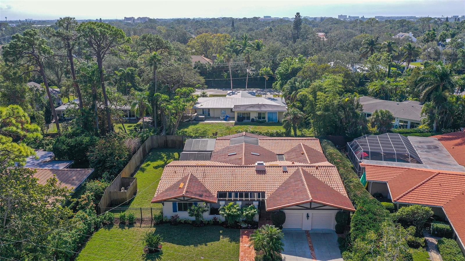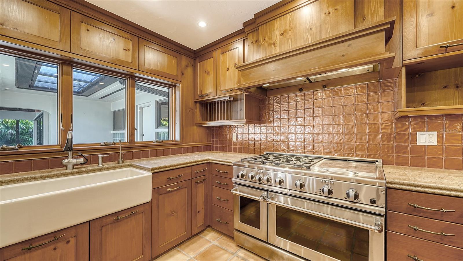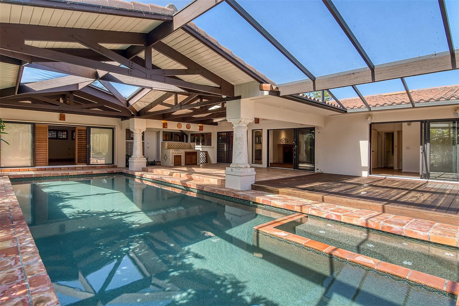 One or more photo(s) has been virtually staged. Nestled on one-third of an acre in the picturesque West of Trail community of Oyster Bay Estates, this captivating one-of-a-kind home combines striking artisan and architectural details with elegant charm and comfort inside and out. The 2,430-SF residence features a clay tile roof, Mexican tile floors, carved stone fireplace mantel and surround, hand-painted tile accents, hand-painted sinks, and hand-made clay sconces and pendants. Natural wood baseboards, cabinetry, ceiling beams and plantation shutters infuse the home with warmth, and Andersen windows protected by decorative stay-in-place shutters provide peace of mind. An enchanting front yard and entry courtyard set the tone for the home's distinctive interior, boasting thoughtfully selected appointments and finishes details throughout. Well-connected main living spaces, including the kitchen, dining, and living areas, and screened lanai are perfect for entertaining. The stunning kitchen includes custom wood cabinetry, fossil marble countertops and high-end appliances, including a Fisher & Paykel dual-fuel range with side-by-side ovens. The kitchen opens to the spacious living and dining areas, where walls of glass transition to an expansive, private outdoor sanctuary surrounded by flourishing tropical landscaping. The lanai features a 40'x14' heated pool, stone columns, generous covered spaces with wood ceilings for dining and entertaining, and an open deck overlooking the tranquil scenery and fenced backyard. A sumptuous private retreat awaits in the lovely owners' suite, featuring a cathedral ceiling with exposed wood beams and trapezoid windows over sliding glass doors to the pool. A charming hallway - with windows and a door to a courtyard garden on one side - flows past two walk-in closets and the master bathroom with dual vanities and a large walk-in shower. Two 16'x11' bedrooms provide comfortable, private quarters for overnight guests. This amazing home is just down the road from the exclusive Field Club, close to shopping and dining, and a few miles to Siesta Beach and downtown Sarasota.