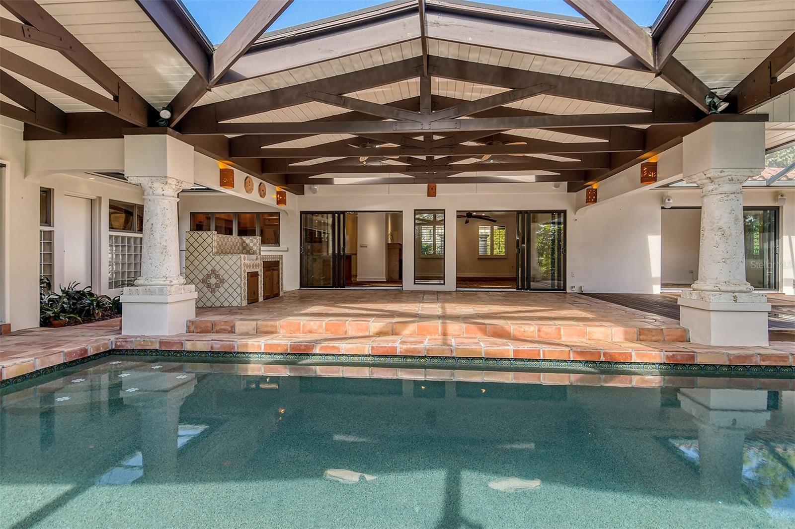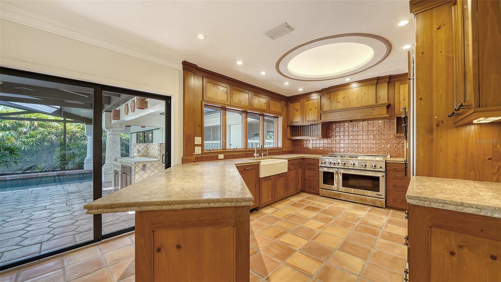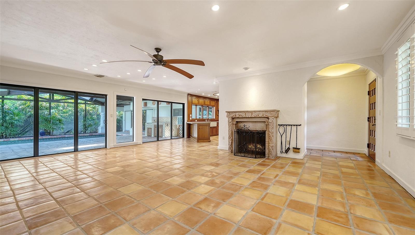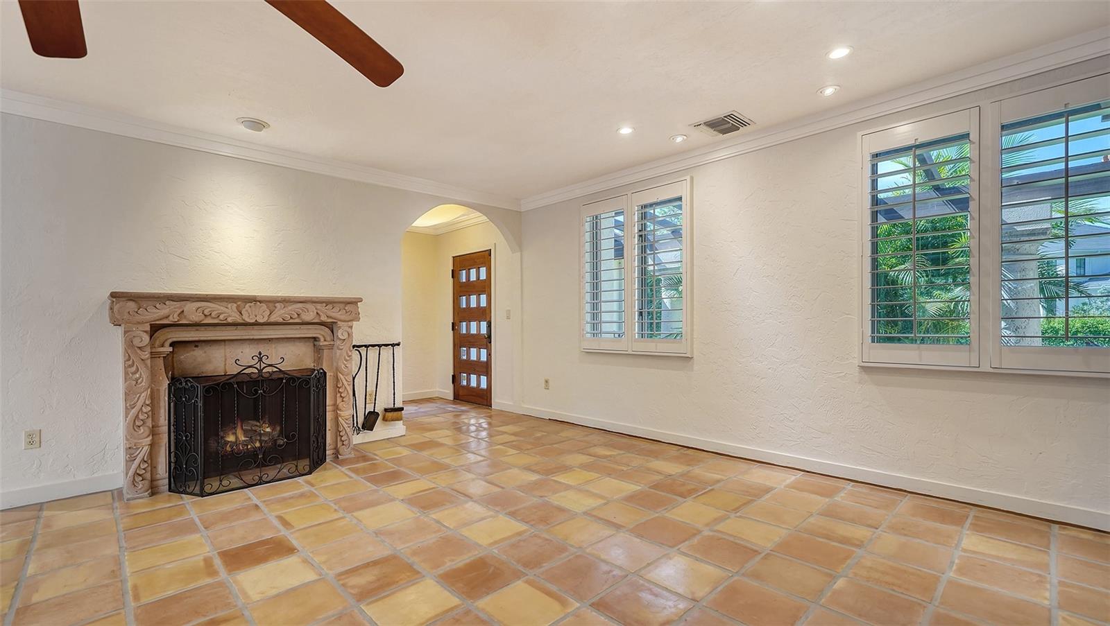 One or more photo(s) has been virtually staged. Nestled on one-third of an acre in the picturesque West of Trail community of Oyster Bay Estates, this captivating one-of-a-kind home combines striking artisan and architectural details with elegant charm and comfort inside and out. The 2,430-SF residence features a clay tile roof, Mexican tile floors, carved stone fireplace mantel and surround, hand-painted tile accents, hand-painted sinks, and hand-made clay sconces and pendants. Natural wood baseboards, cabinetry, ceiling beams and plantation shutters infuse the home with warmth, and Andersen windows protected by decorative stay-in-place shutters provide peace of mind. An enchanting front yard and entry courtyard set the tone for the home's distinctive interior, boasting thoughtfully selected appointments and finishes details throughout. Well-connected main living spaces, including the kitchen, dining, and living areas, and screened lanai are perfect for entertaining. The stunning kitchen includes custom wood cabinetry, fossil marble countertops and high-end appliances, including a Fisher & Paykel dual-fuel range with side-by-side ovens. The kitchen opens to the spacious living and dining areas, where walls of glass transition to an expansive, private outdoor sanctuary surrounded by flourishing tropical landscaping. The lanai features a 40'x14' heated pool, stone columns, generous covered spaces with wood ceilings for dining and entertaining, and an open deck overlooking the tranquil scenery and fenced backyard. A sumptuous private retreat awaits in the lovely owners' suite, featuring a cathedral ceiling with exposed wood beams and trapezoid windows over sliding glass doors to the pool. A charming hallway - with windows and a door to a courtyard garden on one side - flows past two walk-in closets and the master bathroom with dual vanities and a large walk-in shower. Two 16'x11' bedrooms provide comfortable, private quarters for overnight guests. This amazing home is just down the road from the exclusive Field Club, close to shopping and dining, and a few miles to Siesta Beach and downtown Sarasota.