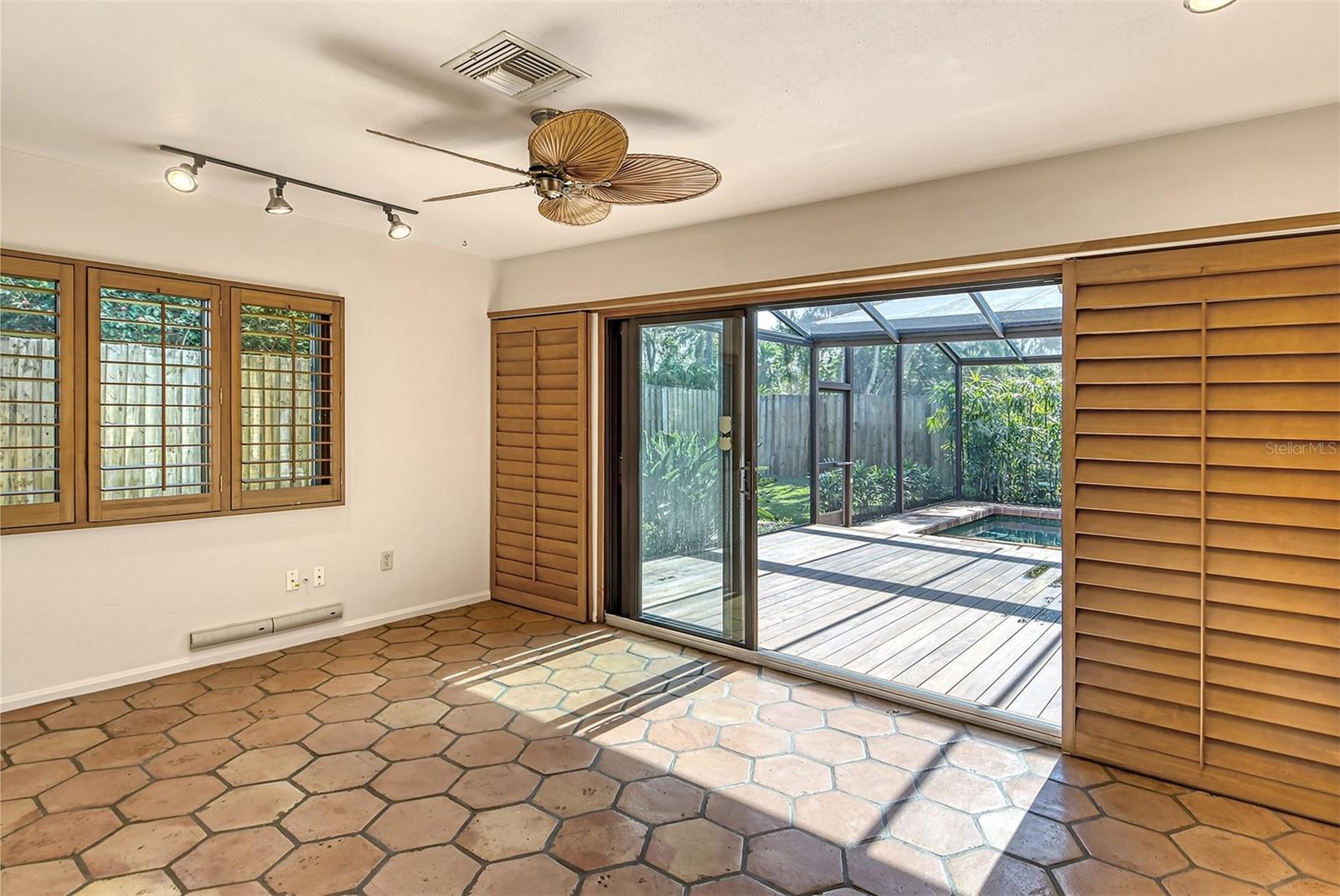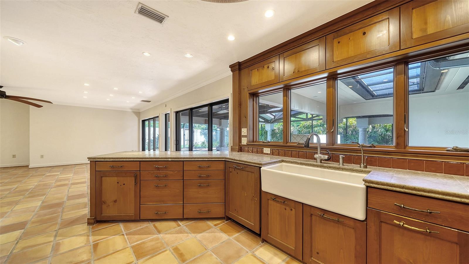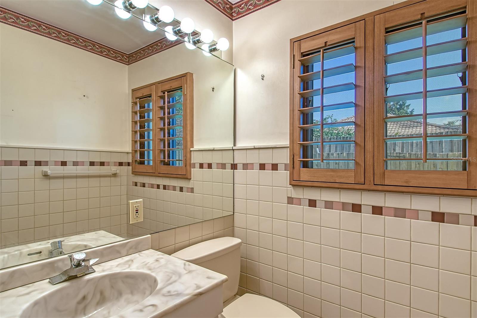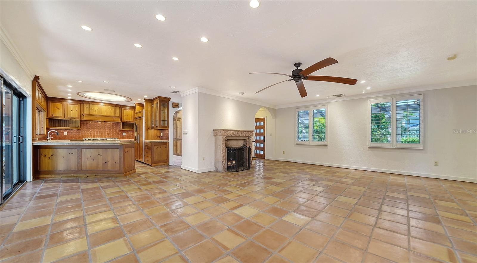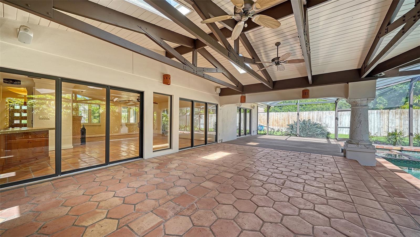 One or more photo(s) has been virtually staged. Nestled on one-third of an acre in the picturesque West of Trail community of Oyster Bay Estates, this captivating one-of-a-kind home combines striking artisan and architectural details with elegant charm and comfort inside and out. The 2,430-SF residence features a clay tile roof, Mexican tile floors, carved stone fireplace mantel and surround, hand-painted tile accents, hand-painted sinks, and hand-made clay sconces and pendants. Natural wood baseboards, cabinetry, ceiling beams and plantation shutters infuse the home with warmth, and Andersen windows protected by decorative stay-in-place shutters provide peace of mind. An enchanting front yard and entry courtyard set the tone for the home's distinctive interior, boasting thoughtfully selected appointments and finishes details throughout. Well-connected main living spaces, including the kitchen, dining, and living areas, and screened lanai are perfect for entertaining. The stunning kitchen includes custom wood cabinetry, fossil marble countertops and high-end appliances, including a Fisher & Paykel dual-fuel range with side-by-side ovens. The kitchen opens to the spacious living and dining areas, where walls of glass transition to an expansive, private outdoor sanctuary surrounded by flourishing tropical landscaping. The lanai features a 40'x14' heated pool, stone columns, generous covered spaces with wood ceilings for dining and entertaining, and an open deck overlooking the tranquil scenery and fenced backyard. A sumptuous private retreat awaits in the lovely owners' suite, featuring a cathedral ceiling with exposed wood beams and trapezoid windows over sliding glass doors to the pool. A charming hallway - with windows and a door to a courtyard garden on one side - flows past two walk-in closets and the master bathroom with dual vanities and a large walk-in shower. Two 16'x11' bedrooms provide comfortable, private quarters for overnight guests. This amazing home is just down the road from the exclusive Field Club, close to shopping and dining, and a few miles to Siesta Beach and downtown Sarasota.