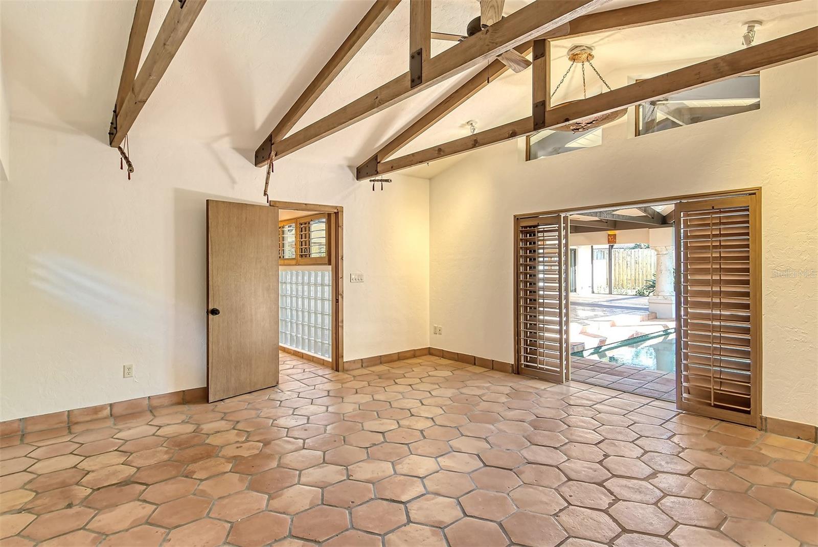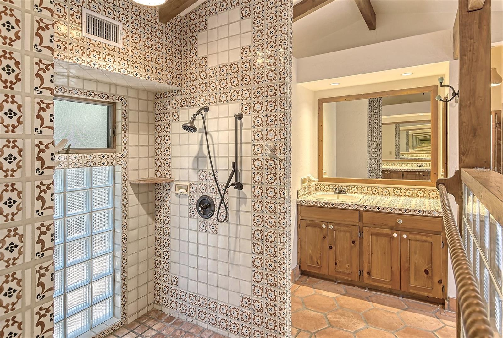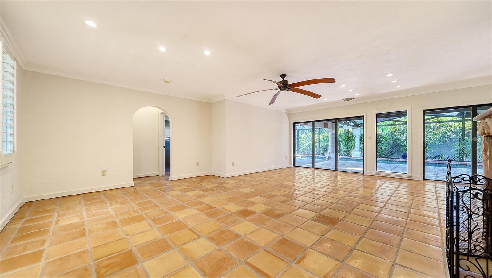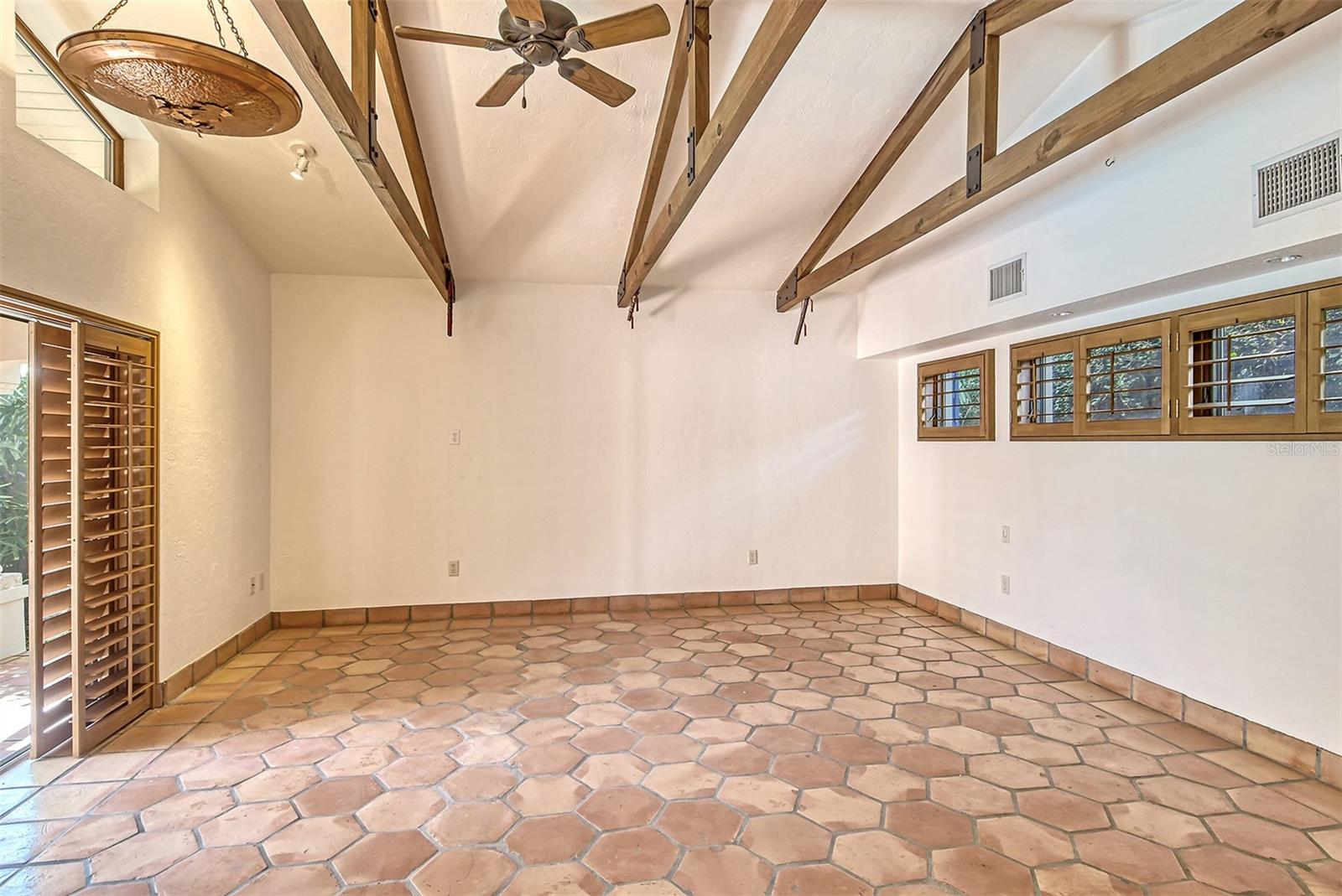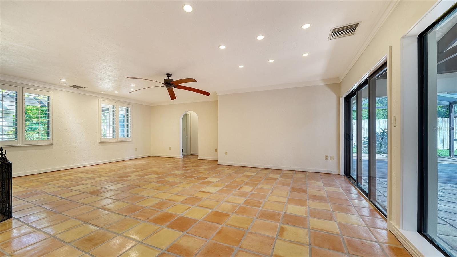 One or more photo(s) has been virtually staged. Nestled on one-third of an acre in the picturesque West of Trail community of Oyster Bay Estates, this captivating one-of-a-kind home combines striking artisan and architectural details with elegant charm and comfort inside and out. The 2,430-SF residence features a clay tile roof, Mexican tile floors, carved stone fireplace mantel and surround, hand-painted tile accents, hand-painted sinks, and hand-made clay sconces and pendants. Natural wood baseboards, cabinetry, ceiling beams and plantation shutters infuse the home with warmth, and Andersen windows protected by decorative stay-in-place shutters provide peace of mind. An enchanting front yard and entry courtyard set the tone for the home's distinctive interior, boasting thoughtfully selected appointments and finishes details throughout. Well-connected main living spaces, including the kitchen, dining, and living areas, and screened lanai are perfect for entertaining. The stunning kitchen includes custom wood cabinetry, fossil marble countertops and high-end appliances, including a Fisher & Paykel dual-fuel range with side-by-side ovens. The kitchen opens to the spacious living and dining areas, where walls of glass transition to an expansive, private outdoor sanctuary surrounded by flourishing tropical landscaping. The lanai features a 40'x14' heated pool, stone columns, generous covered spaces with wood ceilings for dining and entertaining, and an open deck overlooking the tranquil scenery and fenced backyard. A sumptuous private retreat awaits in the lovely owners' suite, featuring a cathedral ceiling with exposed wood beams and trapezoid windows over sliding glass doors to the pool. A charming hallway - with windows and a door to a courtyard garden on one side - flows past two walk-in closets and the master bathroom with dual vanities and a large walk-in shower. Two 16'x11' bedrooms provide comfortable, private quarters for overnight guests. This amazing home is just down the road from the exclusive Field Club, close to shopping and dining, and a few miles to Siesta Beach and downtown Sarasota.
