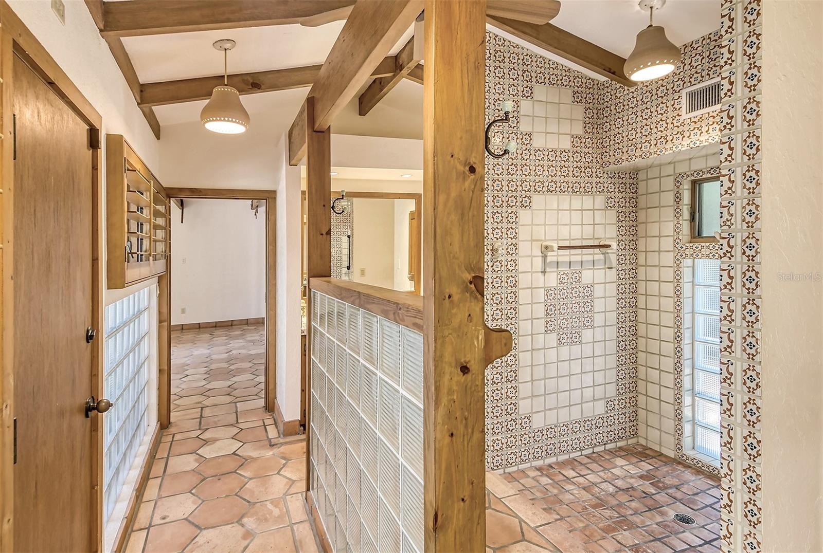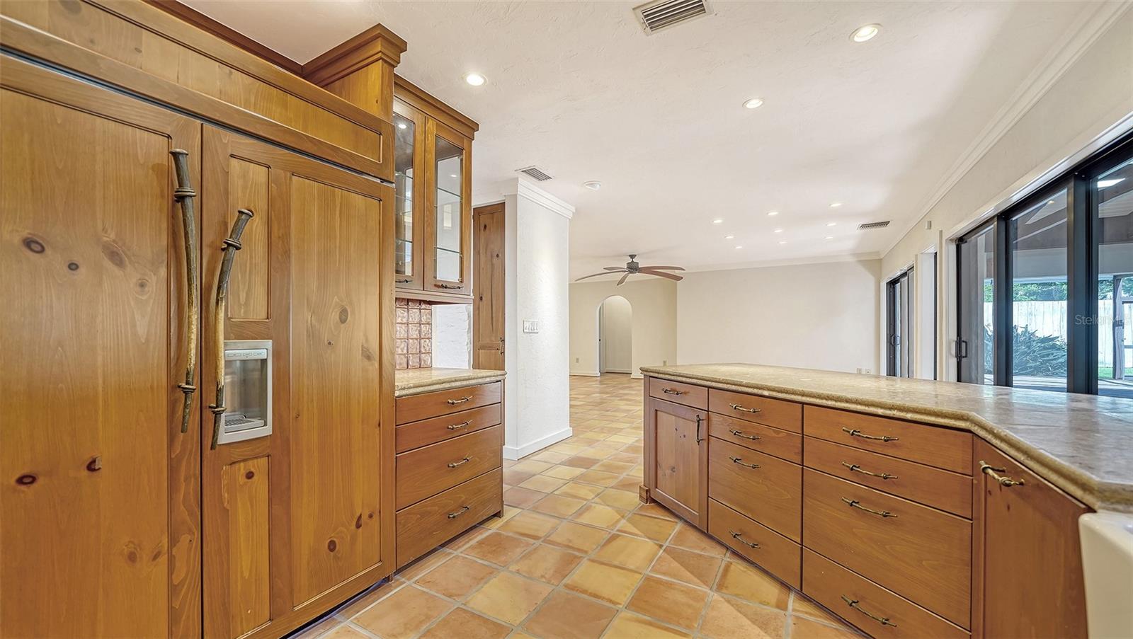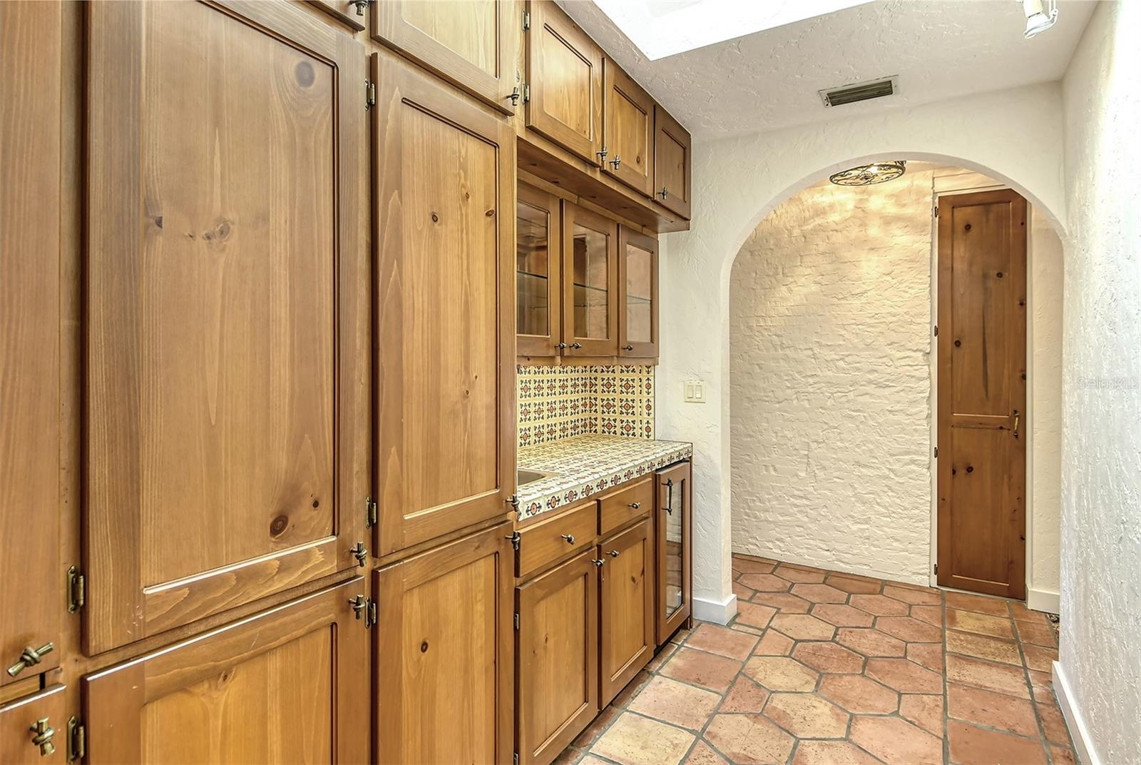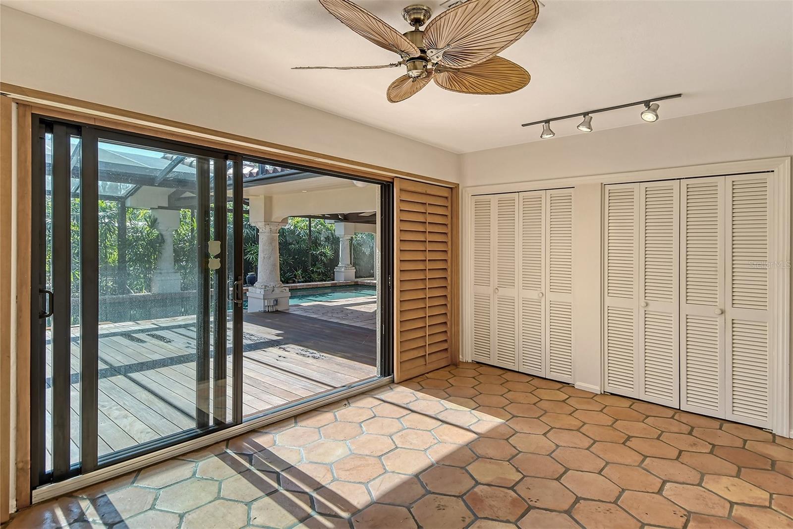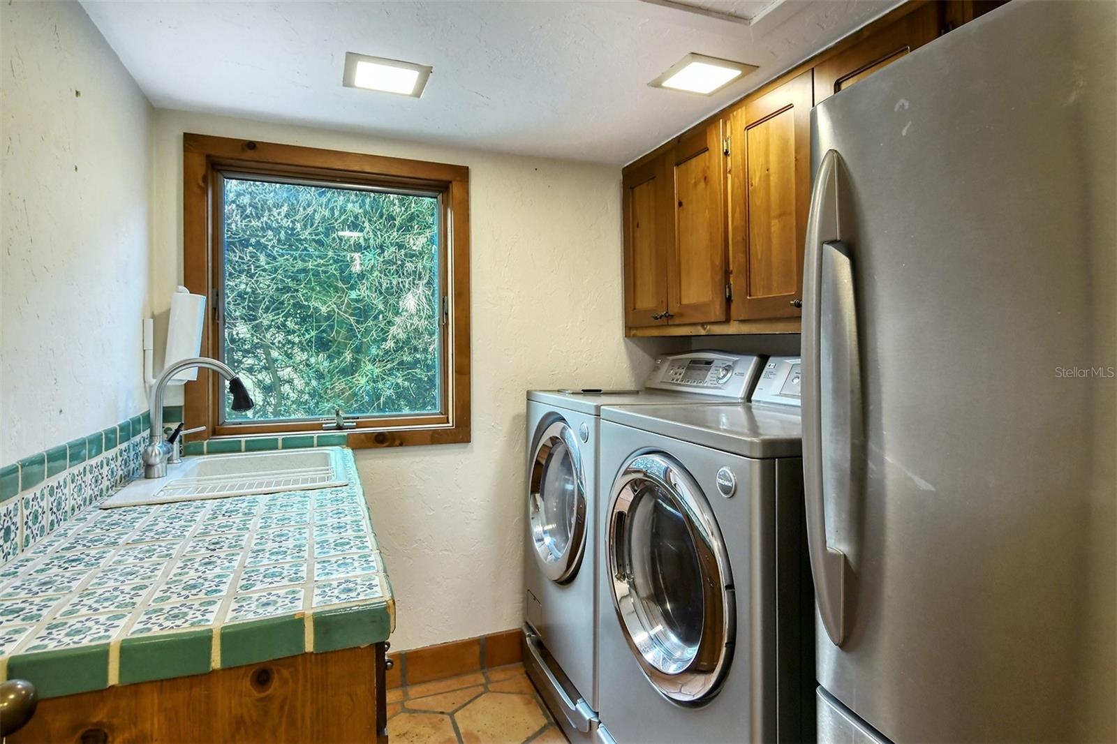 One or more photo(s) has been virtually staged. Nestled on one-third of an acre in the picturesque West of Trail community of Oyster Bay Estates, this captivating one-of-a-kind home combines striking artisan and architectural details with elegant charm and comfort inside and out. The 2,430-SF residence features a clay tile roof, Mexican tile floors, carved stone fireplace mantel and surround, hand-painted tile accents, hand-painted sinks, and hand-made clay sconces and pendants. Natural wood baseboards, cabinetry, ceiling beams and plantation shutters infuse the home with warmth, and Andersen windows protected by decorative stay-in-place shutters provide peace of mind. An enchanting front yard and entry courtyard set the tone for the home's distinctive interior, boasting thoughtfully selected appointments and finishes details throughout. Well-connected main living spaces, including the kitchen, dining, and living areas, and screened lanai are perfect for entertaining. The stunning kitchen includes custom wood cabinetry, fossil marble countertops and high-end appliances, including a Fisher & Paykel dual-fuel range with side-by-side ovens. The kitchen opens to the spacious living and dining areas, where walls of glass transition to an expansive, private outdoor sanctuary surrounded by flourishing tropical landscaping. The lanai features a 40'x14' heated pool, stone columns, generous covered spaces with wood ceilings for dining and entertaining, and an open deck overlooking the tranquil scenery and fenced backyard. A sumptuous private retreat awaits in the lovely owners' suite, featuring a cathedral ceiling with exposed wood beams and trapezoid windows over sliding glass doors to the pool. A charming hallway - with windows and a door to a courtyard garden on one side - flows past two walk-in closets and the master bathroom with dual vanities and a large walk-in shower. Two 16'x11' bedrooms provide comfortable, private quarters for overnight guests. This amazing home is just down the road from the exclusive Field Club, close to shopping and dining, and a few miles to Siesta Beach and downtown Sarasota.