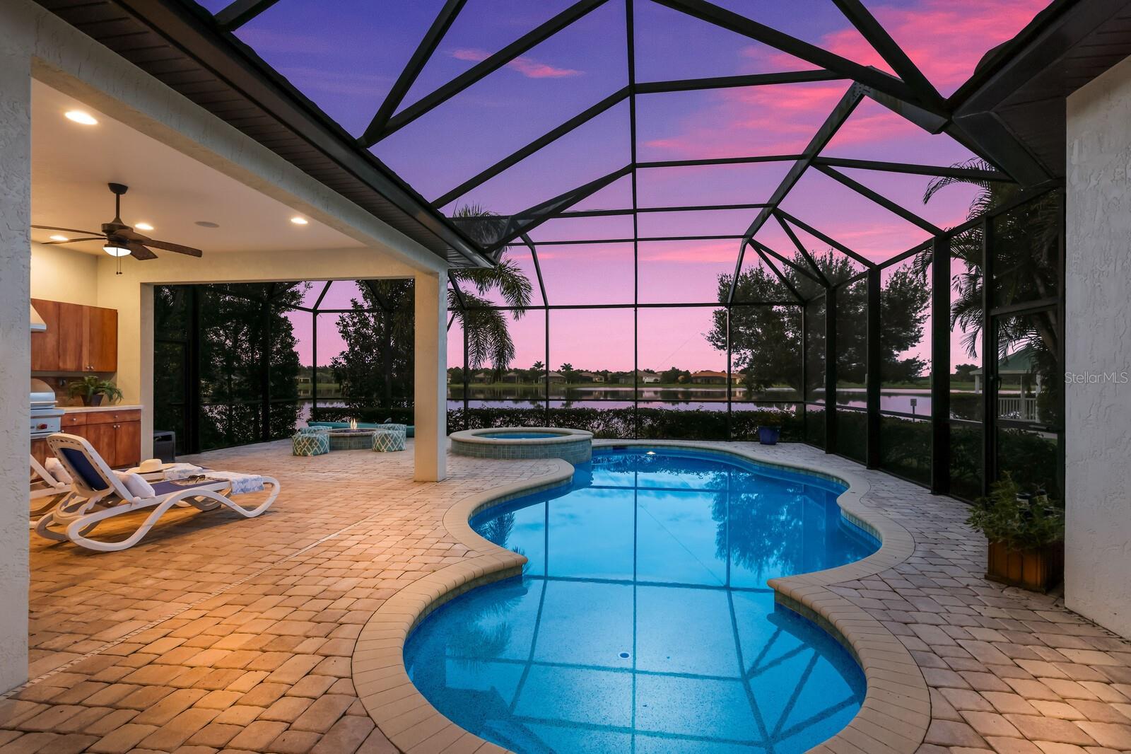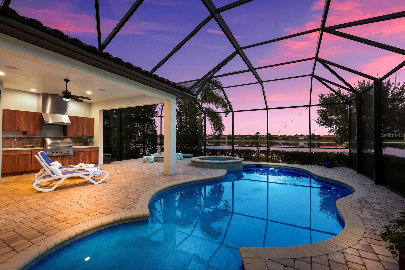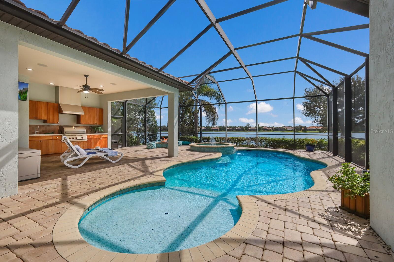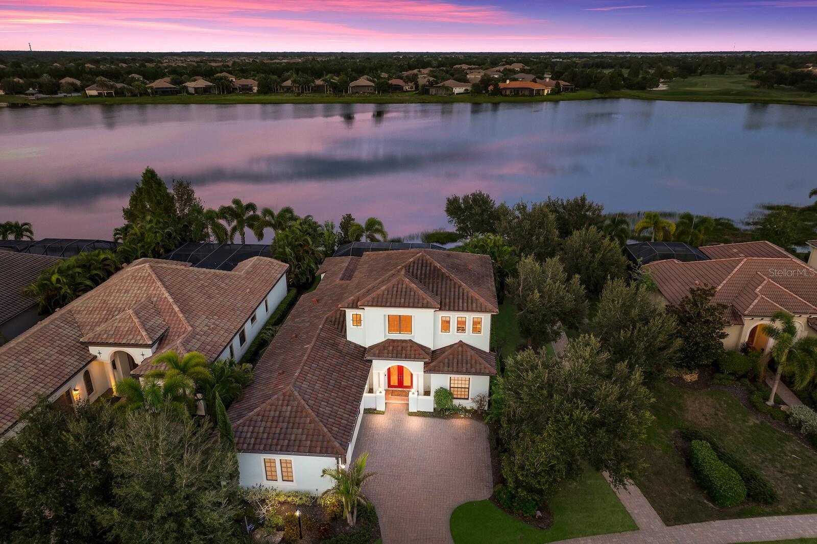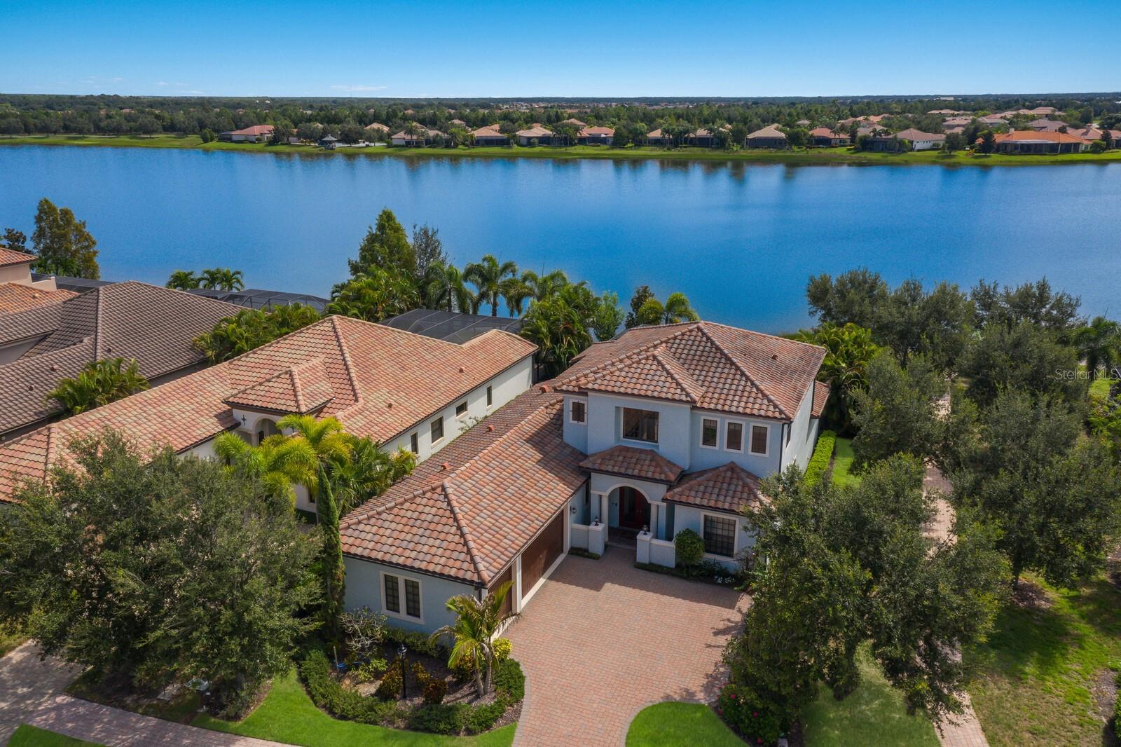 This stunning custom built John Cannon home is located in one of the most desirable sub-divisions located in Country Club East and nationally acclaimed Lakewood Ranch. The enhanced 3400+ square feet 2 story Baylin model features engineered wood throughout, four bedrooms, three and half baths and a side-facing 3- car garage. The home is situated on the largest lake in Country Club East. The fully screened lanai contains a heated saltwater pool and spa, outdoor hot/cold shower, gas firepit, and a well-equipped summer kitchen with a Wolf gas grill, which is great for outdoor entertainment. You will love the magnificent lake view as you enjoy your morning coffee. Inside, a spacious downstairs master bedroom offers a French door to the lanai and a tray ceiling with 2 walk in closets, and an additional custom-built in shoe closet. The master bath features 2 separate vanities, one with a make-up vanity, soaking tub and walk in shower. The "great room" adjoins a kitchen highlighted by wood cabinetry, wolf appliances, subzero refrigerator, granite counters, and a quartz island with a walk-in pantry, dry bar and wine fridge. The dinette area in the kitchen supplements a more formal dining room. A large office is complemented by custom-built in floor to ceiling shelving and cork flooring. A discerning buyer will appreciate the guest downstairs bedroom with ensuite bathroom and walk-in closet. The 2nd floor offers two large bedrooms, full bath, bonus room with built in cabinetry and a balcony that overlooks the beautiful lake view. Other features include impact glass windows and doors, whole house generator, tankless water heater, zoned HVAC systems, in-wall pest tubes, crown molding throughout, solid 8' doors, beam ceiling in the great room, and "pocket" sliding doors. The downstairs laundry room features a built-in ironing board closet, clothing rack and utility sink. The garage has custom built-in cabinetry in addition to an EV charging plug. Country Club East provides residents gated-community living, three community pools, fitness center, community club house, and is close to world-class shopping, Tampa International and Sarasota/Bradenton Airports are conveniently located. Close by you will find ample dining opportunities at Lakewood Ranch Main Street, Waterside Place, and downtown Sarasota. Siesta Key Beach, St. Armands Circle, and Longboat Key are nearby. Room Feature: Linen Closet In Bath (Primary Bedroom).