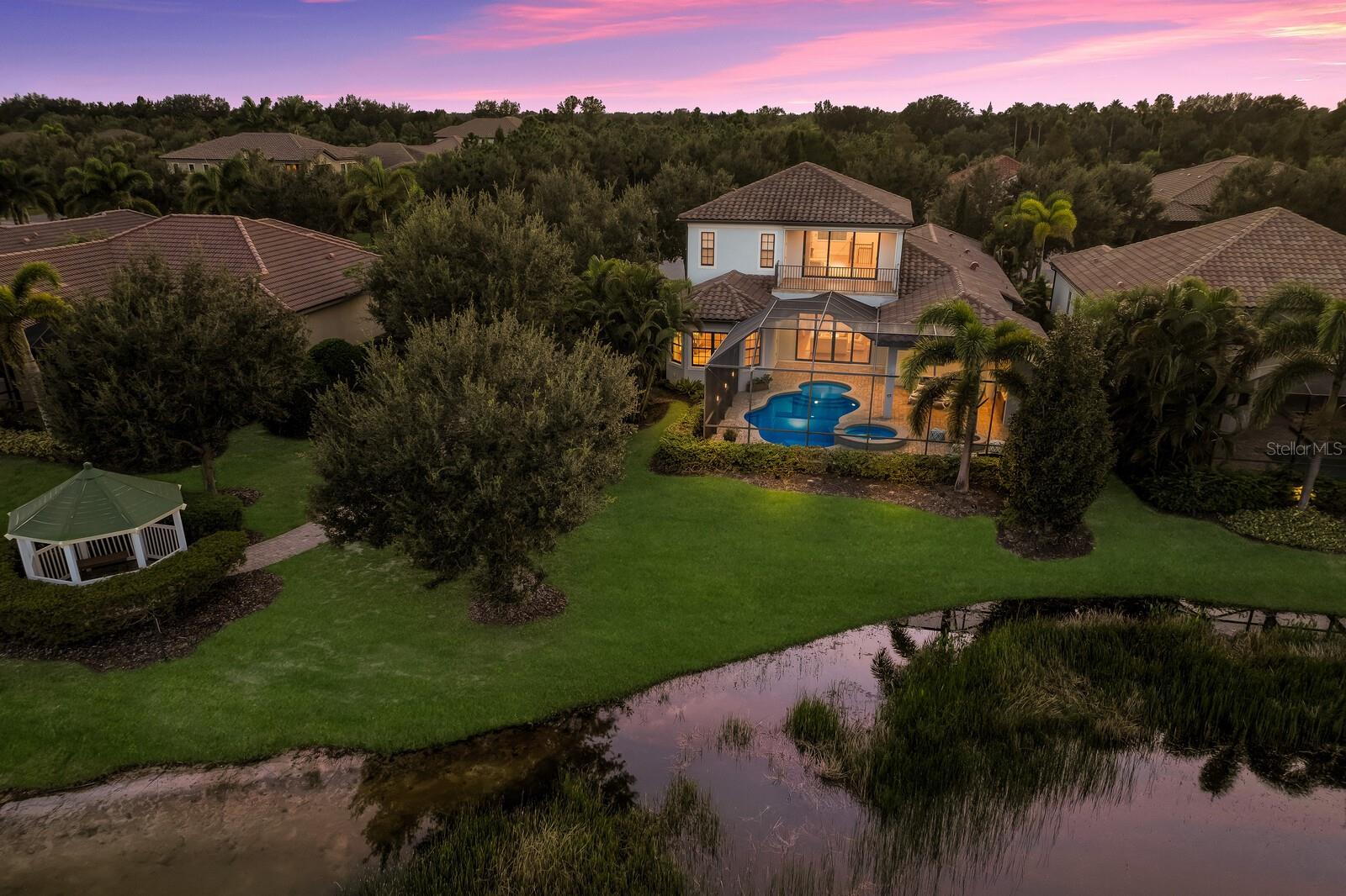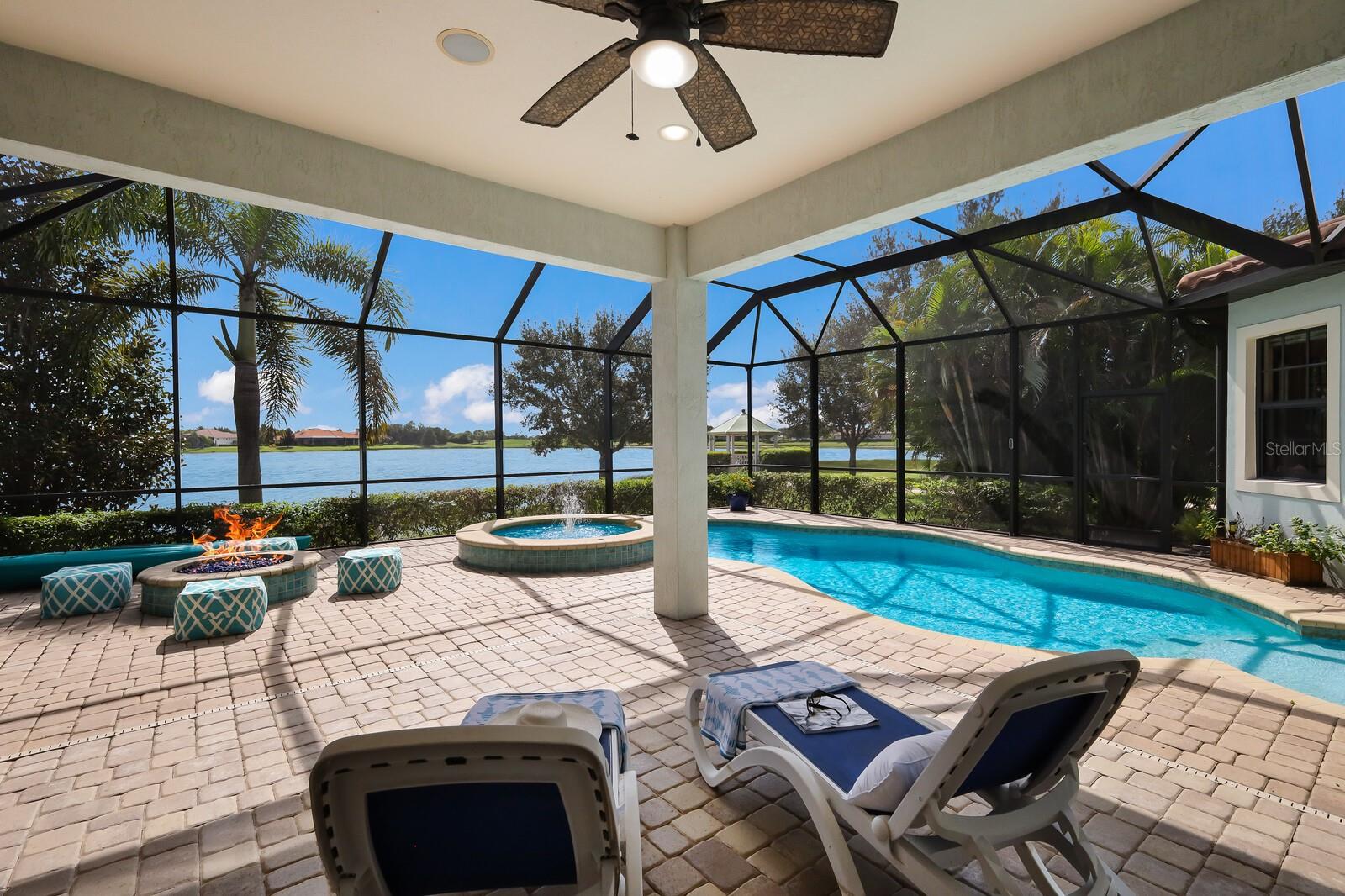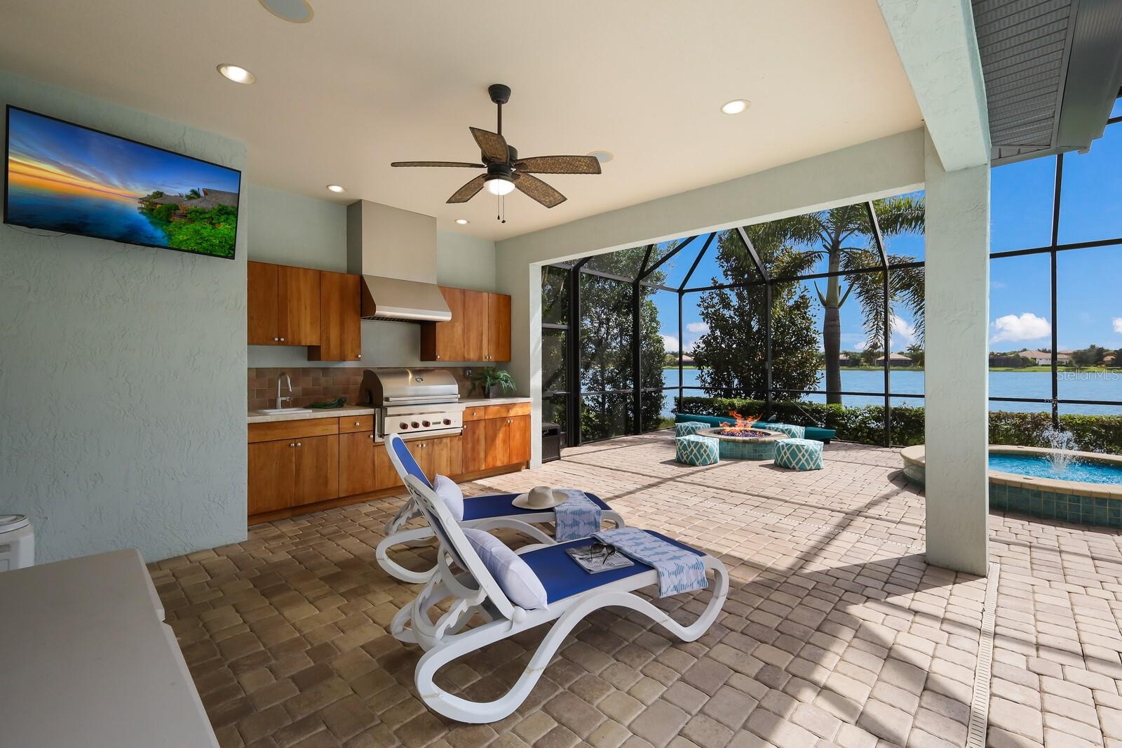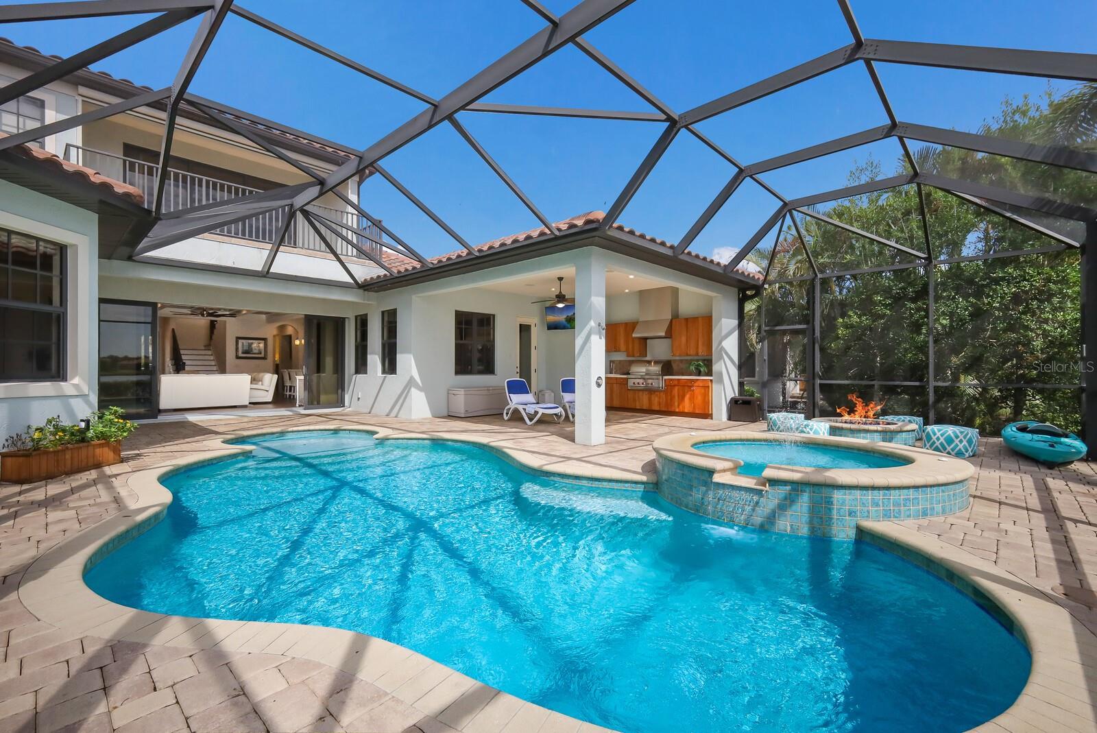 This stunning custom built John Cannon home is located in one of the most desirable sub-divisions located in Country Club East and nationally acclaimed Lakewood Ranch. The enhanced 3400+ square feet 2 story Baylin model features engineered wood throughout, four bedrooms, three and half baths and a side-facing 3- car garage. The home is situated on the largest lake in Country Club East. The fully screened lanai contains a heated saltwater pool and spa, outdoor hot/cold shower, gas firepit, and a well-equipped summer kitchen with a Wolf gas grill, which is great for outdoor entertainment. You will love the magnificent lake view as you enjoy your morning coffee. Inside, a spacious downstairs master bedroom offers a French door to the lanai and a tray ceiling with 2 walk in closets, and an additional custom-built in shoe closet. The master bath features 2 separate vanities, one with a make-up vanity, soaking tub and walk in shower. The "great room" adjoins a kitchen highlighted by wood cabinetry, wolf appliances, subzero refrigerator, granite counters, and a quartz island with a walk-in pantry, dry bar and wine fridge. The dinette area in the kitchen supplements a more formal dining room. A large office is complemented by custom-built in floor to ceiling shelving and cork flooring. A discerning buyer will appreciate the guest downstairs bedroom with ensuite bathroom and walk-in closet. The 2nd floor offers two large bedrooms, full bath, bonus room with built in cabinetry and a balcony that overlooks the beautiful lake view. Other features include impact glass windows and doors, whole house generator, tankless water heater, zoned HVAC systems, in-wall pest tubes, crown molding throughout, solid 8' doors, beam ceiling in the great room, and "pocket" sliding doors. The downstairs laundry room features a built-in ironing board closet, clothing rack and utility sink. The garage has custom built-in cabinetry in addition to an EV charging plug. Country Club East provides residents gated-community living, three community pools, fitness center, community club house, and is close to world-class shopping, Tampa International and Sarasota/Bradenton Airports are conveniently located. Close by you will find ample dining opportunities at Lakewood Ranch Main Street, Waterside Place, and downtown Sarasota. Siesta Key Beach, St. Armands Circle, and Longboat Key are nearby. Room Feature: Linen Closet In Bath (Primary Bedroom).