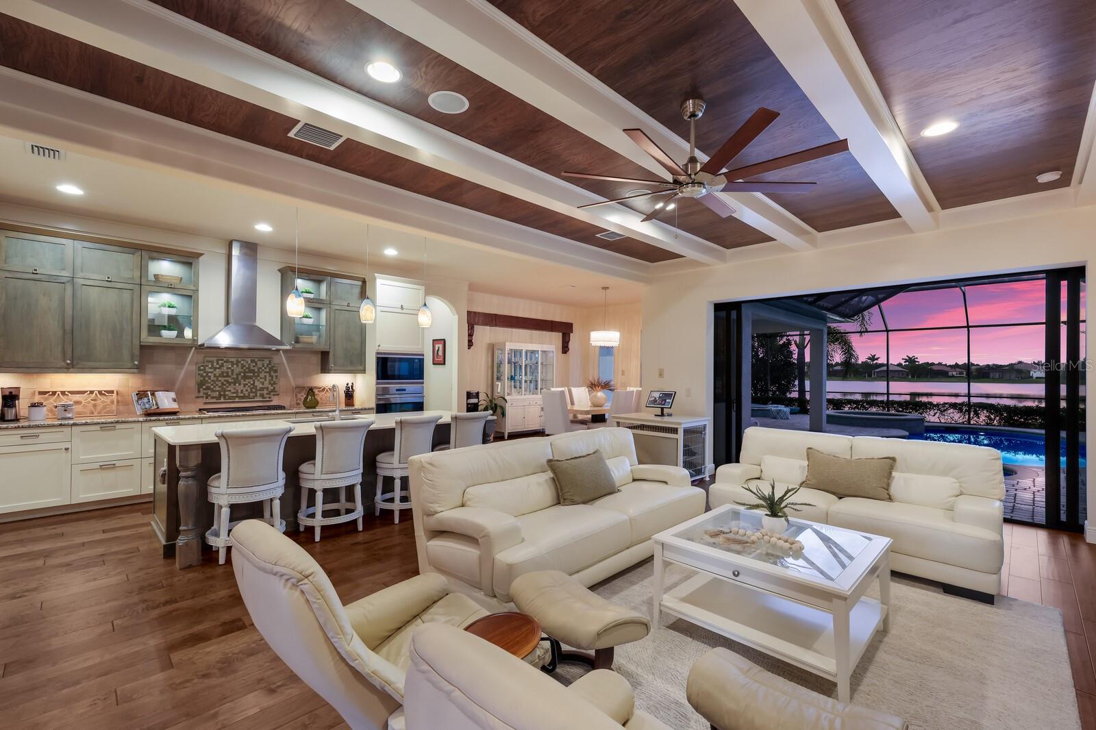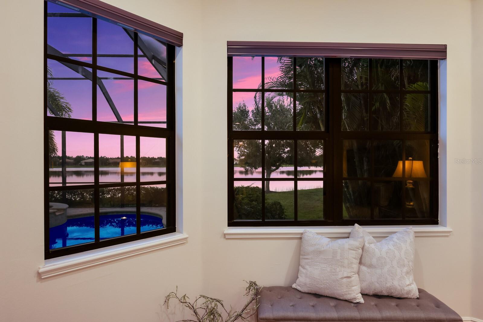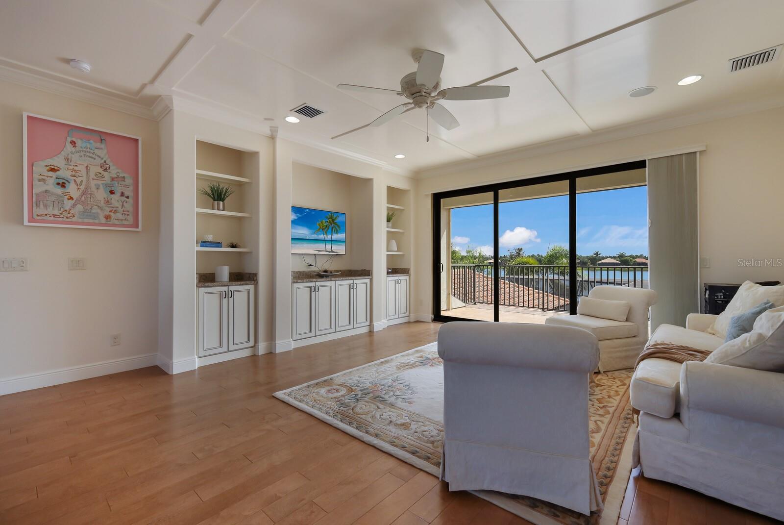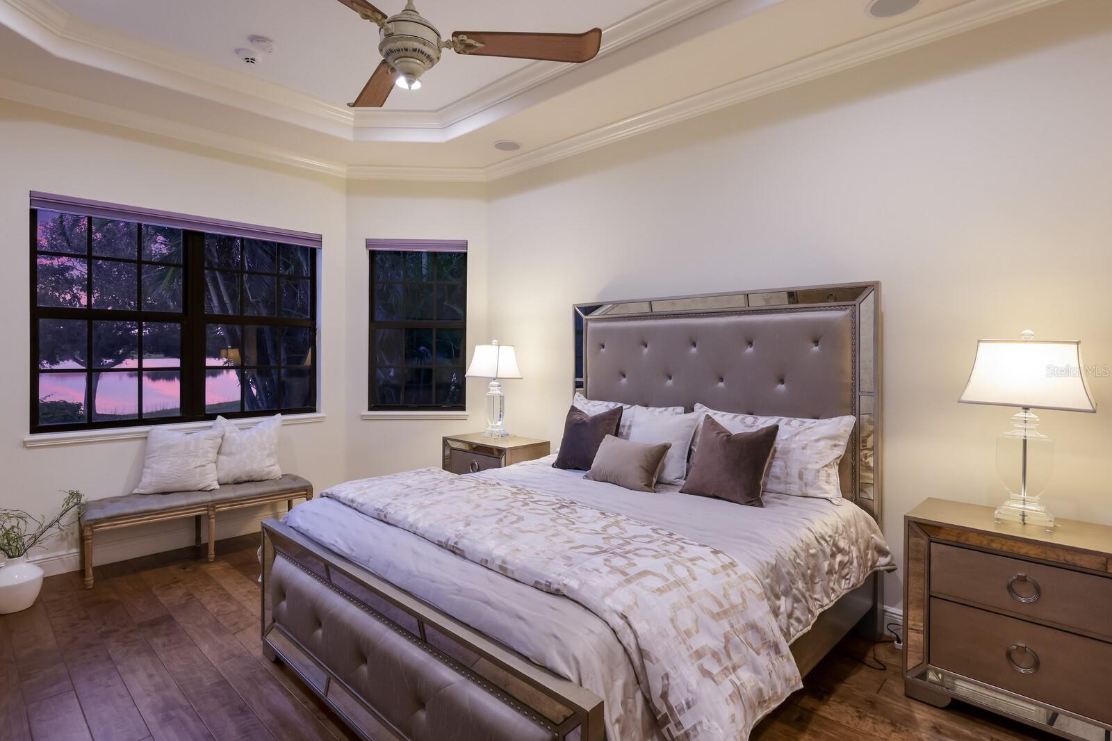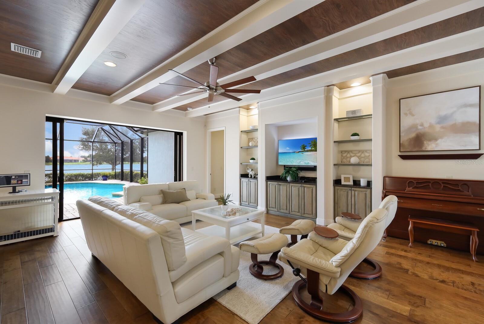 This stunning custom built John Cannon home is located in one of the most desirable sub-divisions located in Country Club East and nationally acclaimed Lakewood Ranch. The enhanced 3400+ square feet 2 story Baylin model features engineered wood throughout, four bedrooms, three and half baths and a side-facing 3- car garage. The home is situated on the largest lake in Country Club East. The fully screened lanai contains a heated saltwater pool and spa, outdoor hot/cold shower, gas firepit, and a well-equipped summer kitchen with a Wolf gas grill, which is great for outdoor entertainment. You will love the magnificent lake view as you enjoy your morning coffee. Inside, a spacious downstairs master bedroom offers a French door to the lanai and a tray ceiling with 2 walk in closets, and an additional custom-built in shoe closet. The master bath features 2 separate vanities, one with a make-up vanity, soaking tub and walk in shower. The "great room" adjoins a kitchen highlighted by wood cabinetry, wolf appliances, subzero refrigerator, granite counters, and a quartz island with a walk-in pantry, dry bar and wine fridge. The dinette area in the kitchen supplements a more formal dining room. A large office is complemented by custom-built in floor to ceiling shelving and cork flooring. A discerning buyer will appreciate the guest downstairs bedroom with ensuite bathroom and walk-in closet. The 2nd floor offers two large bedrooms, full bath, bonus room with built in cabinetry and a balcony that overlooks the beautiful lake view. Other features include impact glass windows and doors, whole house generator, tankless water heater, zoned HVAC systems, in-wall pest tubes, crown molding throughout, solid 8' doors, beam ceiling in the great room, and "pocket" sliding doors. The downstairs laundry room features a built-in ironing board closet, clothing rack and utility sink. The garage has custom built-in cabinetry in addition to an EV charging plug. Country Club East provides residents gated-community living, three community pools, fitness center, community club house, and is close to world-class shopping, Tampa International and Sarasota/Bradenton Airports are conveniently located. Close by you will find ample dining opportunities at Lakewood Ranch Main Street, Waterside Place, and downtown Sarasota. Siesta Key Beach, St. Armands Circle, and Longboat Key are nearby. Room Feature: Linen Closet In Bath (Primary Bedroom).
