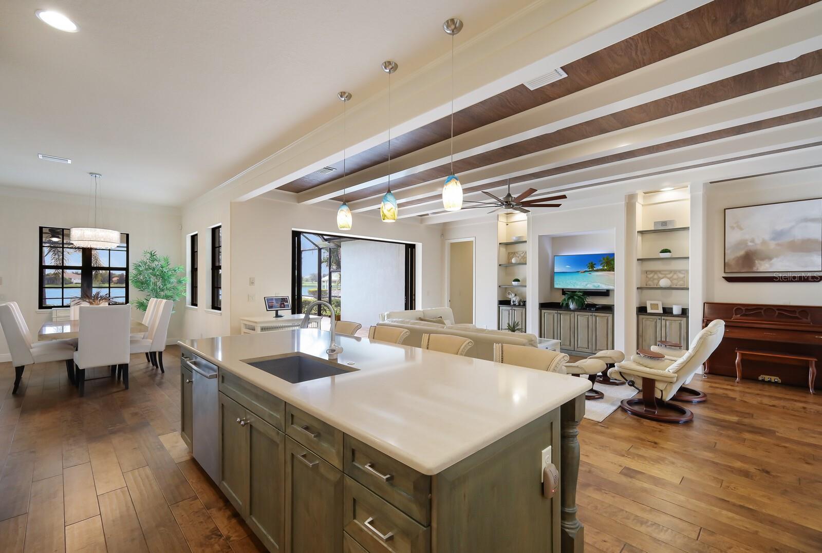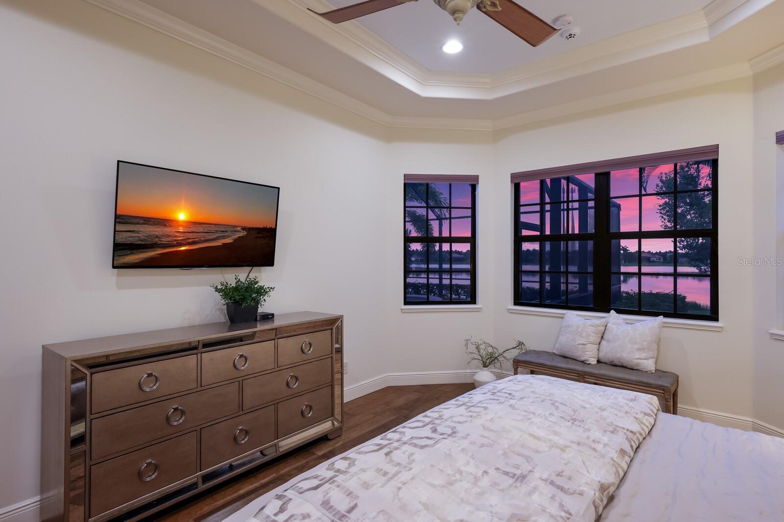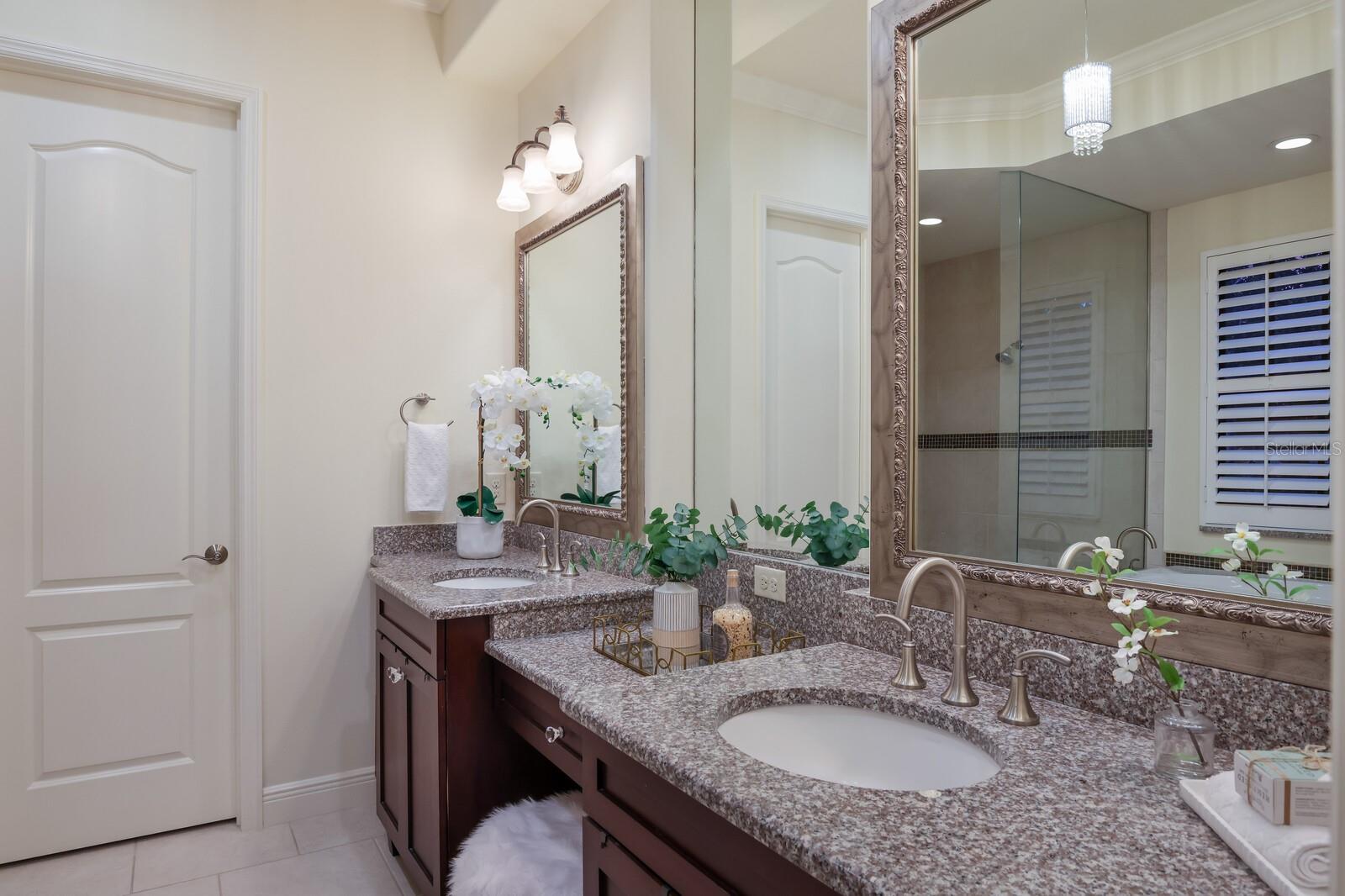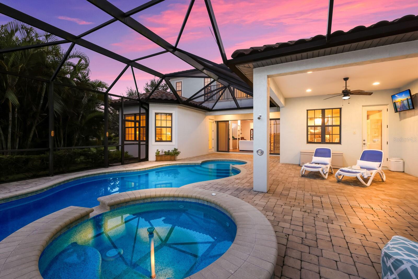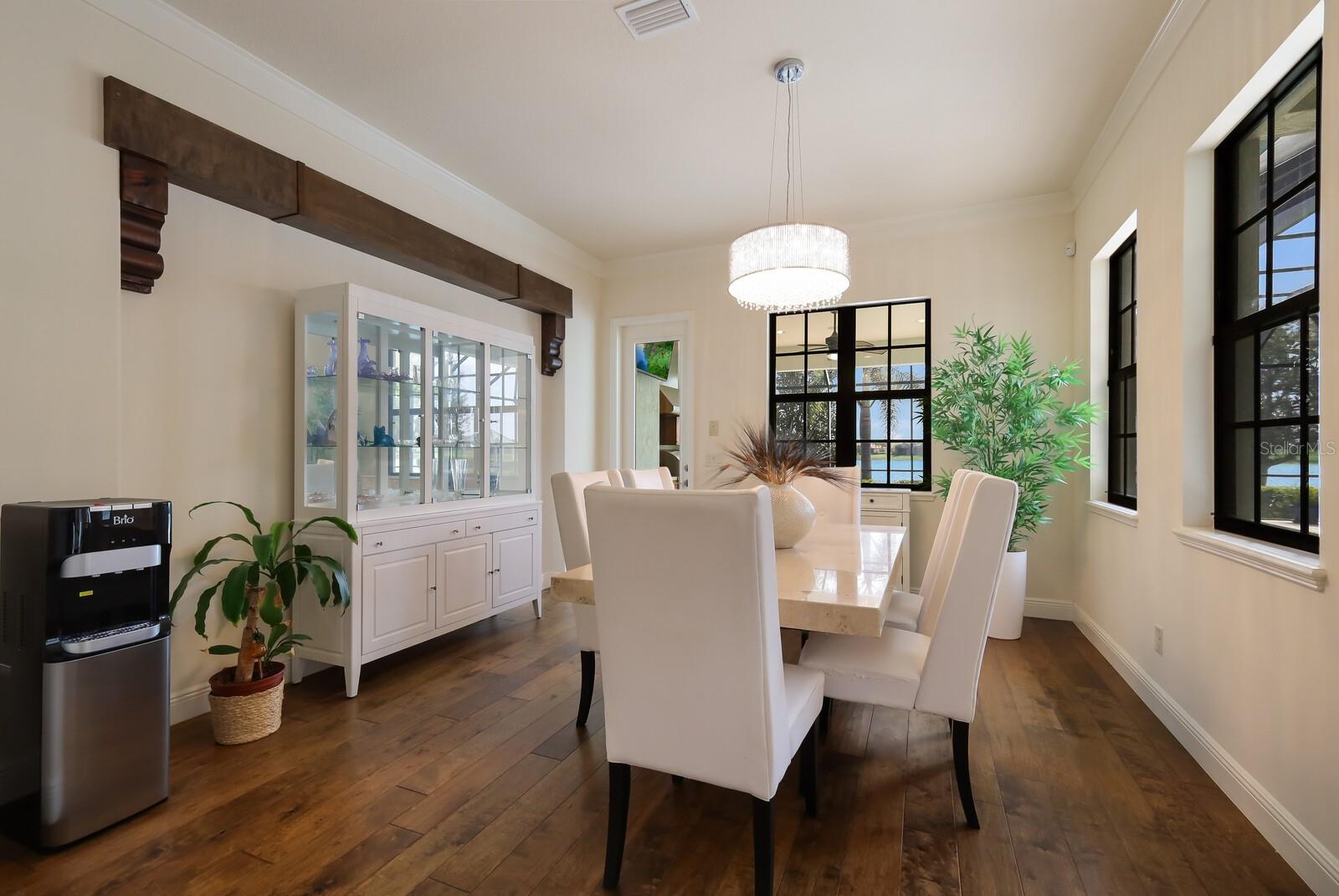This stunning custom built John Cannon home is located in one of the most desirable sub-divisions located in Country Club East and nationally acclaimed Lakewood Ranch. The enhanced 3400+ square feet 2 story Baylin model features engineered wood throughout, four bedrooms, three and half baths and a side-facing 3- car garage. The home is situated on the largest lake in Country Club East. The fully screened lanai contains a heated saltwater pool and spa, outdoor hot/cold shower, gas firepit, and a well-equipped summer kitchen with a Wolf gas grill, which is great for outdoor entertainment. You will love the magnificent lake view as you enjoy your morning coffee. Inside, a spacious downstairs master bedroom offers a French door to the lanai and a tray ceiling with 2 walk in closets, and an additional custom-built in shoe closet. The master bath features 2 separate vanities, one with a make-up vanity, soaking tub and walk in shower. The "great room" adjoins a kitchen highlighted by wood cabinetry, wolf appliances, subzero refrigerator, granite counters, and a quartz island with a walk-in pantry, dry bar and wine fridge. The dinette area in the kitchen supplements a more formal dining room. A large office is complemented by custom-built in floor to ceiling shelving and cork flooring. A discerning buyer will appreciate the guest downstairs bedroom with ensuite bathroom and walk-in closet. The 2nd floor offers two large bedrooms, full bath, bonus room with built in cabinetry and a balcony that overlooks the beautiful lake view. Other features include impact glass windows and doors, whole house generator, tankless water heater, zoned HVAC systems, in-wall pest tubes, crown molding throughout, solid 8' doors, beam ceiling in the great room, and "pocket" sliding doors. The downstairs laundry room features a built-in ironing board closet, clothing rack and utility sink. The garage has custom built-in cabinetry in addition to an EV charging plug. Country Club East provides residents gated-community living, three community pools, fitness center, community club house, and is close to world-class shopping, Tampa International and Sarasota/Bradenton Airports are conveniently located. Close by you will find ample dining opportunities at Lakewood Ranch Main Street, Waterside Place, and downtown Sarasota. Siesta Key Beach, St. Armands Circle, and Longboat Key are nearby. Room Feature: Linen Closet In Bath (Primary Bedroom).
