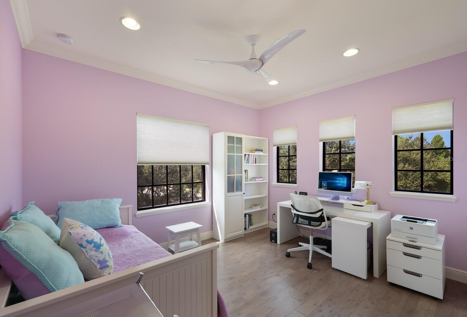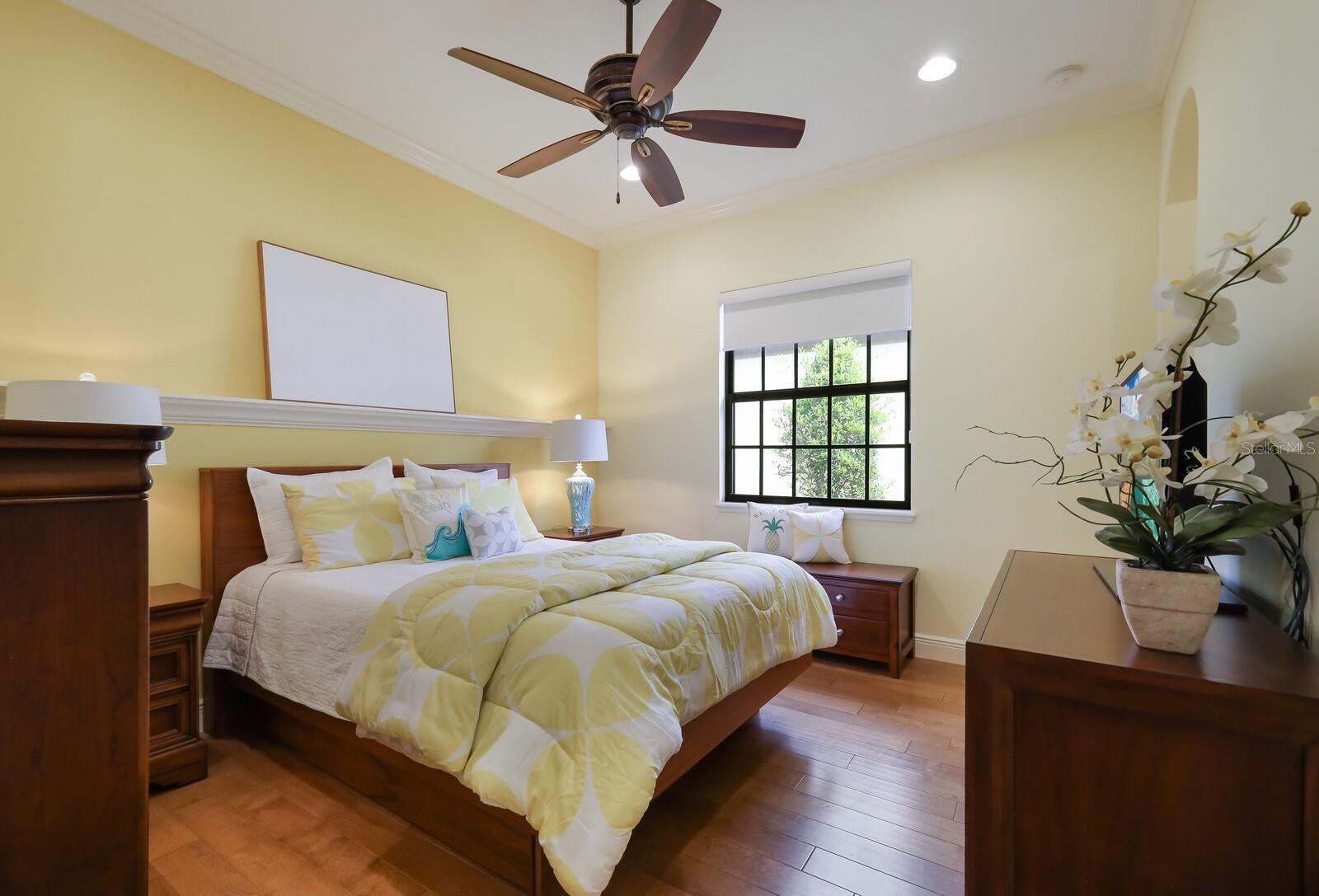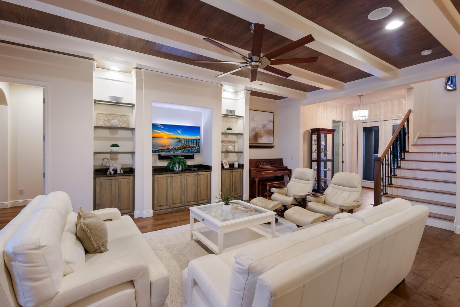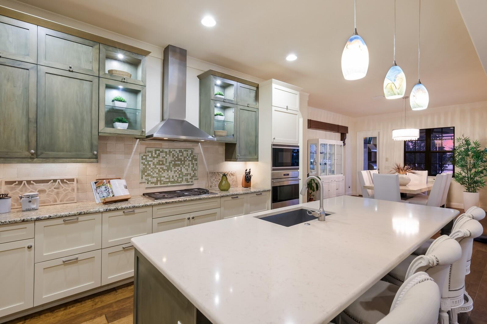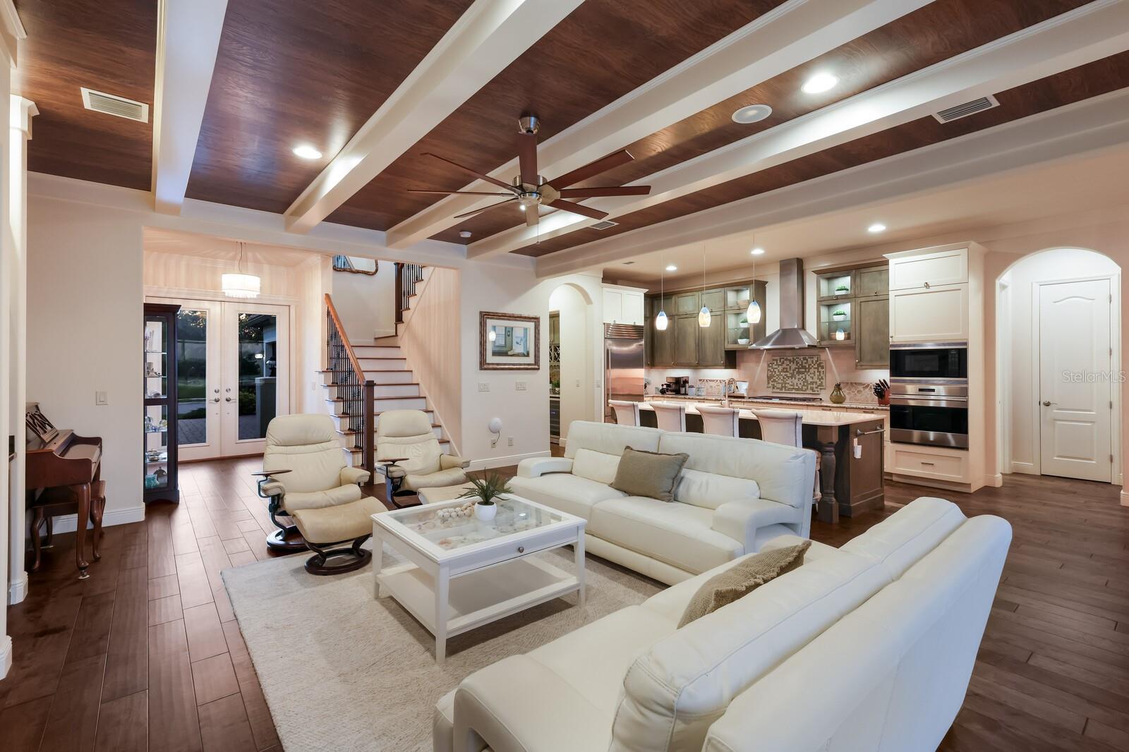 This stunning custom built John Cannon home is located in one of the most desirable sub-divisions located in Country Club East and nationally acclaimed Lakewood Ranch. The enhanced 3400+ square feet 2 story Baylin model features engineered wood throughout, four bedrooms, three and half baths and a side-facing 3- car garage. The home is situated on the largest lake in Country Club East. The fully screened lanai contains a heated saltwater pool and spa, outdoor hot/cold shower, gas firepit, and a well-equipped summer kitchen with a Wolf gas grill, which is great for outdoor entertainment. You will love the magnificent lake view as you enjoy your morning coffee. Inside, a spacious downstairs master bedroom offers a French door to the lanai and a tray ceiling with 2 walk in closets, and an additional custom-built in shoe closet. The master bath features 2 separate vanities, one with a make-up vanity, soaking tub and walk in shower. The "great room" adjoins a kitchen highlighted by wood cabinetry, wolf appliances, subzero refrigerator, granite counters, and a quartz island with a walk-in pantry, dry bar and wine fridge. The dinette area in the kitchen supplements a more formal dining room. A large office is complemented by custom-built in floor to ceiling shelving and cork flooring. A discerning buyer will appreciate the guest downstairs bedroom with ensuite bathroom and walk-in closet. The 2nd floor offers two large bedrooms, full bath, bonus room with built in cabinetry and a balcony that overlooks the beautiful lake view. Other features include impact glass windows and doors, whole house generator, tankless water heater, zoned HVAC systems, in-wall pest tubes, crown molding throughout, solid 8' doors, beam ceiling in the great room, and "pocket" sliding doors. The downstairs laundry room features a built-in ironing board closet, clothing rack and utility sink. The garage has custom built-in cabinetry in addition to an EV charging plug. Country Club East provides residents gated-community living, three community pools, fitness center, community club house, and is close to world-class shopping, Tampa International and Sarasota/Bradenton Airports are conveniently located. Close by you will find ample dining opportunities at Lakewood Ranch Main Street, Waterside Place, and downtown Sarasota. Siesta Key Beach, St. Armands Circle, and Longboat Key are nearby. Room Feature: Linen Closet In Bath (Primary Bedroom).