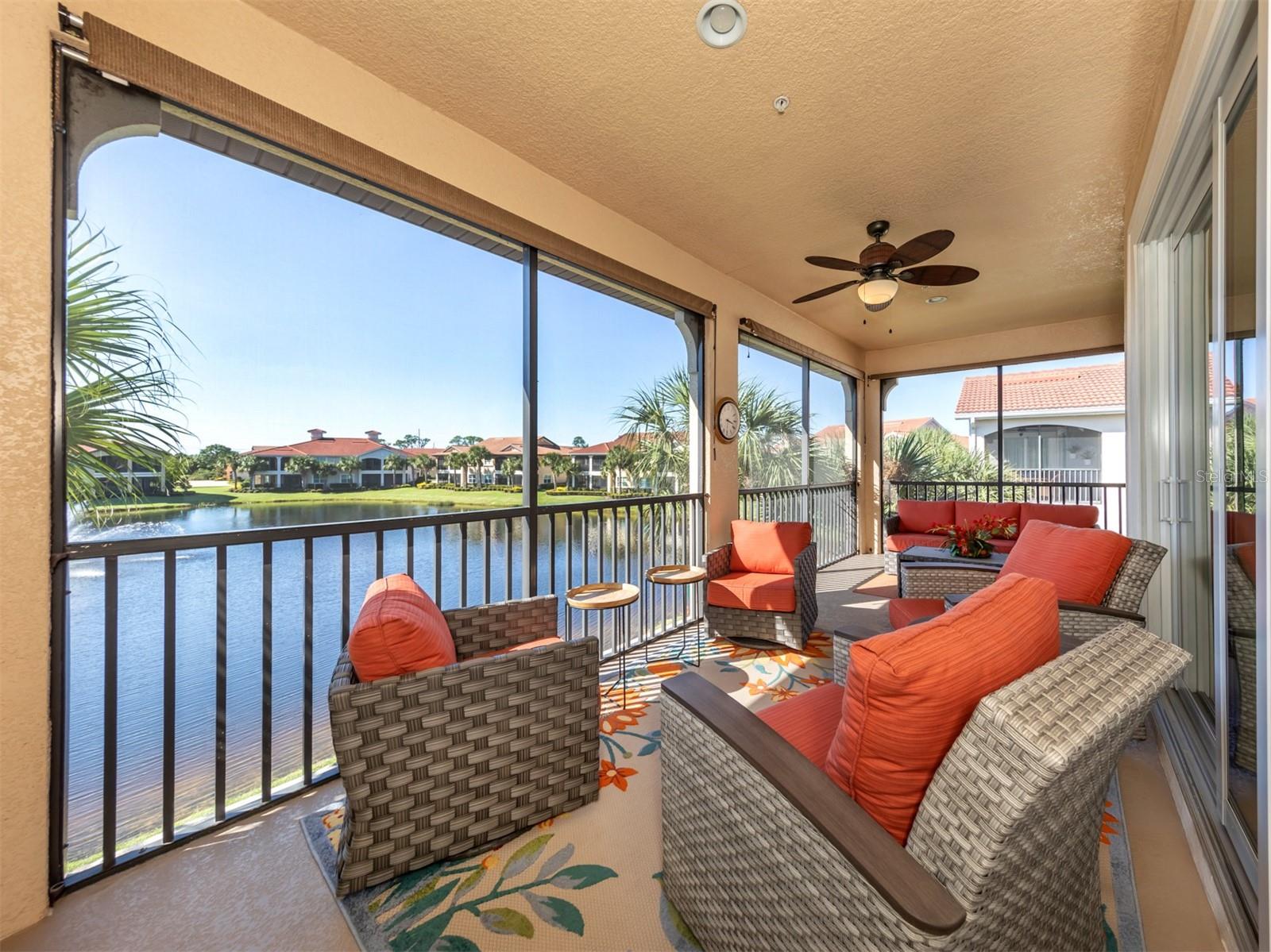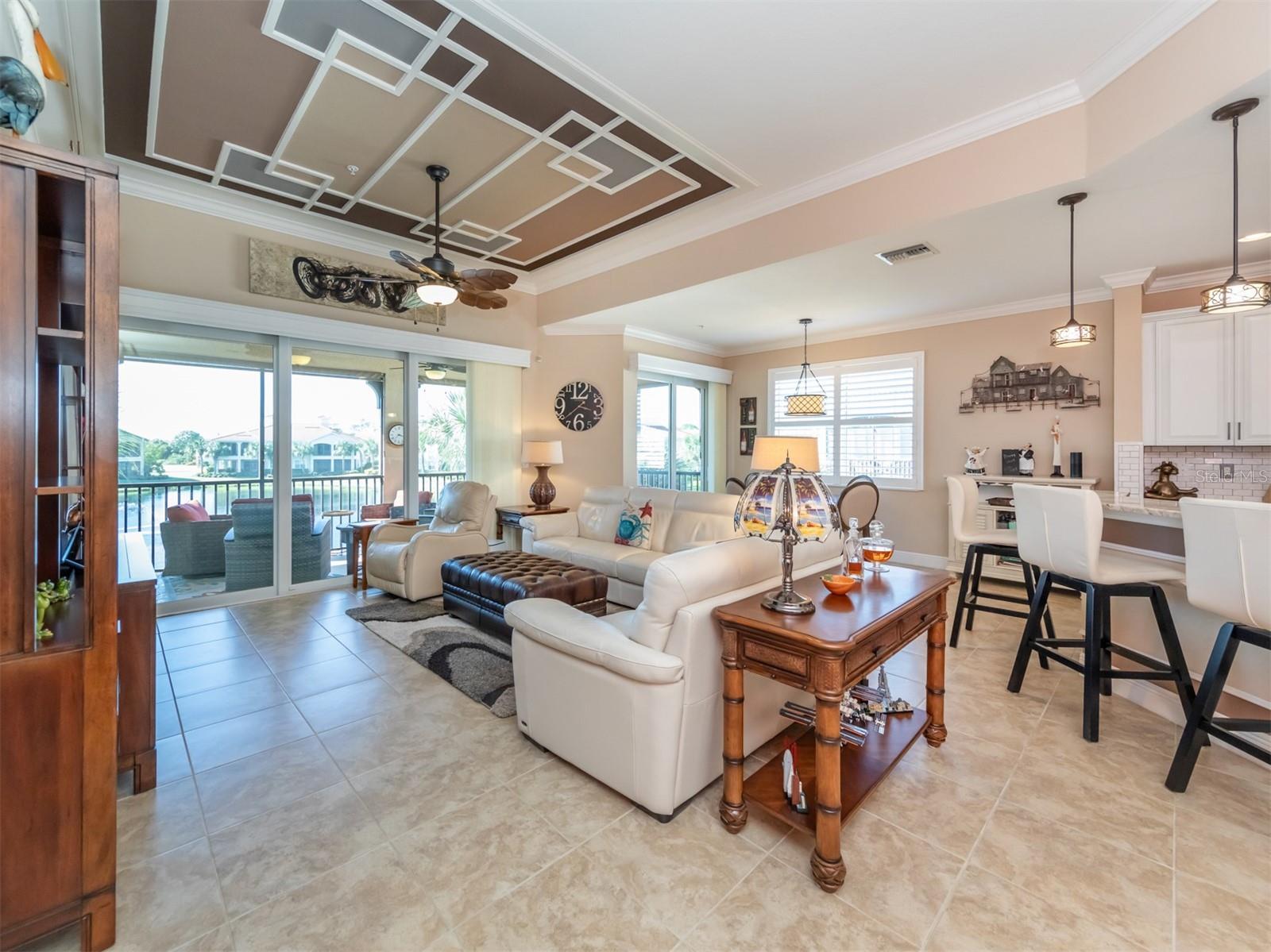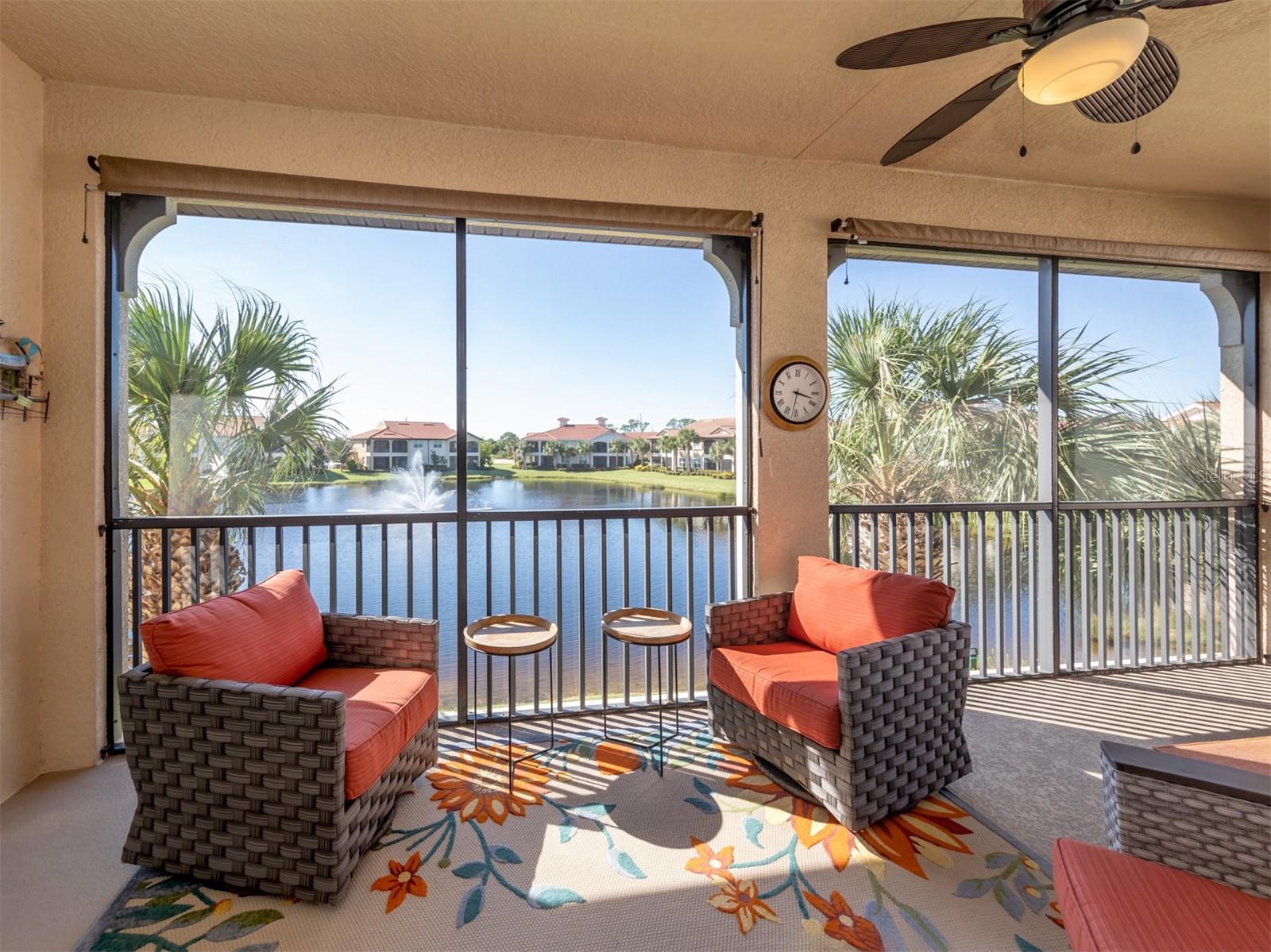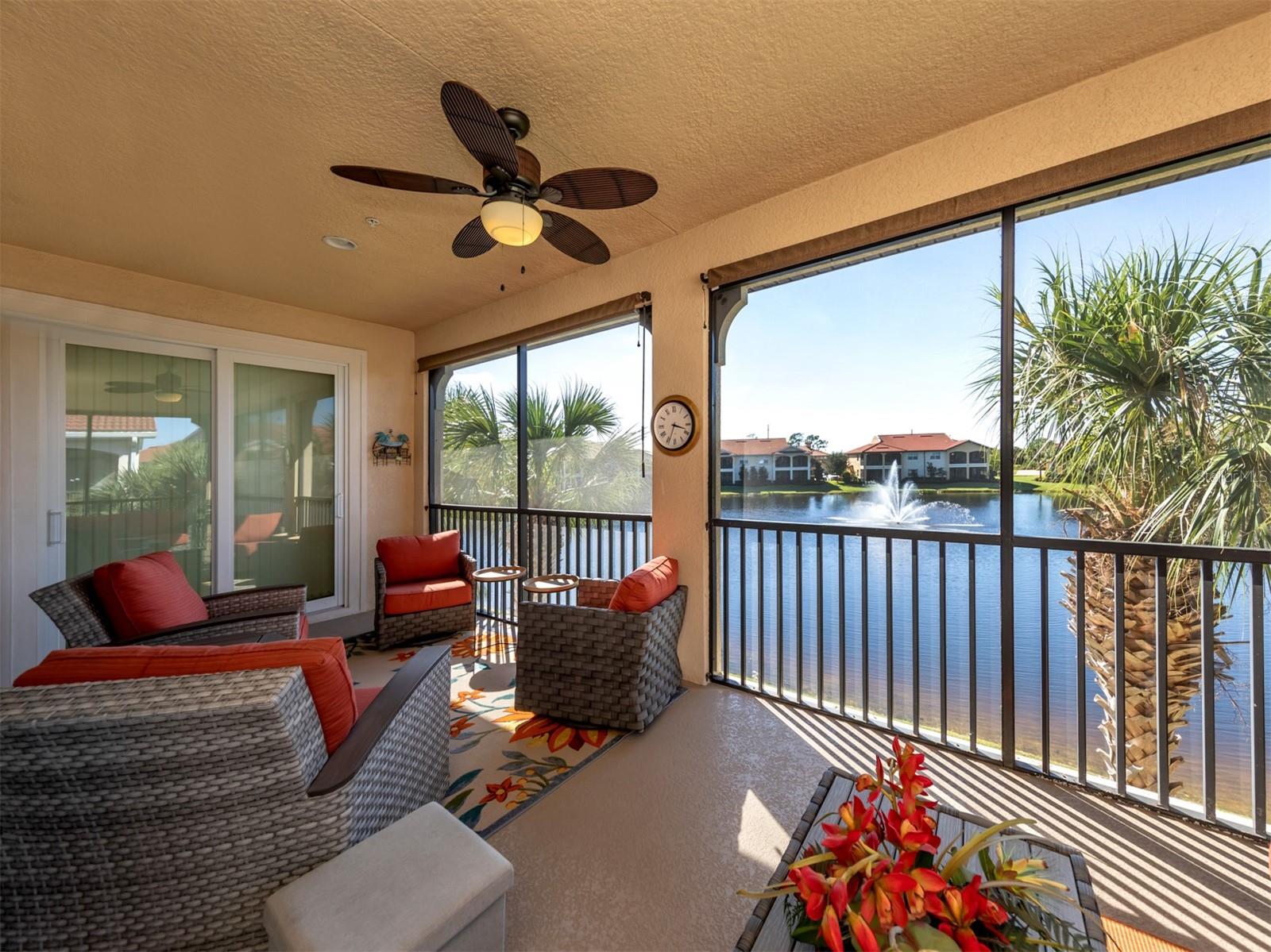 Are you concerned about rising HOA fees, insurance premiums, and interest rates? Look no further! This beautiful 2nd floor carriage home/condo, with an ELEVATOR, is located within the gates of the desirable Venetian Golf & River Club. These original owners, have updated and upgraded since closing in 2014 with a recent renovation to the kitchen cabinets, counter tops, and appliances. This unit comes equipped with impact glass windows and hurricane sliders to add that peace of mind when storm season rolls in. You'll have all the updated touches to include beautiful plantation shutters and window treatment throughout complimented by carpet in all beds, tile through the halls, baths, laundry room, and main living area, and engineered hardwood in the den/office. This lovely 3 bed/2 bath unit offers beautiful, custom moldings throughout and lives very comfortably offering nearly 2400 sq ft. Overlooking a pond, water spray feature, and providing stunning western setting sunsets, you will surely embrace living your best life living here! A topic on most buyers minds is the strength and costs of the HOA's. This HOA has solid financials, and NO HOA DUES FOR 2024! And, this seller is offering SPECIAL FINANCING, if needed. For nature lovers, you will enjoy the serene 70-acre nature park snuggled along the Myakka River. Additional amenities include a full restaurant and bar, fitness center, lap pool, resort-style pool, outdoor Tiki Bar at poolside, six Tru-Har tennis courts (and a competitive tennis league), and recently added pickle ball courts. Golf membership to Venetian Golf, owned by the prestigious Heritage Group, is optional. Beaches and shopping are just minutes away. This is a true lock and go so why not call me today to schedule your private tour!