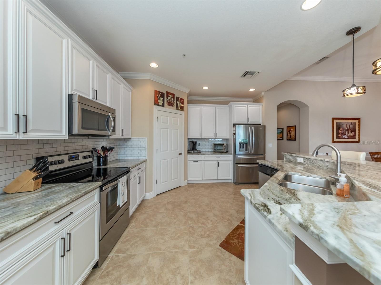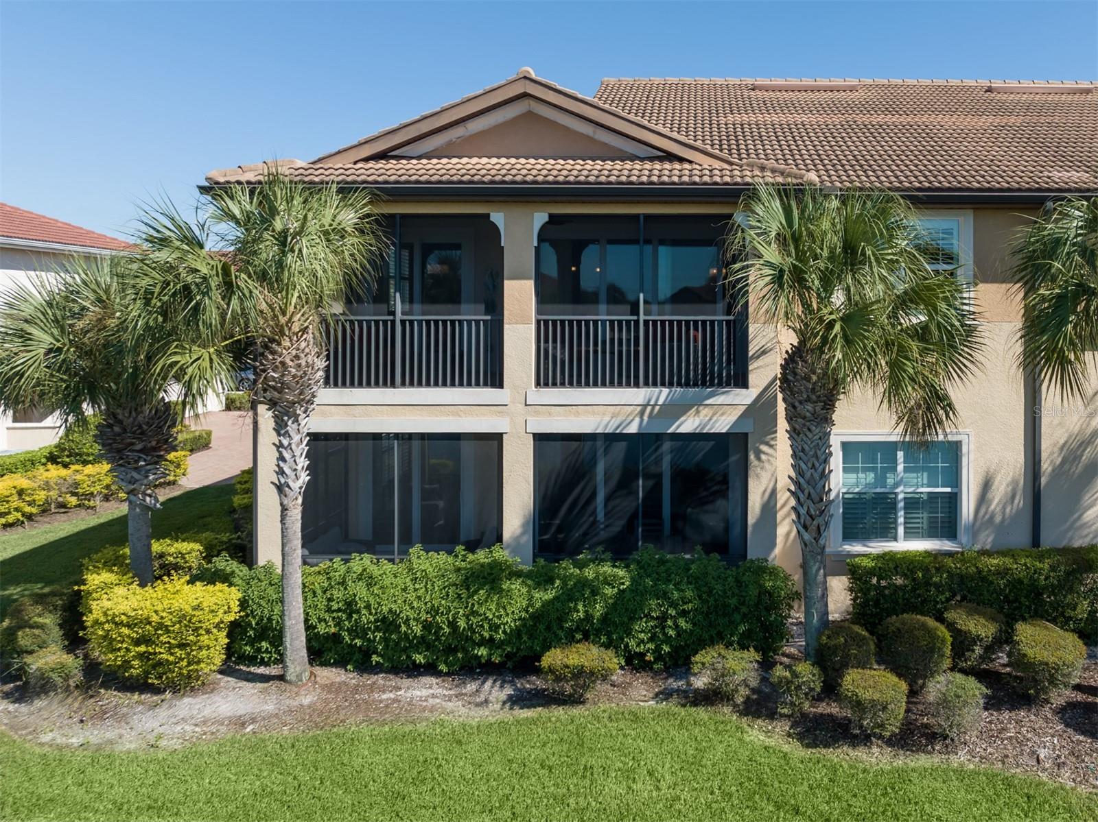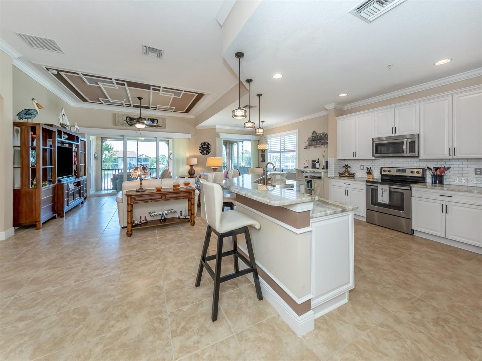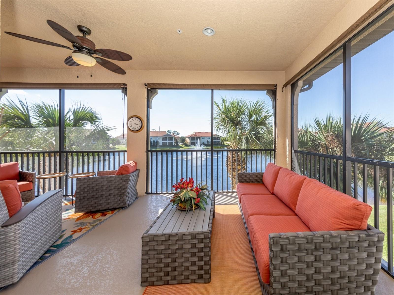Are you concerned about rising HOA fees, insurance premiums, and interest rates? Look no further! This beautiful 2nd floor carriage home/condo, with an ELEVATOR, is located within the gates of the desirable Venetian Golf & River Club. These original owners, have updated and upgraded since closing in 2014 with a recent renovation to the kitchen cabinets, counter tops, and appliances. This unit comes equipped with impact glass windows and hurricane sliders to add that peace of mind when storm season rolls in. You'll have all the updated touches to include beautiful plantation shutters and window treatment throughout complimented by carpet in all beds, tile through the halls, baths, laundry room, and main living area, and engineered hardwood in the den/office. This lovely 3 bed/2 bath unit offers beautiful, custom moldings throughout and lives very comfortably offering nearly 2400 sq ft. Overlooking a pond, water spray feature, and providing stunning western setting sunsets, you will surely embrace living your best life living here! A topic on most buyers minds is the strength and costs of the HOA's. This HOA has solid financials, and NO HOA DUES FOR 2024! And, this seller is offering SPECIAL FINANCING, if needed. For nature lovers, you will enjoy the serene 70-acre nature park snuggled along the Myakka River. Additional amenities include a full restaurant and bar, fitness center, lap pool, resort-style pool, outdoor Tiki Bar at poolside, six Tru-Har tennis courts (and a competitive tennis league), and recently added pickle ball courts. Golf membership to Venetian Golf, owned by the prestigious Heritage Group, is optional. Beaches and shopping are just minutes away. This is a true lock and go so why not call me today to schedule your private tour!