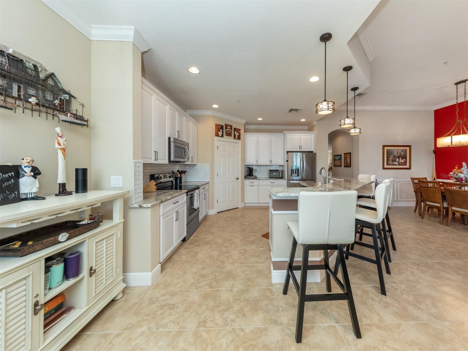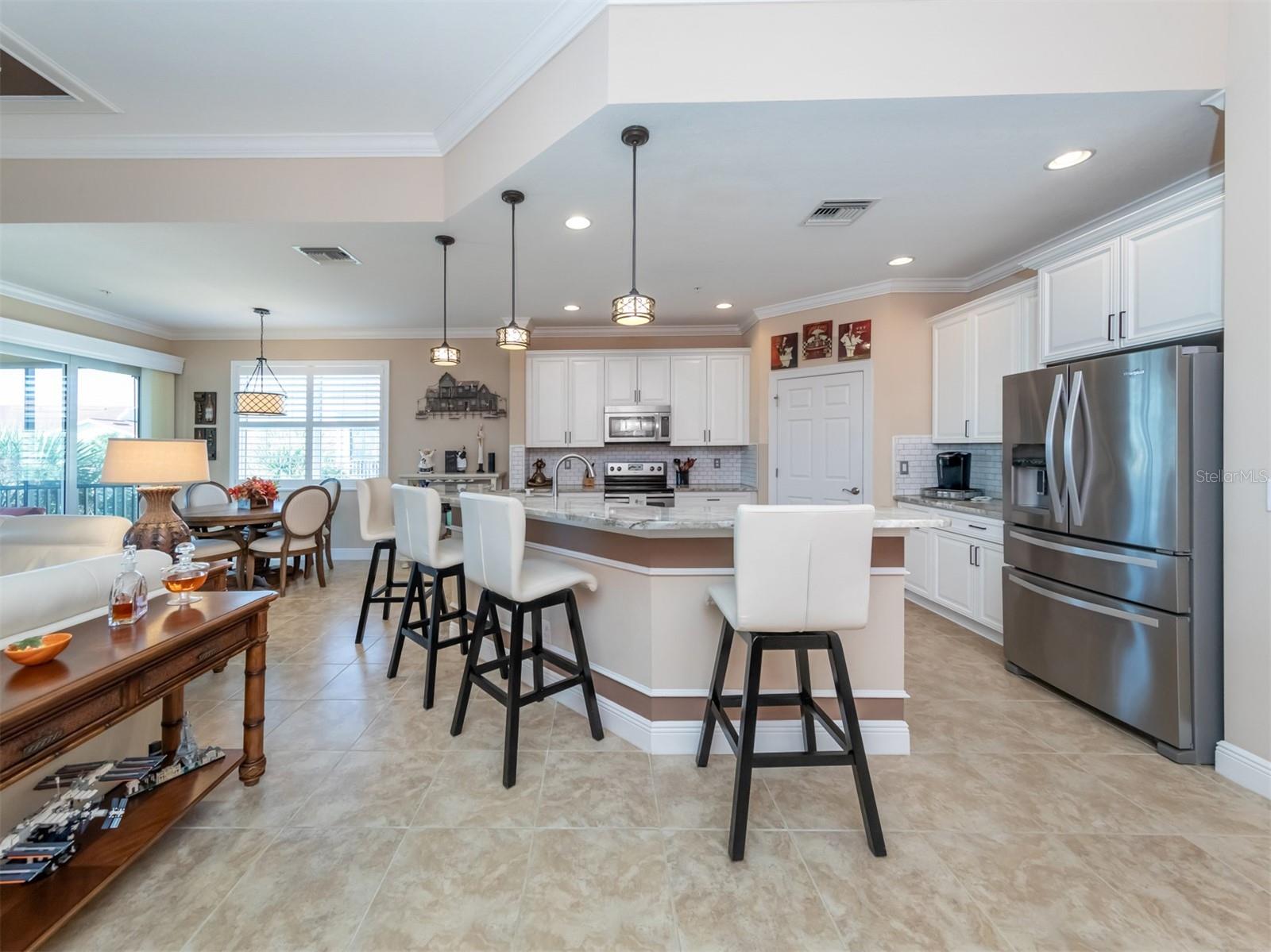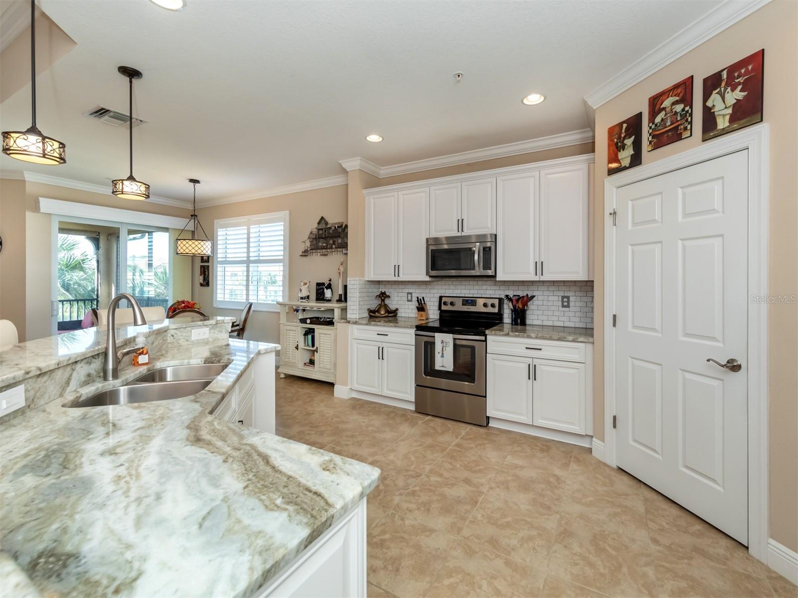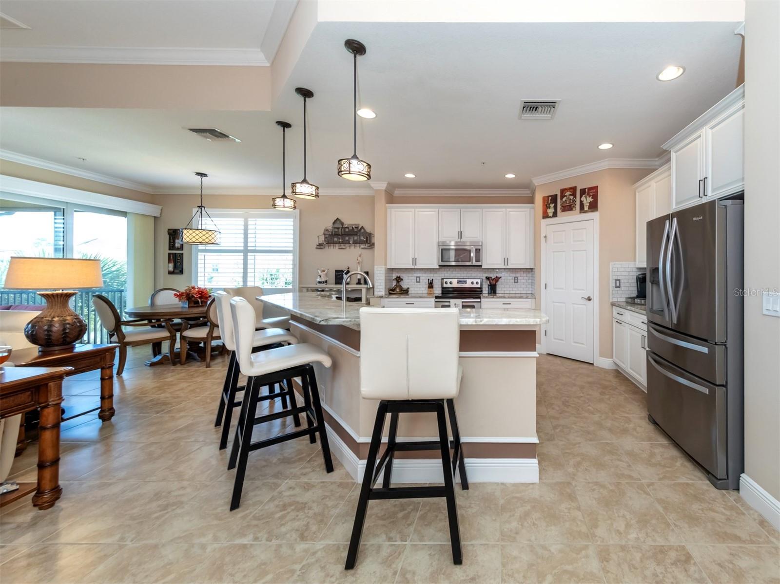 Are you concerned about rising HOA fees, insurance premiums, and interest rates? Look no further! This beautiful 2nd floor carriage home/condo, with an ELEVATOR, is located within the gates of the desirable Venetian Golf & River Club. These original owners, have updated and upgraded since closing in 2014 with a recent renovation to the kitchen cabinets, counter tops, and appliances. This unit comes equipped with impact glass windows and hurricane sliders to add that peace of mind when storm season rolls in. You'll have all the updated touches to include beautiful plantation shutters and window treatment throughout complimented by carpet in all beds, tile through the halls, baths, laundry room, and main living area, and engineered hardwood in the den/office. This lovely 3 bed/2 bath unit offers beautiful, custom moldings throughout and lives very comfortably offering nearly 2400 sq ft. Overlooking a pond, water spray feature, and providing stunning western setting sunsets, you will surely embrace living your best life living here! A topic on most buyers minds is the strength and costs of the HOA's. This HOA has solid financials, and NO HOA DUES FOR 2024! And, this seller is offering SPECIAL FINANCING, if needed. For nature lovers, you will enjoy the serene 70-acre nature park snuggled along the Myakka River. Additional amenities include a full restaurant and bar, fitness center, lap pool, resort-style pool, outdoor Tiki Bar at poolside, six Tru-Har tennis courts (and a competitive tennis league), and recently added pickle ball courts. Golf membership to Venetian Golf, owned by the prestigious Heritage Group, is optional. Beaches and shopping are just minutes away. This is a true lock and go so why not call me today to schedule your private tour!