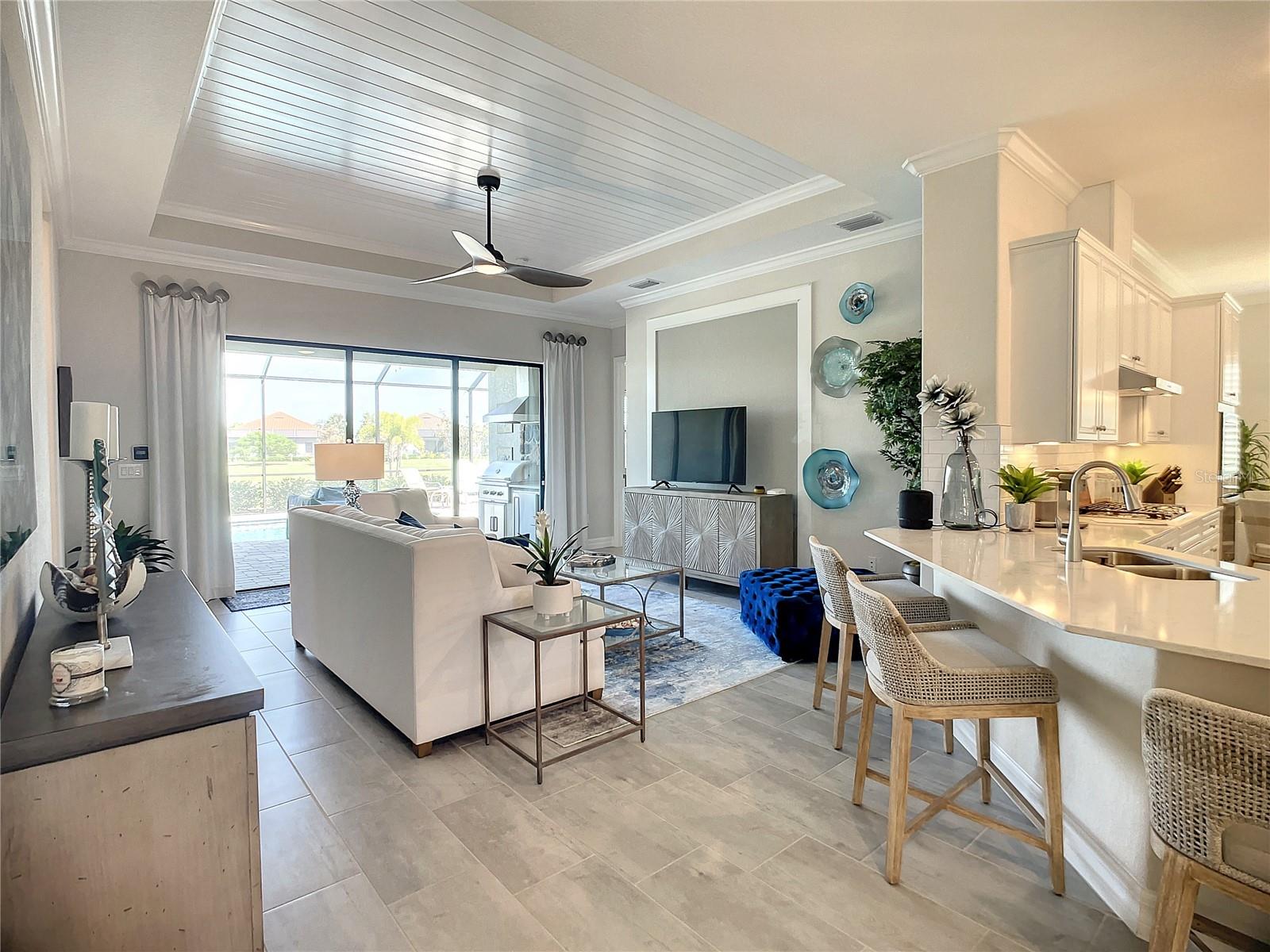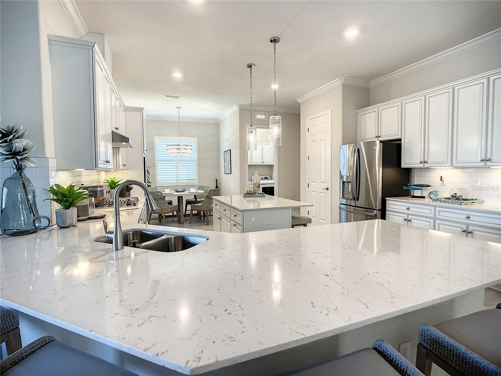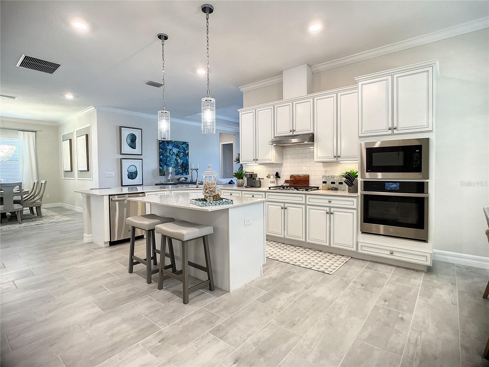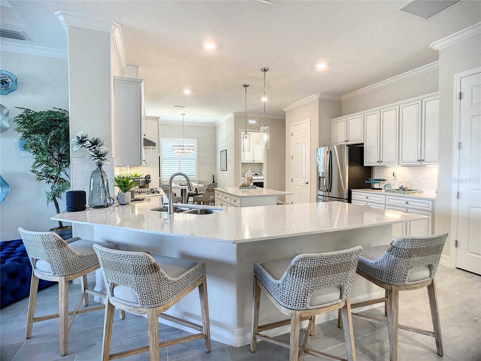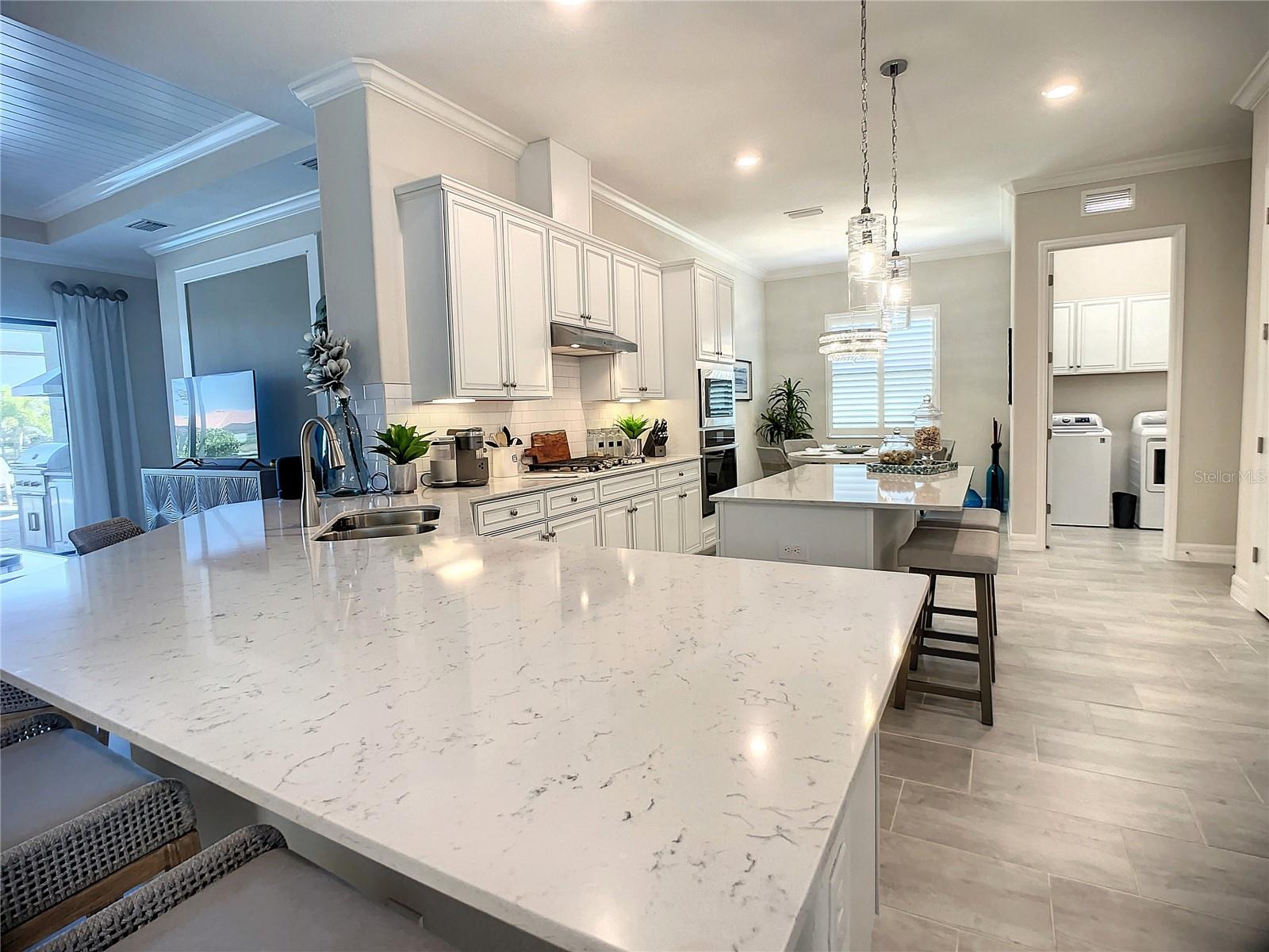 LWR GUARDED GATED Golf Community, HURRICANE INPACT WINDOWS, HEATED POOL W/ SPA, LAKE LOT, CUL-DE-SAC 12,514 SQ FT PREMIUM LOT,2,514 sq ft lot, 3 CAR GARAGE, Outdoor Kitchen, Paver Driveway & Lanai, Tile Roof, Gas Instant Hot Water Heater, Designer Lighting. Home Warranty Included w/ Sale. Nestled within the exclusive gated Golfing, LWR Country Club East stands out as one of the most coveted living destinations. Experience the freedom of MAINTENANCE-FREE living, complemented by stunning curb appeal. Revel in the luxury of a paver driveway, tile roof, and HURRICANE WINDOWS. This impressive 4 BEDROOMS residence features TWO ENSUITES bedrooms and 3 BATHS. Its well-thought-out OPEN FLOOR PLAN effortlessly blends elegance with comfort, and the entire house is adorned with exquisite tile throughout - NO CARPETS here. Situated on a PREMIUM LAKEFRONT LOT at the end of a tranquil CUL-DE-SAC, this property offers more space than most, boasting a generous 12,500 sq ft. lot. The OWNERS ARE PART TIME RESIDENTS, so this house is gently lived in, making it a pristine choice. It's adorned with stunning light fixtures, creating a luxurious ambiance. The kitchen is a chef's dream, featuring QUARTZ COUNTERTOPS, GE PROFILE APPLIANCES, BUILT IN SMART OVEN, 5 BURNER GAS COOKTOP, two eat-at bars, ample counter space, and pendant lighting. It offers plenty of room for both a dining table and casual counter seating. The large island with storage is a focal point, and the lite wood cabinetry, bright design is perfect for entertaining family and friends. Both the living space and the owner's suite have been tastefully upgraded with shiplap ceilings and modern ceiling fans. Step outside to the OVERSIZED PAVER LANAI, the epitome of Florida living. Here, you'll discover a kidney-shaped HEATED POOL WITH SPA, a serene lake view, and a comfortable undercover area with a SUMMER KITCHEN - an idyllic setting for relaxation and entertainment. The owner's suite is a private sanctuary, offering a spacious room with stunning tile, a tray ceiling, and an oversized walk-in closet with wood breathable shelving. The owner's private bath is a haven, featuring quartz counters, dual sinks, a walk-in shower with a frameless custom glass door, a soaking tub, and a linen closet. The front bedroom serves as a perfect guest suite with its private bath and quartz countertop. Owners have updated the landscaping and added additional landscaping for privacy. Your combined annual HOA fees take care of all your landscaping and lawn maintenance, reclaimed water sprinklers, three community pools, a fitness center, a clubhouse, playgrounds, pet parks, and a manned guard gate for added security & peace of mind. The house is not only equipped with a gas cooking system but also features a gas tankless hot water system. Situated in Lakewood Ranch, the #1 best-selling multigenerational community in the country, you'll be close to world-class beaches, dining, exceptional schools, medical facilities, shopping, and theatrical entertainment. Home Warranty Included with Sale. Room Feature: Linen Closet In Bath (Primary Bedroom).