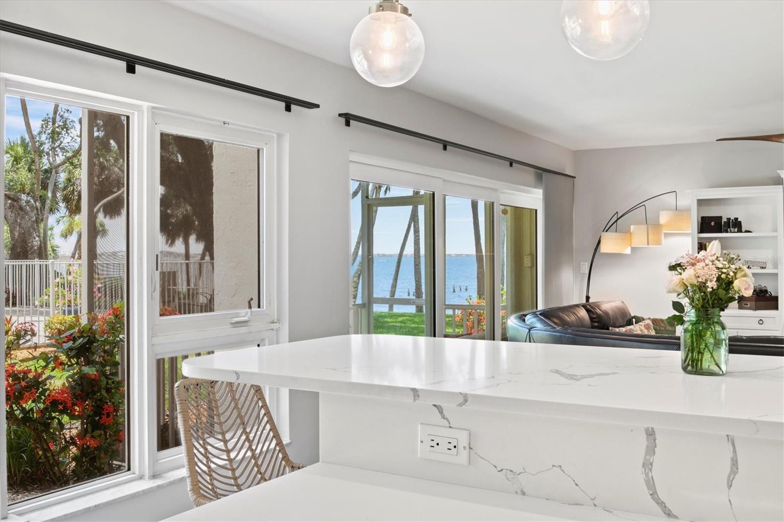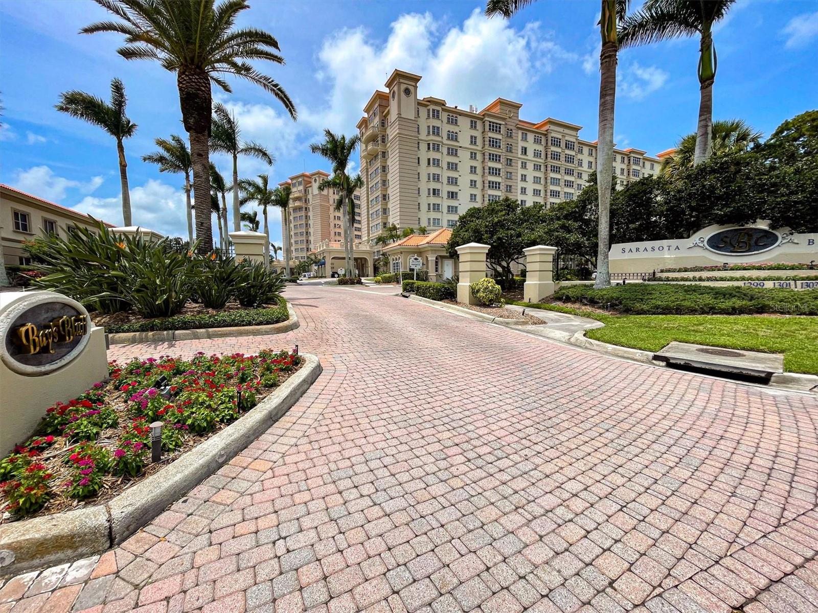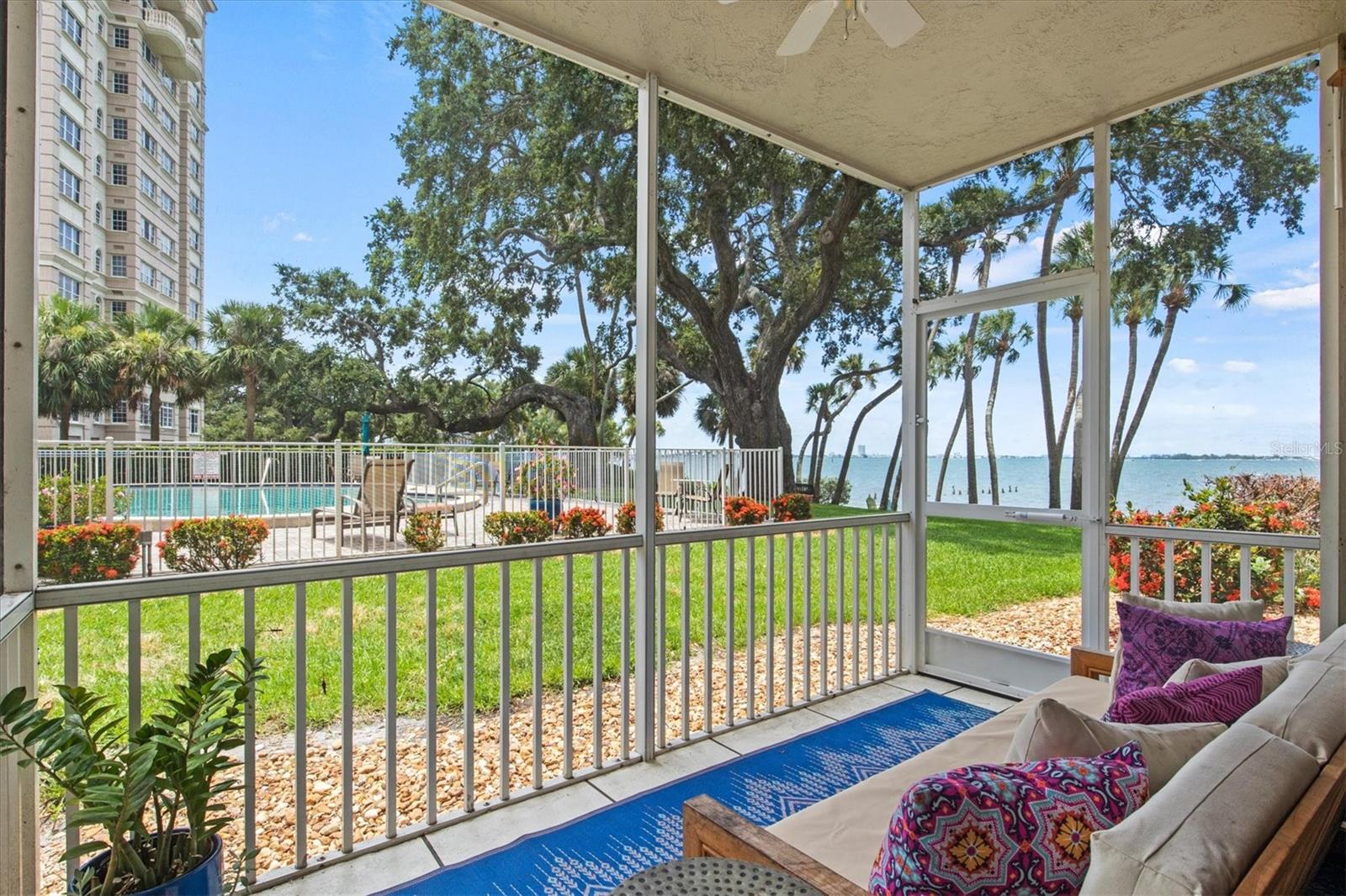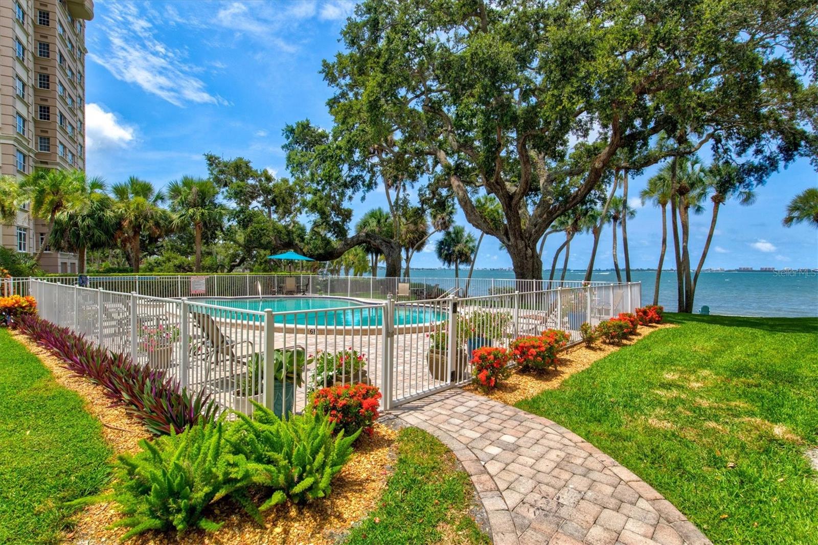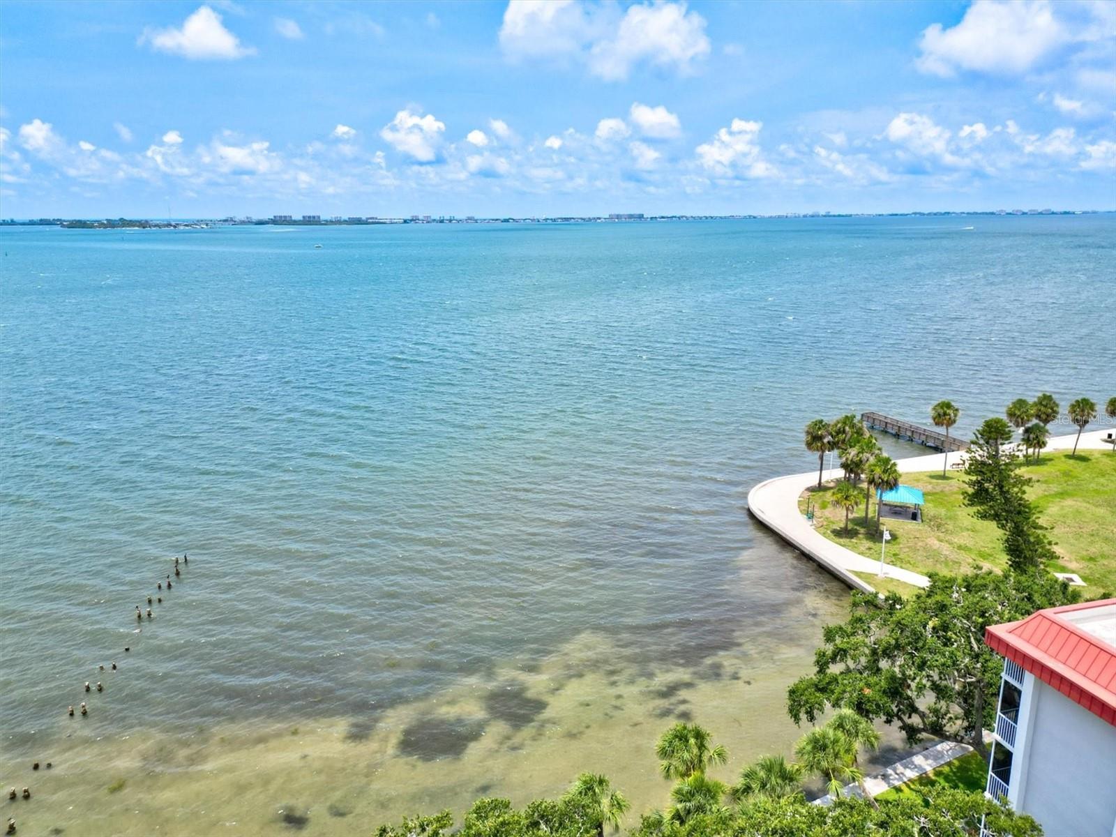DIRECT BAYFRONT CONDO. FIRST FLOOR with beautiful bay and sunset views. NO elevator needed. Walk right out your door to your lanai, the pool, the bay or to walk your dog. This quiet and peaceful community is located next to a beautiful bayfront park on one side and the Sarasota Bay Club on the other. Sit in the adirondack chairs on the bay and watch the dolphins play, sailboats and the sunset. This MOVE IN READY condo boasts a split floor plan and has been renovated with high end SS kitchen appliances, white shaker cabinets, quartz countertops, breakfast bar and pantry closet. Lots of natural light fills the space. The primary ensuite has a walk-in closet and walk-in tiled shower. The guest bedroom features tiger stripped bamboo floors and a mirrored wall that reflects the water. There is a stackable washer/dryer in the condo. The rarely used heated pool is like having your own private pool. You can even watch the kids or grandkids from your condo or lanai. The impact glass sliders open up to the comfortable screened lanai to increase your living space. A storage cage is available on the same floor. This convenient location is only 1 mile from downtown, 10 minutes to the beach, 3 miles from the airport and a couple of blocks from Publix. In the park next door there is a playground and walking paths to enjoy. No one will ever build in front of this condo and block your view. Architects rendering of new lobby in photos. Seller will consider a "rent to own" agreement.