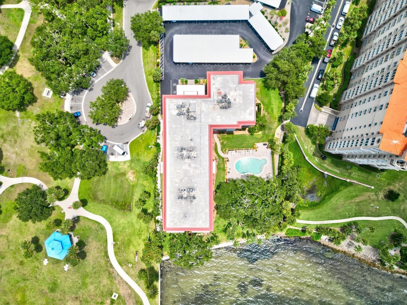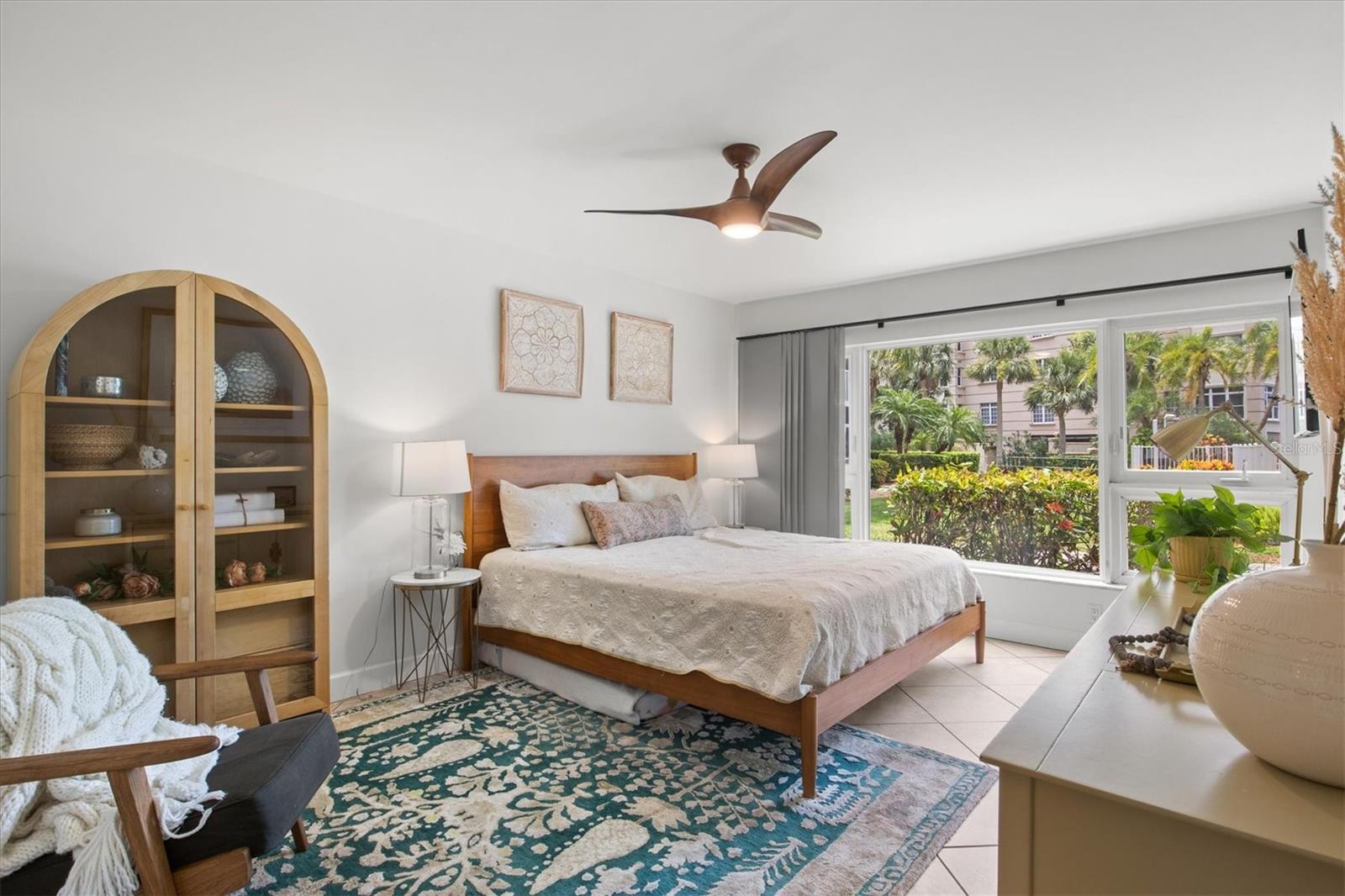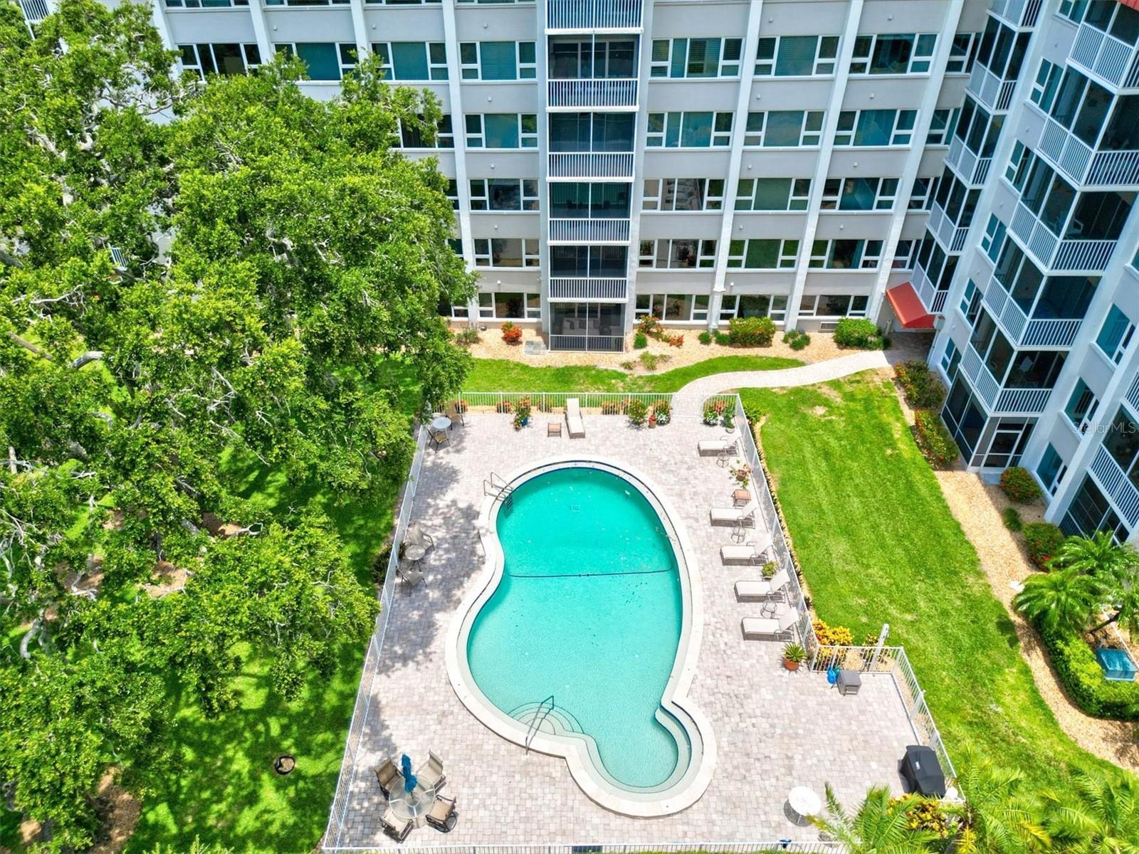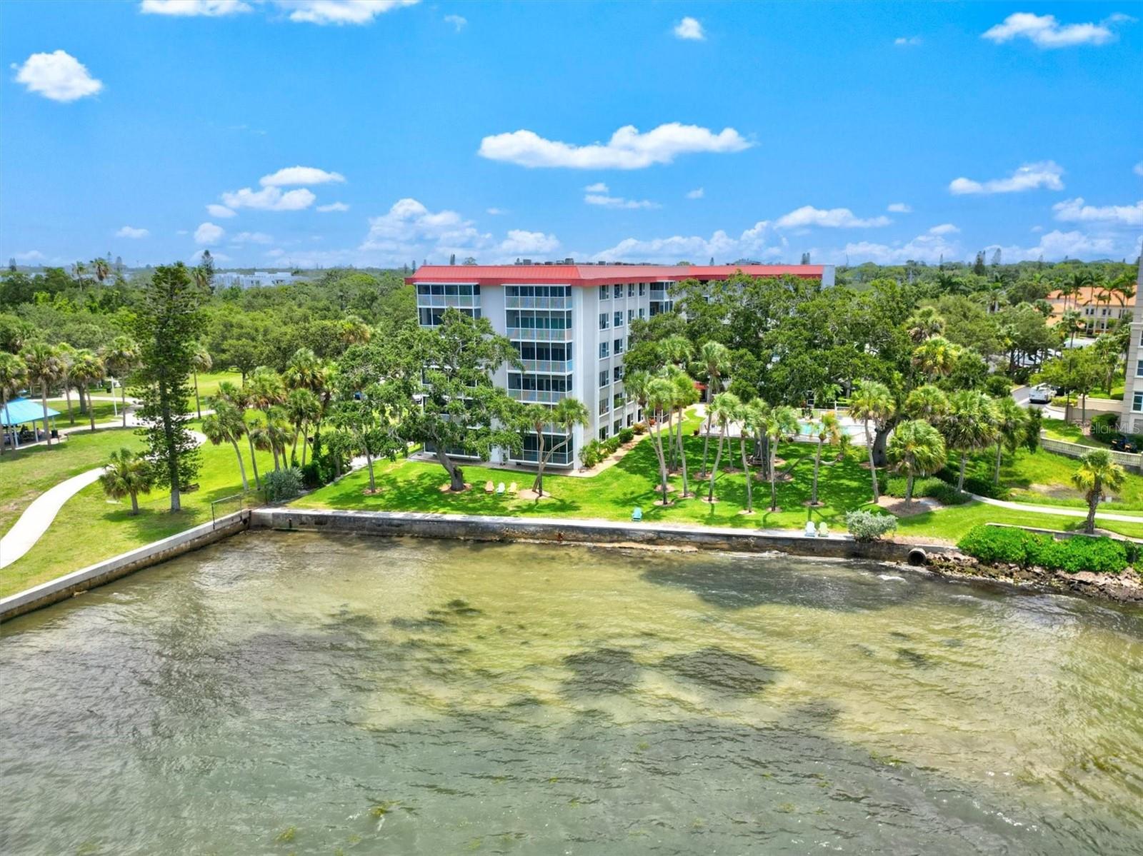 DIRECT BAYFRONT CONDO. FIRST FLOOR with beautiful bay and sunset views. NO elevator needed. Walk right out your door to your lanai, the pool, the bay or to walk your dog. This quiet and peaceful community is located next to a beautiful bayfront park on one side and the Sarasota Bay Club on the other. Sit in the adirondack chairs on the bay and watch the dolphins play, sailboats and the sunset. This MOVE IN READY condo boasts a split floor plan and has been renovated with high end SS kitchen appliances, white shaker cabinets, quartz countertops, breakfast bar and pantry closet. Lots of natural light fills the space. The primary ensuite has a walk-in closet and walk-in tiled shower. The guest bedroom features tiger stripped bamboo floors and a mirrored wall that reflects the water. There is a stackable washer/dryer in the condo. The rarely used heated pool is like having your own private pool. You can even watch the kids or grandkids from your condo or lanai. The impact glass sliders open up to the comfortable screened lanai to increase your living space. A storage cage is available on the same floor. This convenient location is only 1 mile from downtown, 10 minutes to the beach, 3 miles from the airport and a couple of blocks from Publix. In the park next door there is a playground and walking paths to enjoy. No one will ever build in front of this condo and block your view. Architects rendering of new lobby in photos. Seller will consider a "rent to own" agreement.