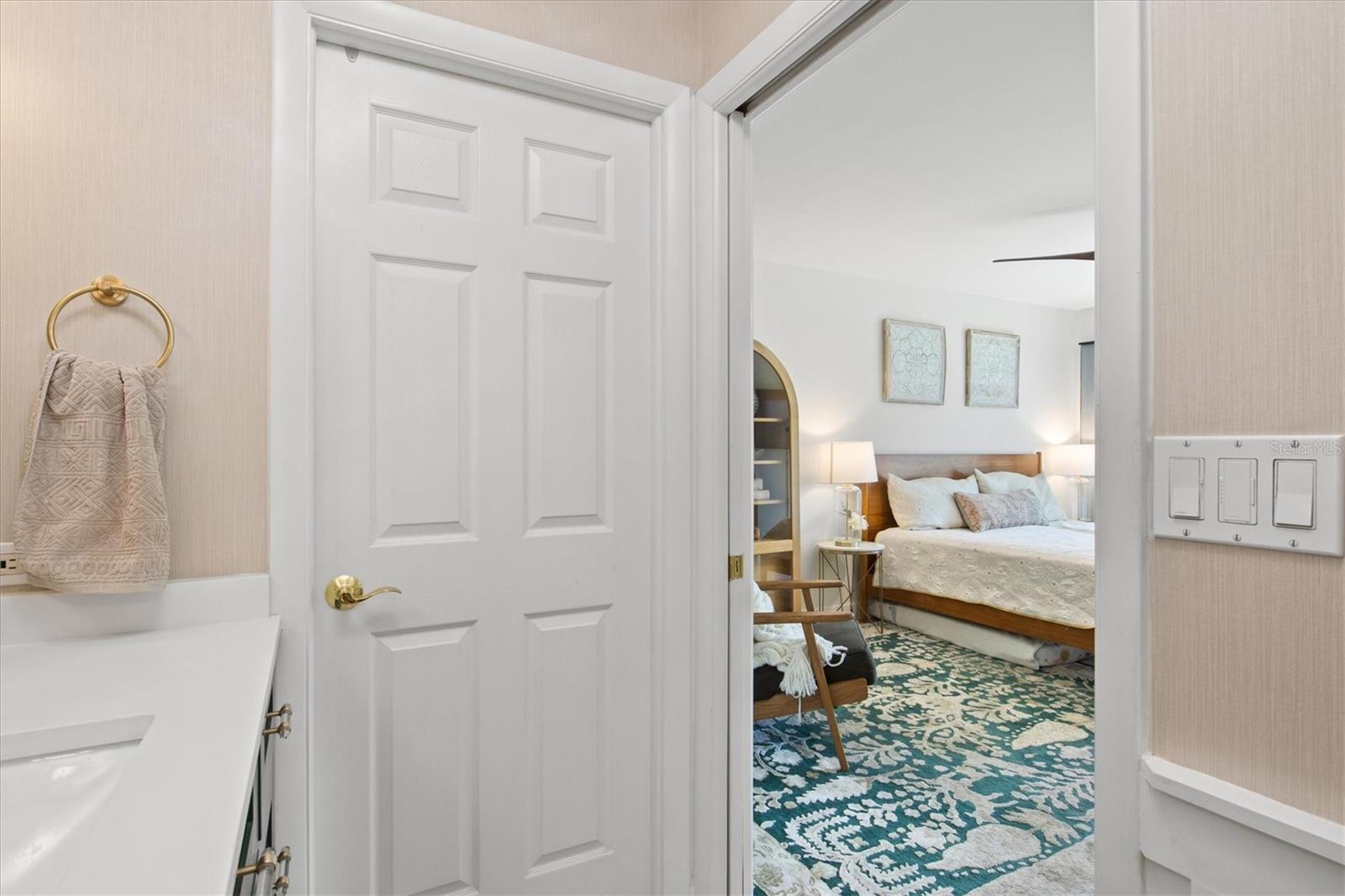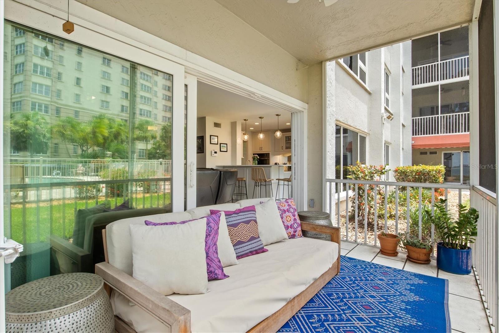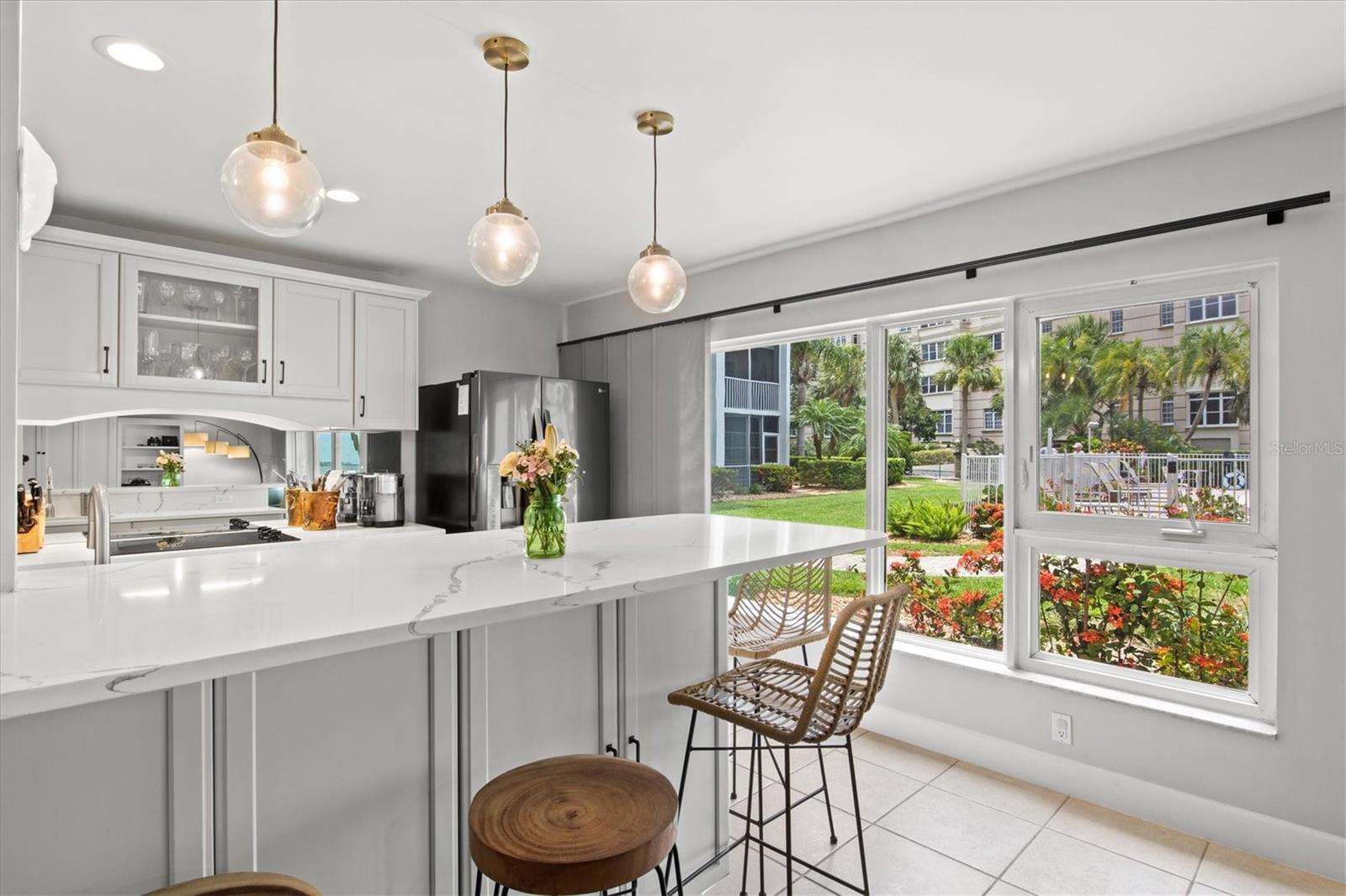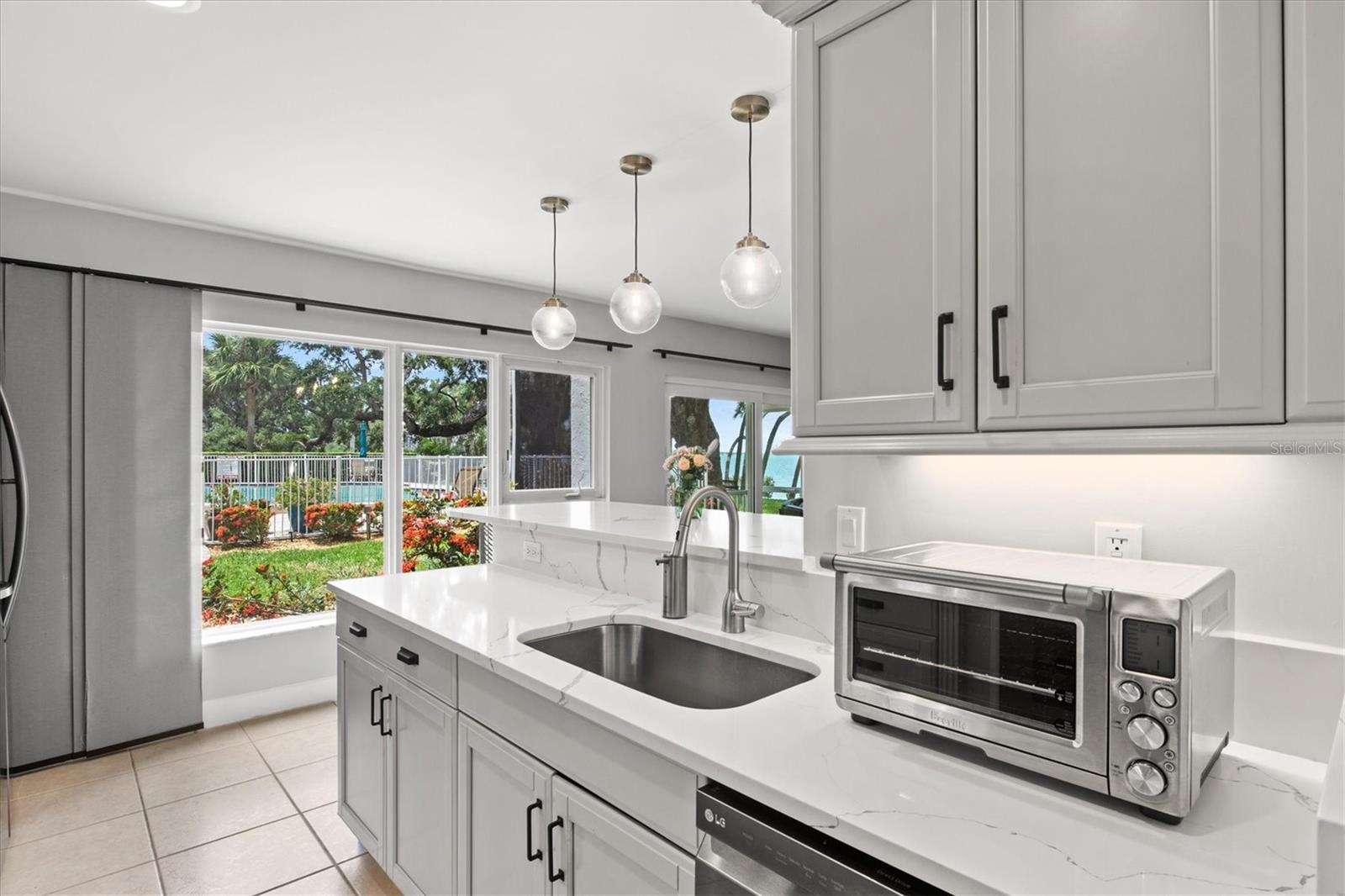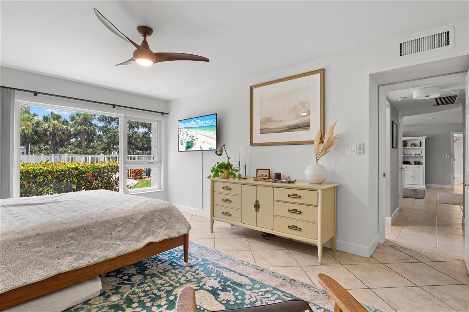 DIRECT BAYFRONT CONDO. FIRST FLOOR with beautiful bay and sunset views. NO elevator needed. Walk right out your door to your lanai, the pool, the bay or to walk your dog. This quiet and peaceful community is located next to a beautiful bayfront park on one side and the Sarasota Bay Club on the other. Sit in the adirondack chairs on the bay and watch the dolphins play, sailboats and the sunset. This MOVE IN READY condo boasts a split floor plan and has been renovated with high end SS kitchen appliances, white shaker cabinets, quartz countertops, breakfast bar and pantry closet. Lots of natural light fills the space. The primary ensuite has a walk-in closet and walk-in tiled shower. The guest bedroom features tiger stripped bamboo floors and a mirrored wall that reflects the water. There is a stackable washer/dryer in the condo. The rarely used heated pool is like having your own private pool. You can even watch the kids or grandkids from your condo or lanai. The impact glass sliders open up to the comfortable screened lanai to increase your living space. A storage cage is available on the same floor. This convenient location is only 1 mile from downtown, 10 minutes to the beach, 3 miles from the airport and a couple of blocks from Publix. In the park next door there is a playground and walking paths to enjoy. No one will ever build in front of this condo and block your view. Architects rendering of new lobby in photos. Seller will consider a "rent to own" agreement.