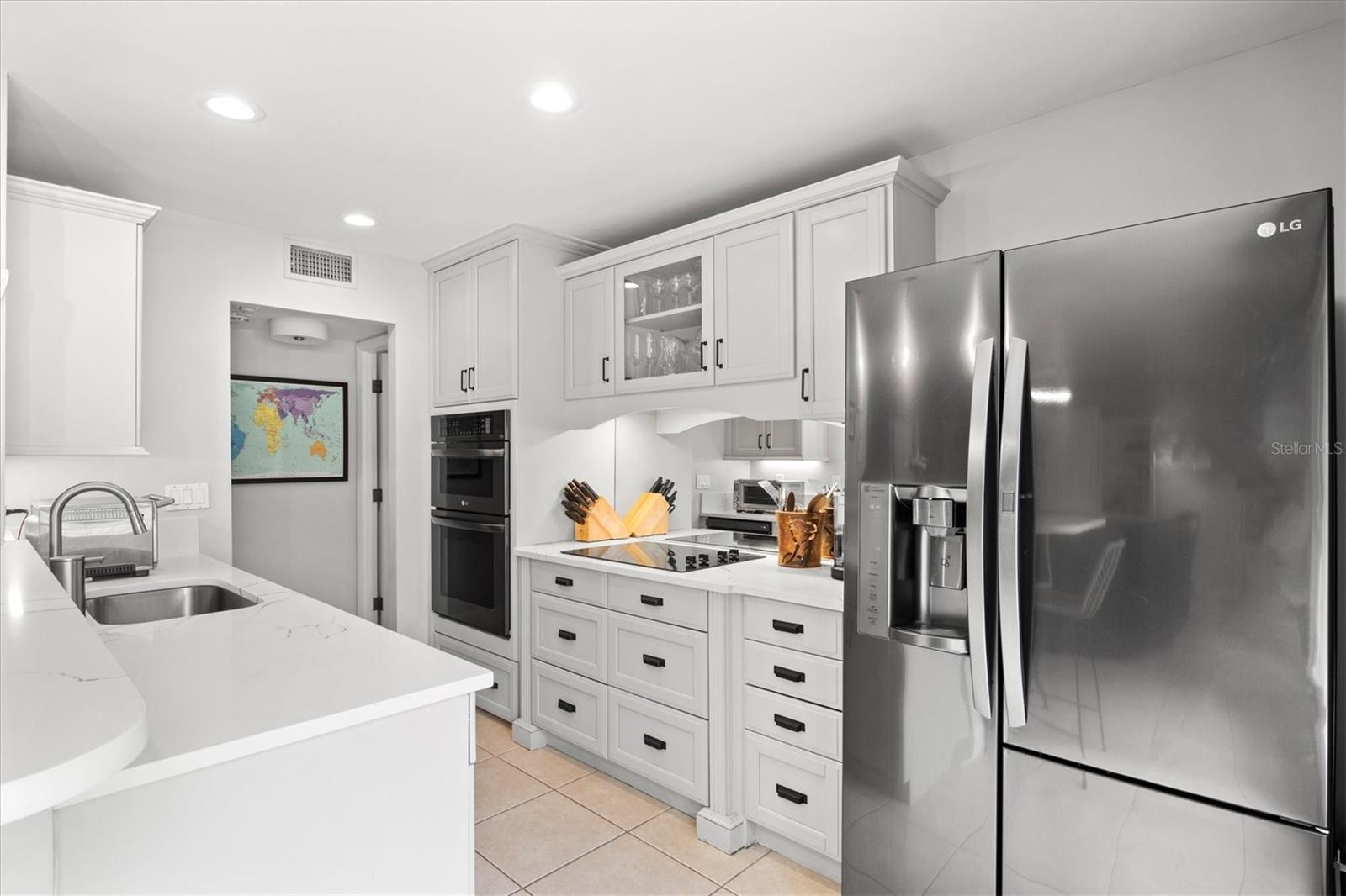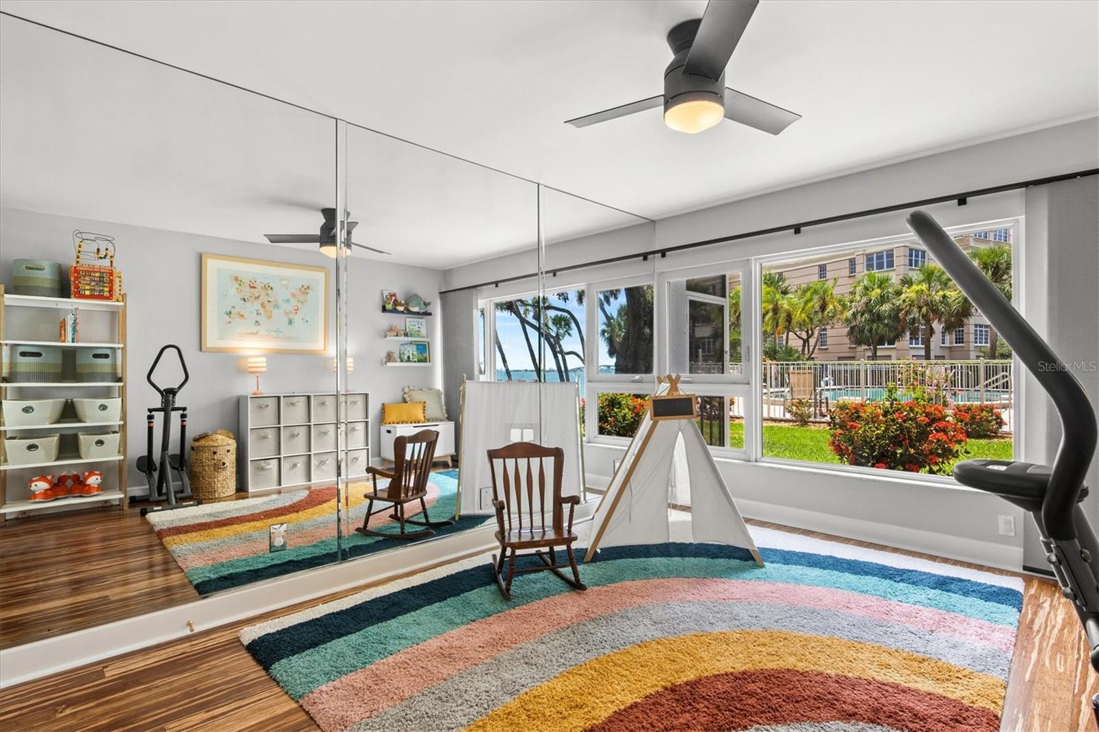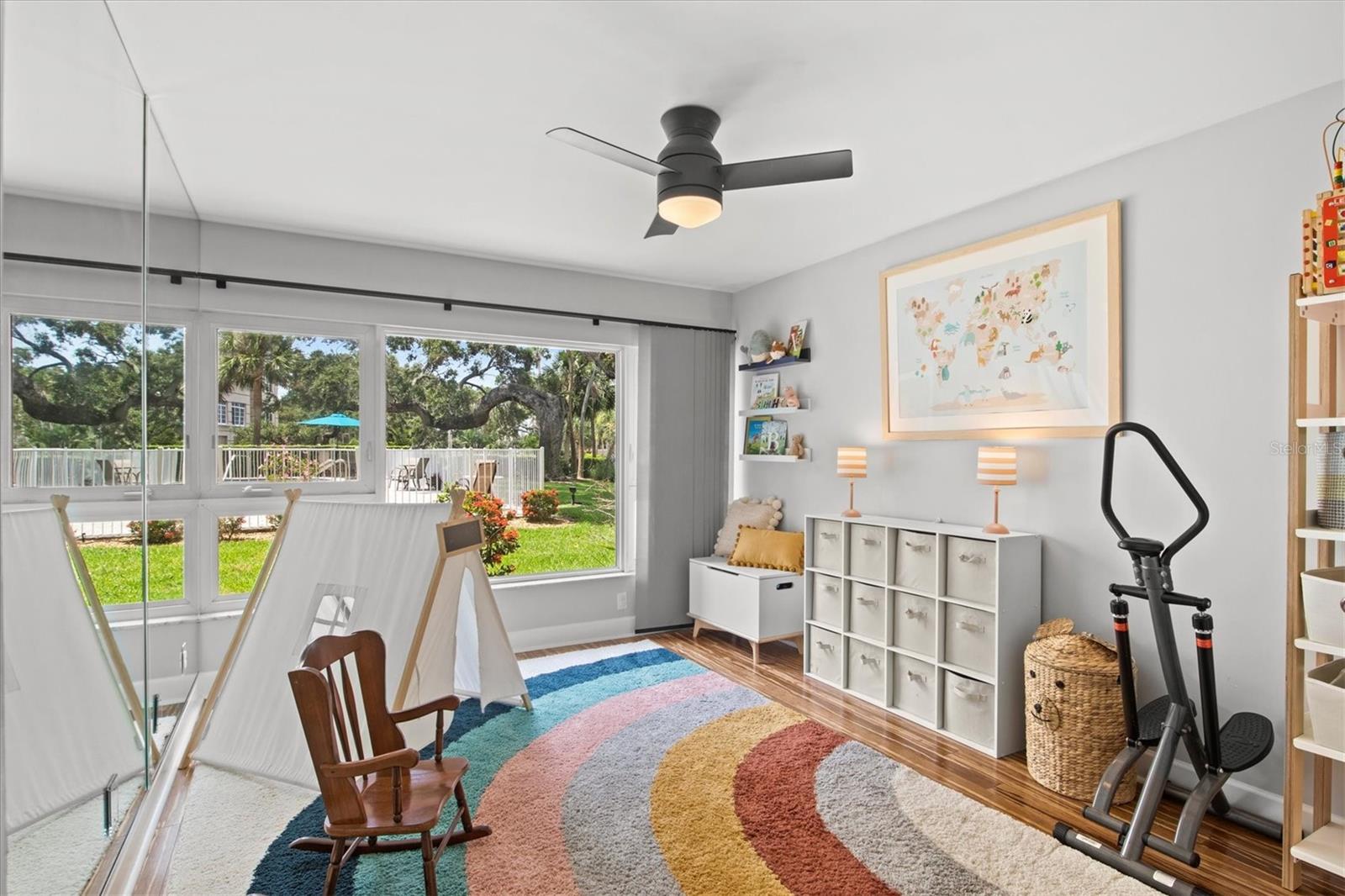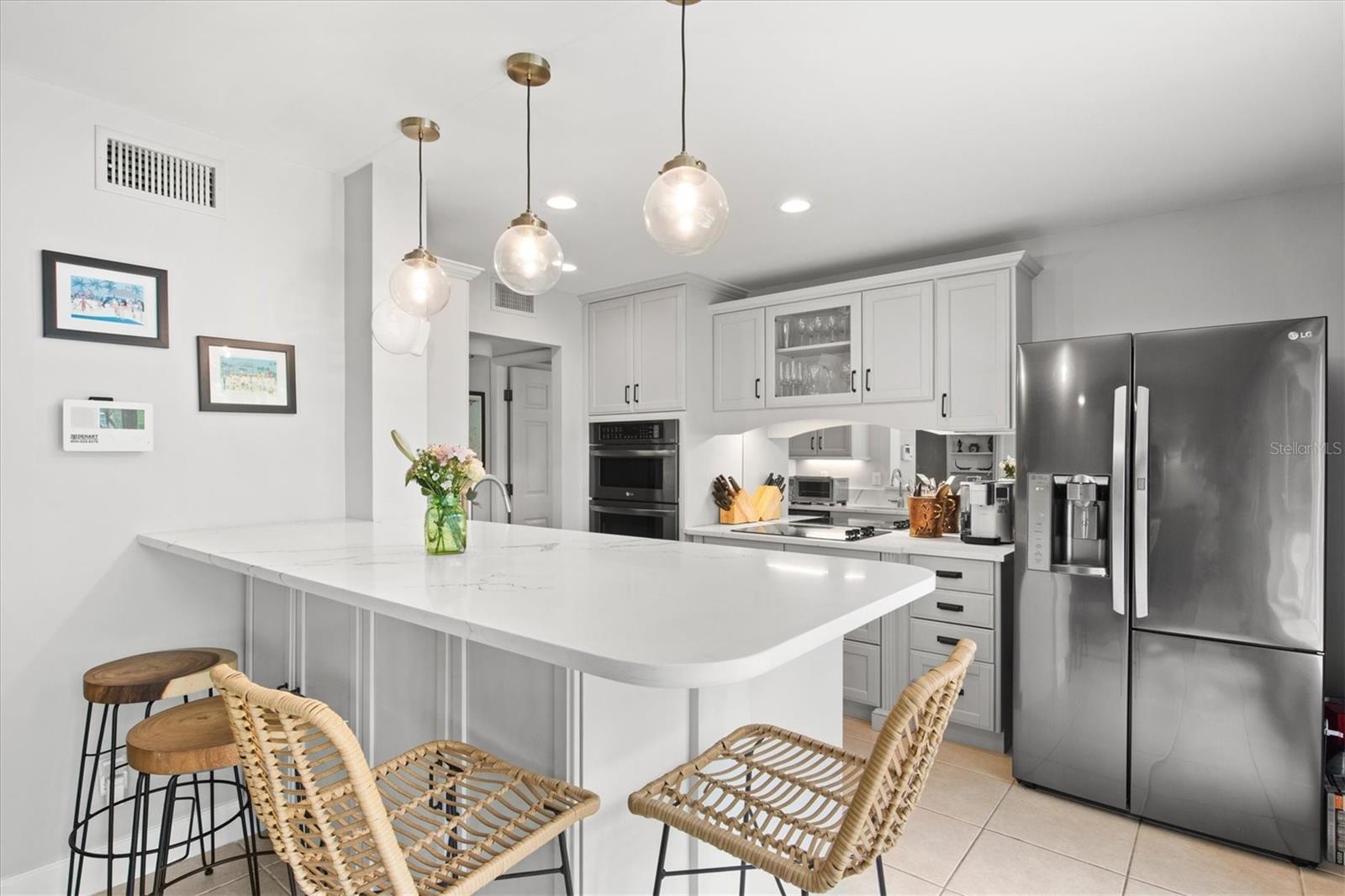 DIRECT BAYFRONT CONDO. FIRST FLOOR with beautiful bay and sunset views. NO elevator needed. Walk right out your door to your lanai, the pool, the bay or to walk your dog. This quiet and peaceful community is located next to a beautiful bayfront park on one side and the Sarasota Bay Club on the other. Sit in the adirondack chairs on the bay and watch the dolphins play, sailboats and the sunset. This MOVE IN READY condo boasts a split floor plan and has been renovated with high end SS kitchen appliances, white shaker cabinets, quartz countertops, breakfast bar and pantry closet. Lots of natural light fills the space. The primary ensuite has a walk-in closet and walk-in tiled shower. The guest bedroom features tiger stripped bamboo floors and a mirrored wall that reflects the water. There is a stackable washer/dryer in the condo. The rarely used heated pool is like having your own private pool. You can even watch the kids or grandkids from your condo or lanai. The impact glass sliders open up to the comfortable screened lanai to increase your living space. A storage cage is available on the same floor. This convenient location is only 1 mile from downtown, 10 minutes to the beach, 3 miles from the airport and a couple of blocks from Publix. In the park next door there is a playground and walking paths to enjoy. No one will ever build in front of this condo and block your view. Architects rendering of new lobby in photos. Seller will consider a "rent to own" agreement.