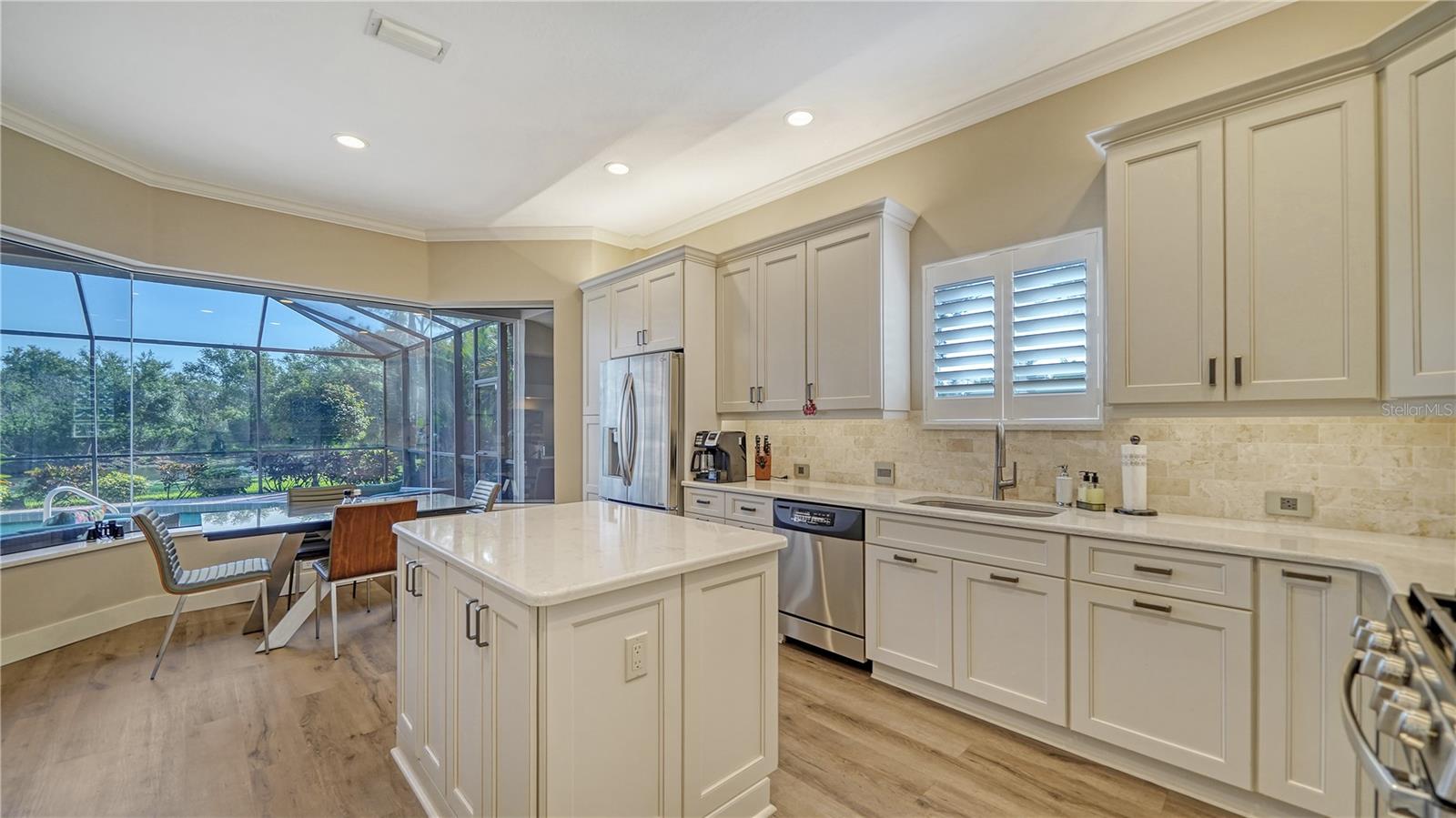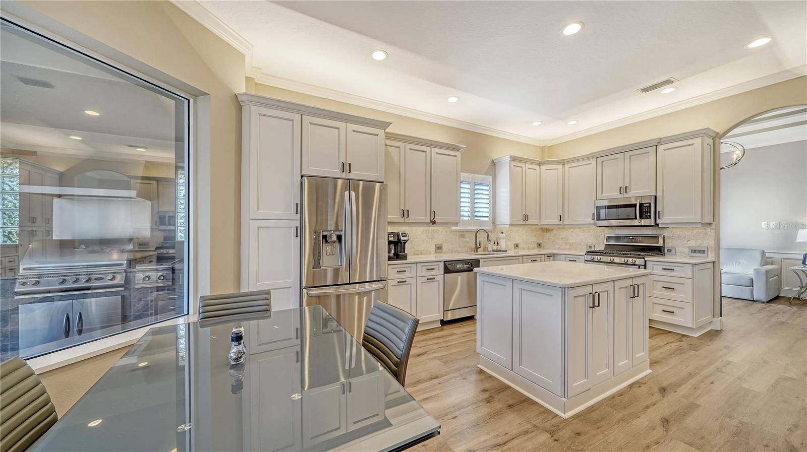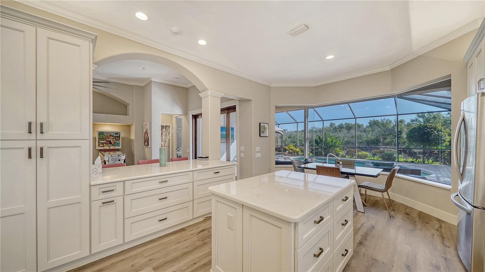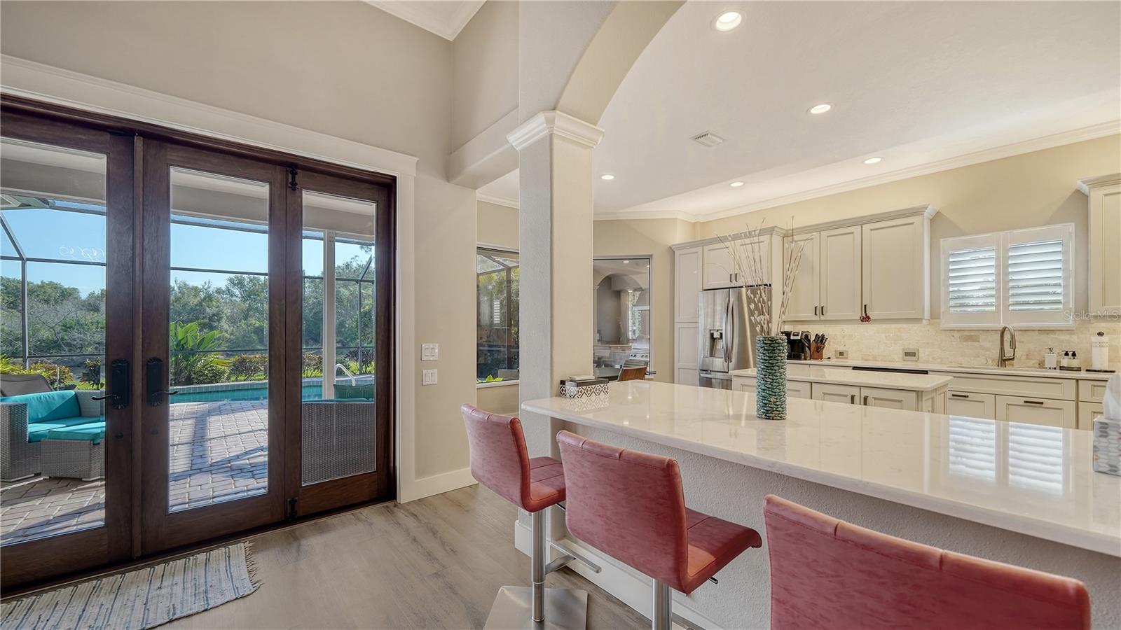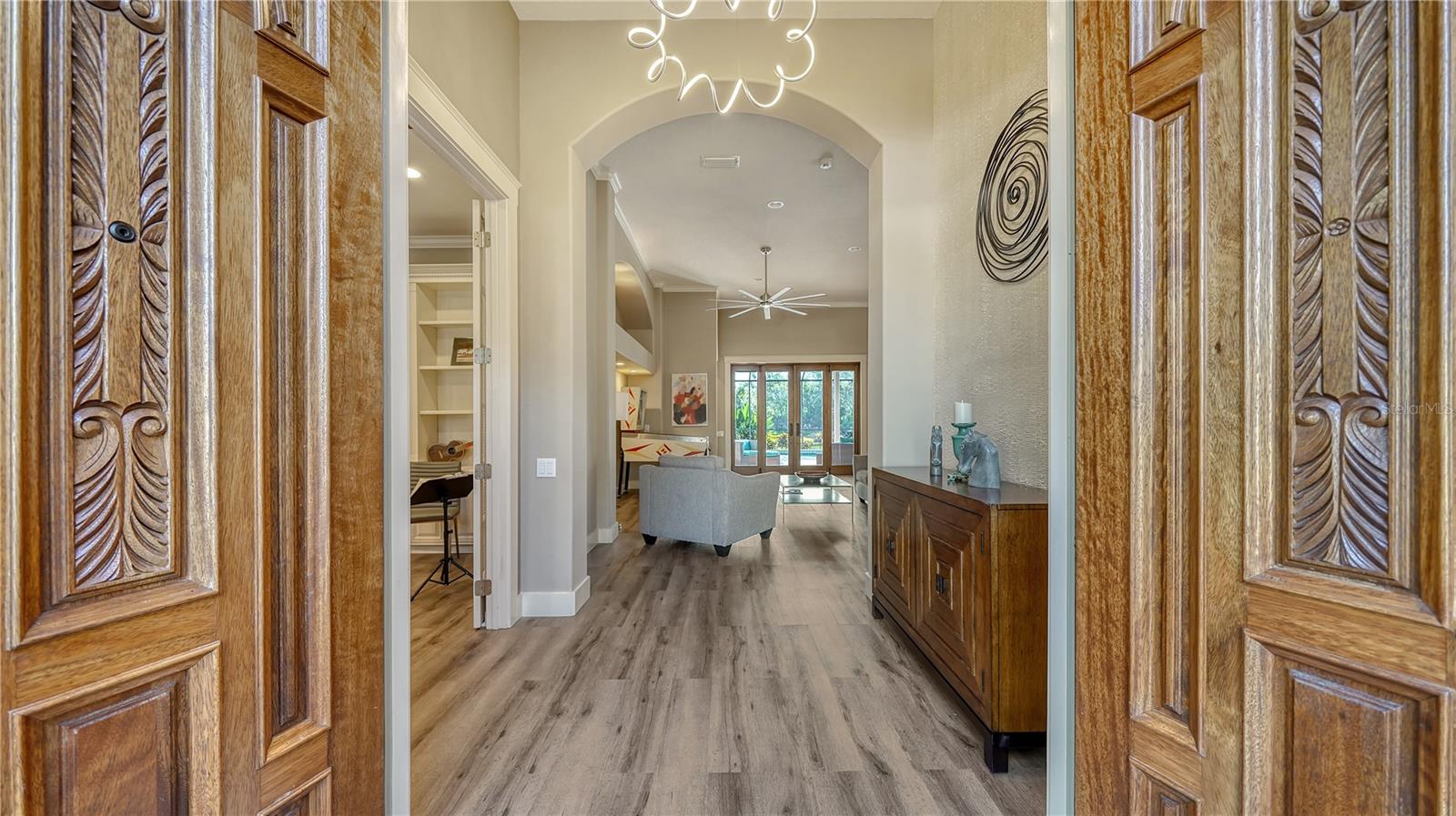 Stunning Custom Arthur Ruttenberg Home in private gated community with low HOA Fees. The carved wood double doors at the entry lead you to a beautifully updated, custom decorated home with Two Bedrooms, 2 1/2 Baths with upgraded fixtures (including Toto toilets) and an open floor plan featuring a stunning kitchen with quartz countertops, and custom wood cabinets, a marble backsplash, and a center island. The Dining Room is currently furnished as a den. The office was originally the third bedroom and can easily be reconverted back. Open floor plan with luxury wood-look vinyl floors, baseboards. crown moldings, trey ceilings, chair rail molding in the office and dining room, architecturally designed wood paneled walls in bedrooms, crystal doorknobs, and stunning chandeliers. The home also has a central vacuum system. Beautiful wood French doors lead to the Lanai with outdoor kitchen, shower and remote controlled sun screens. Pool with custom water feature overlooks serene small lake and preserve. The Driveway and Lanai have lovely pavers! Beautiful landscaping with outdoor lighting, coach lamps, side entry garage and on a cul de sac. Community kayak launch and fishing pier on Lake Uihlein. All systems have been updated. Roof is only 5 years old!Furniture available under separate purchase.