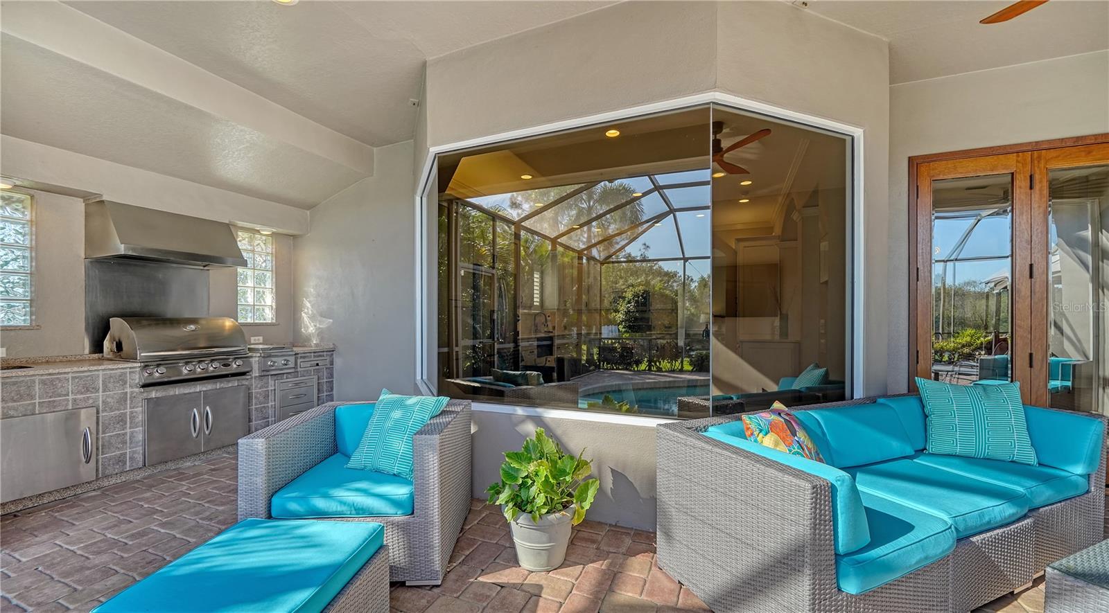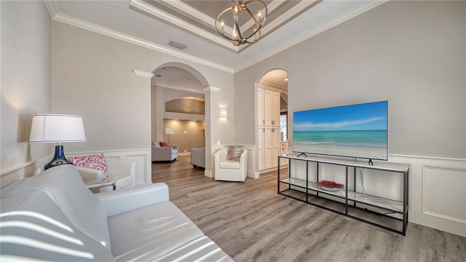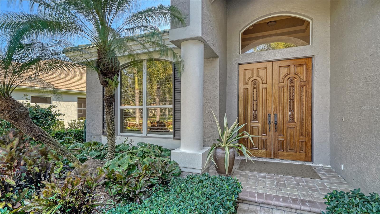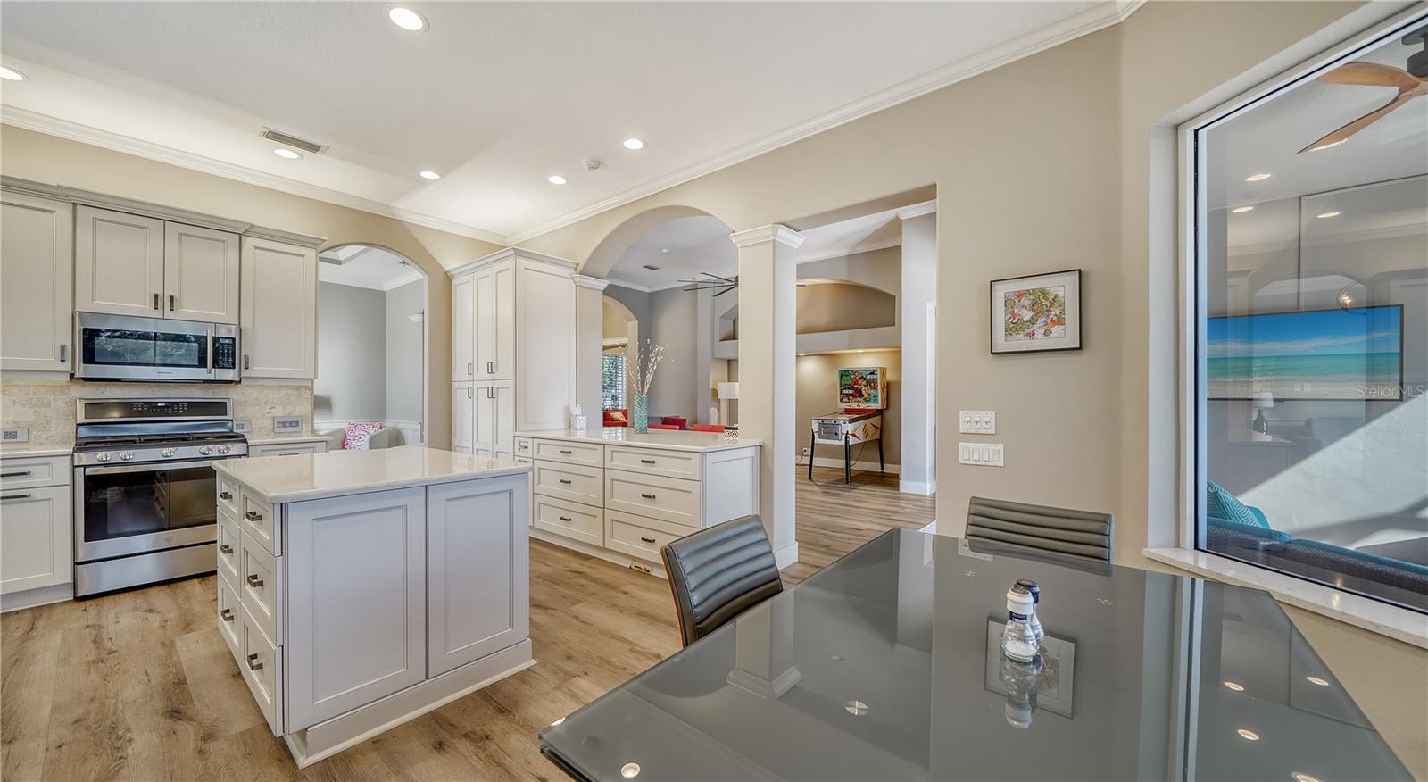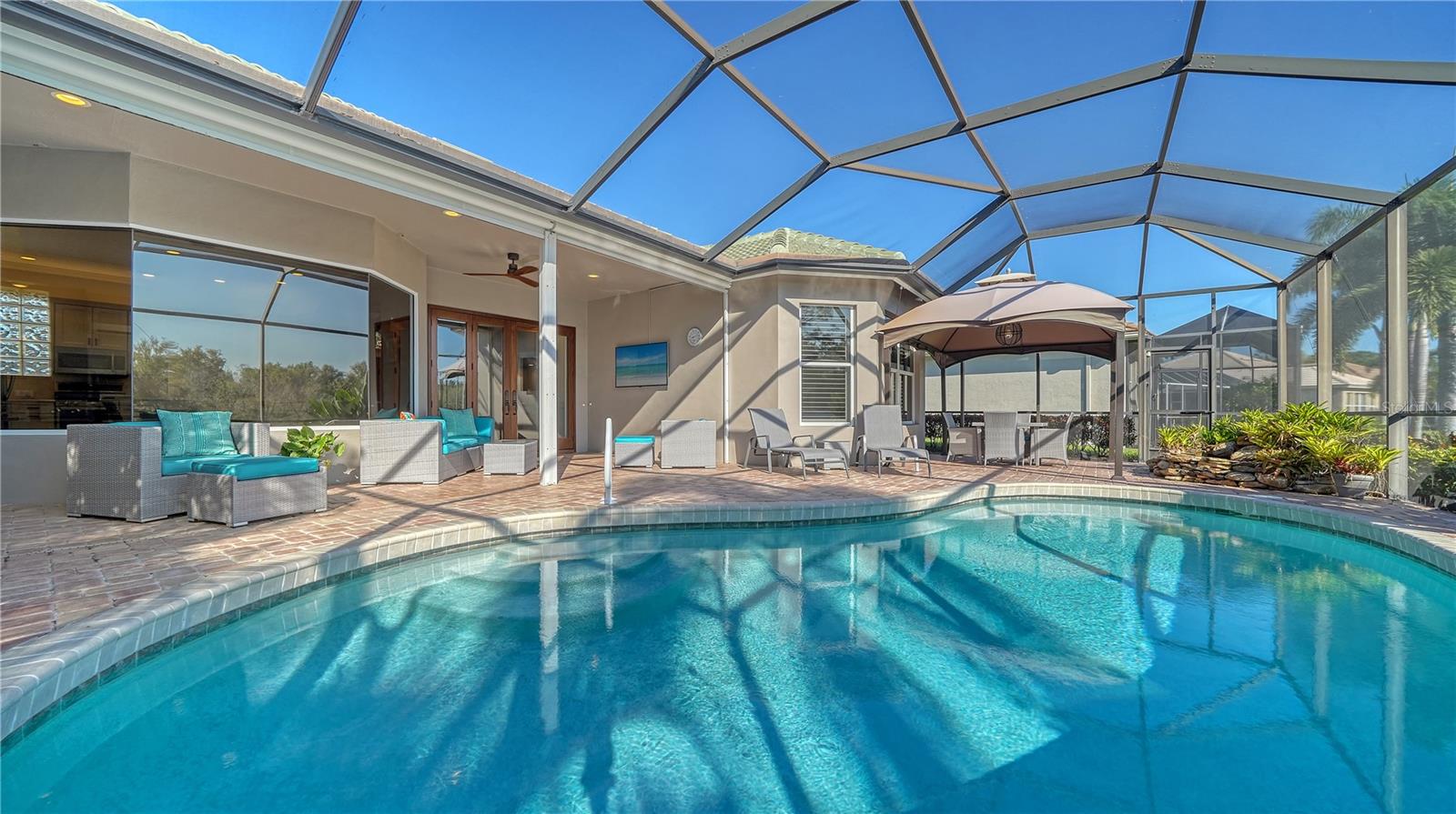 Stunning Custom Arthur Ruttenberg Home in private gated community with low HOA Fees. The carved wood double doors at the entry lead you to a beautifully updated, custom decorated home with Two Bedrooms, 2 1/2 Baths with upgraded fixtures (including Toto toilets) and an open floor plan featuring a stunning kitchen with quartz countertops, and custom wood cabinets, a marble backsplash, and a center island. The Dining Room is currently furnished as a den. The office was originally the third bedroom and can easily be reconverted back. Open floor plan with luxury wood-look vinyl floors, baseboards. crown moldings, trey ceilings, chair rail molding in the office and dining room, architecturally designed wood paneled walls in bedrooms, crystal doorknobs, and stunning chandeliers. The home also has a central vacuum system. Beautiful wood French doors lead to the Lanai with outdoor kitchen, shower and remote controlled sun screens. Pool with custom water feature overlooks serene small lake and preserve. The Driveway and Lanai have lovely pavers! Beautiful landscaping with outdoor lighting, coach lamps, side entry garage and on a cul de sac. Community kayak launch and fishing pier on Lake Uihlein. All systems have been updated. Roof is only 5 years old!Furniture available under separate purchase.
