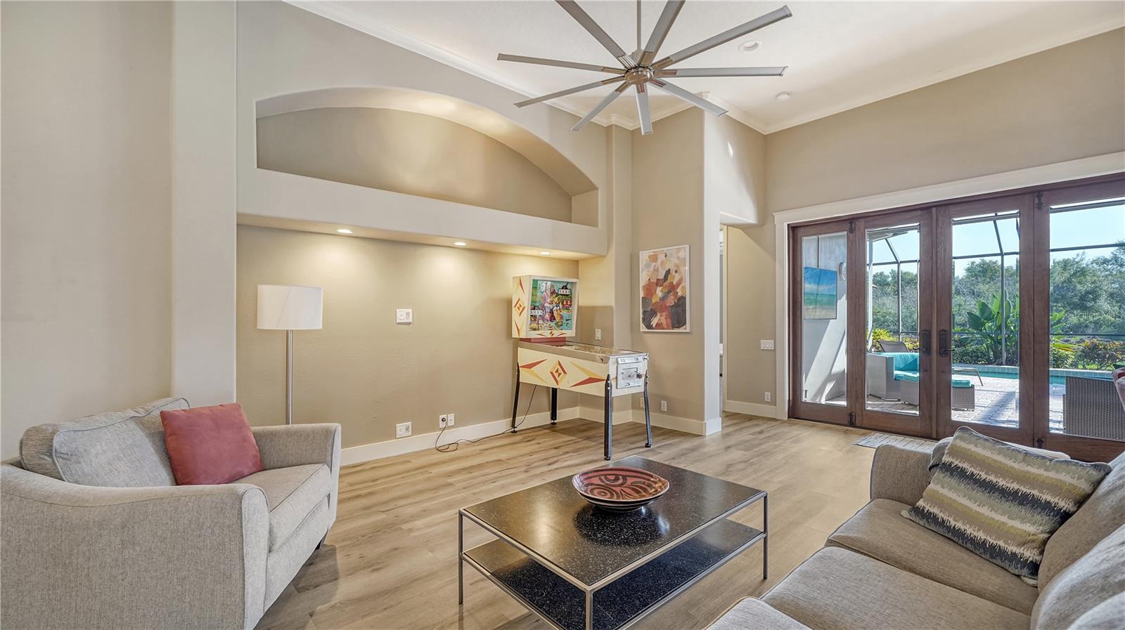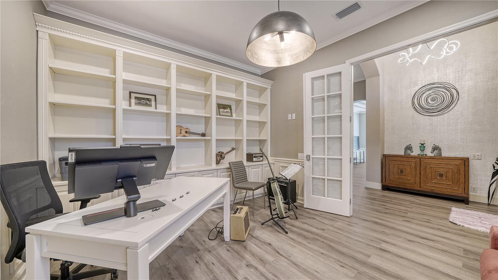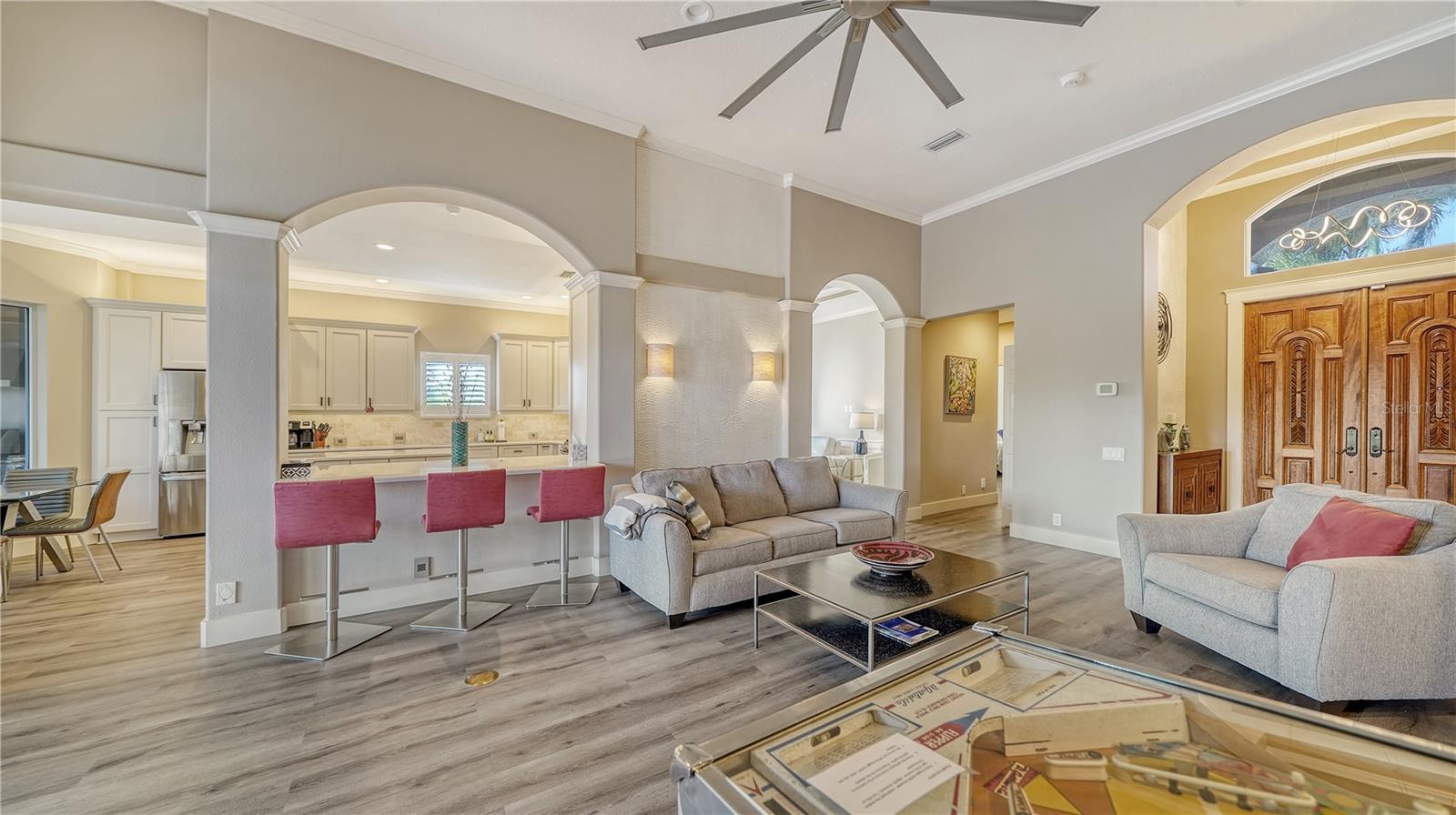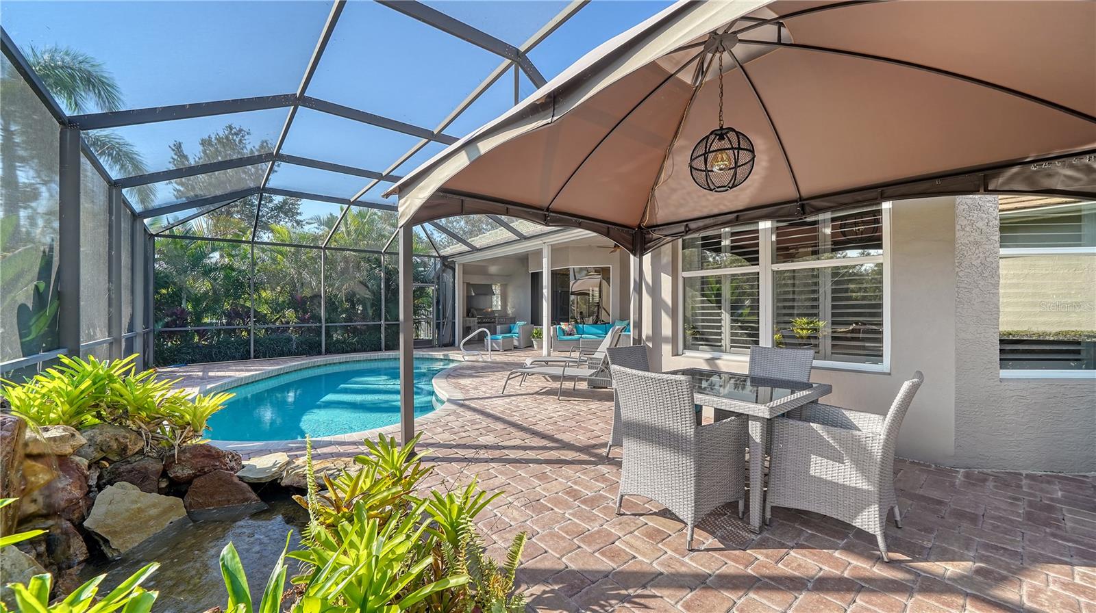 Stunning Custom Arthur Ruttenberg Home in private gated community with low HOA Fees. The carved wood double doors at the entry lead you to a beautifully updated, custom decorated home with Two Bedrooms, 2 1/2 Baths with upgraded fixtures (including Toto toilets) and an open floor plan featuring a stunning kitchen with quartz countertops, and custom wood cabinets, a marble backsplash, and a center island. The Dining Room is currently furnished as a den. The office was originally the third bedroom and can easily be reconverted back. Open floor plan with luxury wood-look vinyl floors, baseboards. crown moldings, trey ceilings, chair rail molding in the office and dining room, architecturally designed wood paneled walls in bedrooms, crystal doorknobs, and stunning chandeliers. The home also has a central vacuum system. Beautiful wood French doors lead to the Lanai with outdoor kitchen, shower and remote controlled sun screens. Pool with custom water feature overlooks serene small lake and preserve. The Driveway and Lanai have lovely pavers! Beautiful landscaping with outdoor lighting, coach lamps, side entry garage and on a cul de sac. Community kayak launch and fishing pier on Lake Uihlein. All systems have been updated. Roof is only 5 years old!Furniture available under separate purchase.