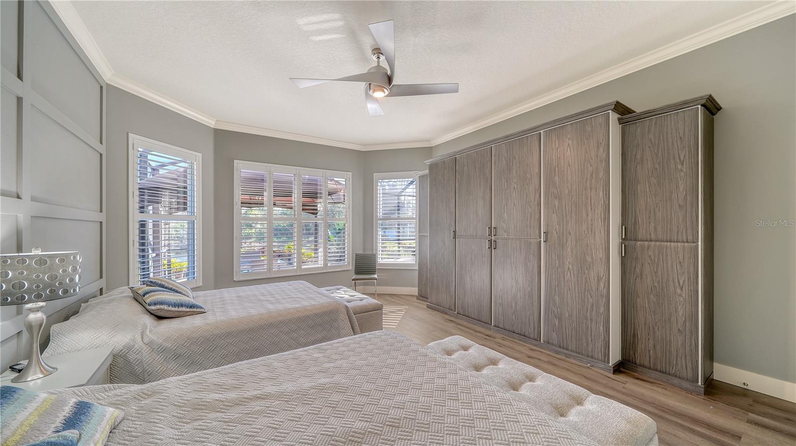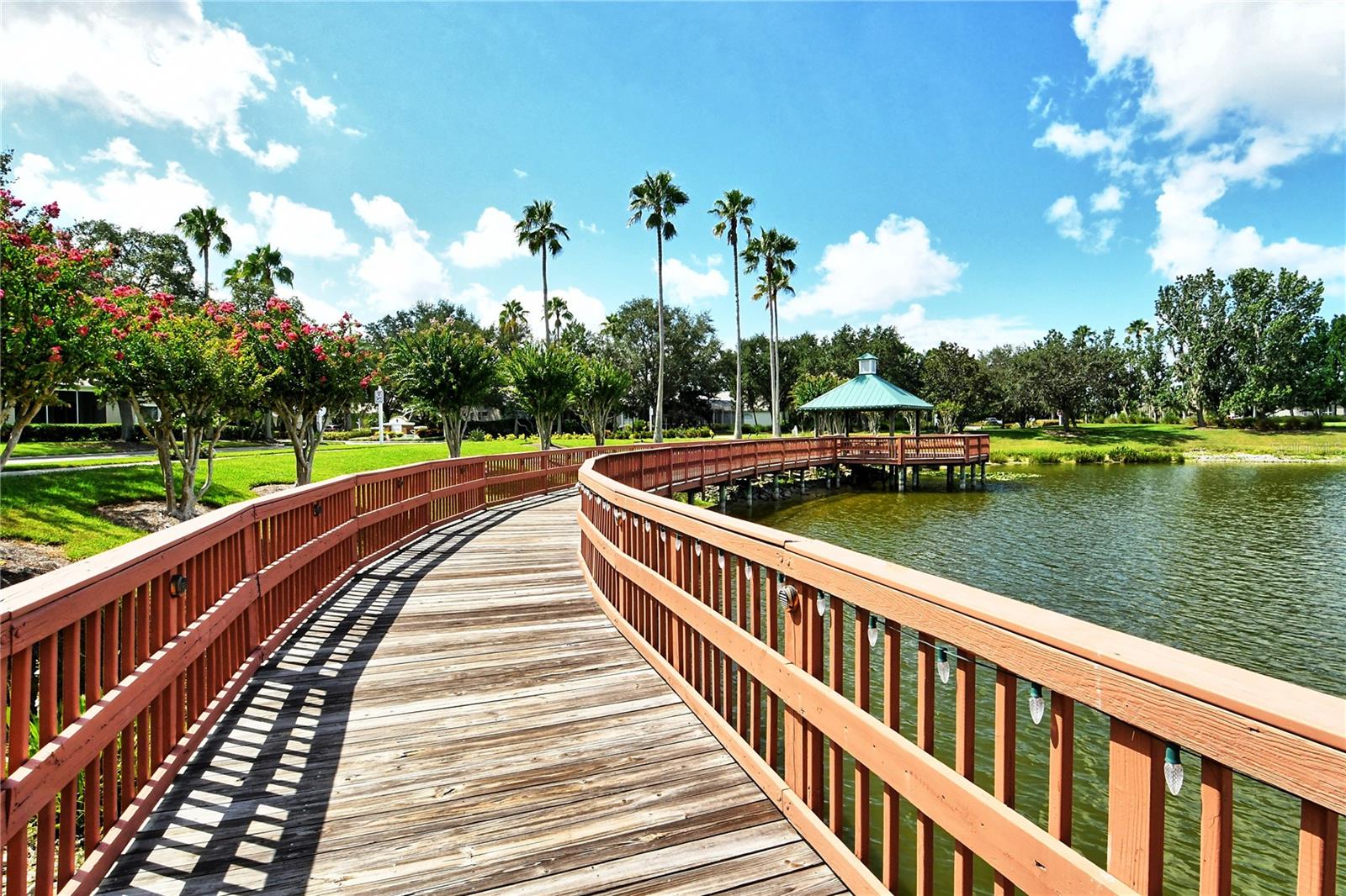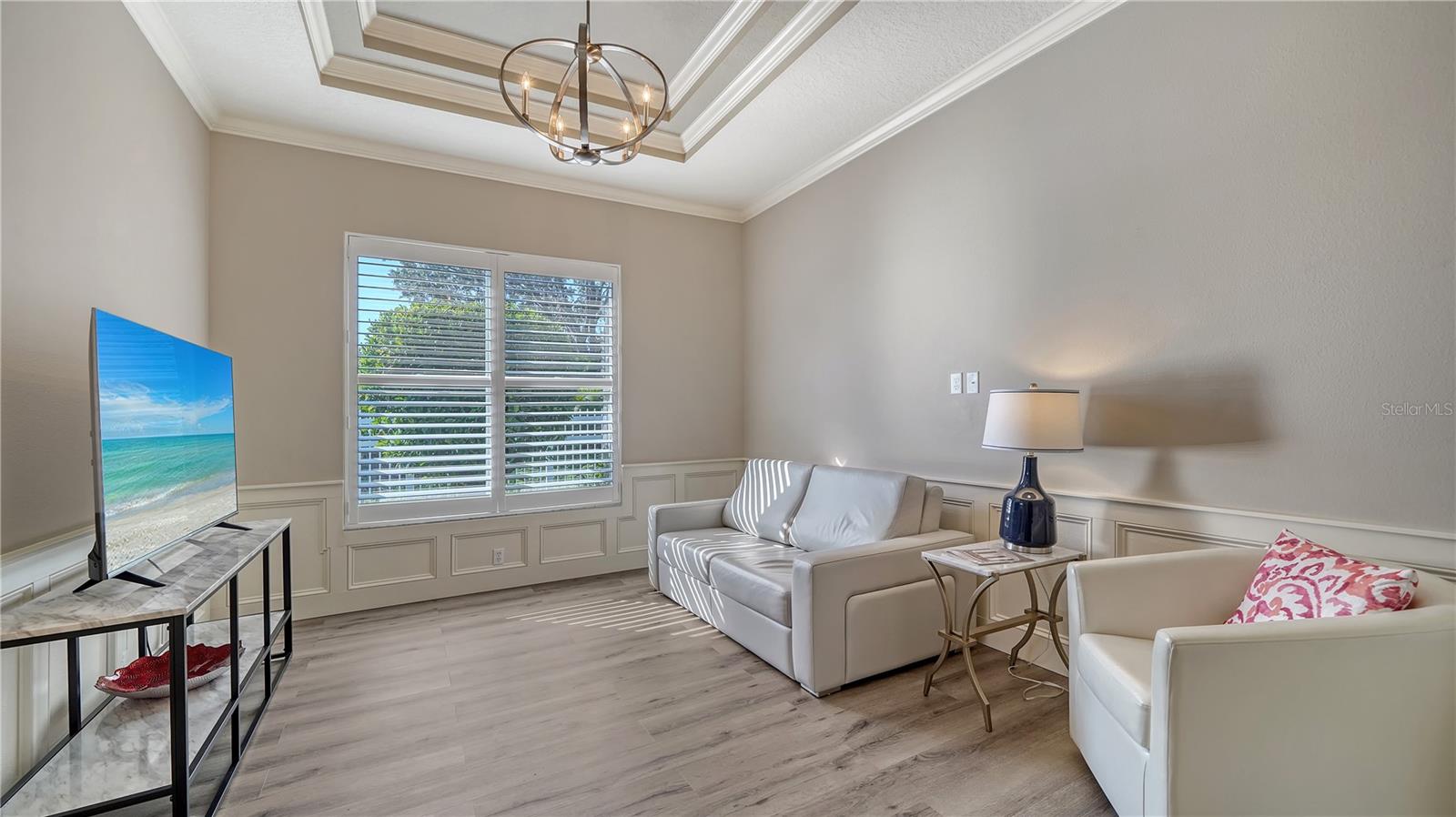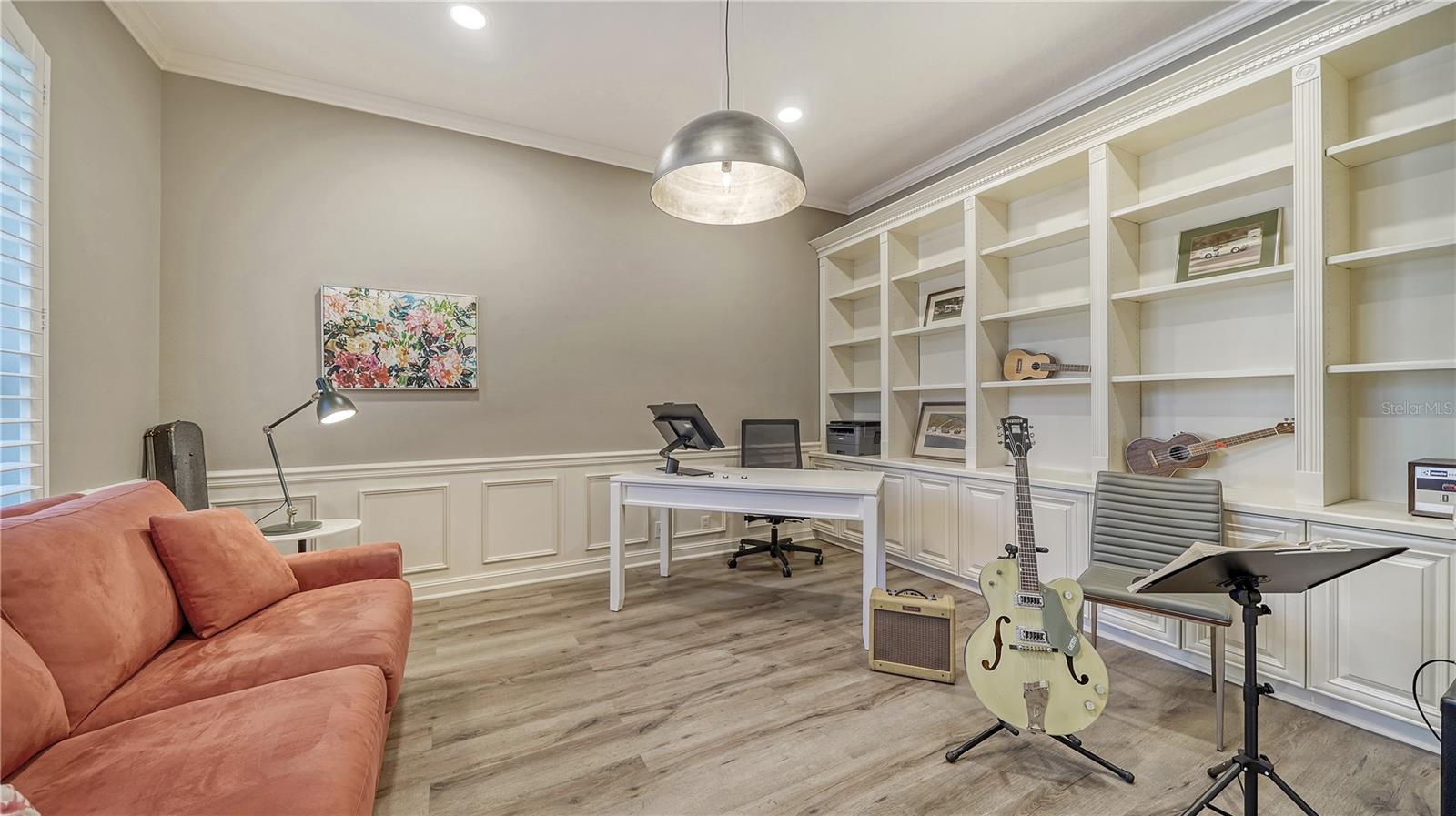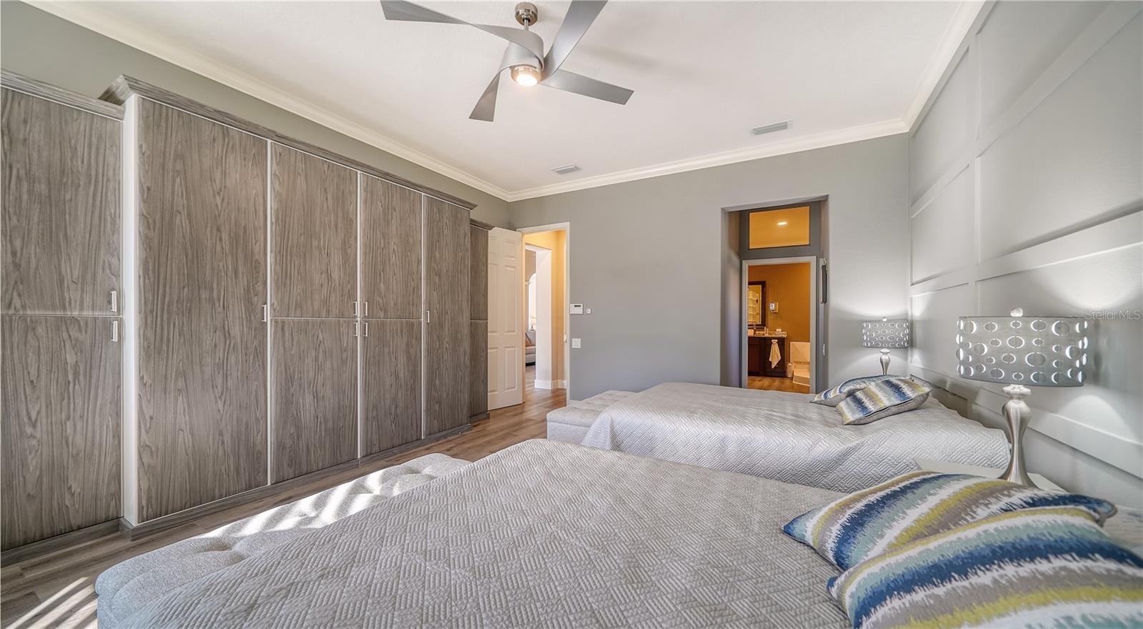 Stunning Custom Arthur Ruttenberg Home in private gated community with low HOA Fees. The carved wood double doors at the entry lead you to a beautifully updated, custom decorated home with Two Bedrooms, 2 1/2 Baths with upgraded fixtures (including Toto toilets) and an open floor plan featuring a stunning kitchen with quartz countertops, and custom wood cabinets, a marble backsplash, and a center island. The Dining Room is currently furnished as a den. The office was originally the third bedroom and can easily be reconverted back. Open floor plan with luxury wood-look vinyl floors, baseboards. crown moldings, trey ceilings, chair rail molding in the office and dining room, architecturally designed wood paneled walls in bedrooms, crystal doorknobs, and stunning chandeliers. The home also has a central vacuum system. Beautiful wood French doors lead to the Lanai with outdoor kitchen, shower and remote controlled sun screens. Pool with custom water feature overlooks serene small lake and preserve. The Driveway and Lanai have lovely pavers! Beautiful landscaping with outdoor lighting, coach lamps, side entry garage and on a cul de sac. Community kayak launch and fishing pier on Lake Uihlein. All systems have been updated. Roof is only 5 years old!Furniture available under separate purchase.