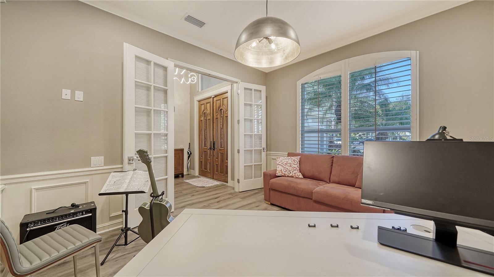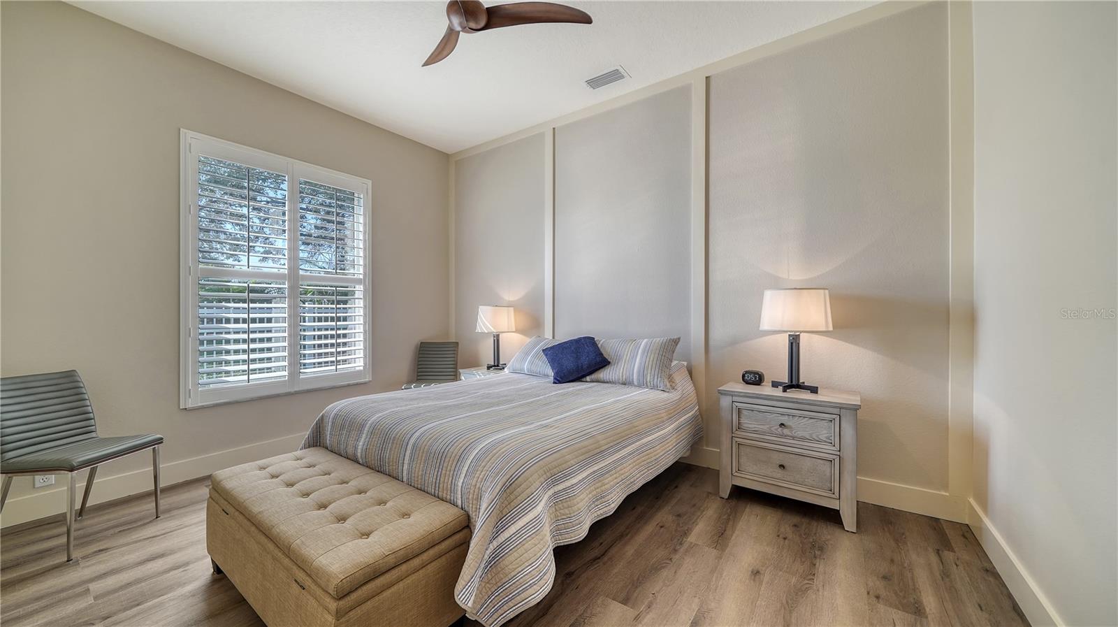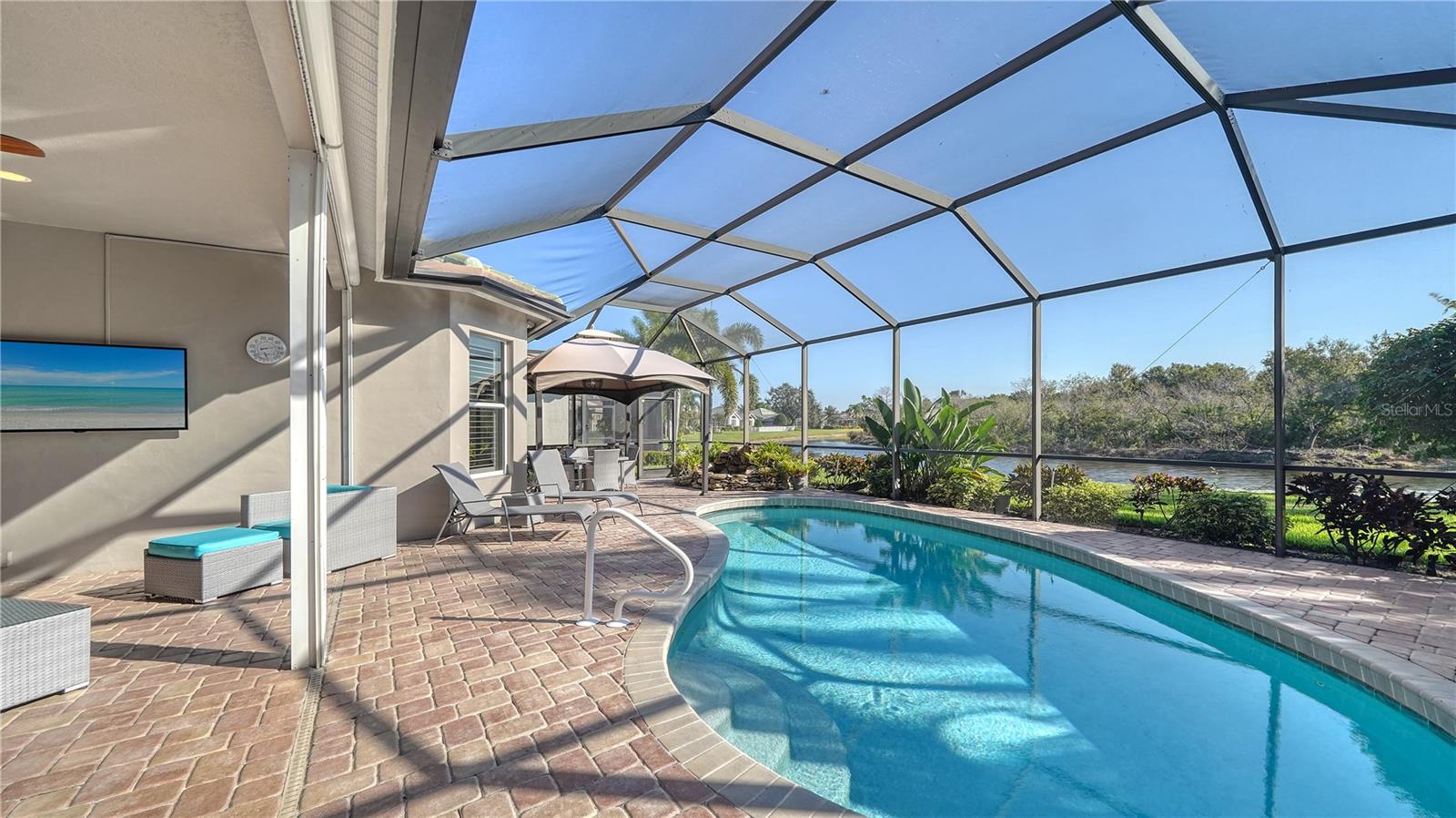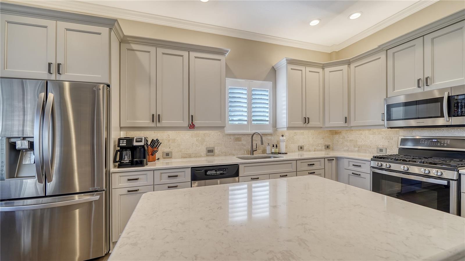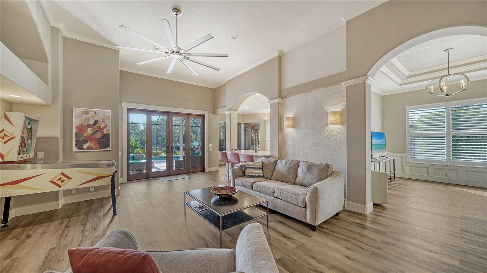 Stunning Custom Arthur Ruttenberg Home in private gated community with low HOA Fees. The carved wood double doors at the entry lead you to a beautifully updated, custom decorated home with Two Bedrooms, 2 1/2 Baths with upgraded fixtures (including Toto toilets) and an open floor plan featuring a stunning kitchen with quartz countertops, and custom wood cabinets, a marble backsplash, and a center island. The Dining Room is currently furnished as a den. The office was originally the third bedroom and can easily be reconverted back. Open floor plan with luxury wood-look vinyl floors, baseboards. crown moldings, trey ceilings, chair rail molding in the office and dining room, architecturally designed wood paneled walls in bedrooms, crystal doorknobs, and stunning chandeliers. The home also has a central vacuum system. Beautiful wood French doors lead to the Lanai with outdoor kitchen, shower and remote controlled sun screens. Pool with custom water feature overlooks serene small lake and preserve. The Driveway and Lanai have lovely pavers! Beautiful landscaping with outdoor lighting, coach lamps, side entry garage and on a cul de sac. Community kayak launch and fishing pier on Lake Uihlein. All systems have been updated. Roof is only 5 years old!Furniture available under separate purchase.
