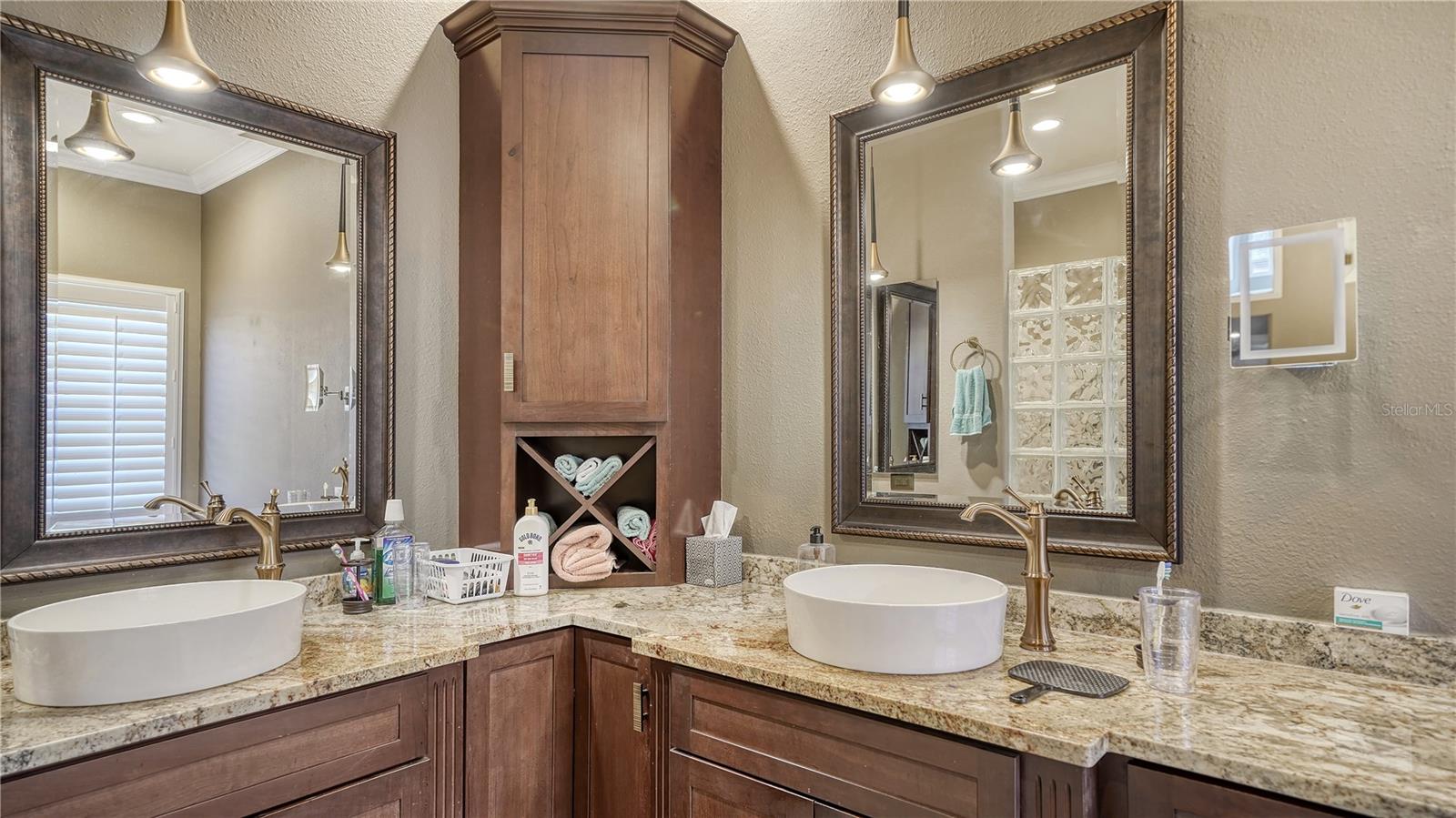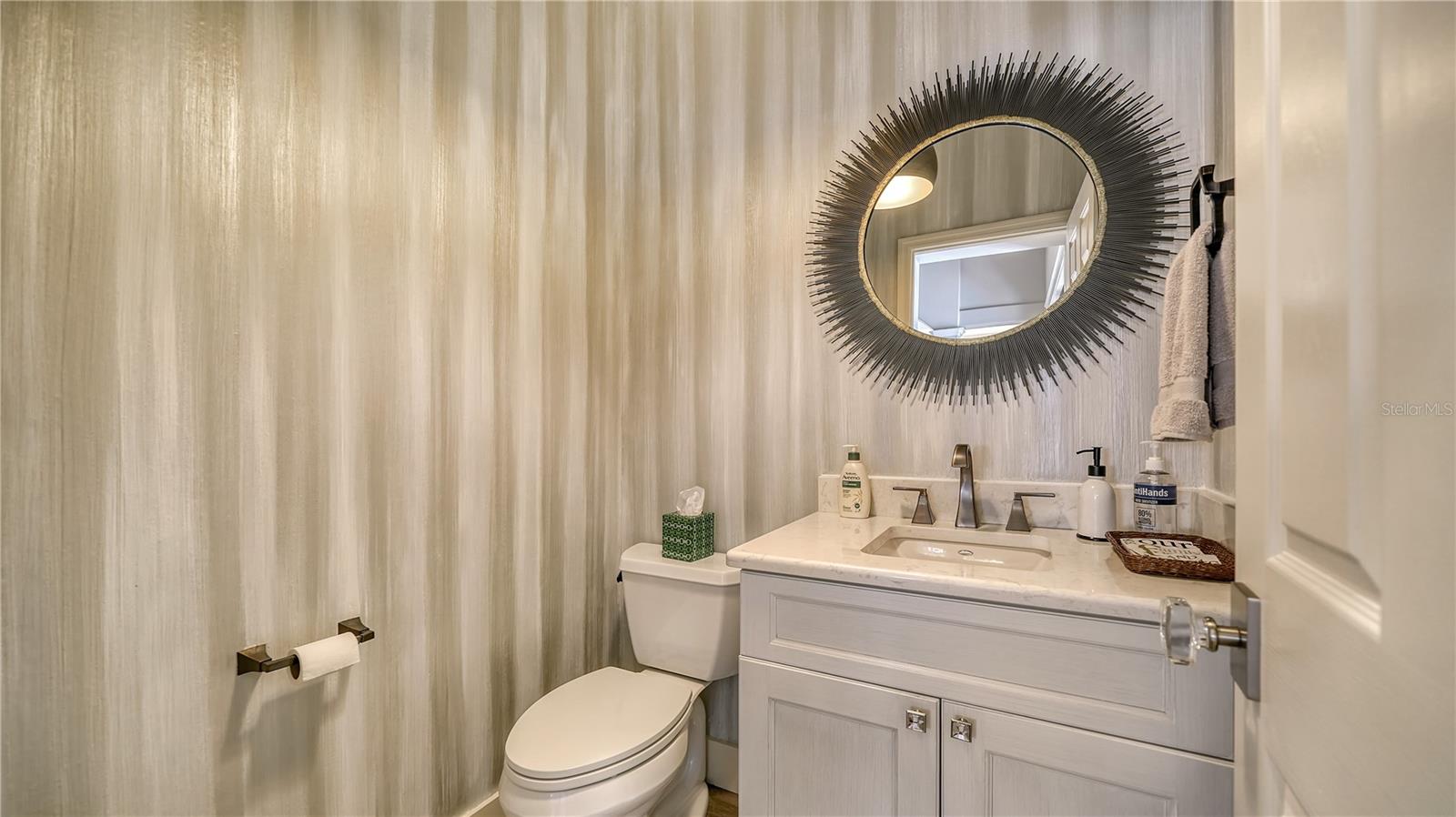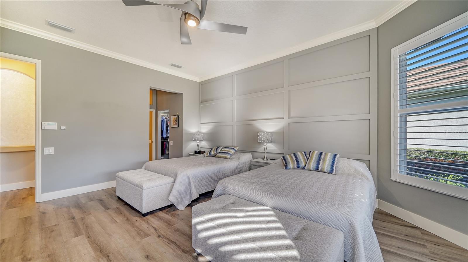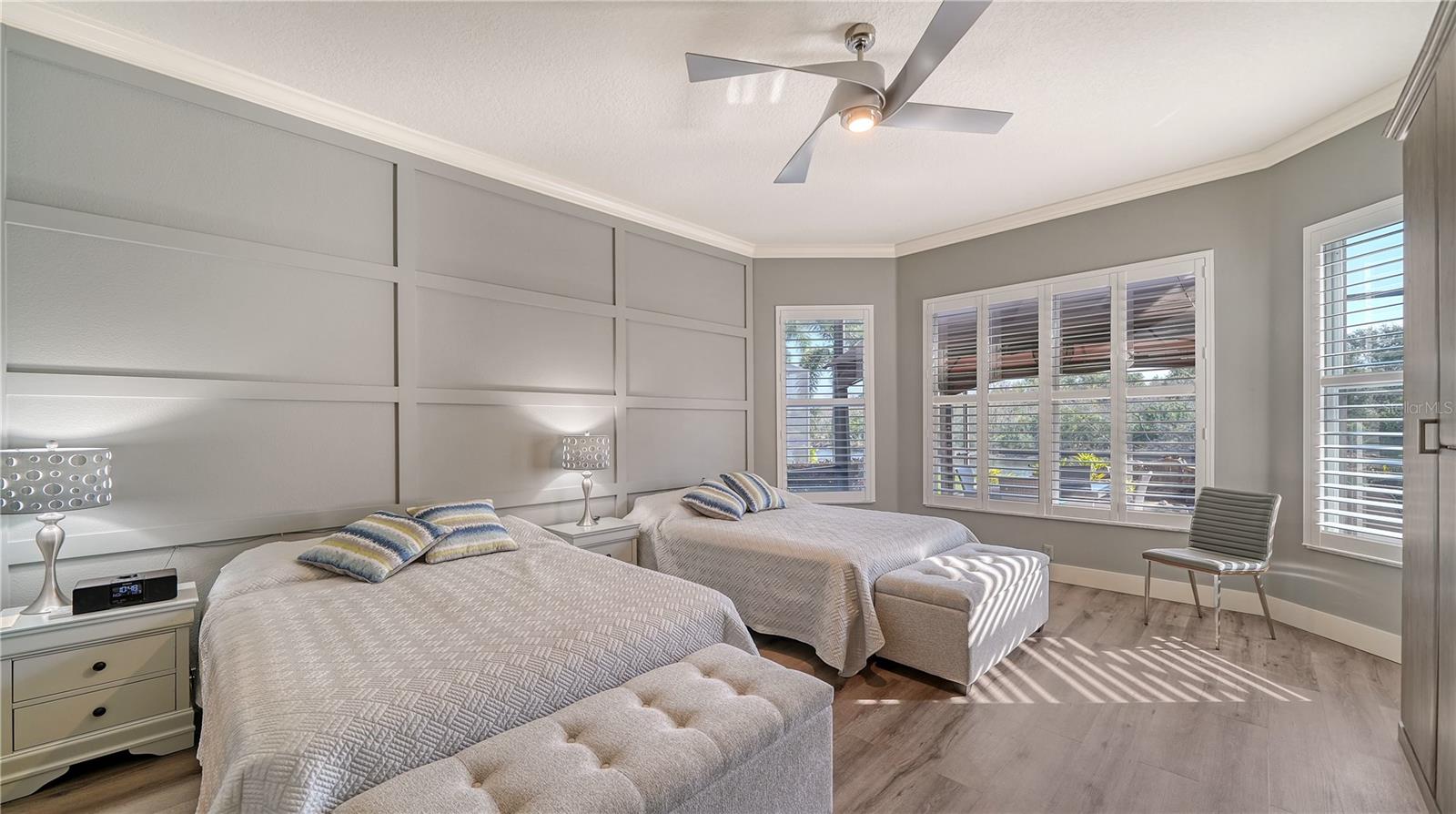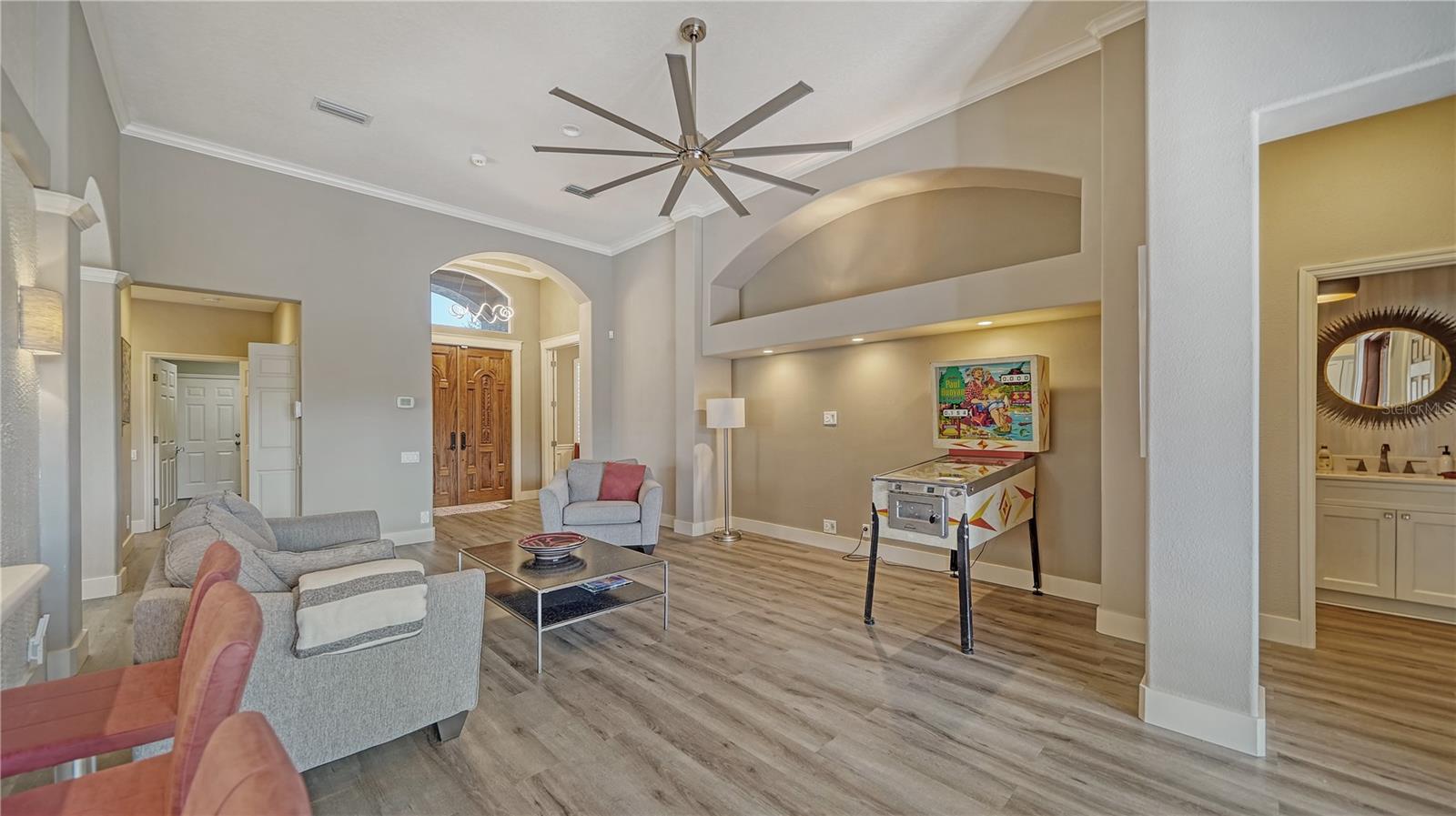 Stunning Custom Arthur Ruttenberg Home in private gated community with low HOA Fees. The carved wood double doors at the entry lead you to a beautifully updated, custom decorated home with Two Bedrooms, 2 1/2 Baths with upgraded fixtures (including Toto toilets) and an open floor plan featuring a stunning kitchen with quartz countertops, and custom wood cabinets, a marble backsplash, and a center island. The Dining Room is currently furnished as a den. The office was originally the third bedroom and can easily be reconverted back. Open floor plan with luxury wood-look vinyl floors, baseboards. crown moldings, trey ceilings, chair rail molding in the office and dining room, architecturally designed wood paneled walls in bedrooms, crystal doorknobs, and stunning chandeliers. The home also has a central vacuum system. Beautiful wood French doors lead to the Lanai with outdoor kitchen, shower and remote controlled sun screens. Pool with custom water feature overlooks serene small lake and preserve. The Driveway and Lanai have lovely pavers! Beautiful landscaping with outdoor lighting, coach lamps, side entry garage and on a cul de sac. Community kayak launch and fishing pier on Lake Uihlein. All systems have been updated. Roof is only 5 years old!Furniture available under separate purchase.