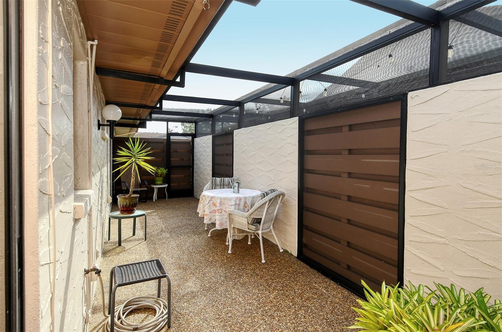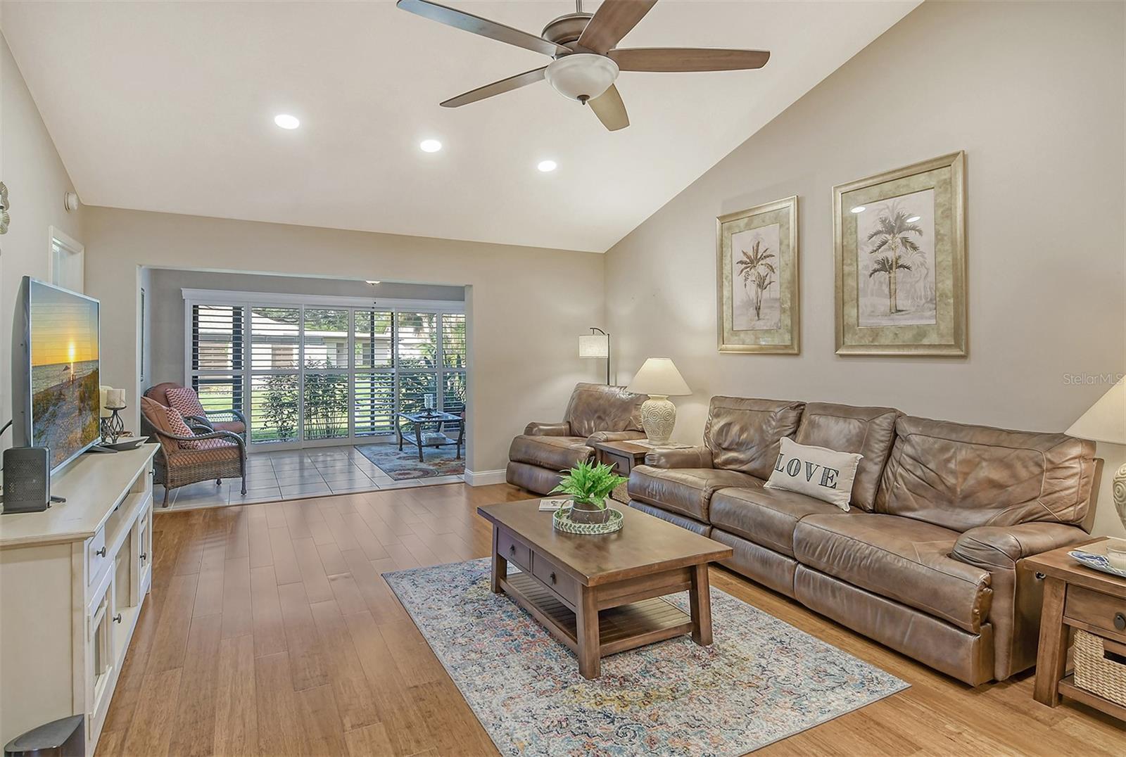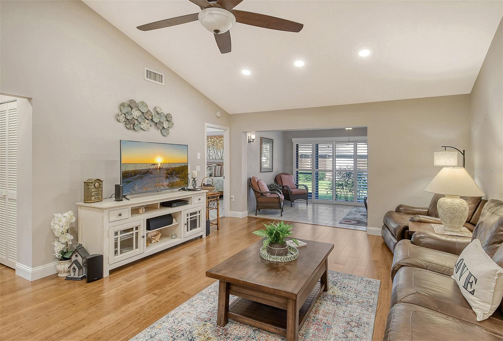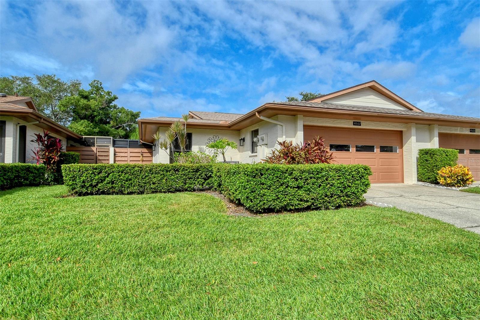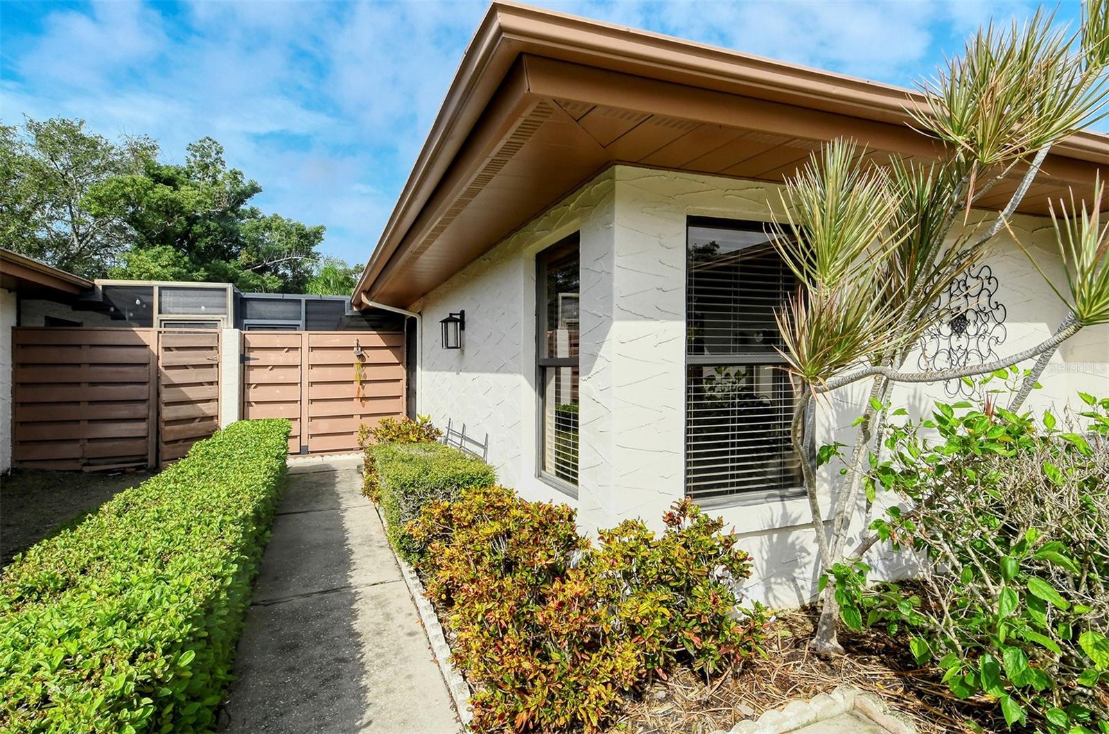 Enjoy the Florida lifestyle in this well presented, fully updated villa that lives like a single family home. The living area features a vaulted ceiling and is open to a screened and glass enclosed Florida room for year-round enjoyment. Renovated eat-in kitchen features shaker style cabinets with soft-close drawers, granite countertops and stainless steel appliances. Same cabinets installed in the laundry room. The spacious master bedroom has sliding doors to the courtyard, and a fully updated bathroom. Bedroom 2 also enjoys direct courtyard access. Bedroom 3 overlooks the front of the property and is currently used as an office/den. 2 car garage with recently installed epoxy flooring and "baseboards" for easy clean. Enclosed, walled and screened courtyard. New roof and skylights 2023, new garage door 2023, new A/C 2018. Whole house replumbed and new water heater in 2014. Engineered bamboo floors, plantation shutters and much more. Short walk to the community pool. This desirable, well kept, Center Gate 55+ community is perfectly located for easy access to shopping, restaurants and I-75. Don't miss this opportunity!