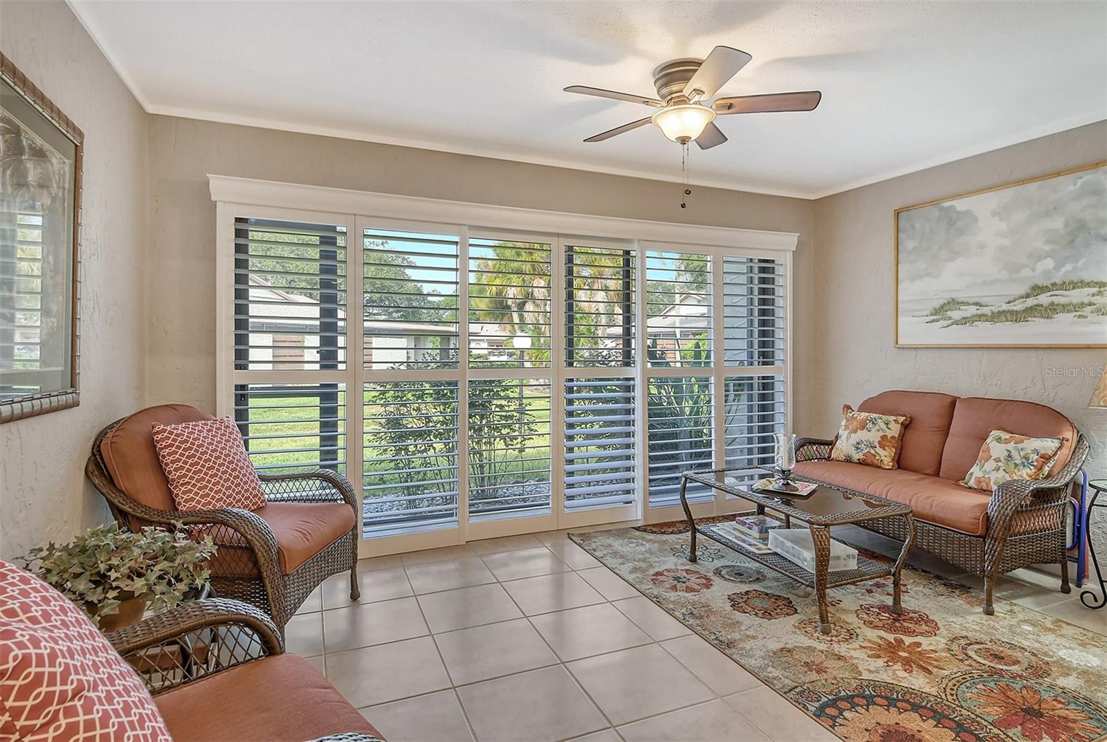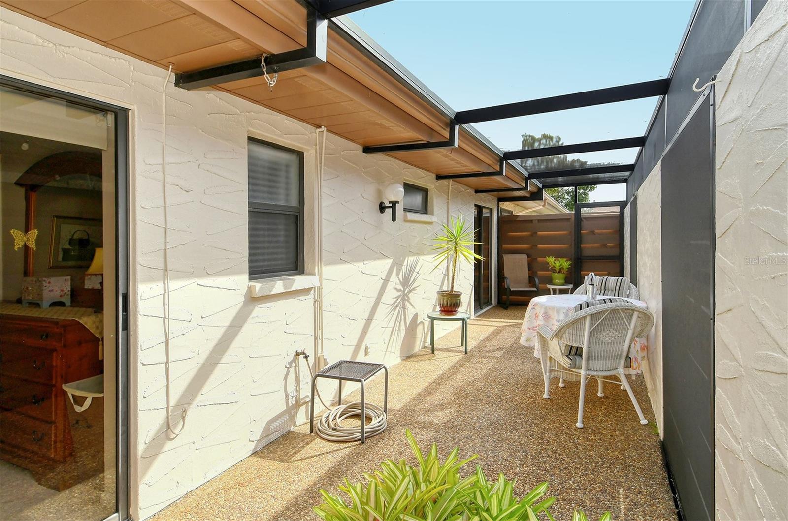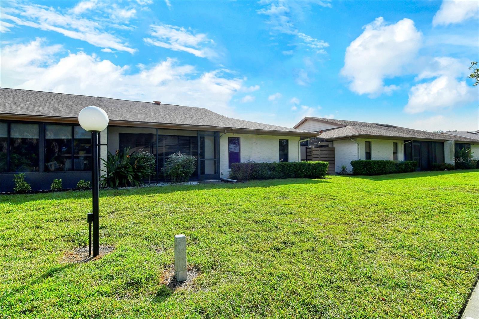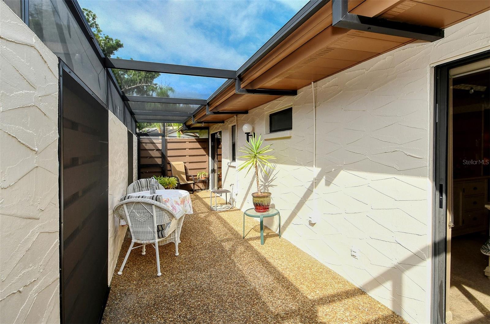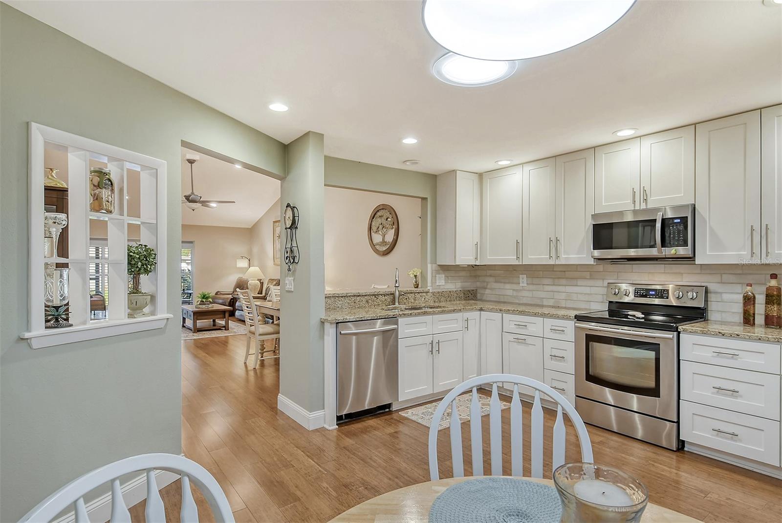 Enjoy the Florida lifestyle in this well presented, fully updated villa that lives like a single family home. The living area features a vaulted ceiling and is open to a screened and glass enclosed Florida room for year-round enjoyment. Renovated eat-in kitchen features shaker style cabinets with soft-close drawers, granite countertops and stainless steel appliances. Same cabinets installed in the laundry room. The spacious master bedroom has sliding doors to the courtyard, and a fully updated bathroom. Bedroom 2 also enjoys direct courtyard access. Bedroom 3 overlooks the front of the property and is currently used as an office/den. 2 car garage with recently installed epoxy flooring and "baseboards" for easy clean. Enclosed, walled and screened courtyard. New roof and skylights 2023, new garage door 2023, new A/C 2018. Whole house replumbed and new water heater in 2014. Engineered bamboo floors, plantation shutters and much more. Short walk to the community pool. This desirable, well kept, Center Gate 55+ community is perfectly located for easy access to shopping, restaurants and I-75. Don't miss this opportunity!