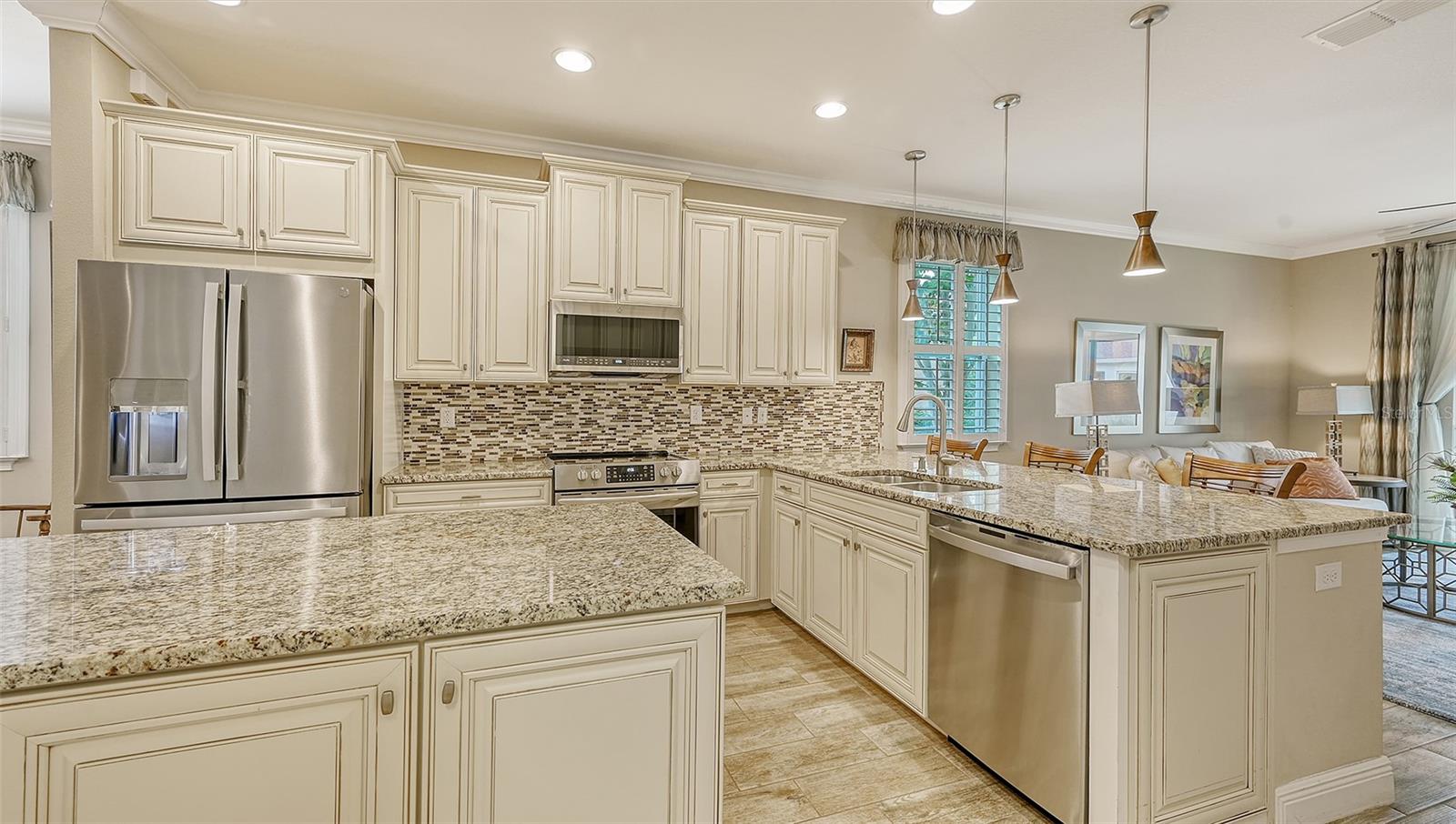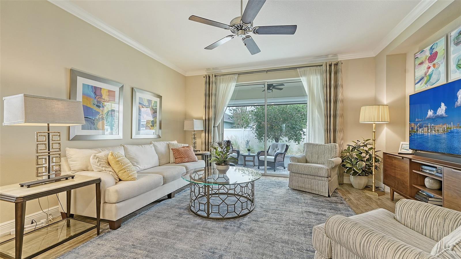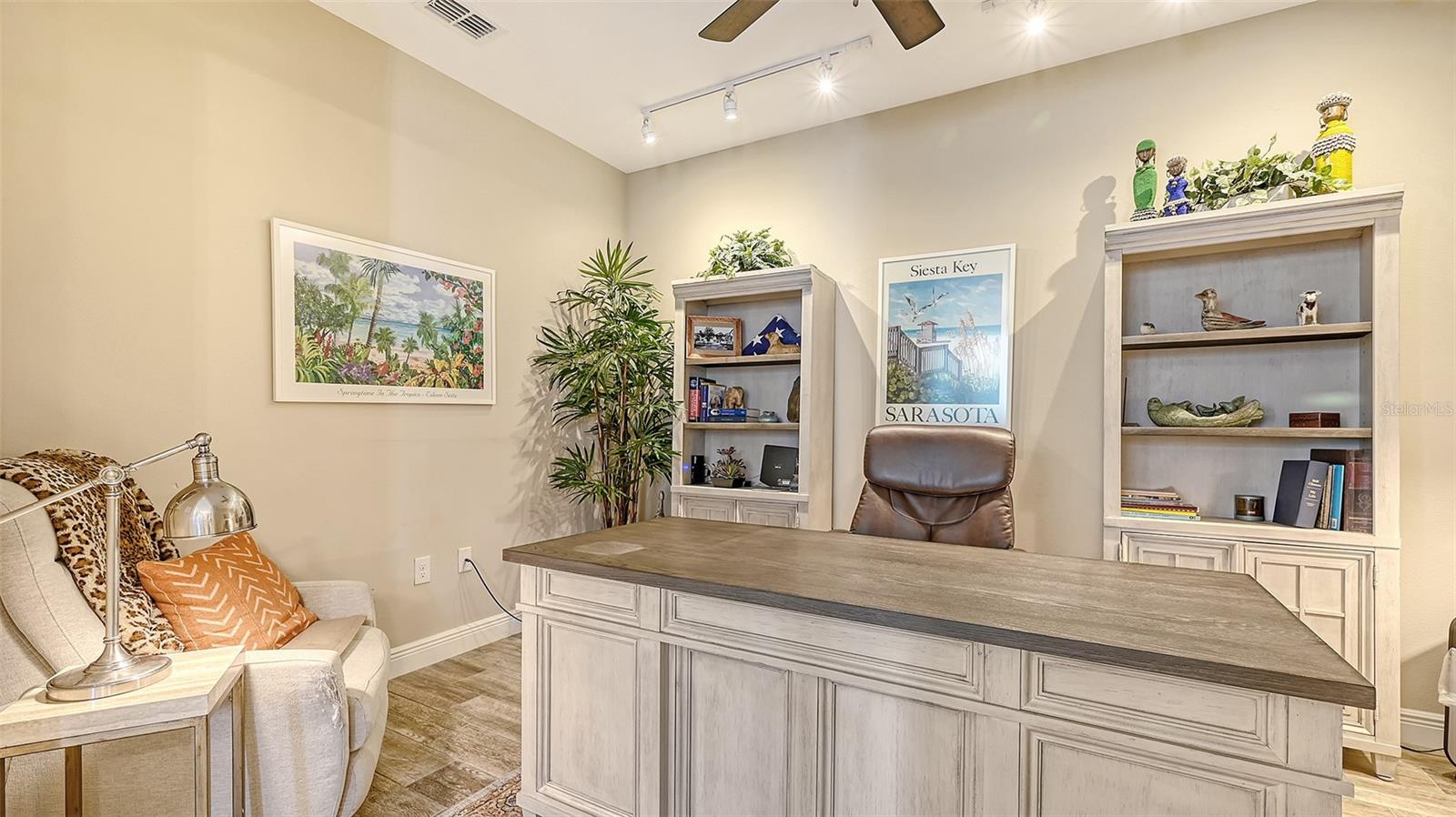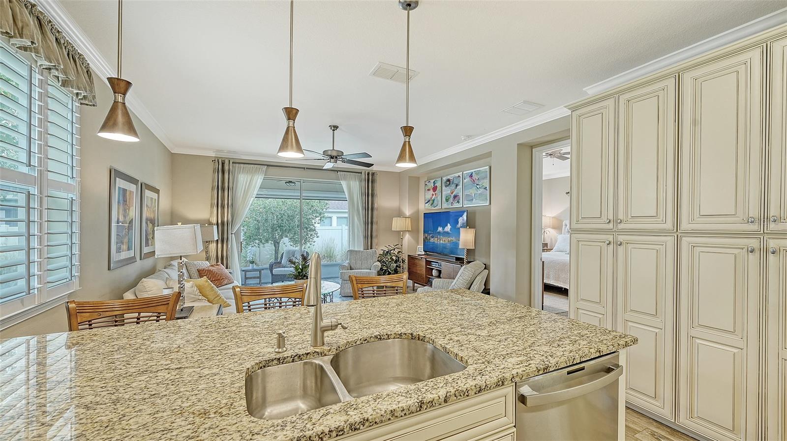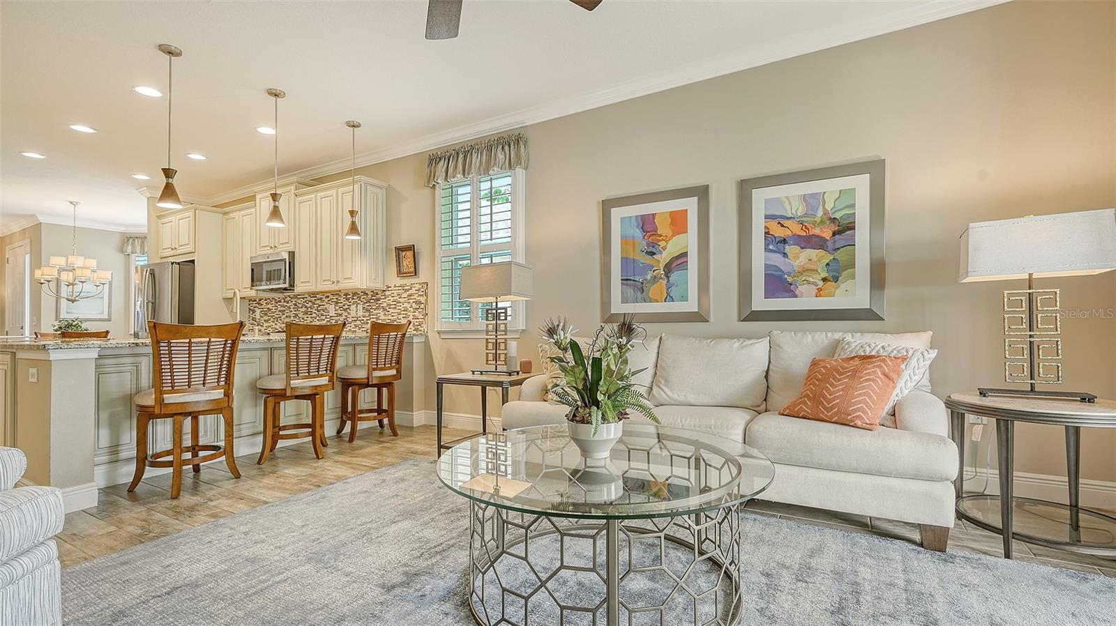 This tastefully furnished single-story townhouse has 2 bedrooms, an office, and 2 baths. Everything is on one level, so there are no stairs to navigate, and lots of windows and natural light in this end-unit home. The interior has 9' ceilings, 8' paneled doors, decorative moldings, granite countertops, plantation shutters, & plank tile flooring. The kitchen has wood cabinets, a large island, granite worksurfaces, glass tile backsplash, newer stainless appliances, breakfast bar, and a pantry. The dining area features an alcove with 3 large windows, adding space & light. The office has French doors, tile flooring, and track lighting. The great room has sliding glass doors to the screened lanai, both perfect places to relax with friends and family. The lanai also includes remote control roll down see-through vinyl panels. The primary bedroom with its high tray ceiling and carpeted flooring and an en suite bath that includes a walk-in closet, linen closet and water closet, along with a walk-in shower, wood vanity, granite counters, and dual sinks. The guest bedroom is located at the front of the home alongside the guest bathroom. The laundry room is conveniently located just off the kitchen. And the 2-car garage has a utility sink, attic access, and epoxy flooring. This delightful home is one of only 162 homes in the gated, maintenance-free community of Enclave at Forest Lakes, which offers a heated community pool, poolside pavilion and a bark park! Worry-free, "lock and leave" living is the reality here. You'll live within walking or biking distance of Palms Golf Club, restaurants, shops and the Legacy Trail, an 18+ mile bike/walk path that extends from North Sarasota to Venice. Sarasota is home to a myriad of recreational activities, cultural events, golf, watersports, shopping, natural beauty, and any number of world-class Gulf beaches. Year round or seasonally, this is a wonderful place to call home.